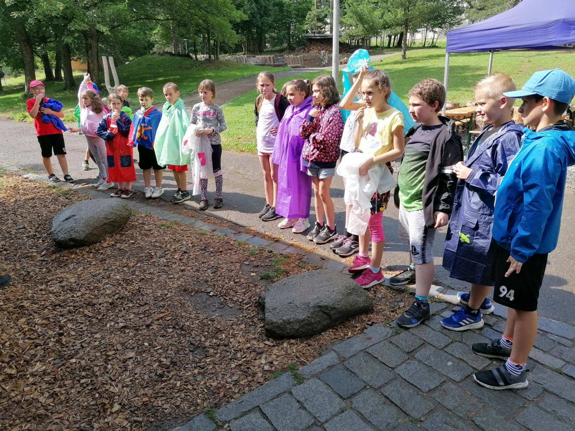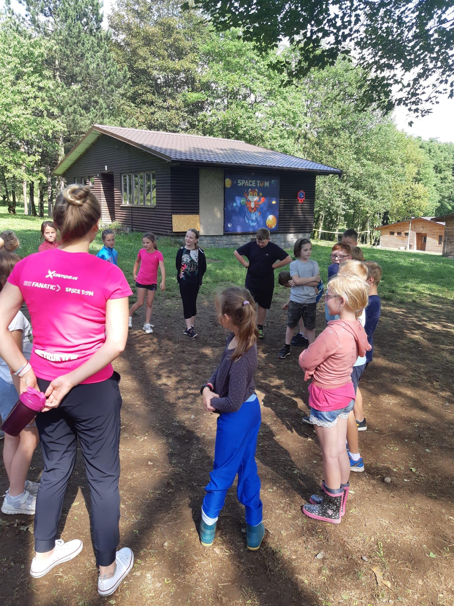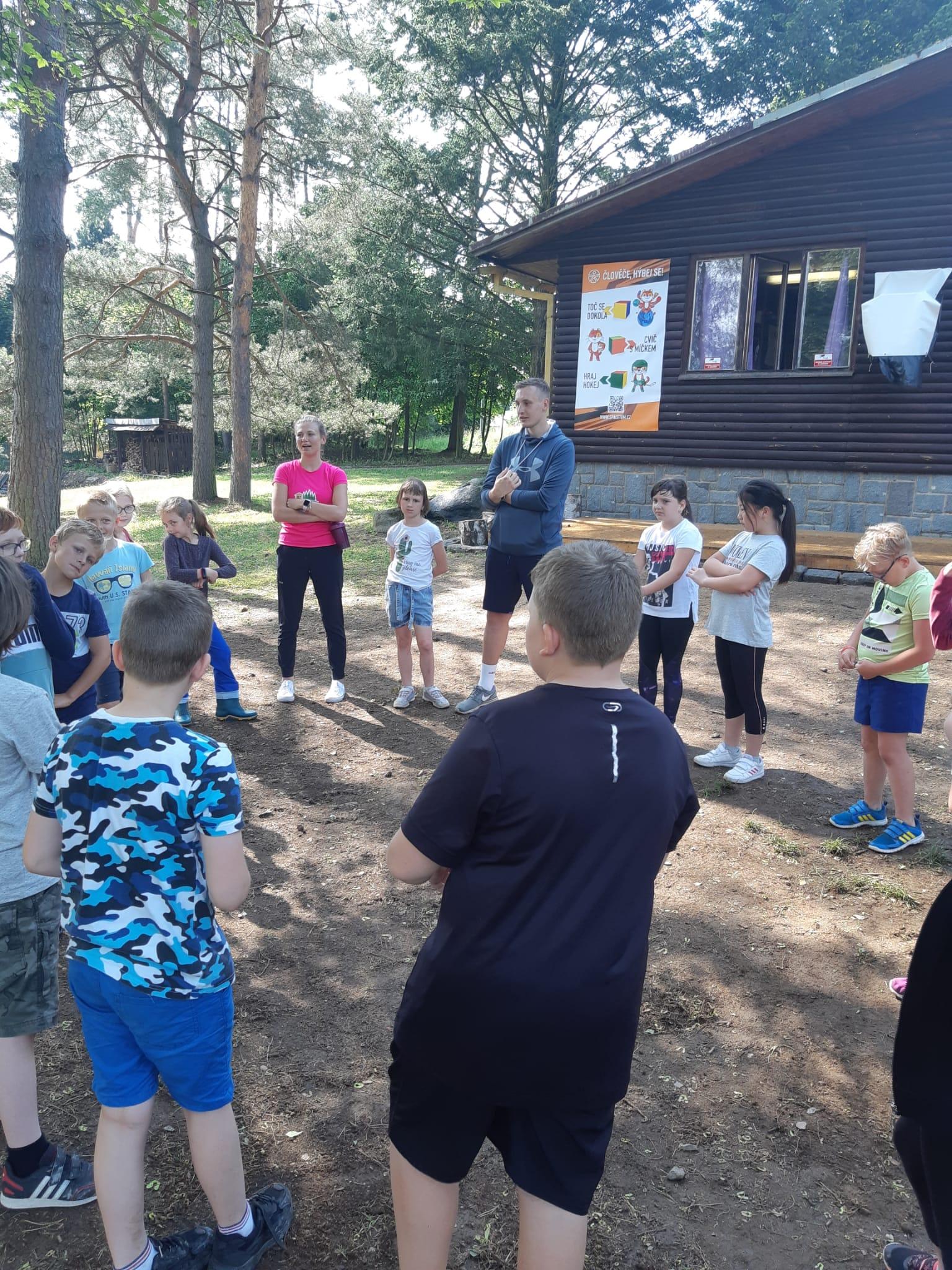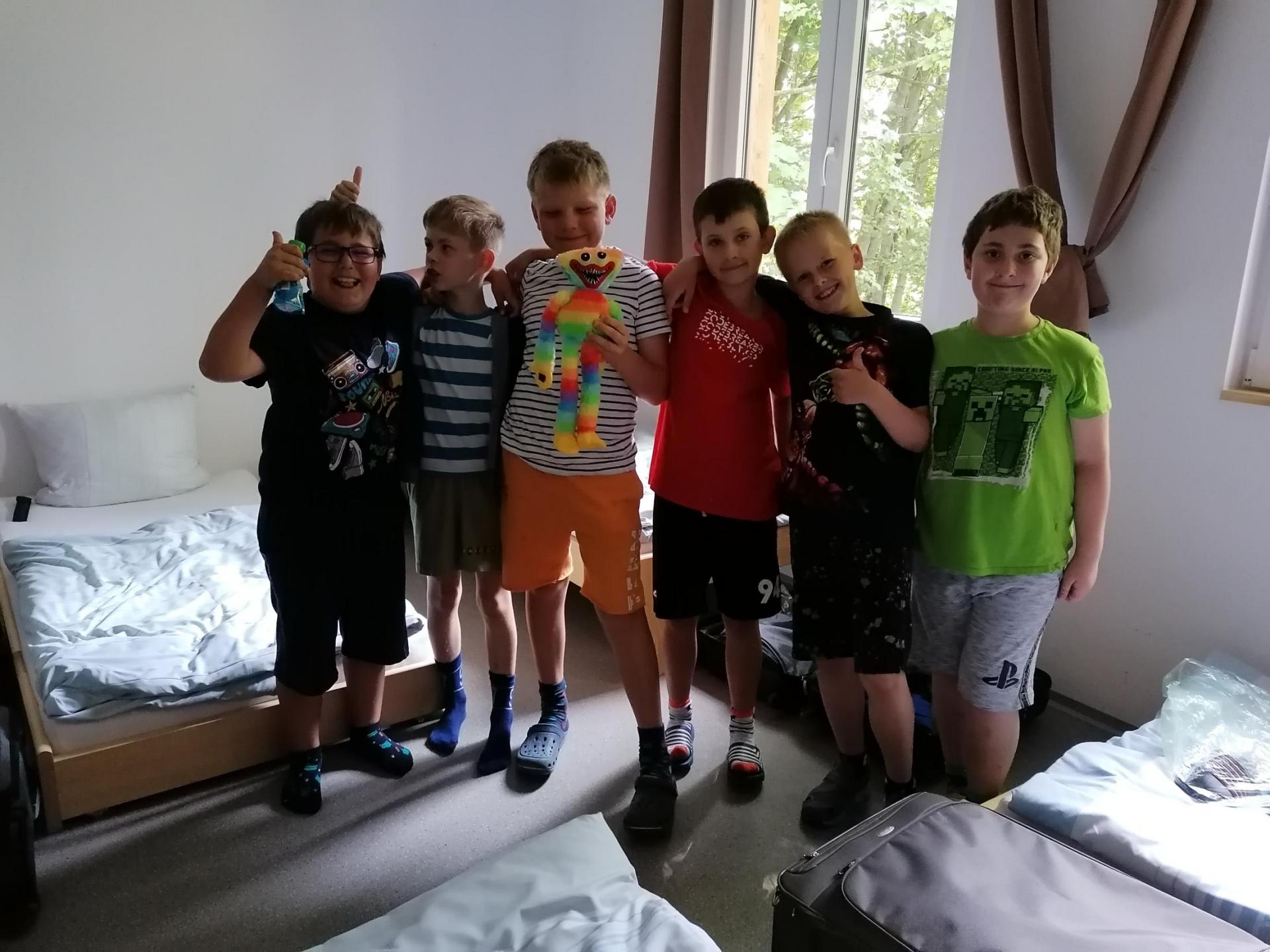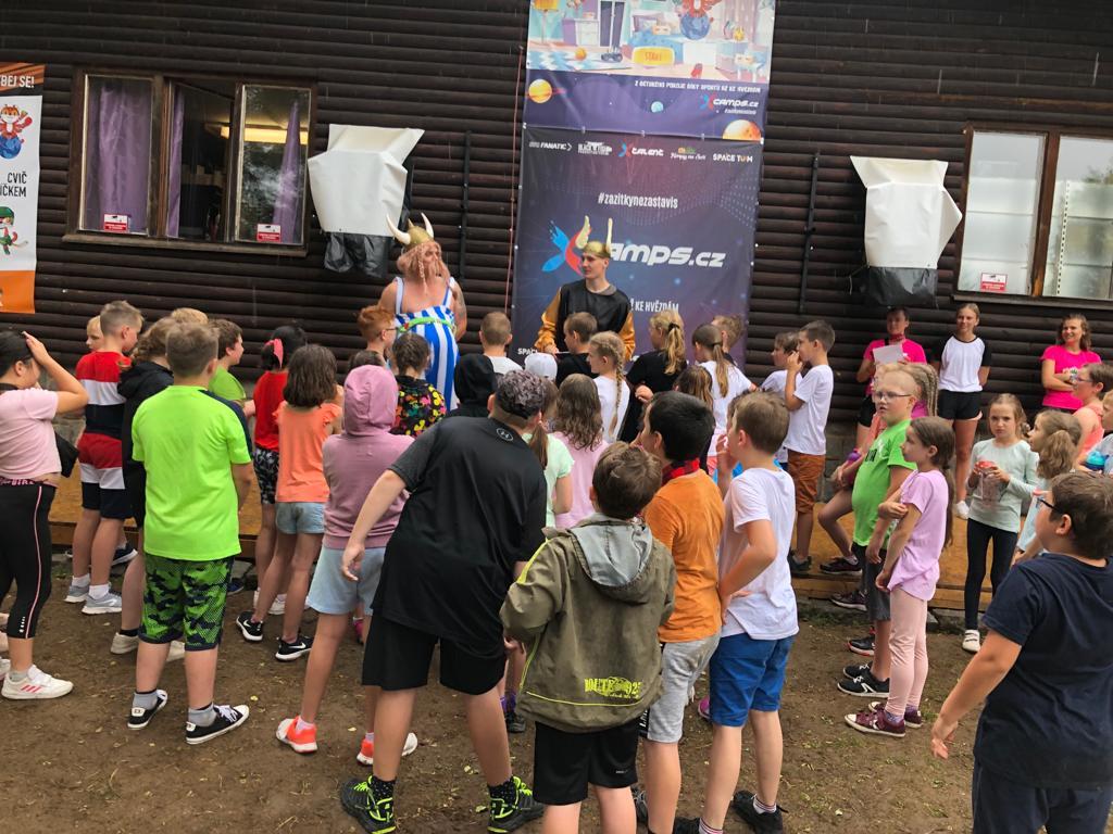 Cesta proběhla bez problémů a za chvíli jsme byli na místě. Po příjezdu jsme se nejdříve ubytovali, trochu si vybalili a hned jsme se šli seznámit s areálem. Po obědě (vývar s nočky a kuře s bramborem) a poledním klidu jsme se kvůli dešti schovali v klubovně a chvíli koukali na film Asterix a Obelix. Když to počasí dovolilo, poprvé se Asterix a Obelix ukázal a rozdělil nás do týmů. Následně jsme se seznámili a zahráli si hry. Čeká nás velké dobrodružství.