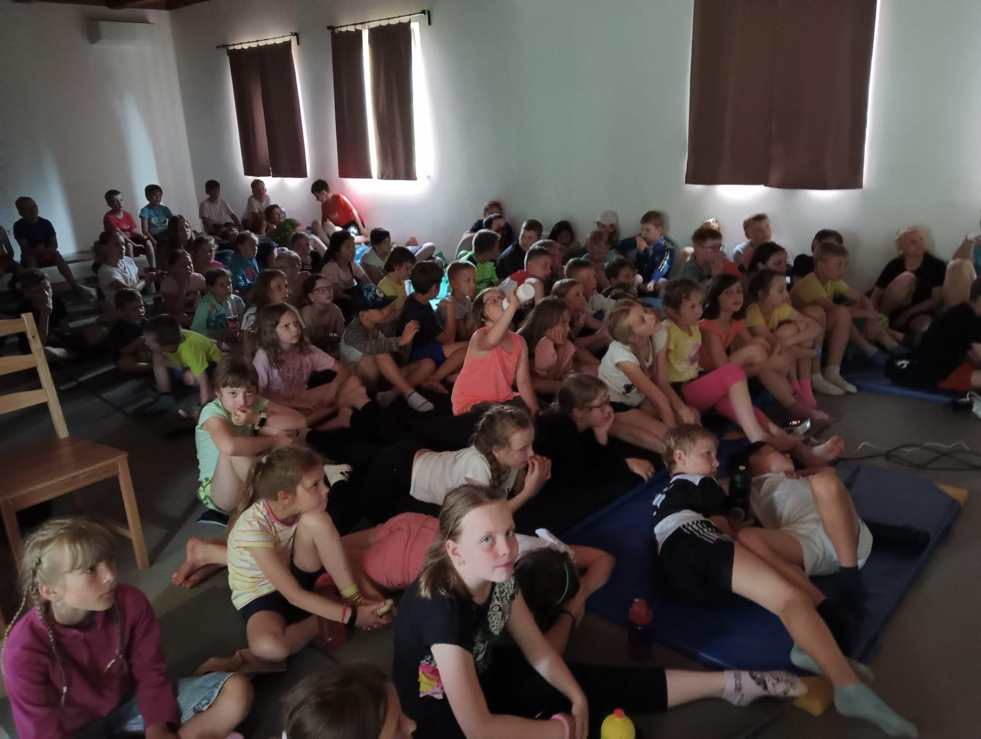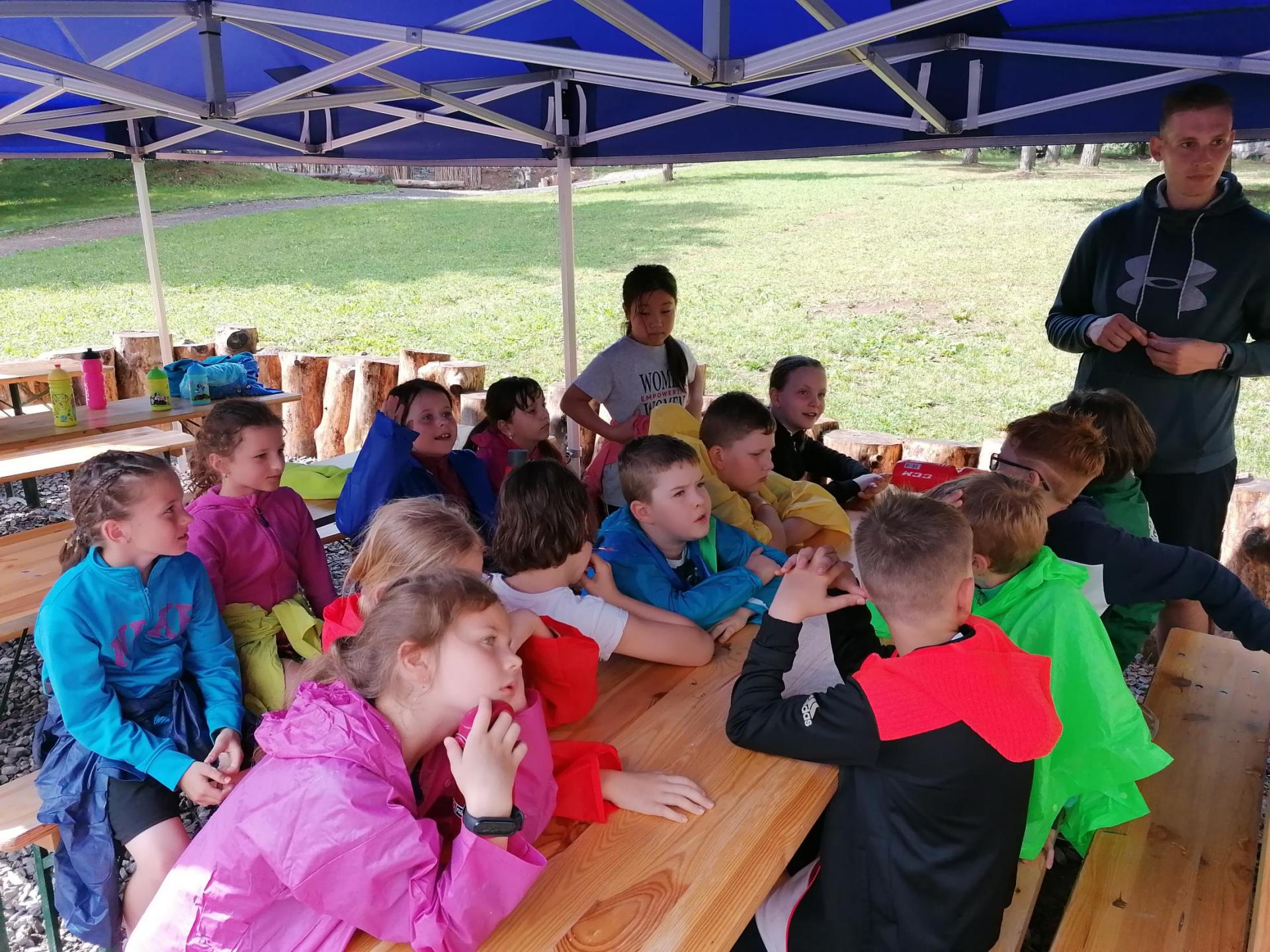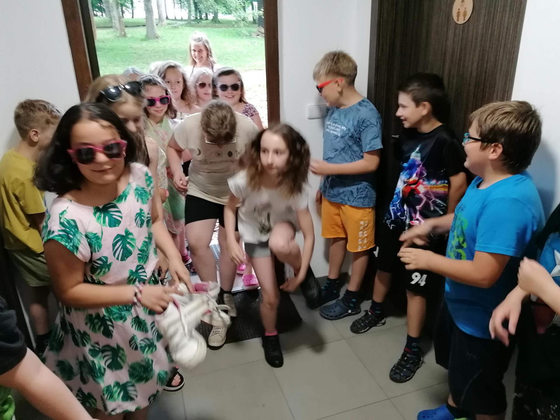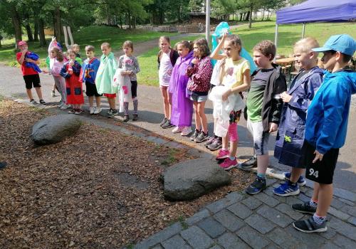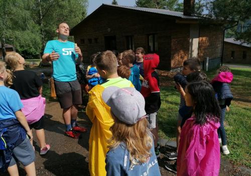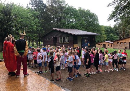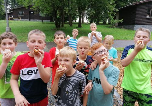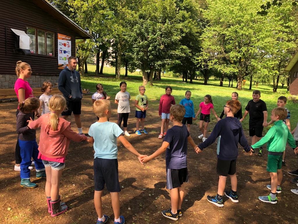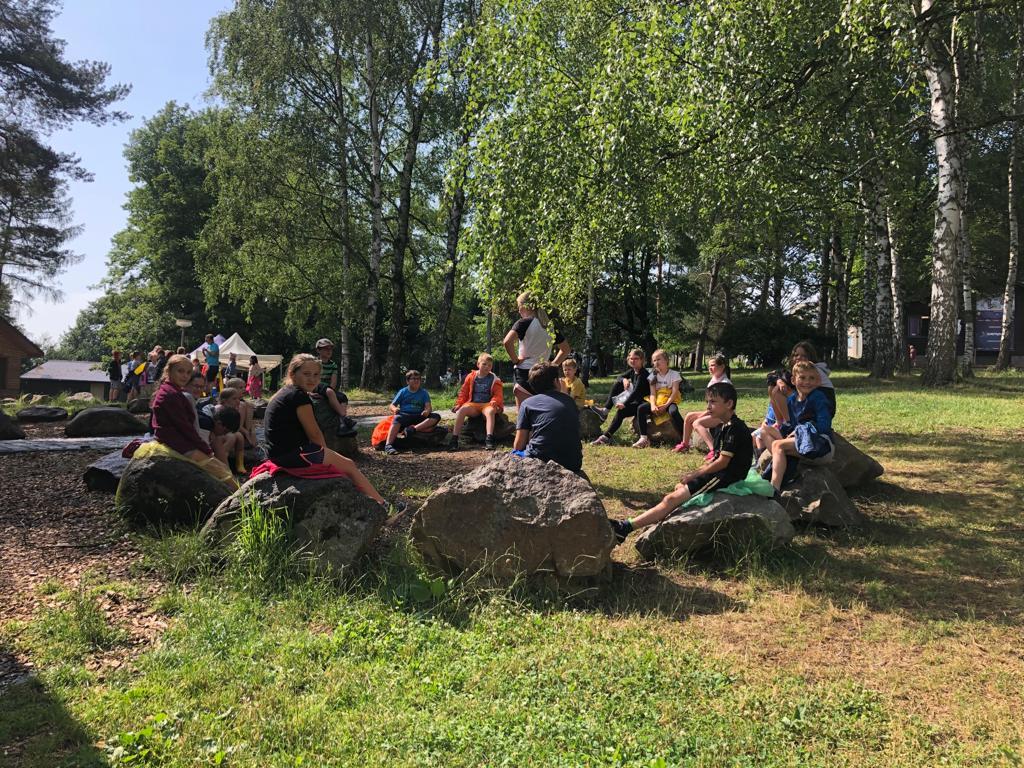 Cesta proběhla bez problémů a za chvíli jsme byli na místě. Po příjezdu jsme se nejdříve ubytovali, trochu si vybalili a hned jsme se šli seznámit s areálem. Po obědě (vývar s nočky a kuře s bramborem) a poledním klidu jsme se kvůli dešti schovali v klubovně a chvíli koukali na film Asterix a Obelix. Když to počasí dovolilo, poprvé se Asterix a Obelix ukázal a rozdělil nás do týmů. Následně jsme se seznámili a zahráli si hry. Čeká nás velké dobrodružství.
