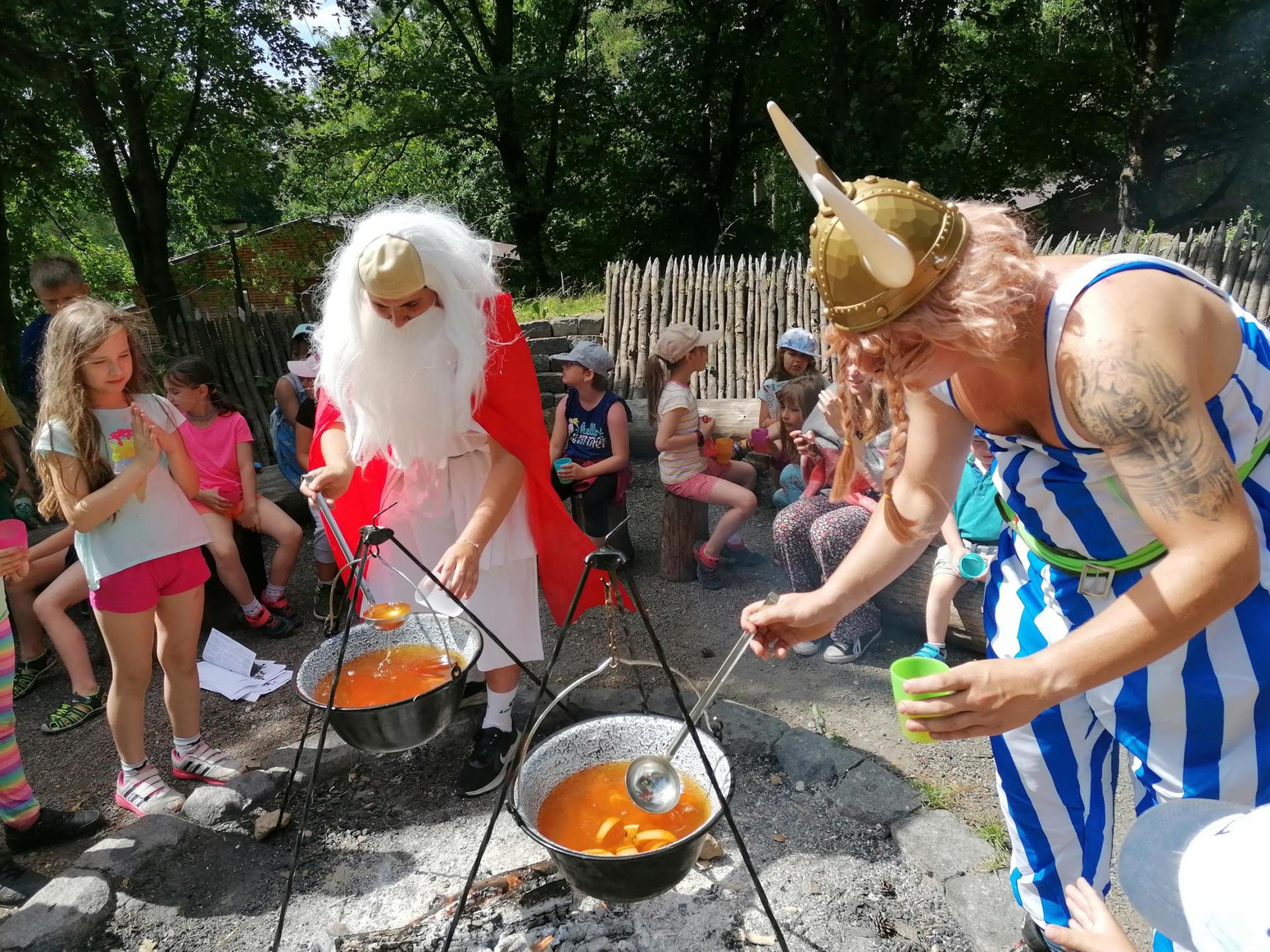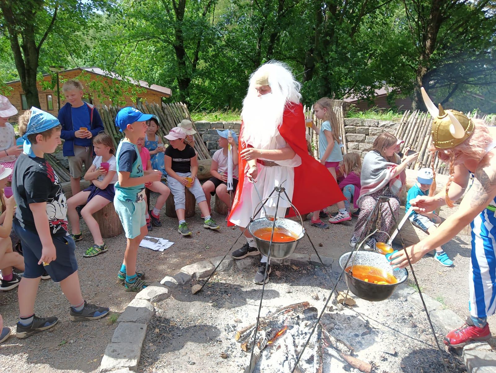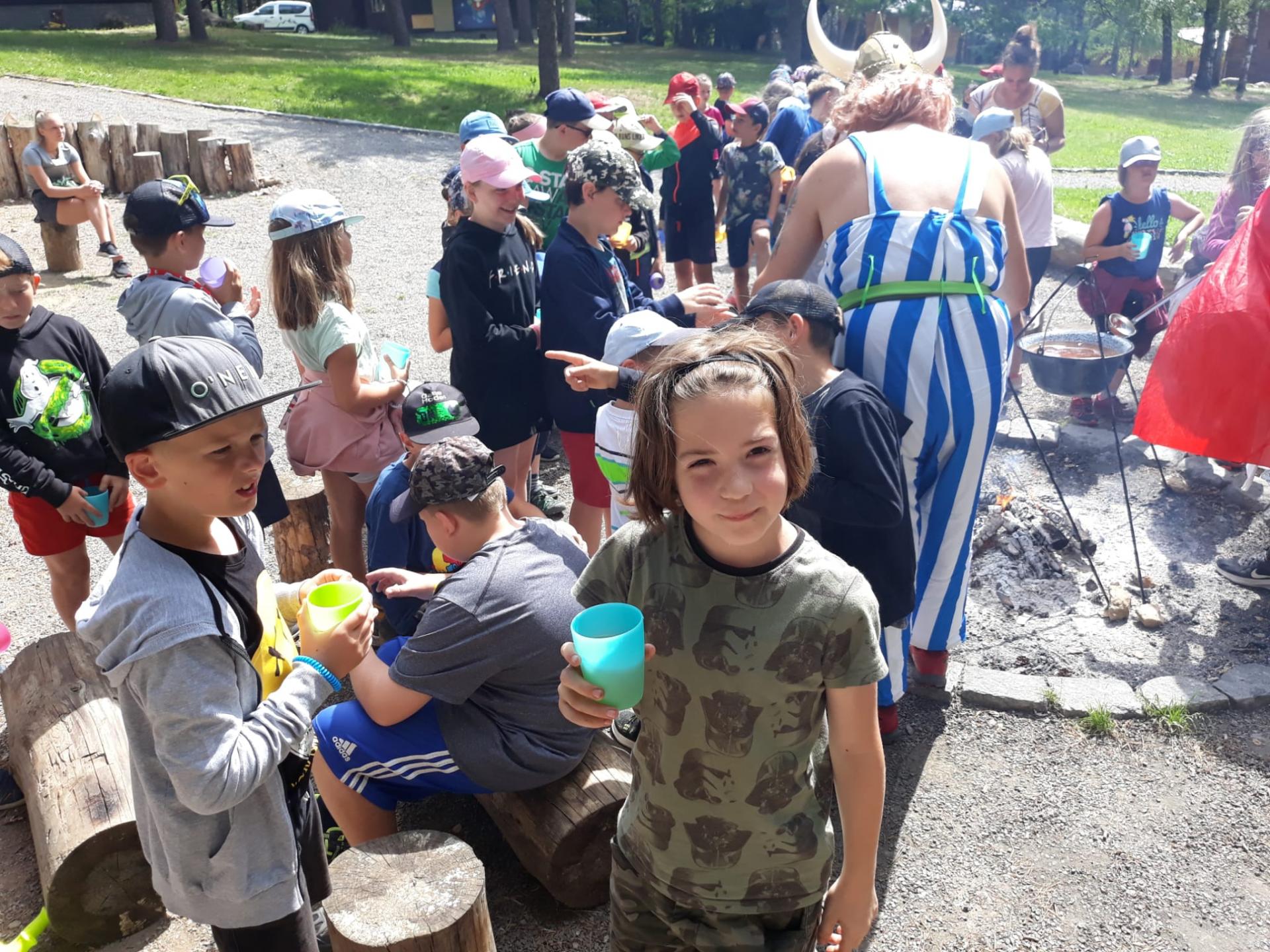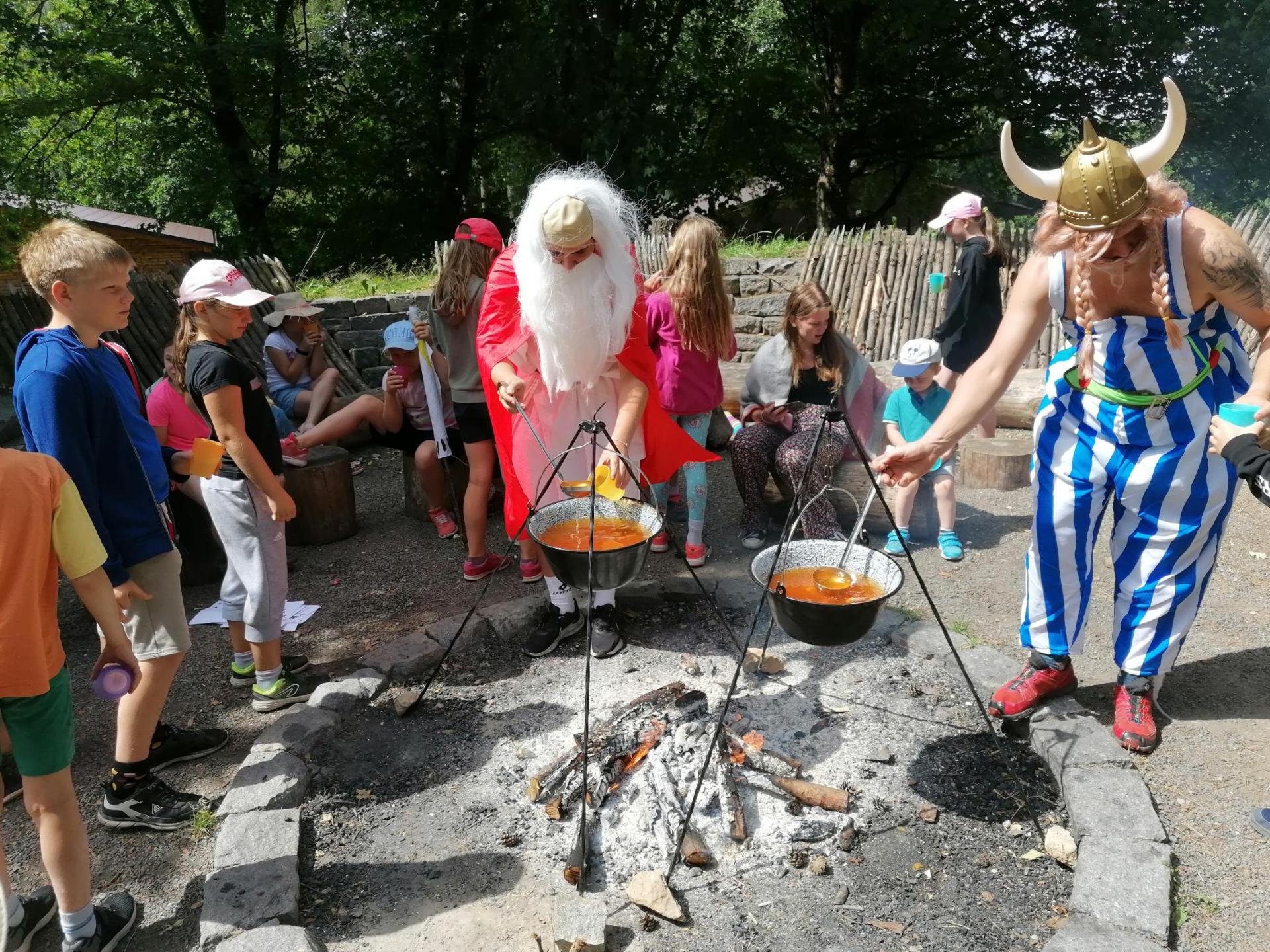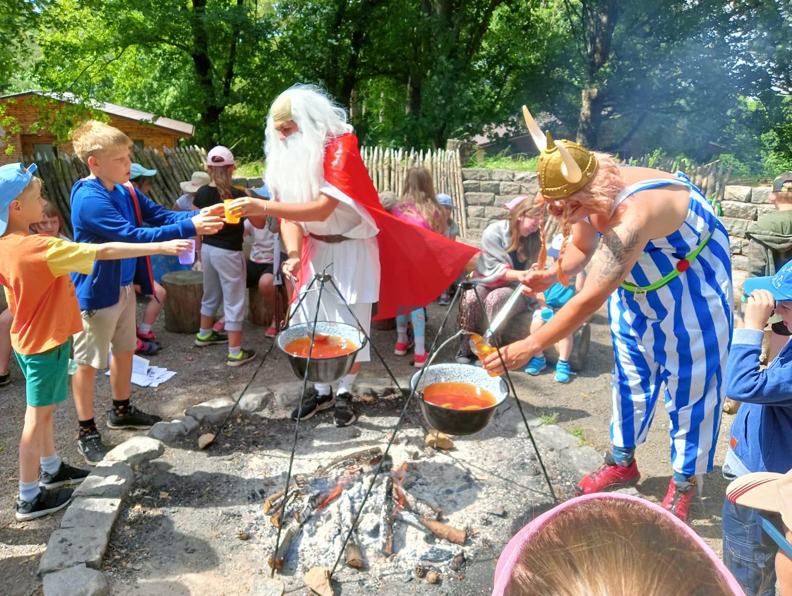 Po snídani jsme si zabalili, uklidili sruby a šli zjistit, zda se lektvar vařený přes noc povedl. Po ochutnání jsme získali supersílu a mohli jsme táhnout na Římany, které jsme v boji úspěšně porazili a vlajky ubránili. Každý z nás si veze domů část zázračného lektvaru, pamětní listinu a k tomu nespočet zážitků.