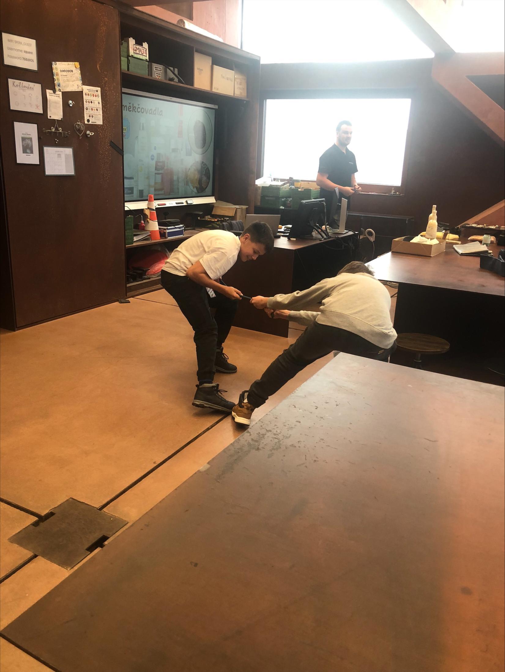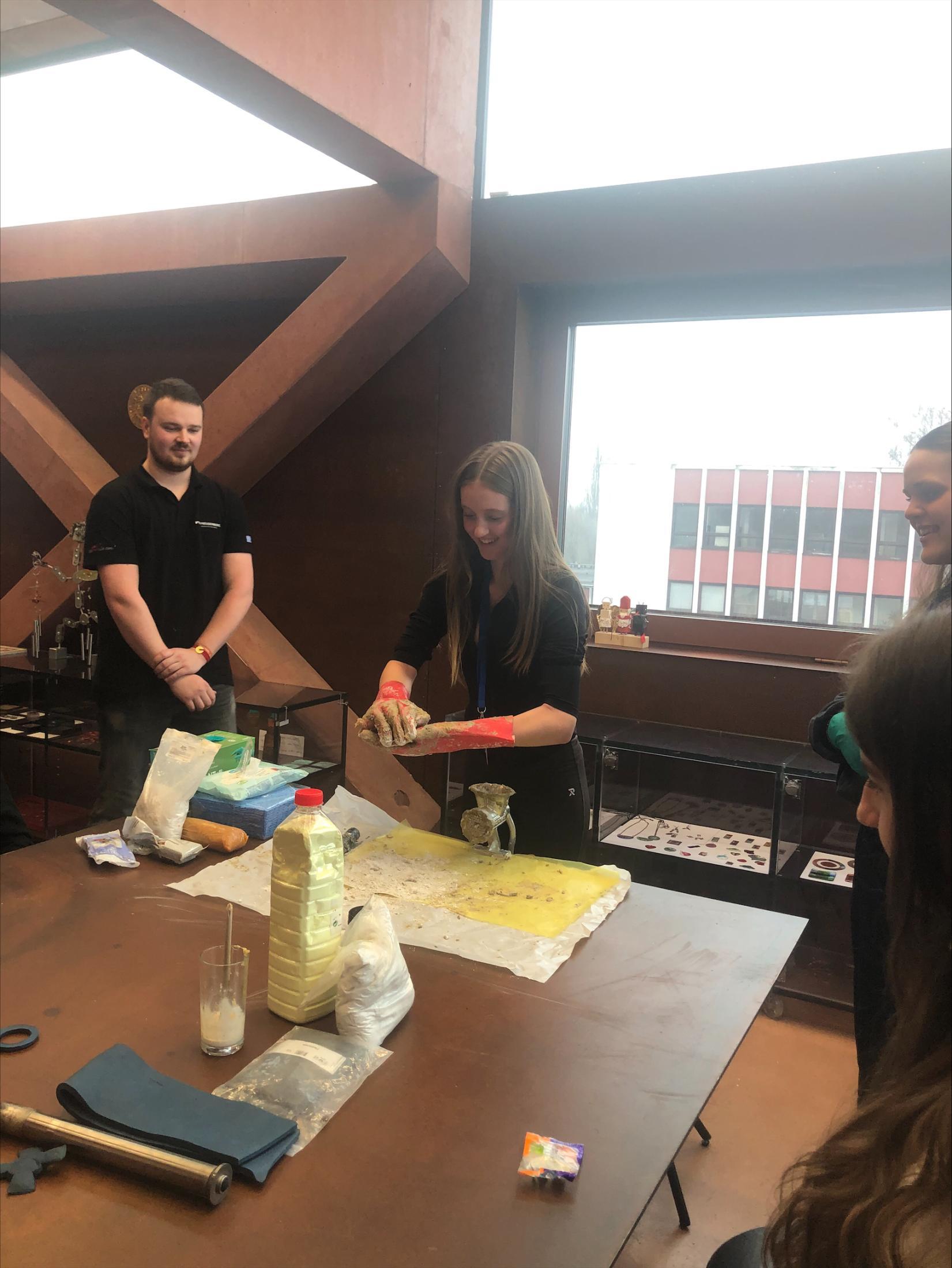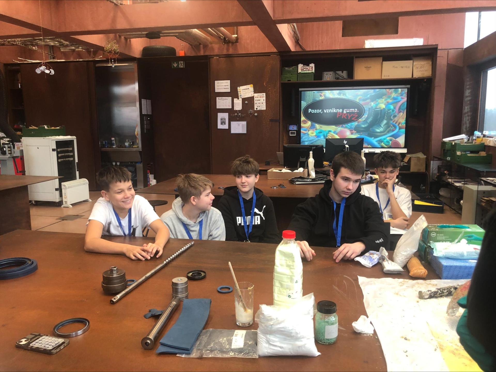 Zkusili jsme si dát kaučuk na ruku. Zjistili jsme, že více vulkanizačního činidla nám zajistí větší pevnost gumy. Dozvěděli jsme se, že do těsnění se dává kovová kostra, aby držela tvar. Plachta se vyrábí tak, že se textil namočí do latexu. Protože plast nevede elektřinu, používá se např. na rukojeti šroubováků.