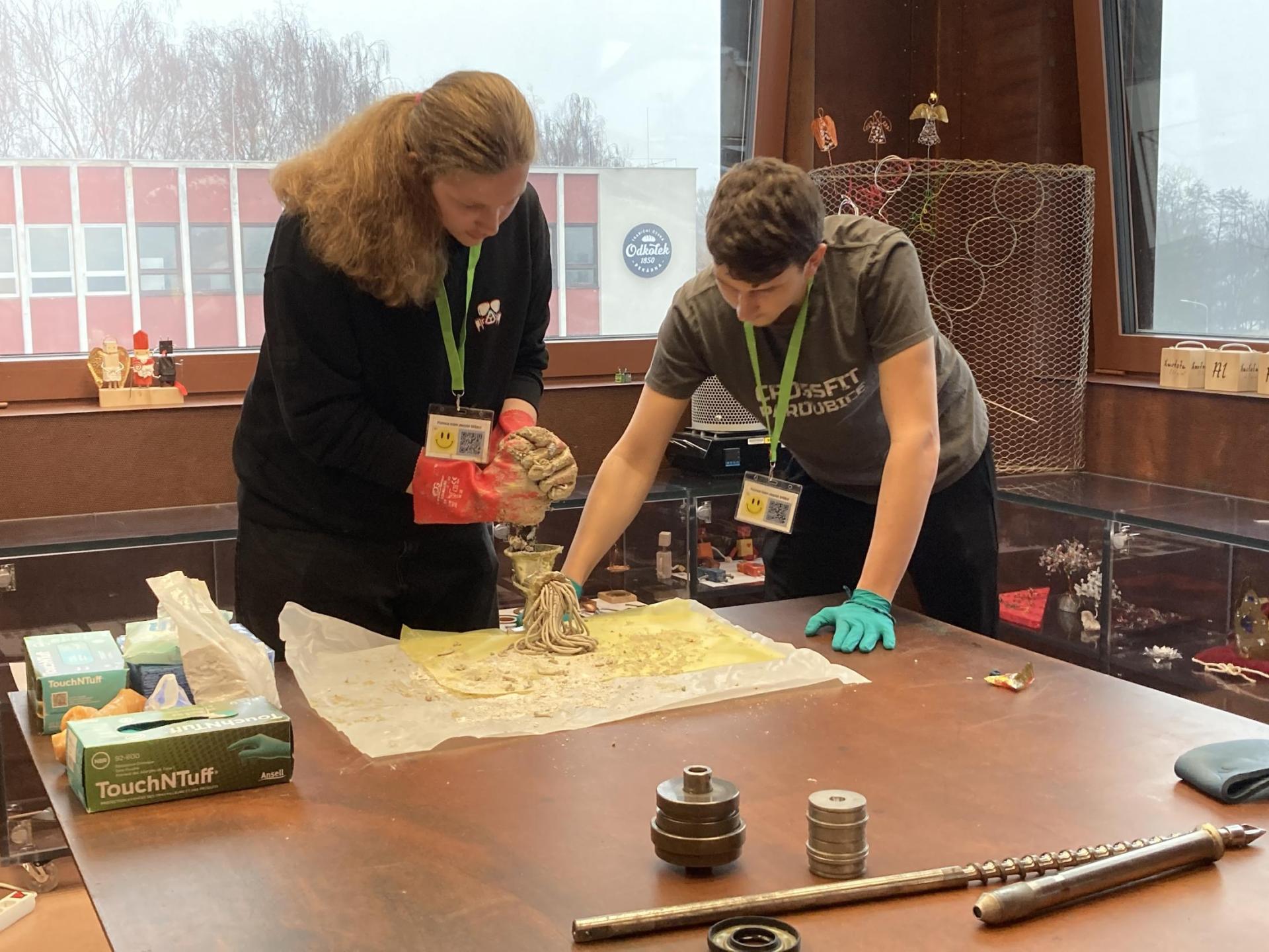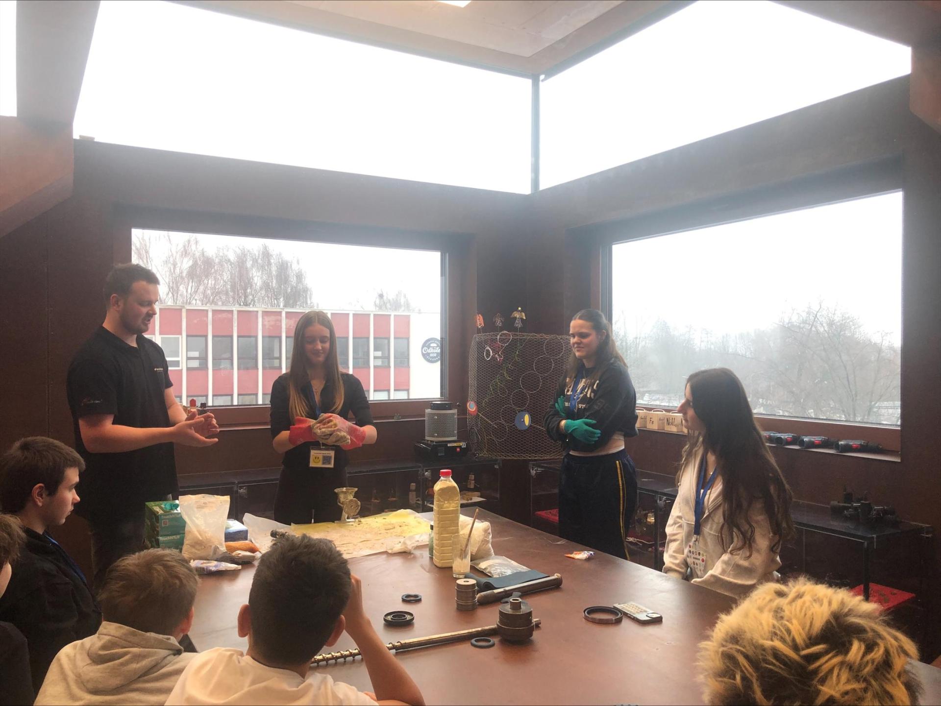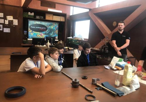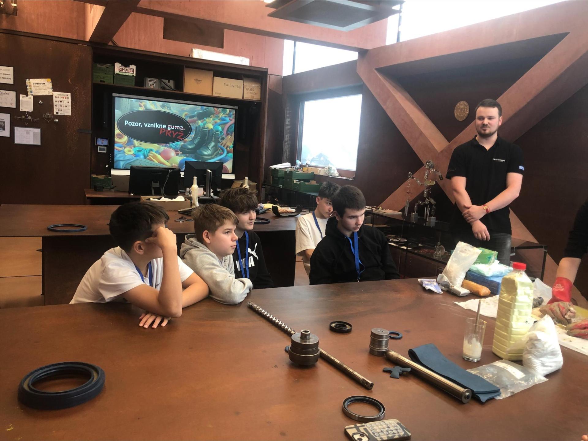 Dnes jsme ve Sféře navštívili program „Svět gumy“. Dozvěděli jsme se, že guma se vyrábí z přírodního kaučuku nebo z ropy. Přidávají se vulkanizační činidla (síra), plniva (uhlík), pojiva (sádra), změkčovadla, barviva atd. Vzniklá homogenní směs se dá do extrudéru (použili jsme mlýnek na maso).