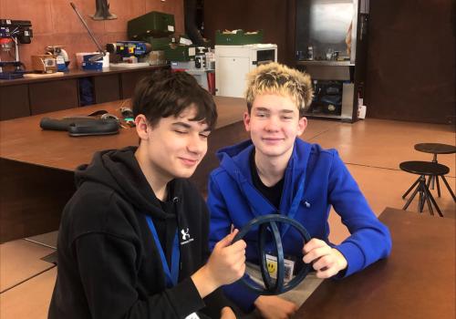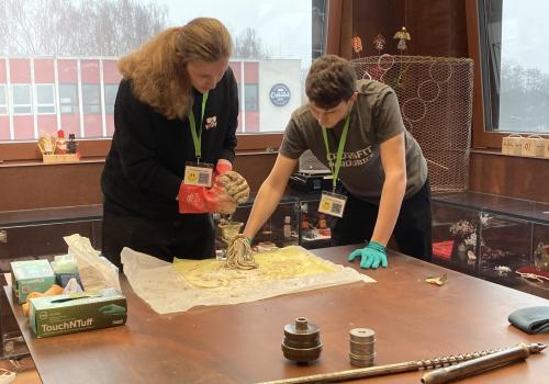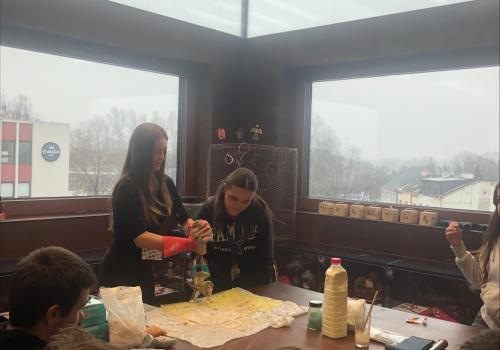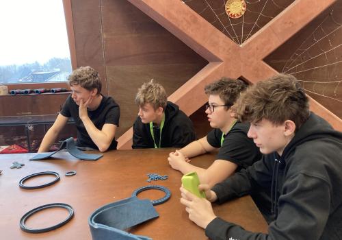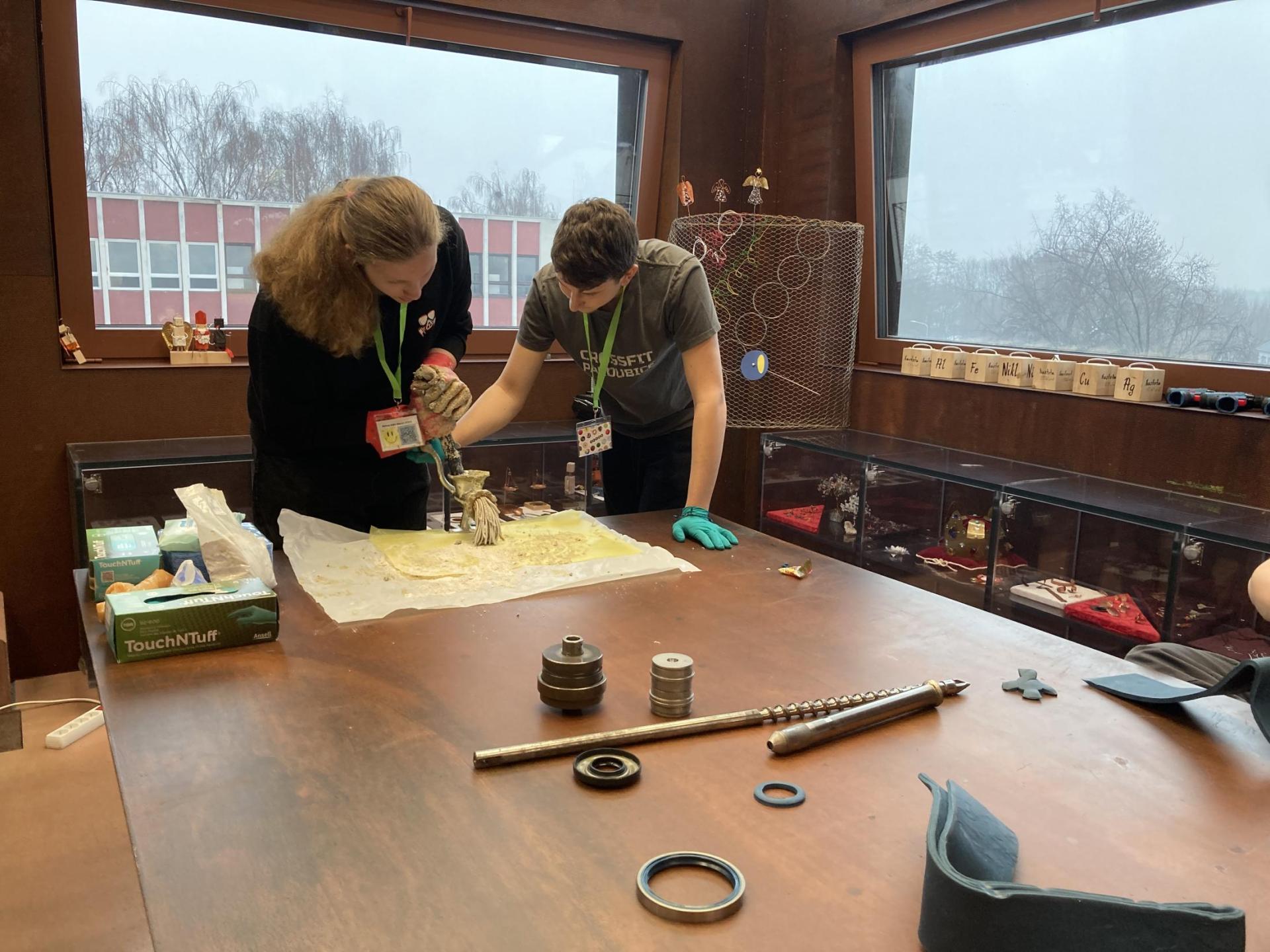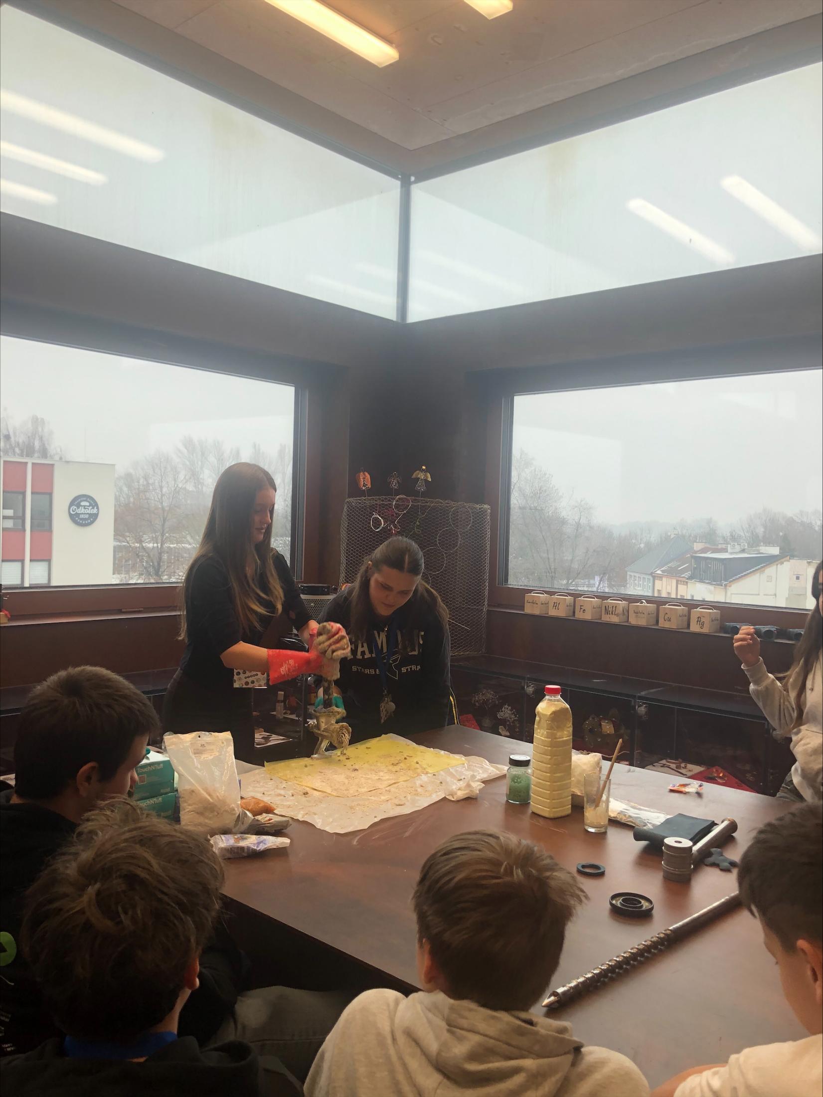 Dnes jsme ve Sféře navštívili program „Svět gumy“. Dozvěděli jsme se, že guma se vyrábí z přírodního kaučuku nebo z ropy. Přidávají se vulkanizační činidla (síra), plniva (uhlík), pojiva (sádra), změkčovadla, barviva atd. Vzniklá homogenní směs se dá do extrudéru (použili jsme mlýnek na maso).