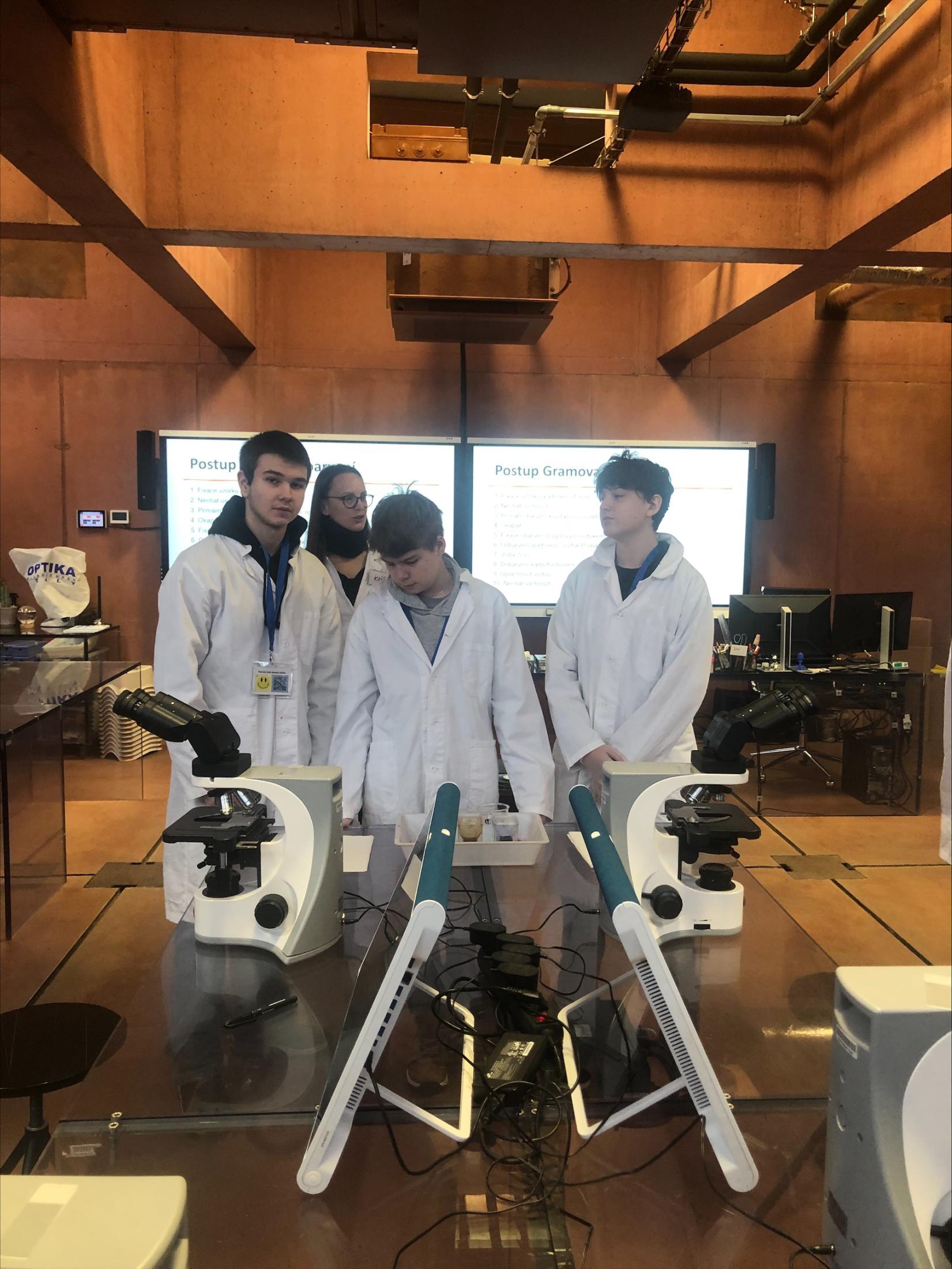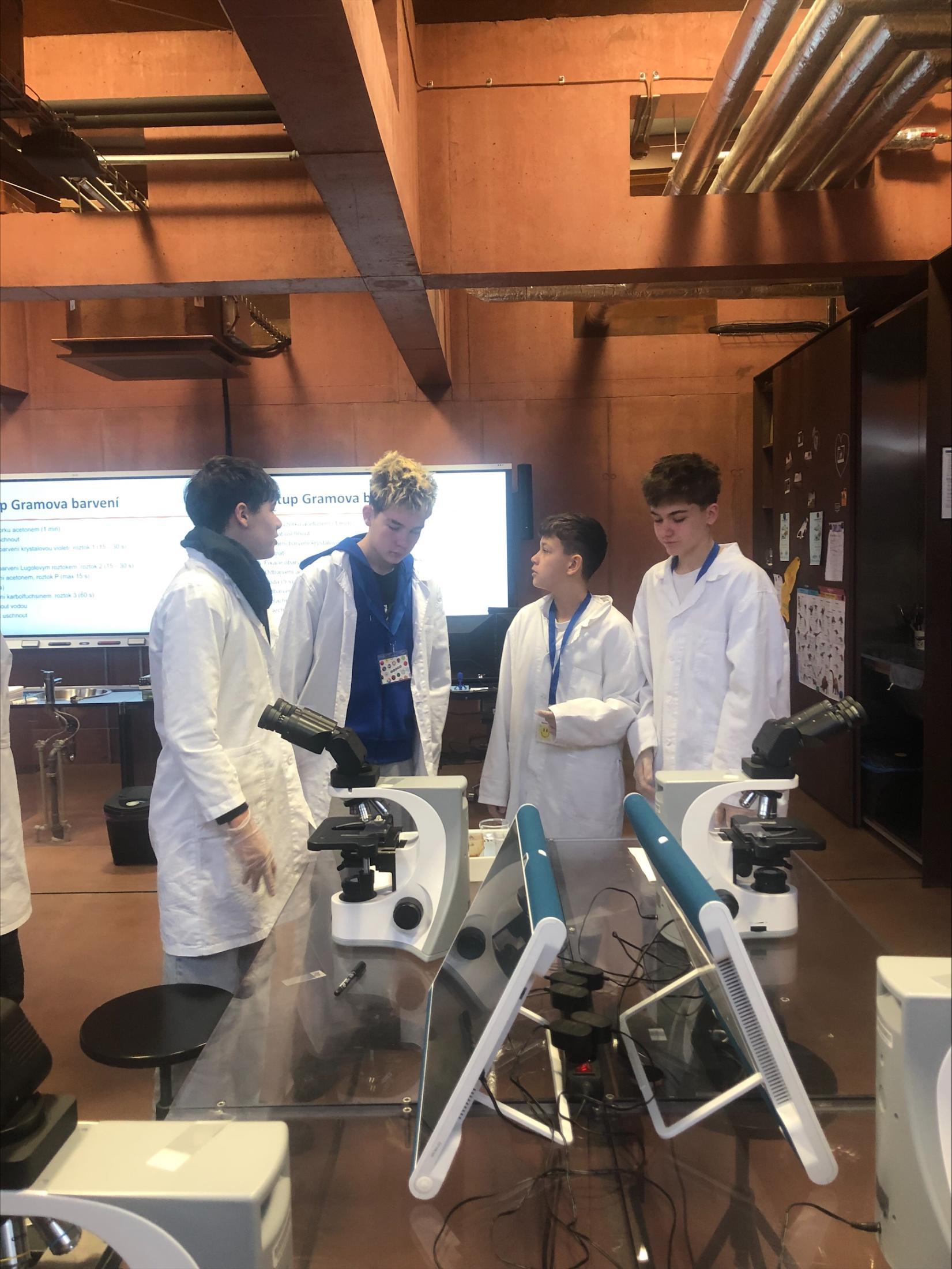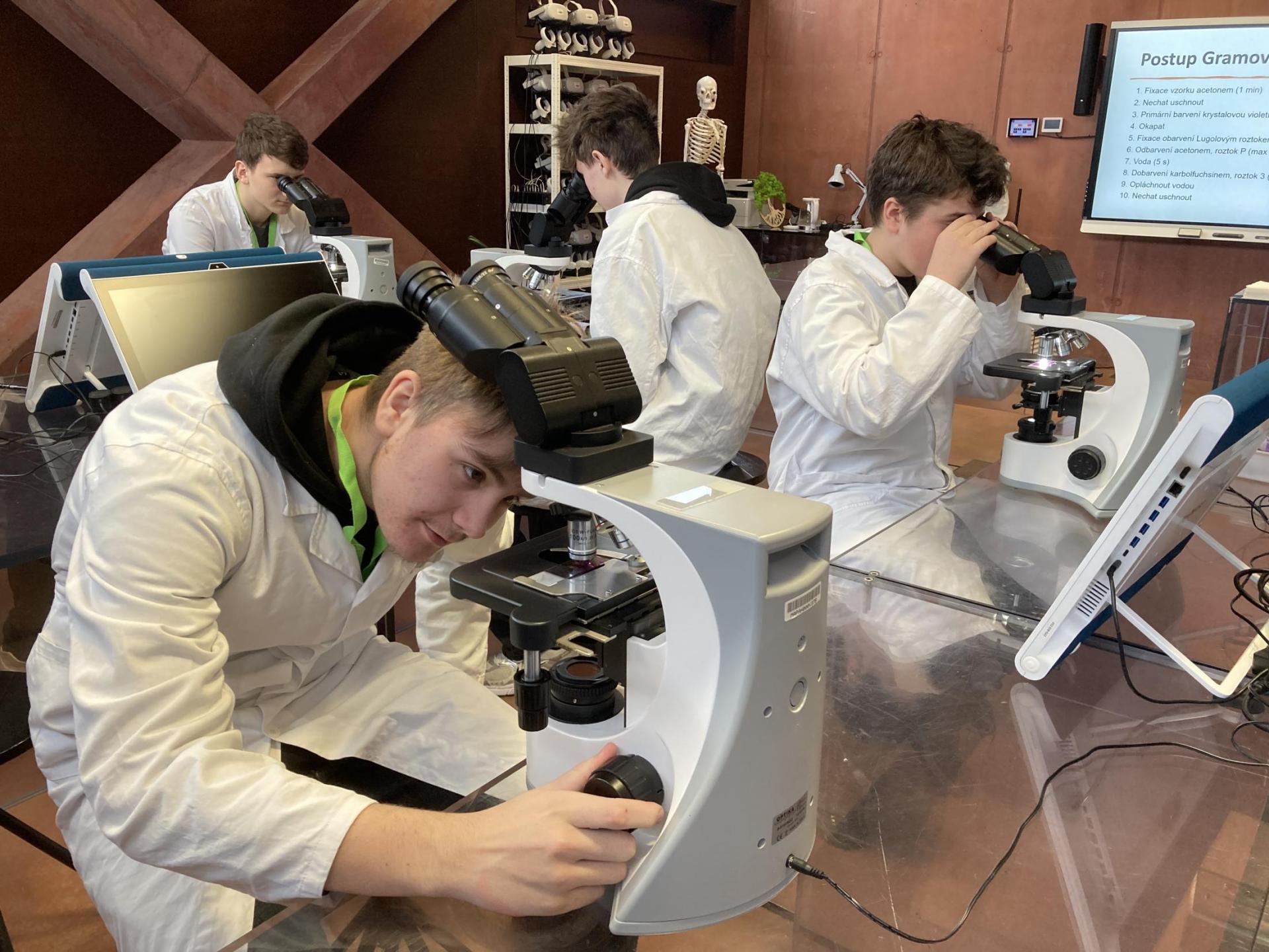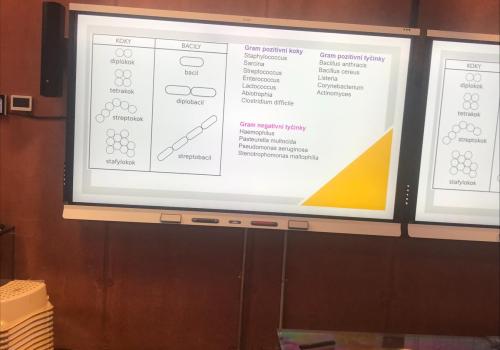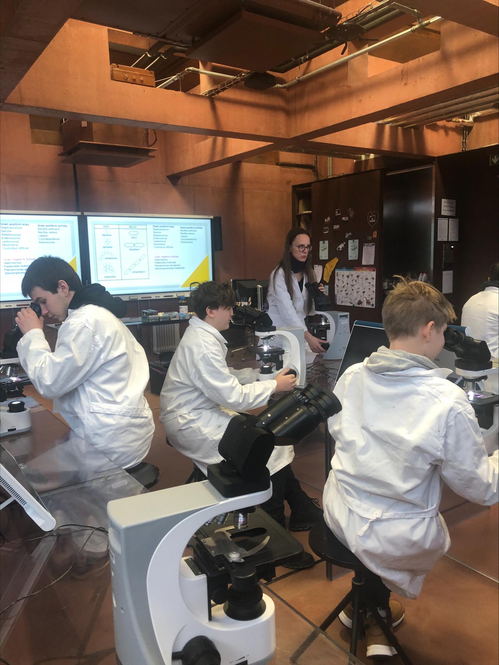 Druhý program byl zaměřený na přírodopis a jmenoval se „Mikrosvět v puse“. Tady jsme se dozvěděli, jak je důležitý mikrobiom, který máme ve střevech. Naše střeva jsou zoologická zahrada, kde žije až 1 kg bakterií. Některé bakterie jsou důležité (pomáhají tvořit vitamíny), jiné jsou škodlivé (vedou k nemocem). Naše strava ovlivňuje, které bakterie ve střevech budeme mít. Mikrobiom stimuluje imunitní systém a nerovnováha vede k nemocem. Pomocí Gramova barvení jsme pod mikroskopem pozorovali obsah ústní dutiny. Dozvěděli jsme se, že koky jsou kolečka a bacily tyčinky, a že bakterie jsou větší než viry.