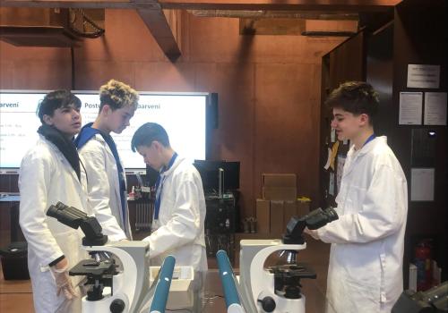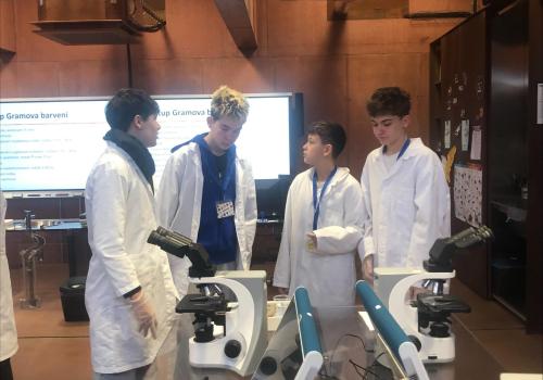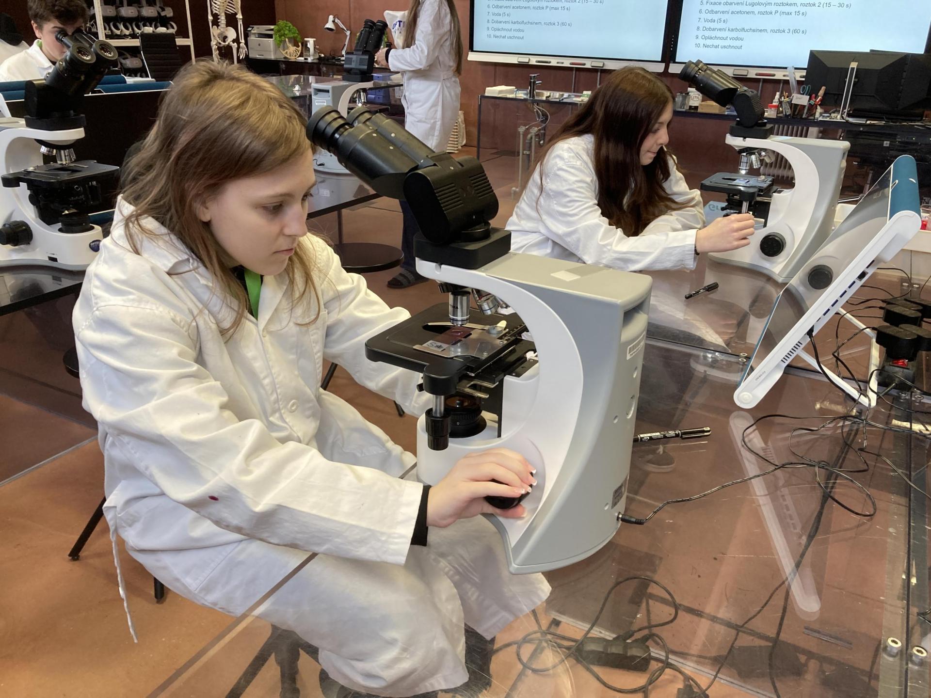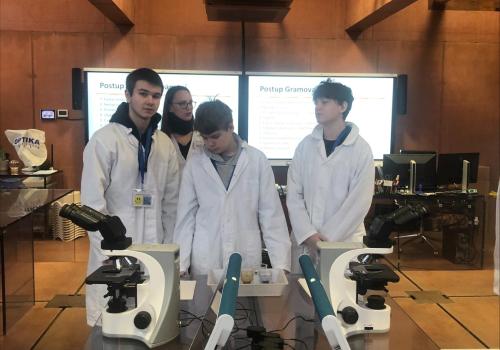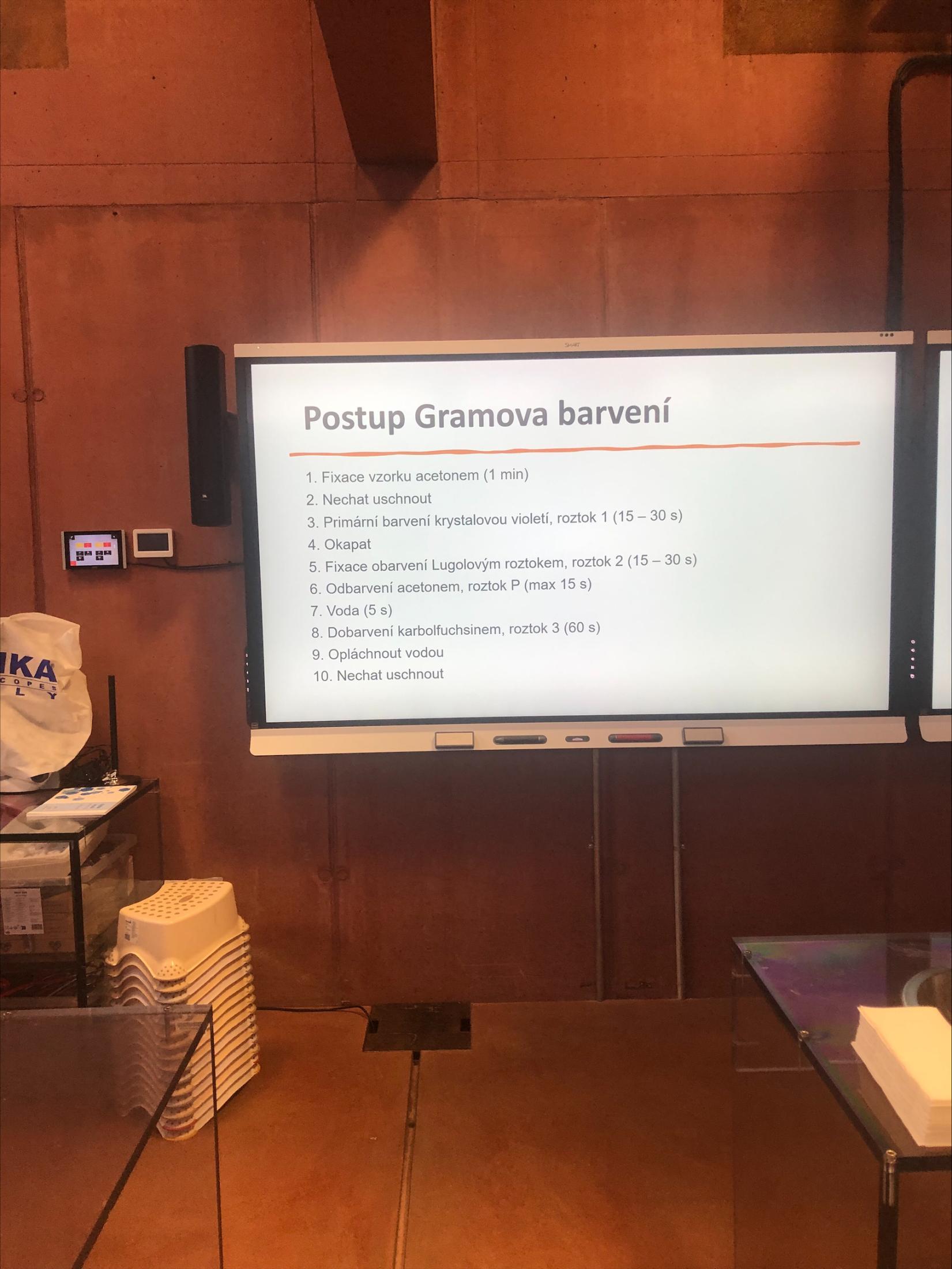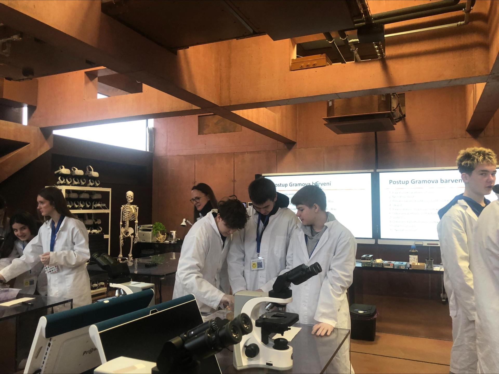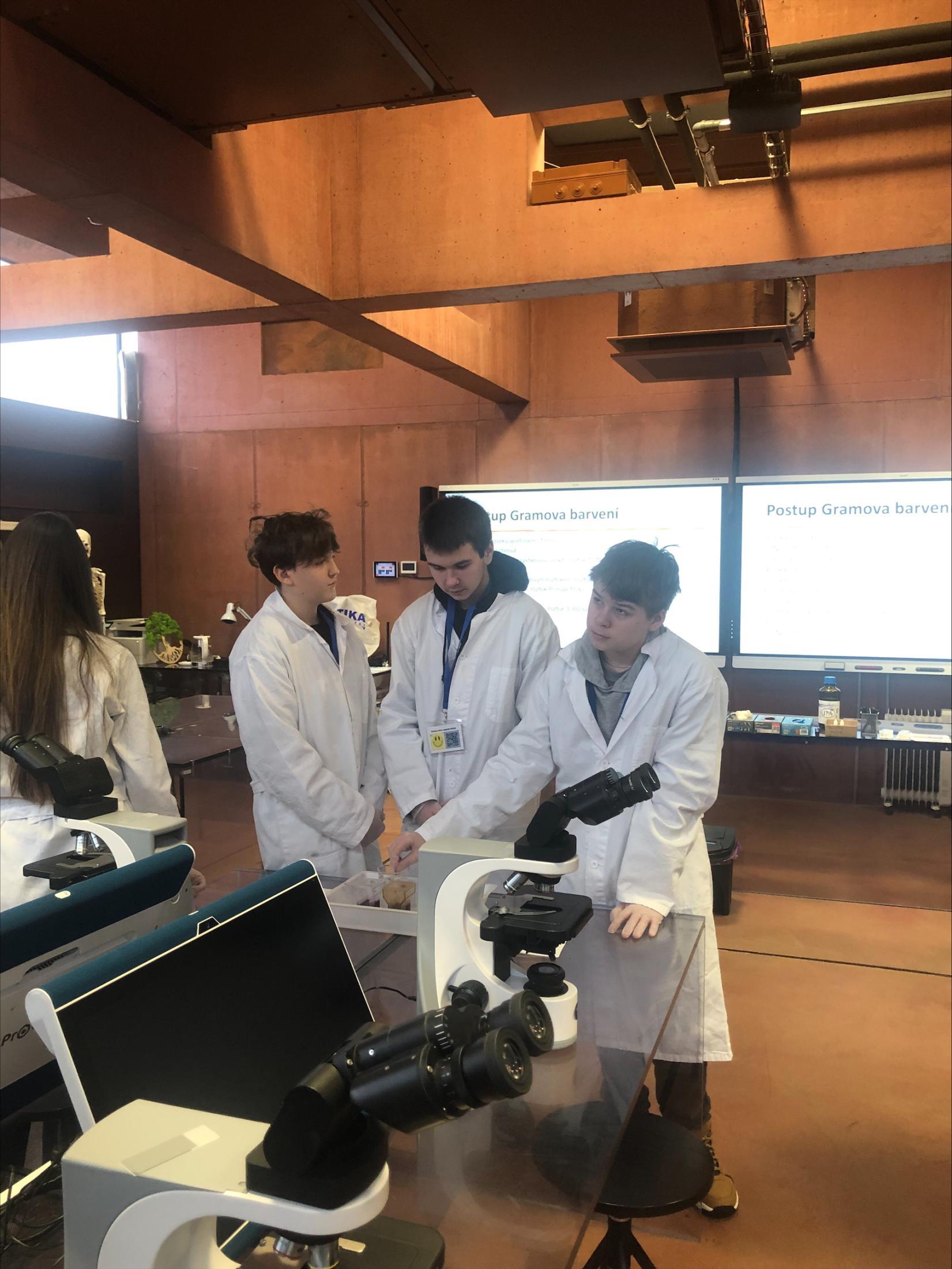 Druhý program byl zaměřený na přírodopis a jmenoval se „Mikrosvět v puse“. Tady jsme se dozvěděli, jak je důležitý mikrobiom, který máme ve střevech. Naše střeva jsou zoologická zahrada, kde žije až 1 kg bakterií. Některé bakterie jsou důležité (pomáhají tvořit vitamíny), jiné jsou škodlivé (vedou k nemocem). Naše strava ovlivňuje, které bakterie ve střevech budeme mít. Mikrobiom stimuluje imunitní systém a nerovnováha vede k nemocem. Pomocí Gramova barvení jsme pod mikroskopem pozorovali obsah ústní dutiny. Dozvěděli jsme se, že koky jsou kolečka a bacily tyčinky, a že bakterie jsou větší než viry.