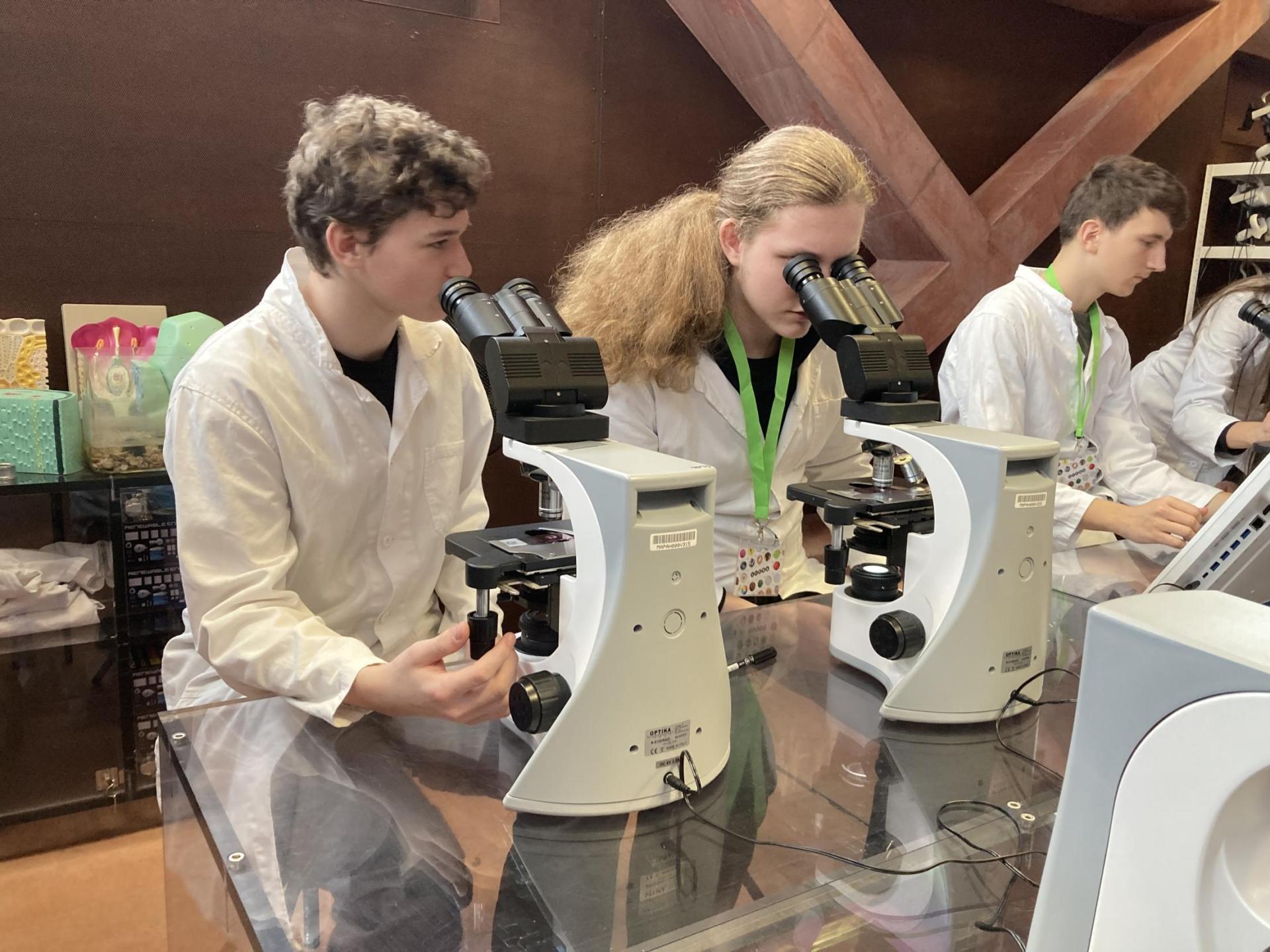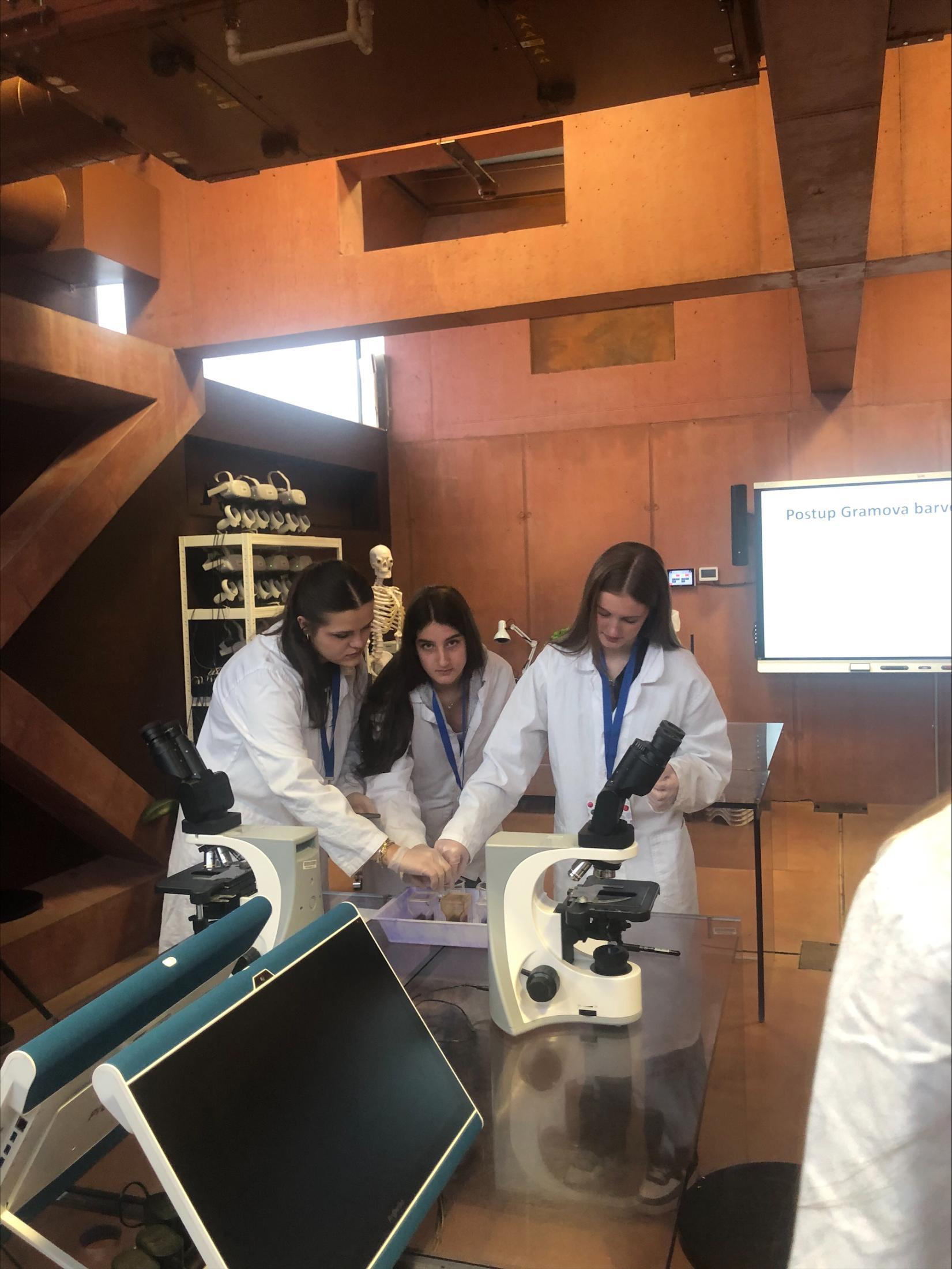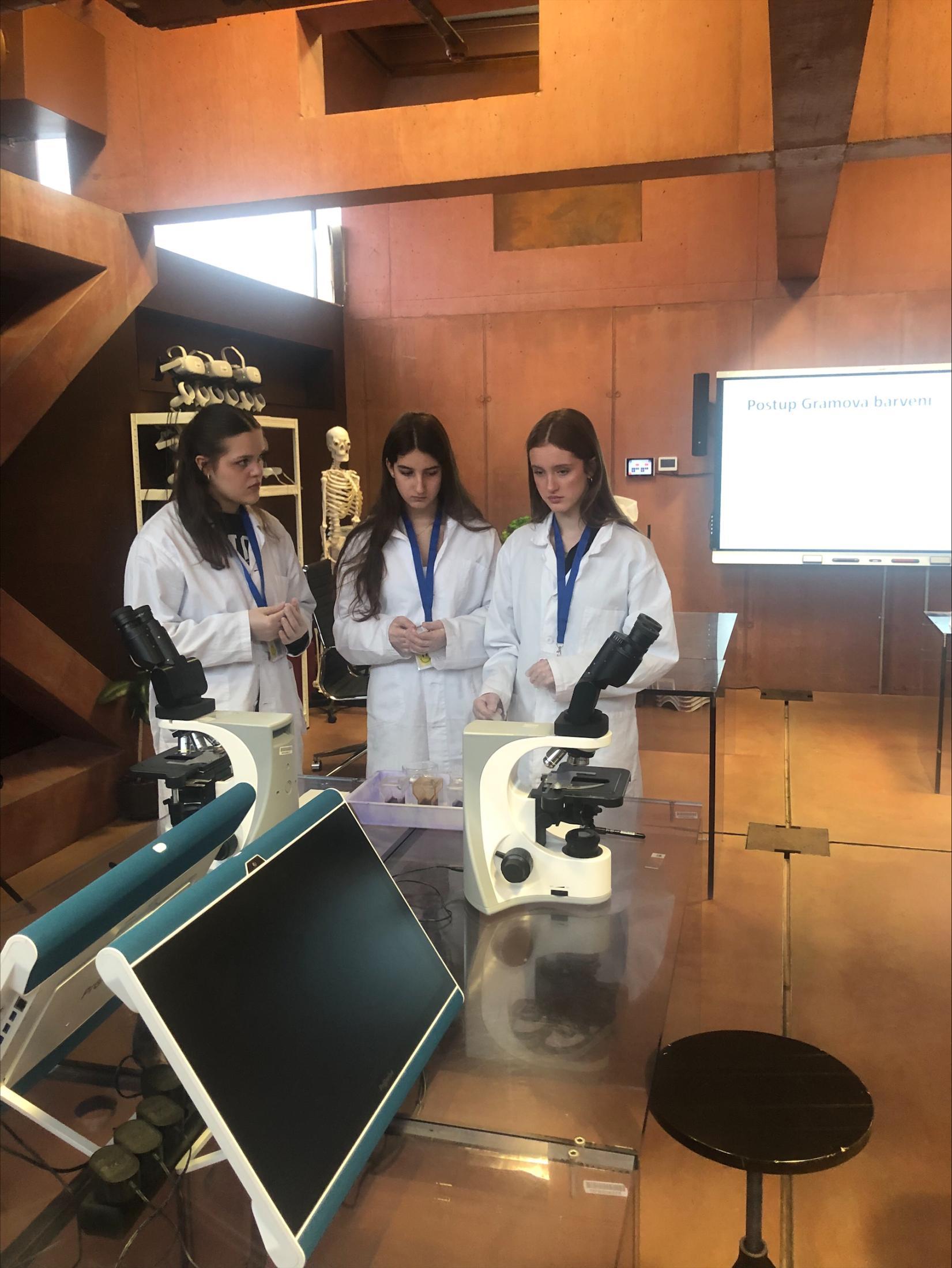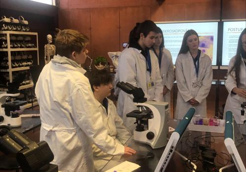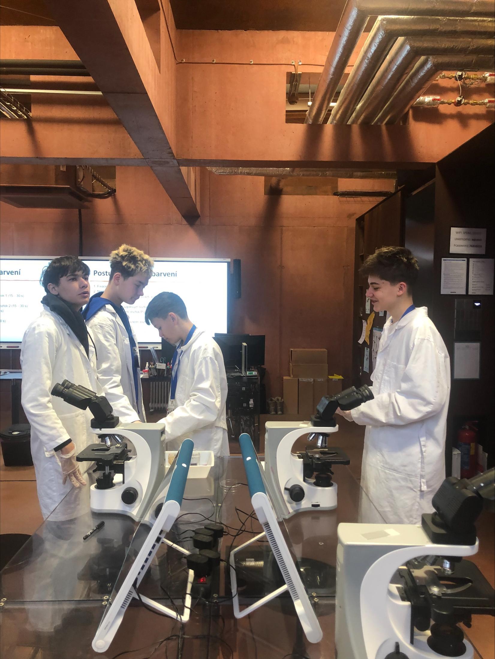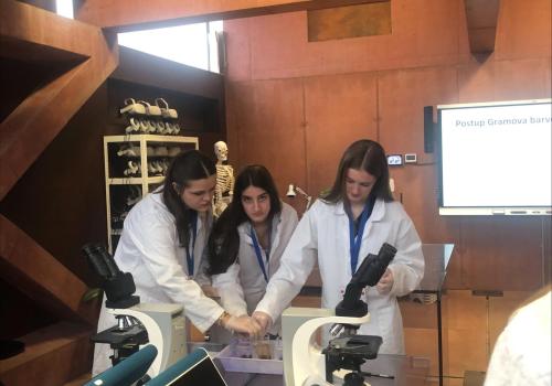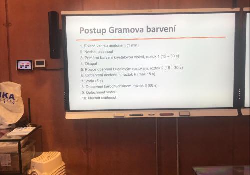 Druhý program byl zaměřený na přírodopis a jmenoval se „Mikrosvět v puse“. Tady jsme se dozvěděli, jak je důležitý mikrobiom, který máme ve střevech. Naše střeva jsou zoologická zahrada, kde žije až 1 kg bakterií. Některé bakterie jsou důležité (pomáhají tvořit vitamíny), jiné jsou škodlivé (vedou k nemocem). Naše strava ovlivňuje, které bakterie ve střevech budeme mít. Mikrobiom stimuluje imunitní systém a nerovnováha vede k nemocem. Pomocí Gramova barvení jsme pod mikroskopem pozorovali obsah ústní dutiny. Dozvěděli jsme se, že koky jsou kolečka a bacily tyčinky, a že bakterie jsou větší než viry.