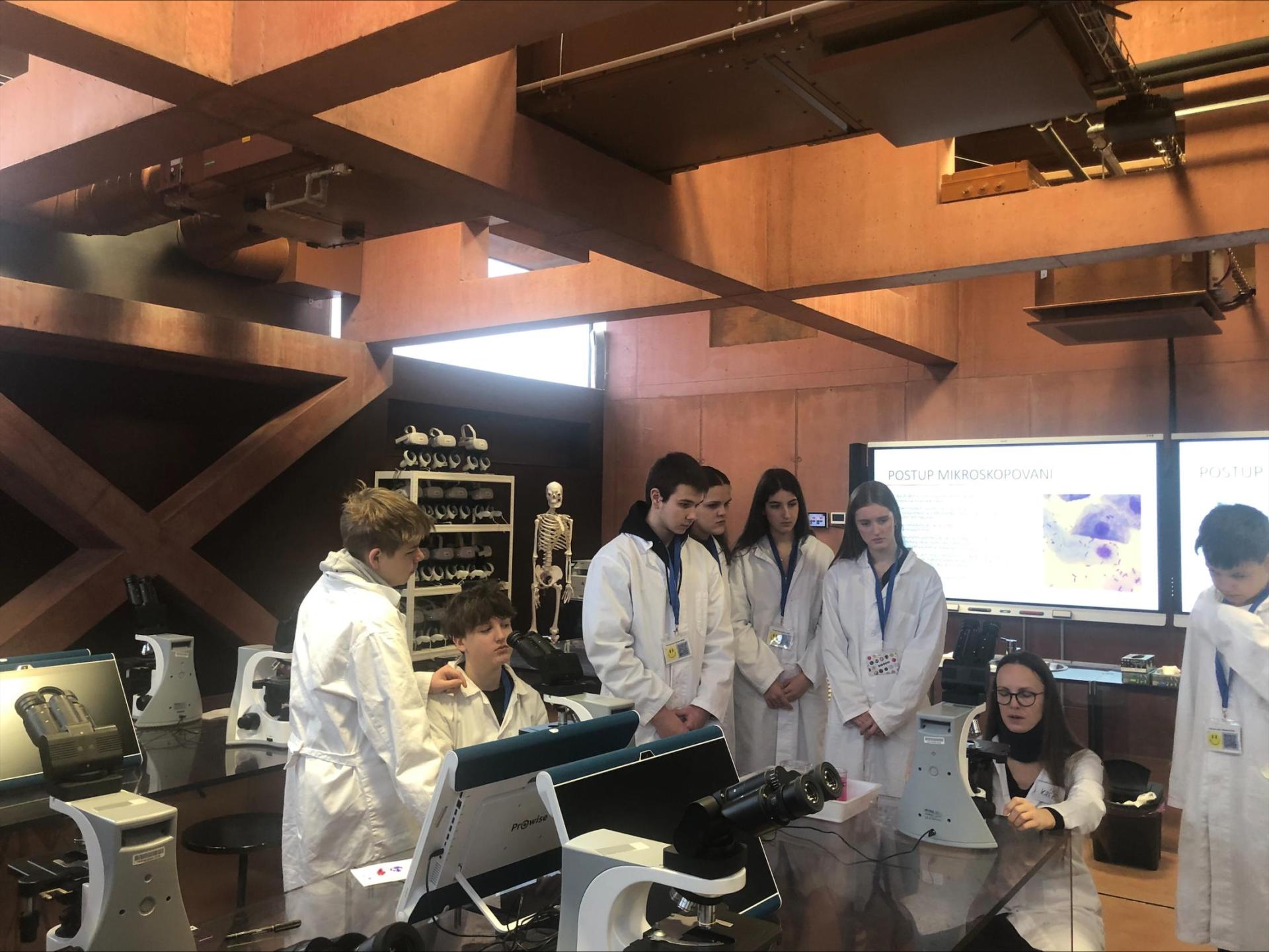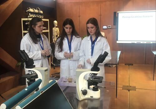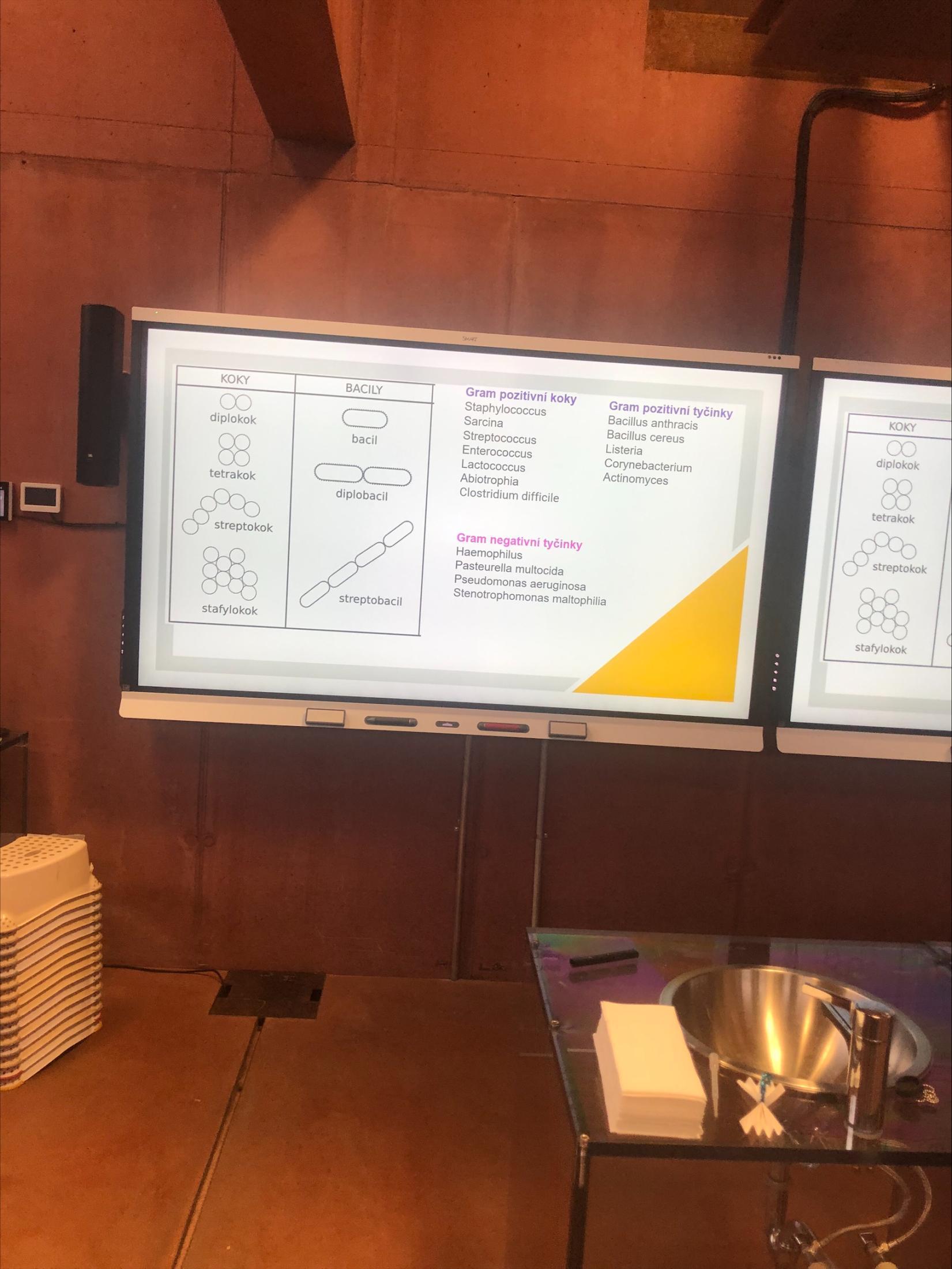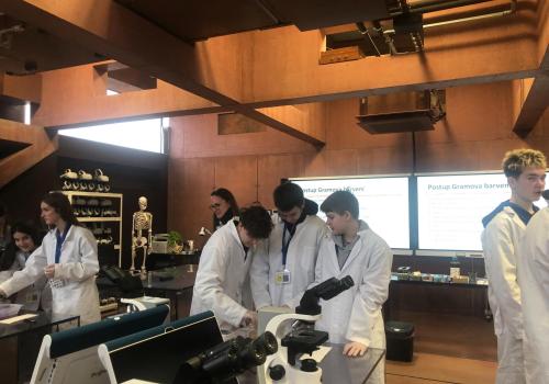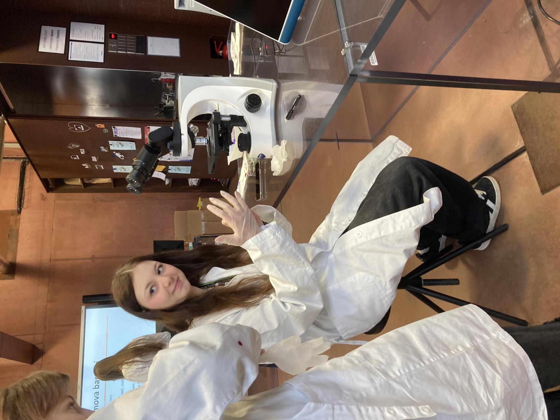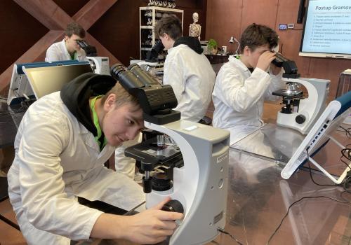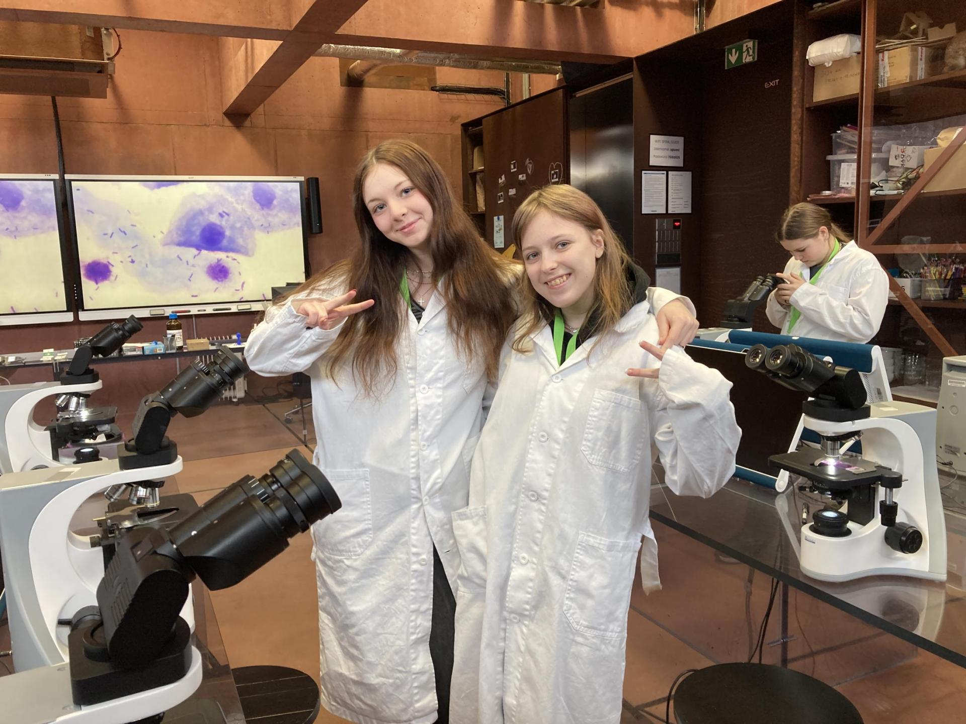 Druhý program byl zaměřený na přírodopis a jmenoval se „Mikrosvět v puse“. Tady jsme se dozvěděli, jak je důležitý mikrobiom, který máme ve střevech. Naše střeva jsou zoologická zahrada, kde žije až 1 kg bakterií. Některé bakterie jsou důležité (pomáhají tvořit vitamíny), jiné jsou škodlivé (vedou k nemocem). Naše strava ovlivňuje, které bakterie ve střevech budeme mít. Mikrobiom stimuluje imunitní systém a nerovnováha vede k nemocem. Pomocí Gramova barvení jsme pod mikroskopem pozorovali obsah ústní dutiny. Dozvěděli jsme se, že koky jsou kolečka a bacily tyčinky, a že bakterie jsou větší než viry.