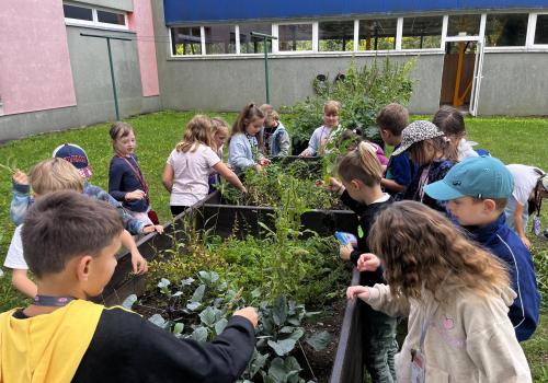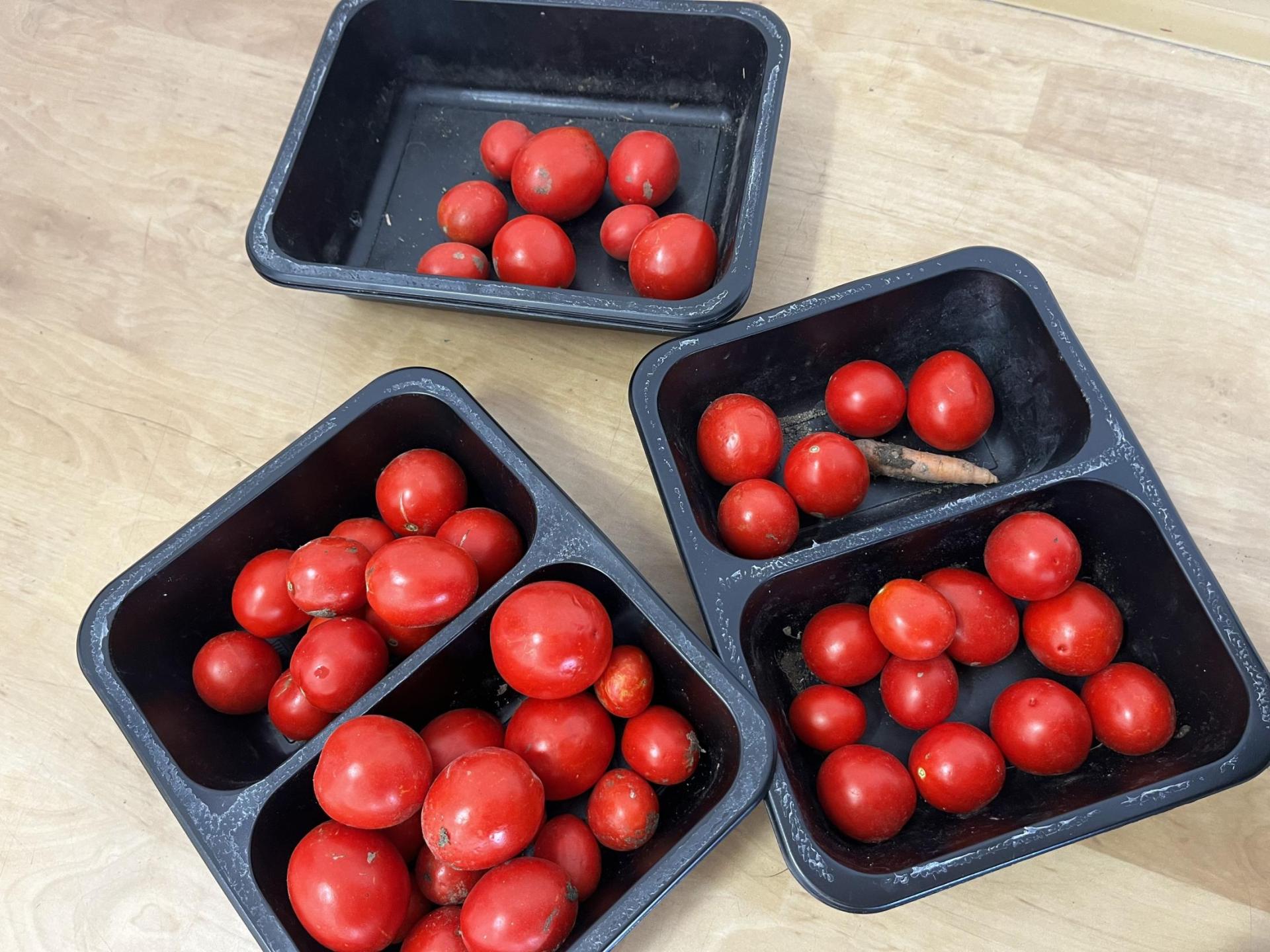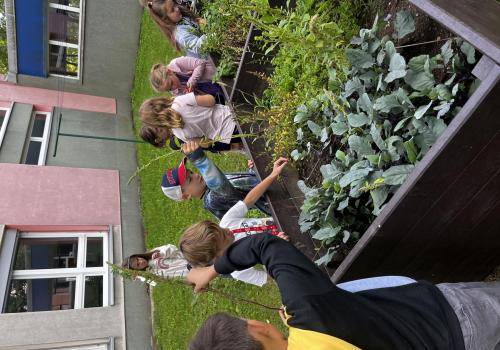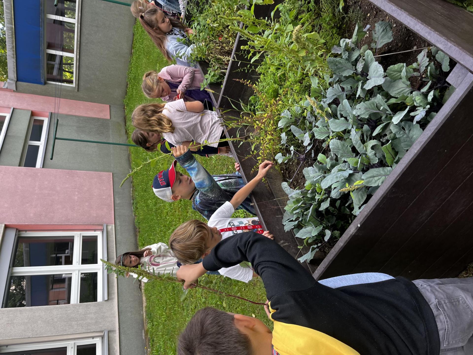 Přes prázdniny nám záhon trochu zarost, ale my jsme se o něj postarali a sklidili spoustu krásně červených rajčátek.