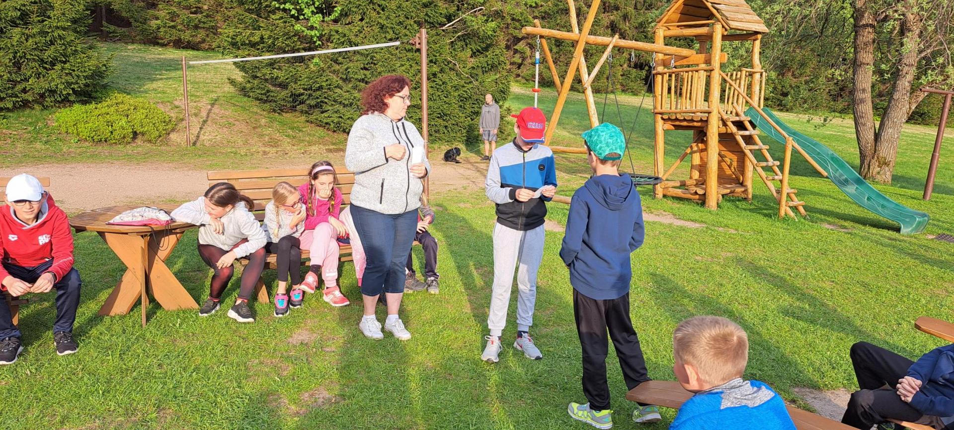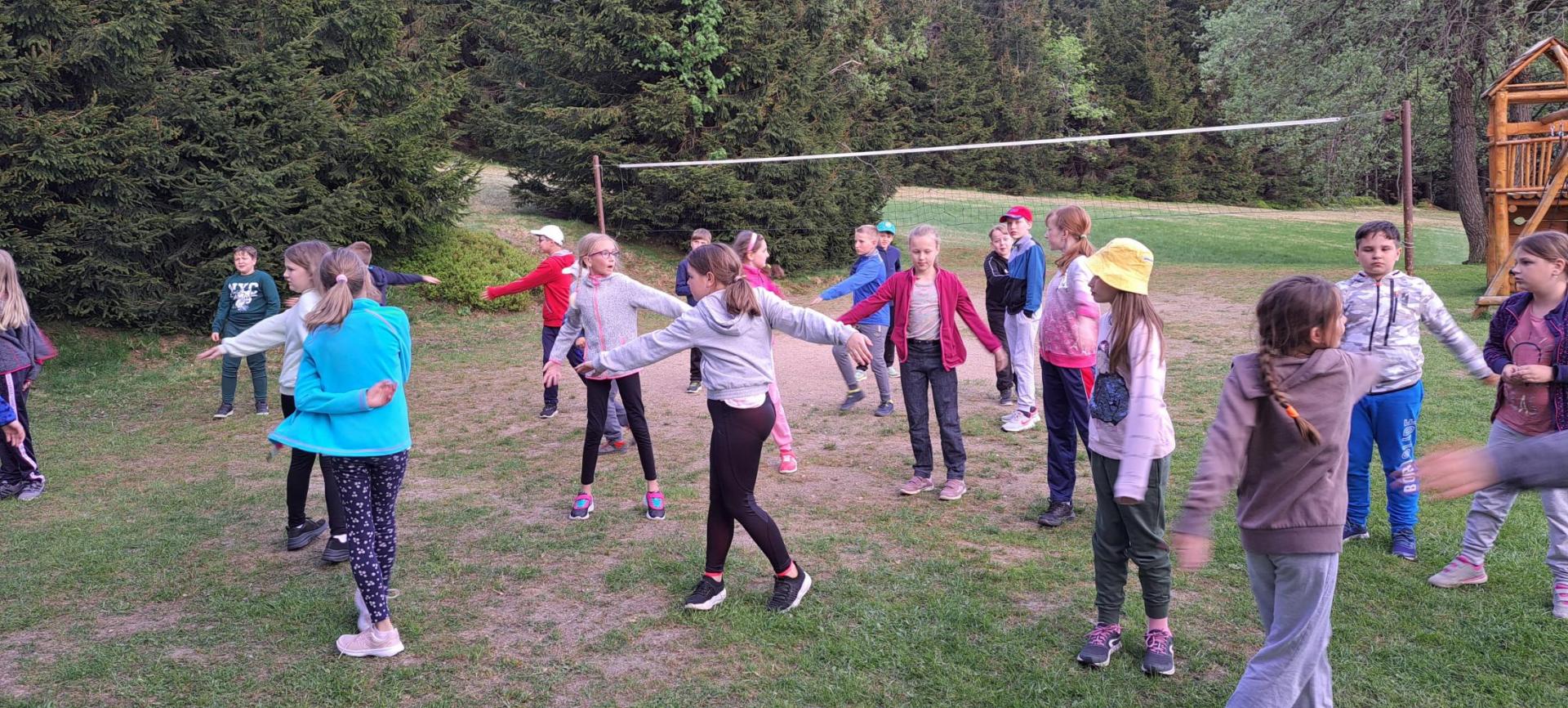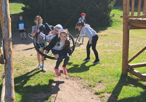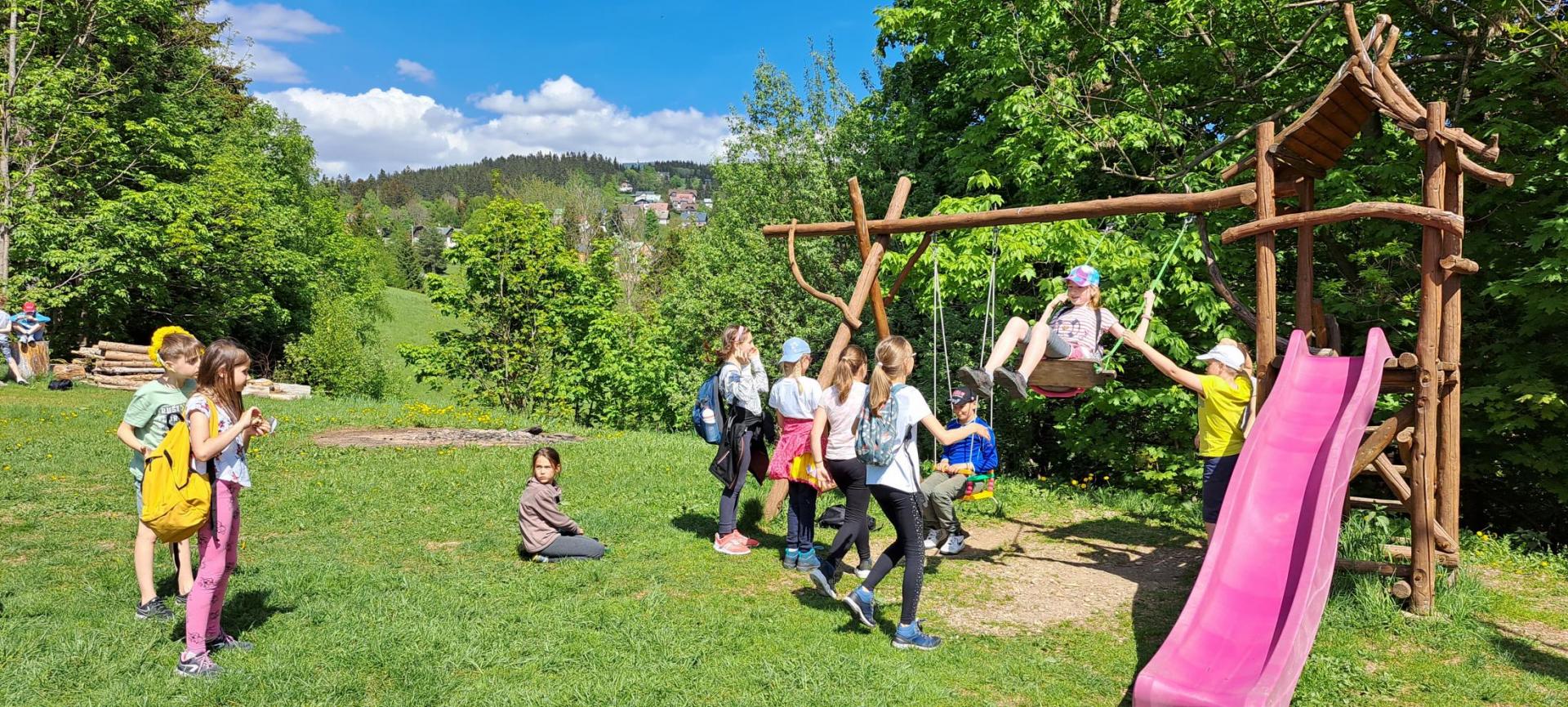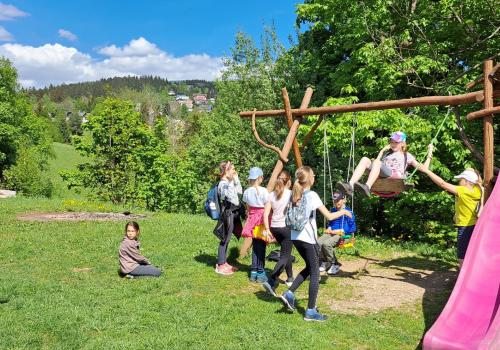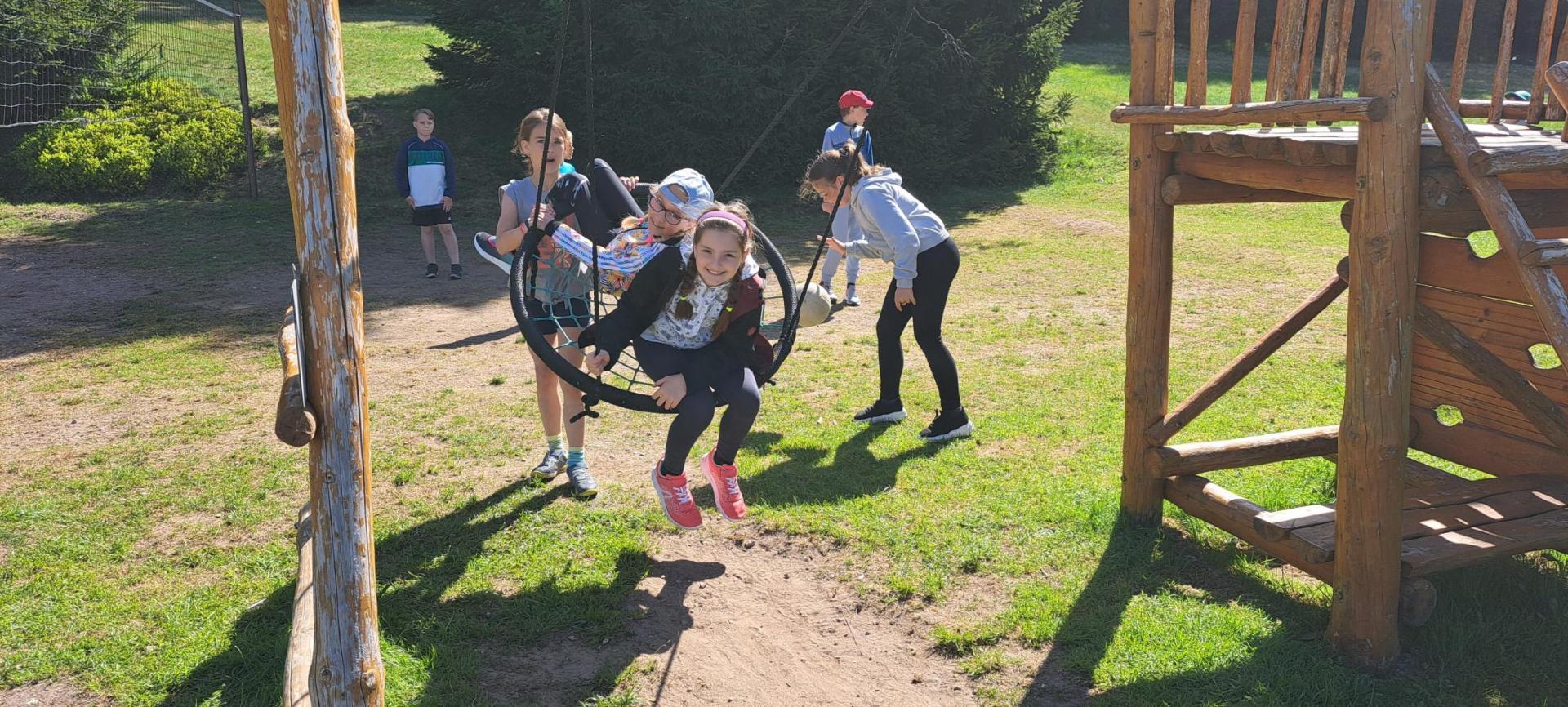 Cesta byla klidná, po příjezdu jsme hned využili venkovní hřiště, aby se děti trošku protáhly po cestě v autobuse.