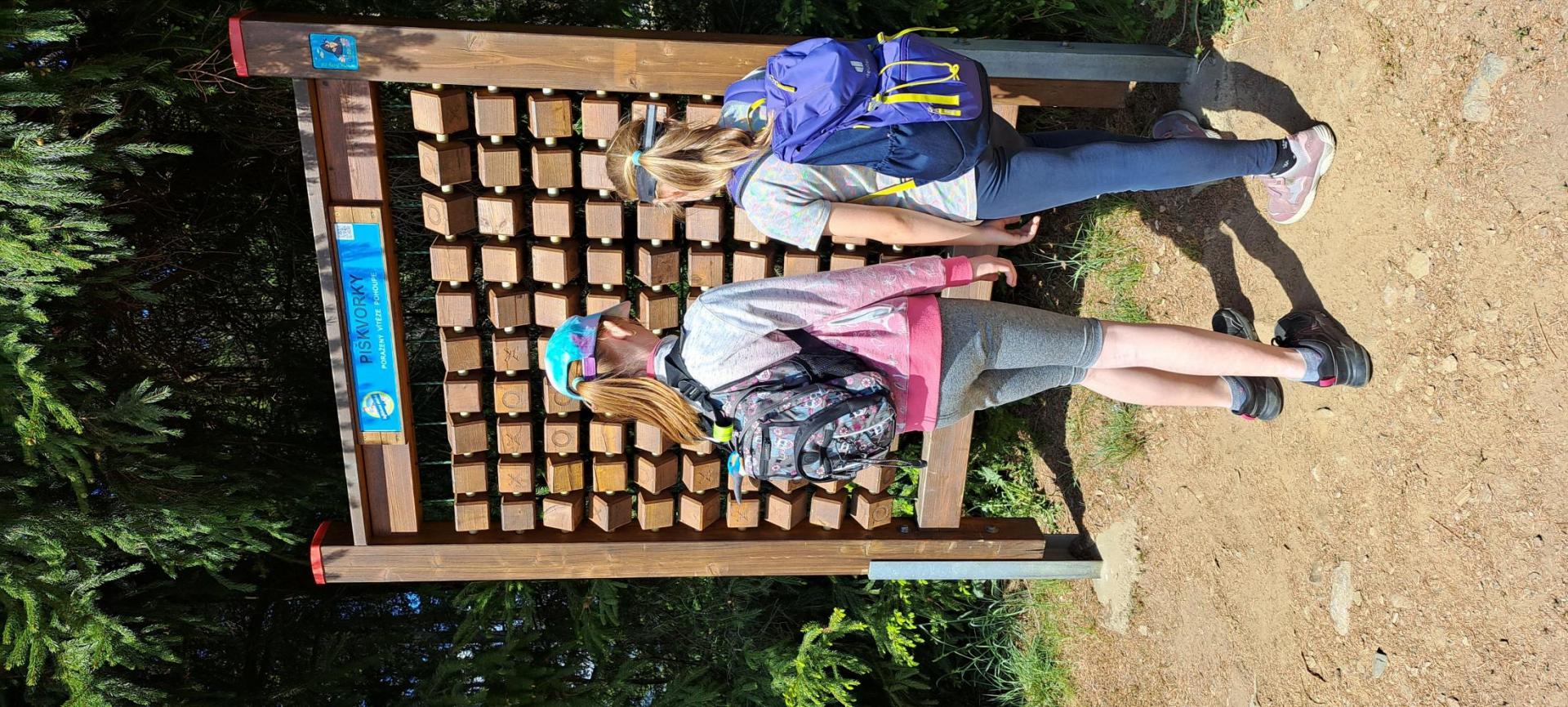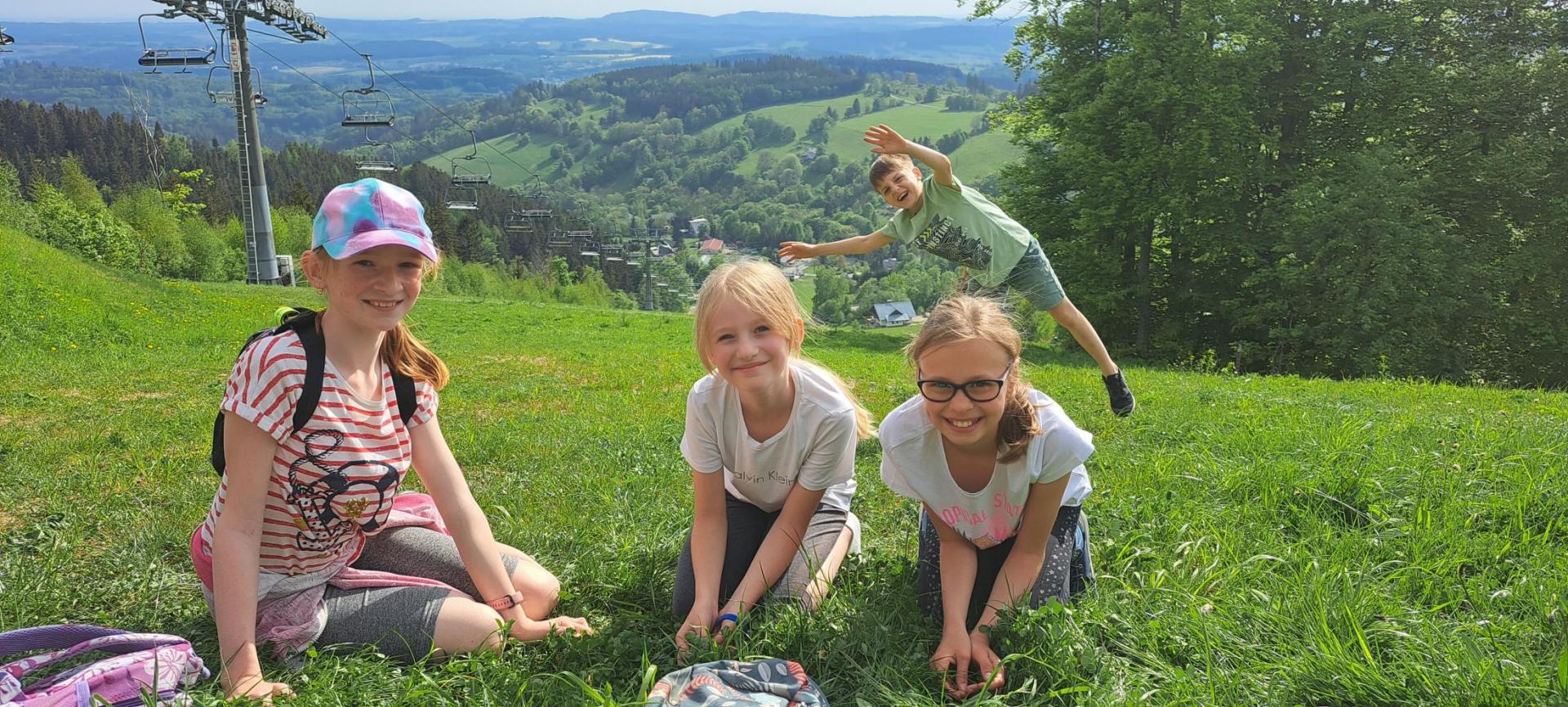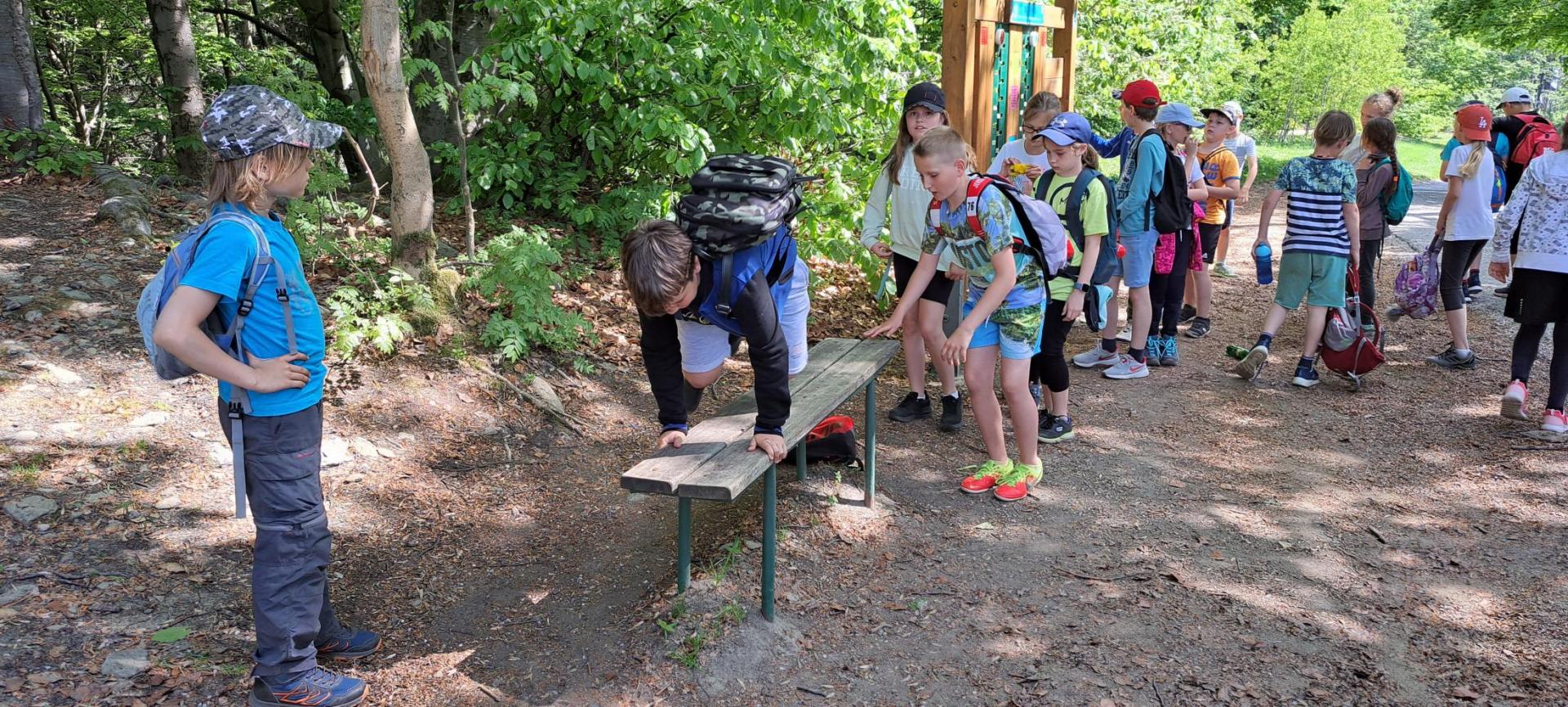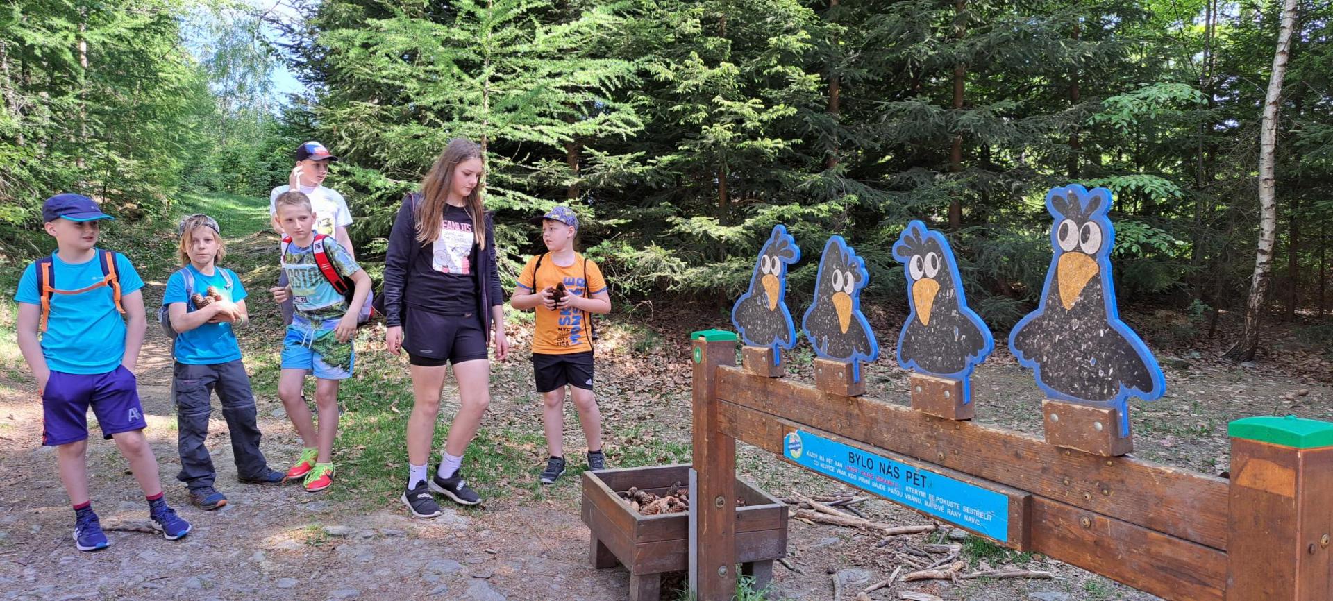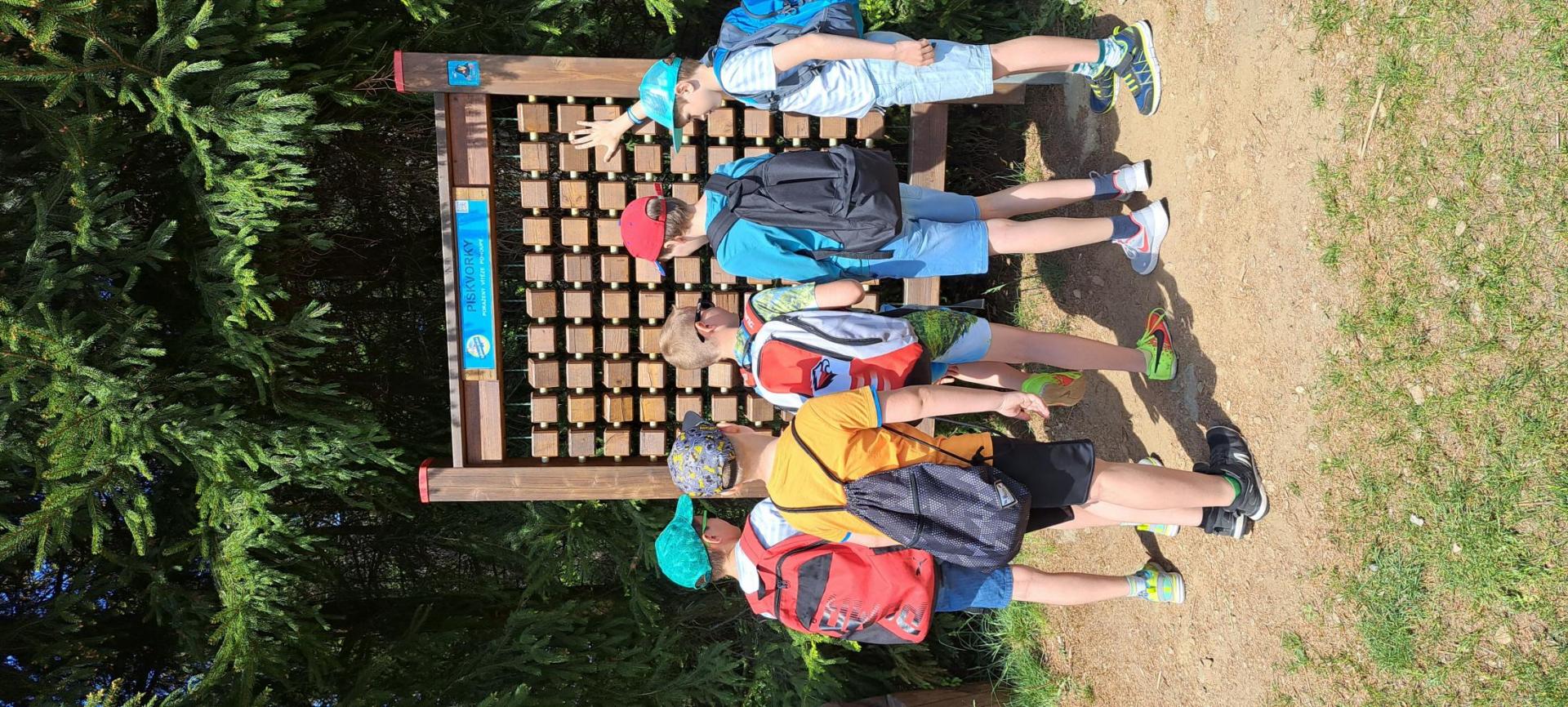 Posilněni jsme se vydali na Lufťákovu stezku, kde děti plnily úkoly. Zpátky to chtěli všichni vzít zkratkou, tak jsme si vyšlápli sjezdovku (někteří ji dobrovolně běhali několikrát).
