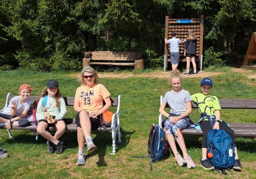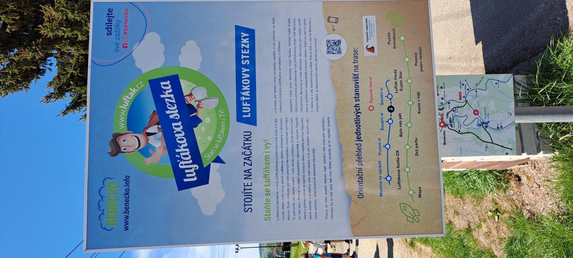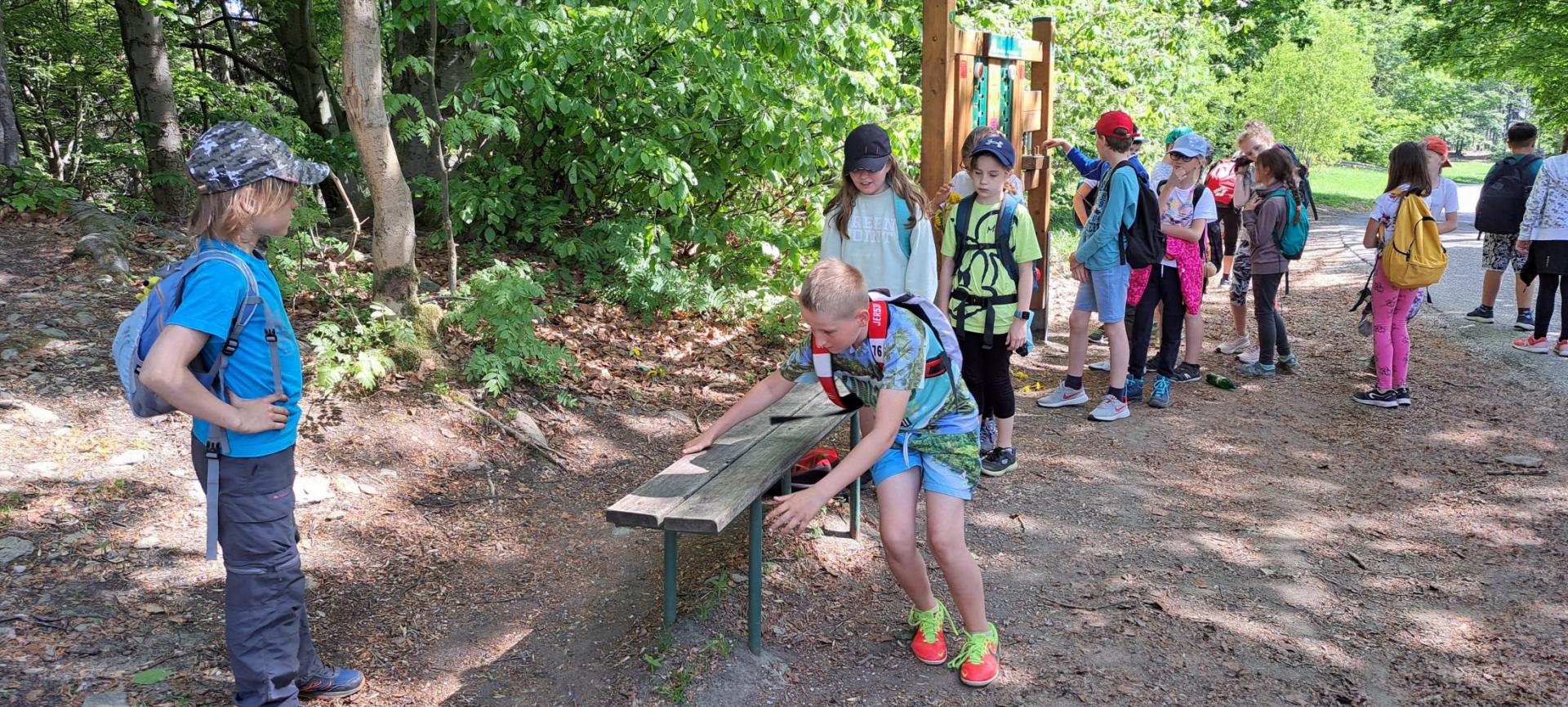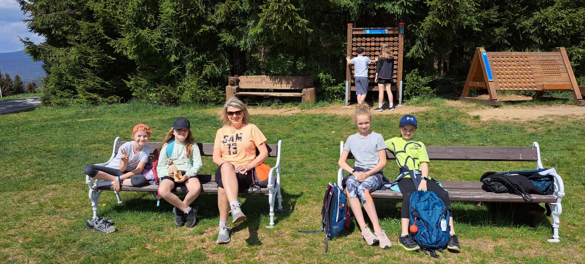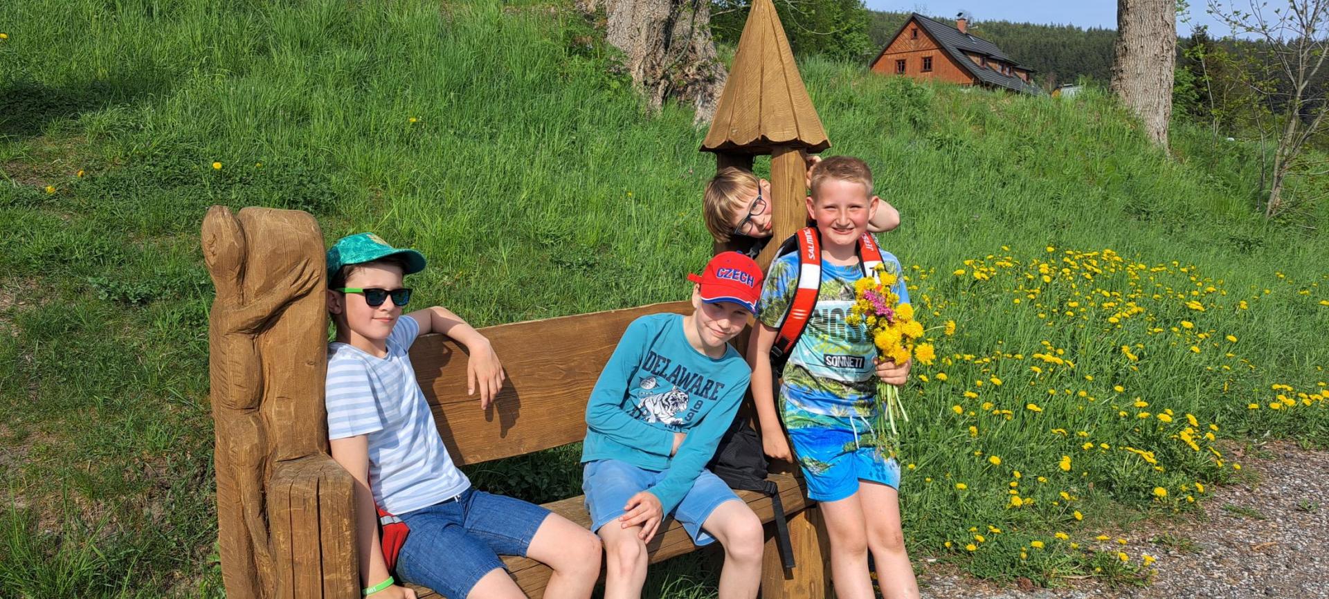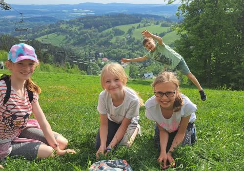 Posilněni jsme se vydali na Lufťákovu stezku, kde děti plnily úkoly. Zpátky to chtěli všichni vzít zkratkou, tak jsme si vyšlápli sjezdovku (někteří ji dobrovolně běhali několikrát).