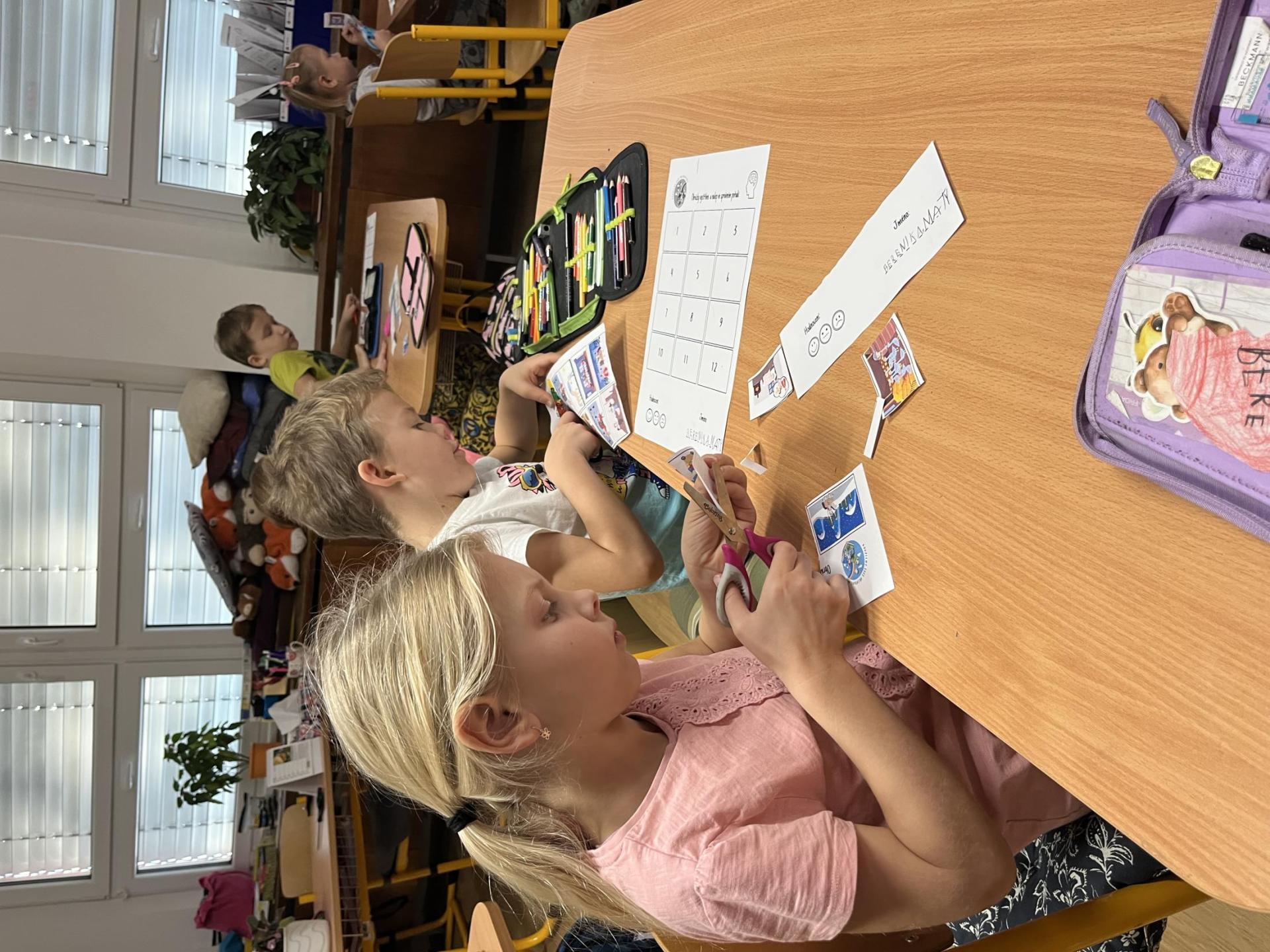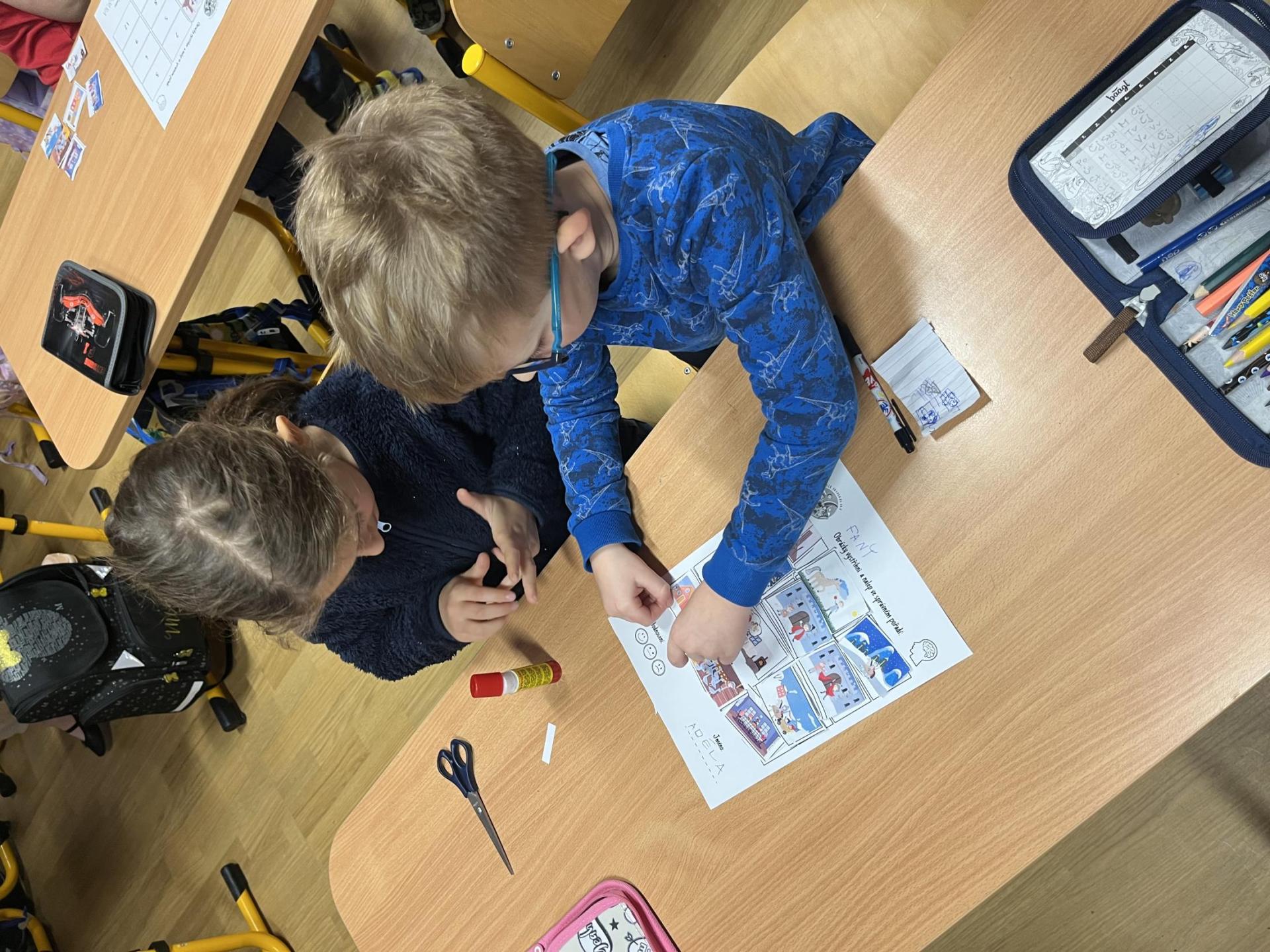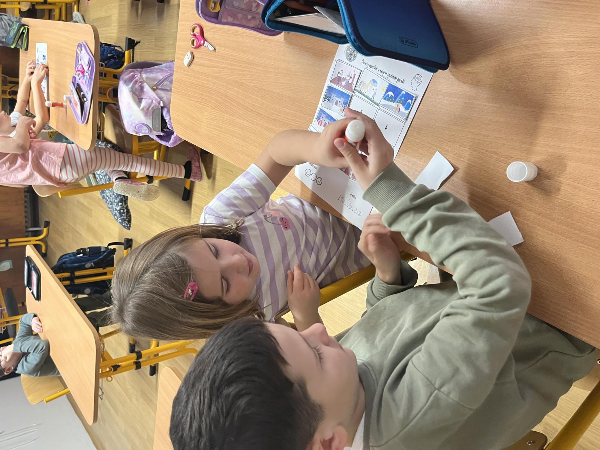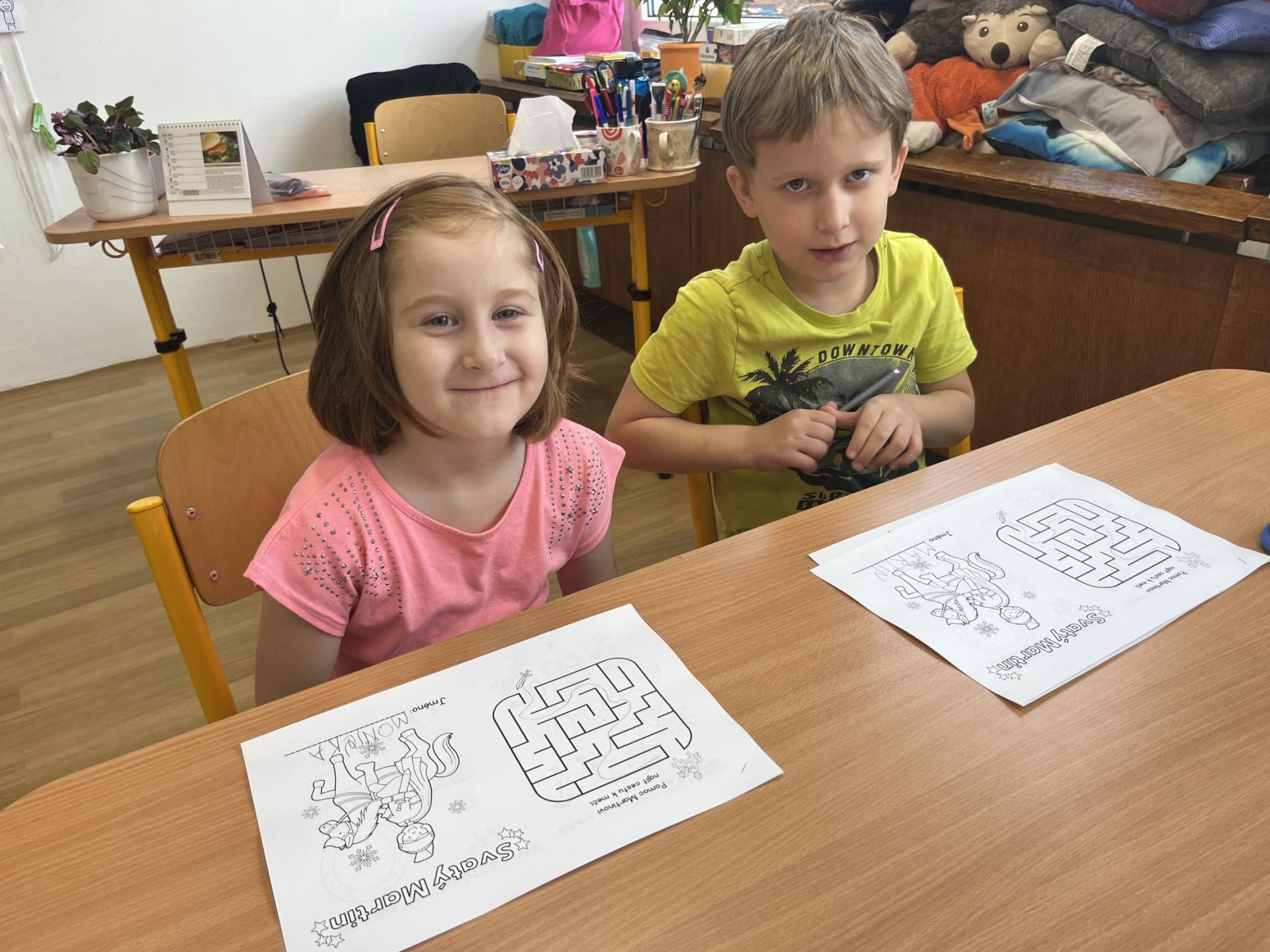 Děti pracovaly s tematickou knížečkou, díky které jsme si pověděli, kdo byl svatý Martin a jaké tradice se k jeho svátku vážou. Na pracovních listech jsme procvičili počítání, porovnávání, slabiky, písmena i grafomotoriku. Pracovali jsme také ve dvojicích, kde děti trénovaly spolupráci. Při vyprávění legendy o svatém Martinovi skládaly obrázky podle pořadí a procvičily si tak posloupnost děje. V tělesné výchově jsme si hráli na koníky, překonávali překážky a nechyběla ani hra na sníh a oblevu, kdy děti tvořily „andělíčky“ nebo skákaly jako kapky deště. Ke konci vyučování nám přišli zazpívat žáci písničky, které se pojí k tomuto svátku. Tímto ještě jednou děkujeme paní učitelce Jiskrové a žákům z 5.A.