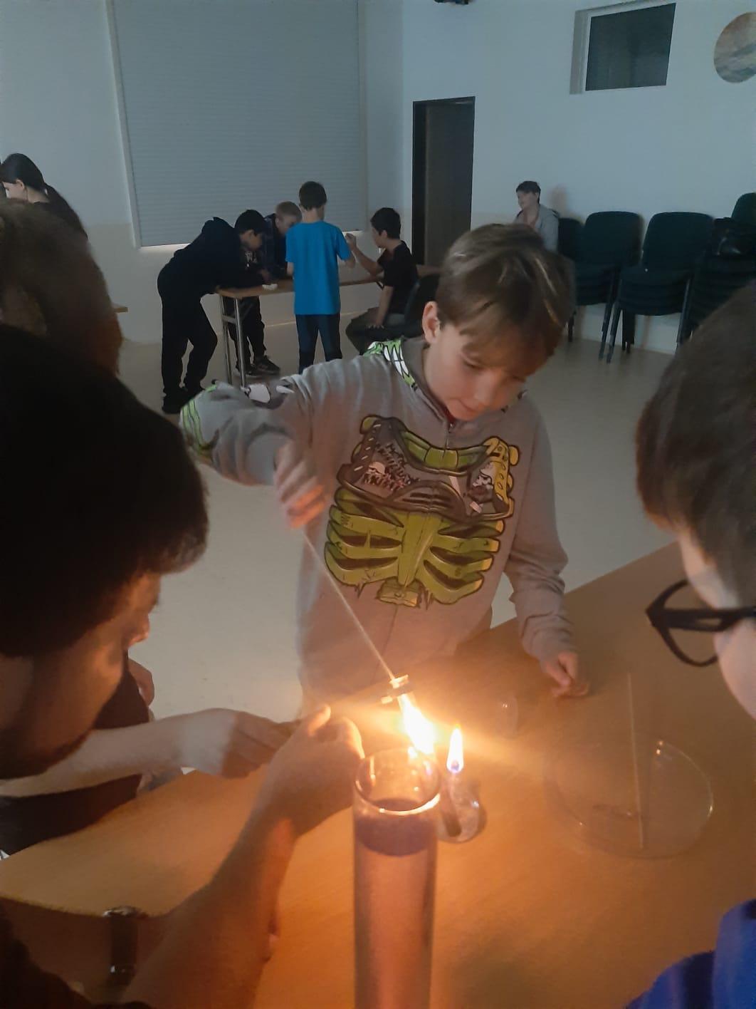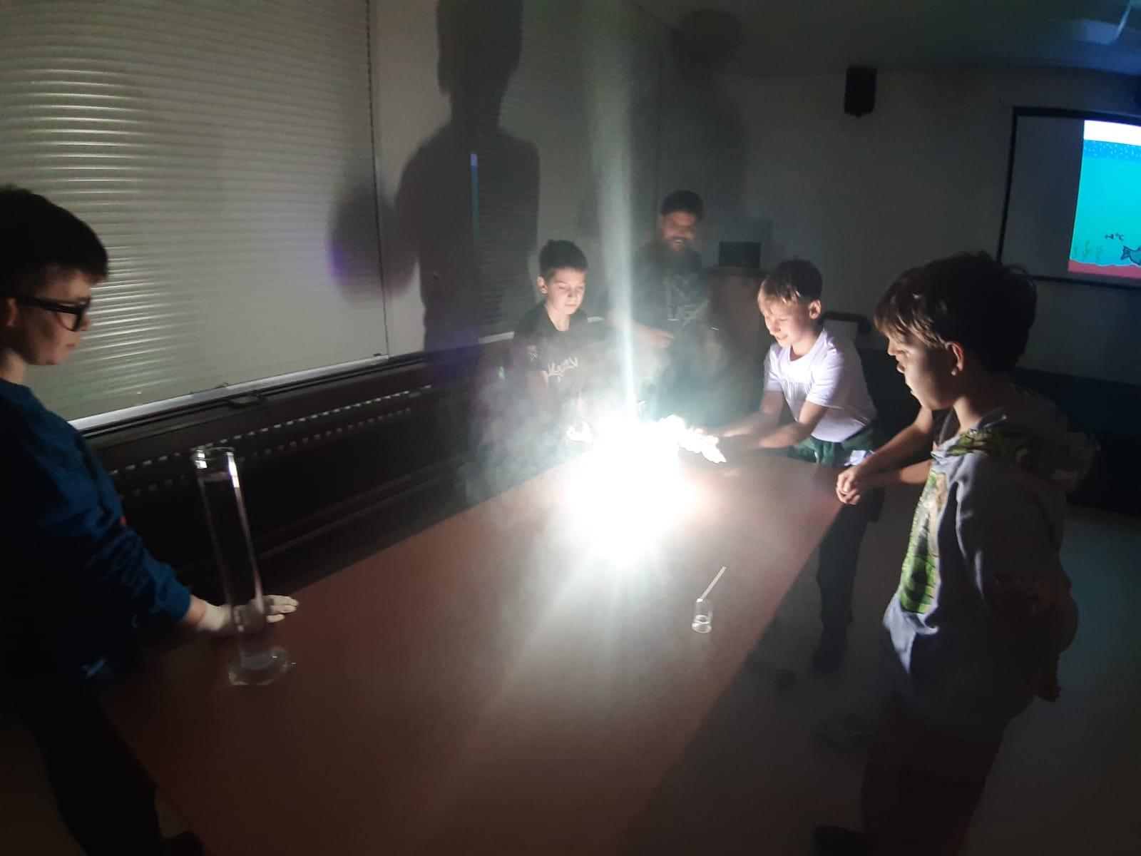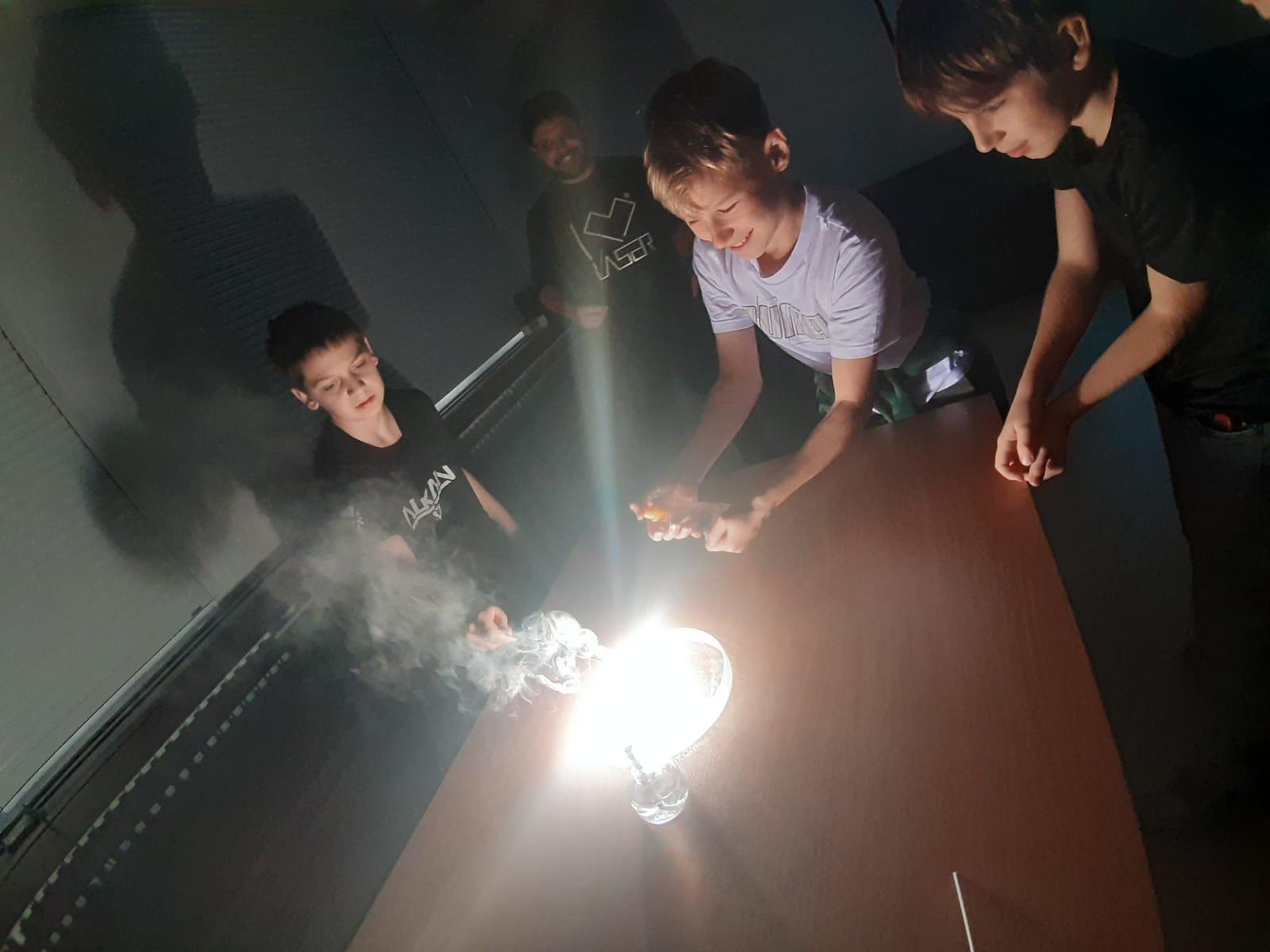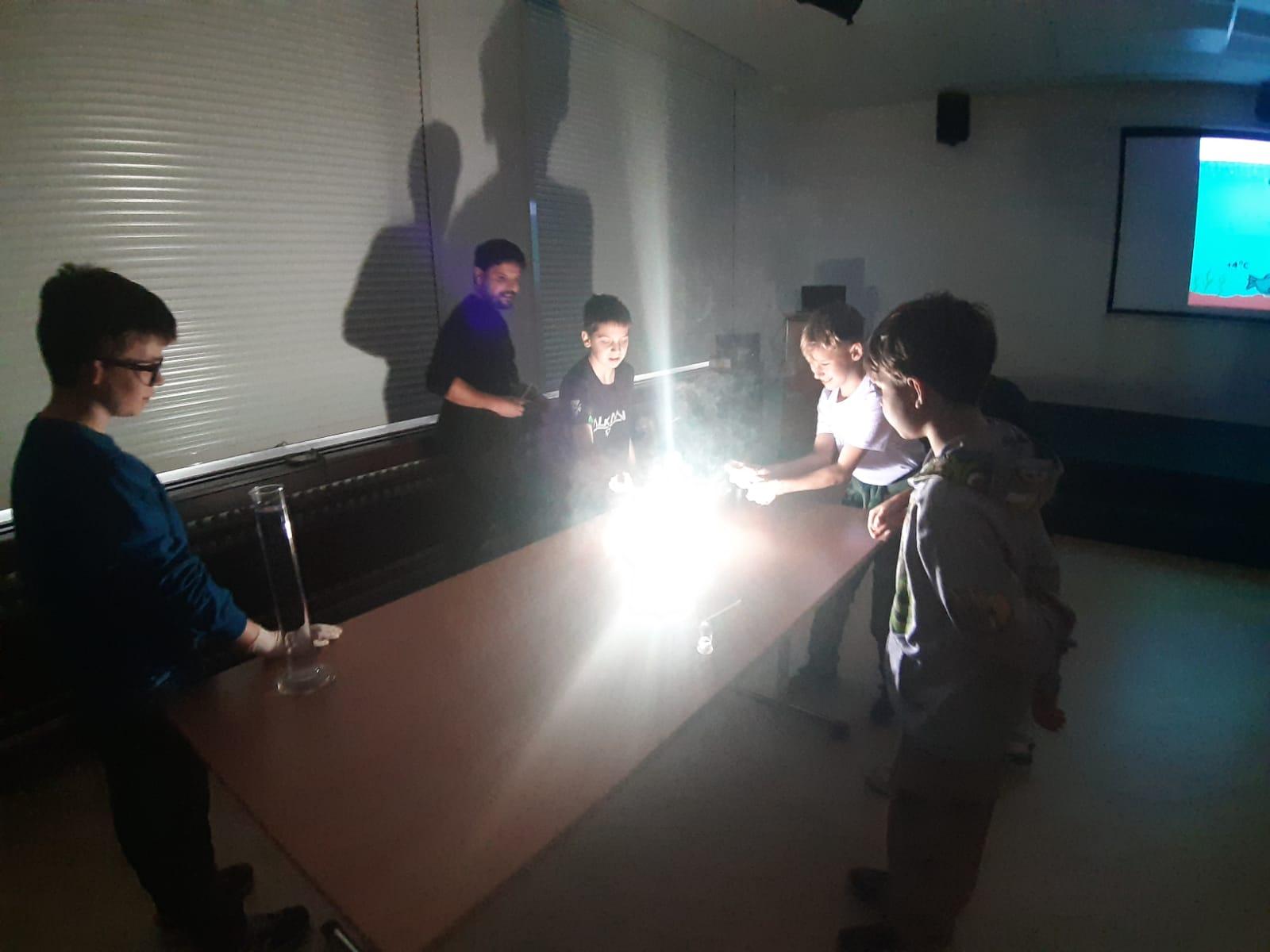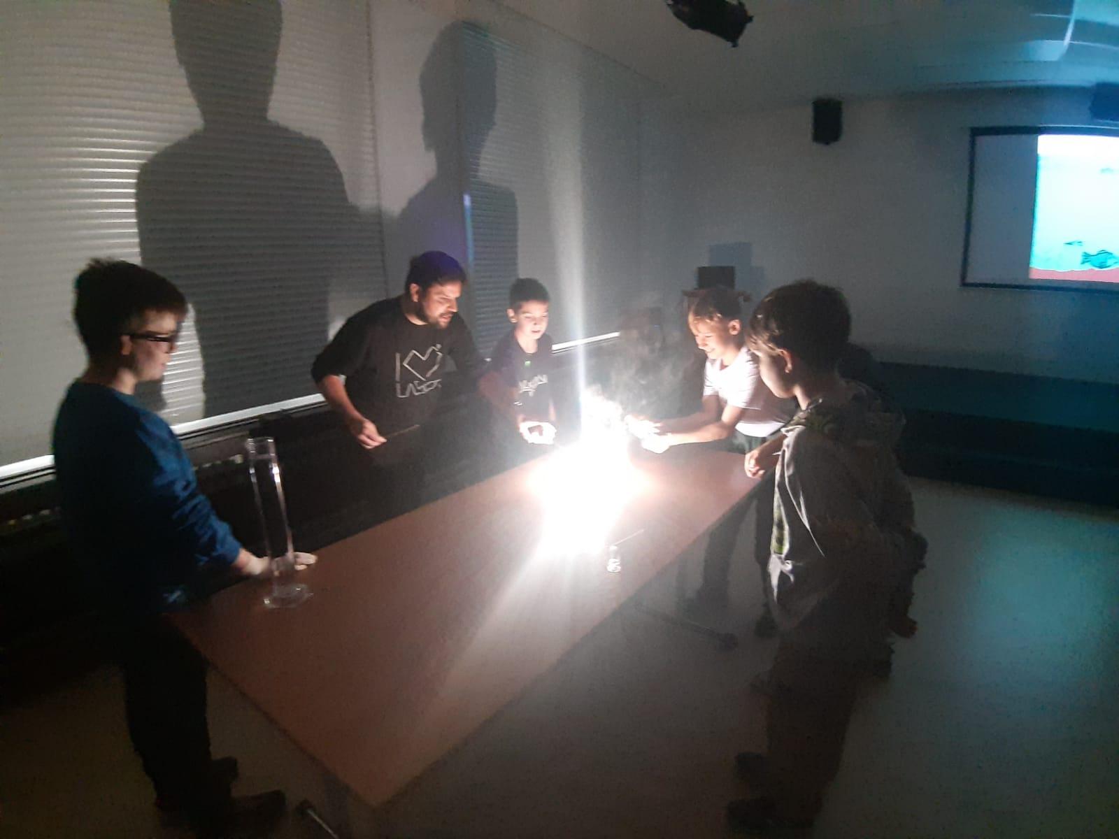 Trocha teorie na začátku, edukativní film a už se děti hrnou k pokusům, které pro ně připravil pan ředitel hvězdárny.