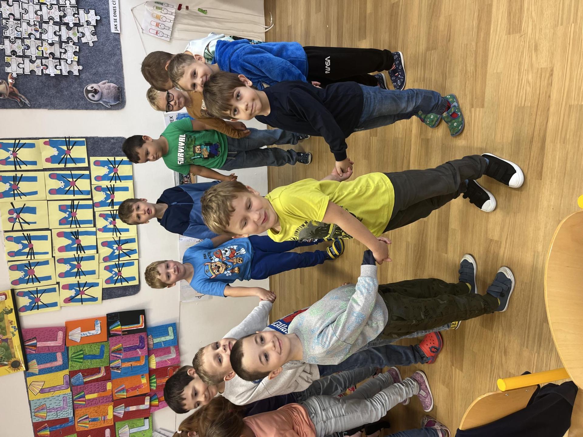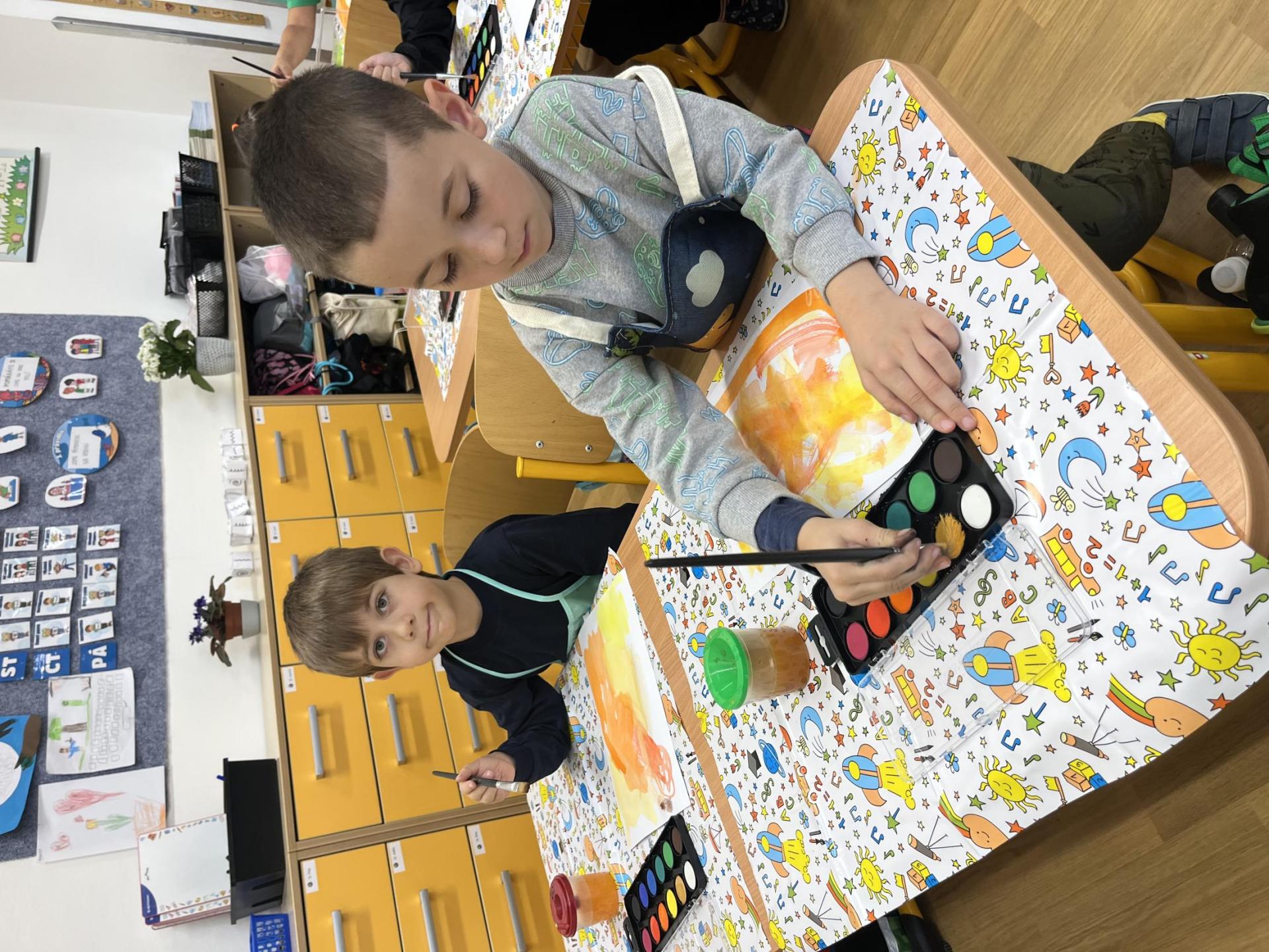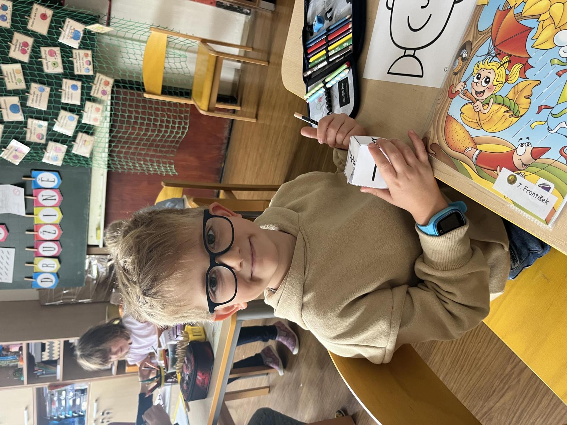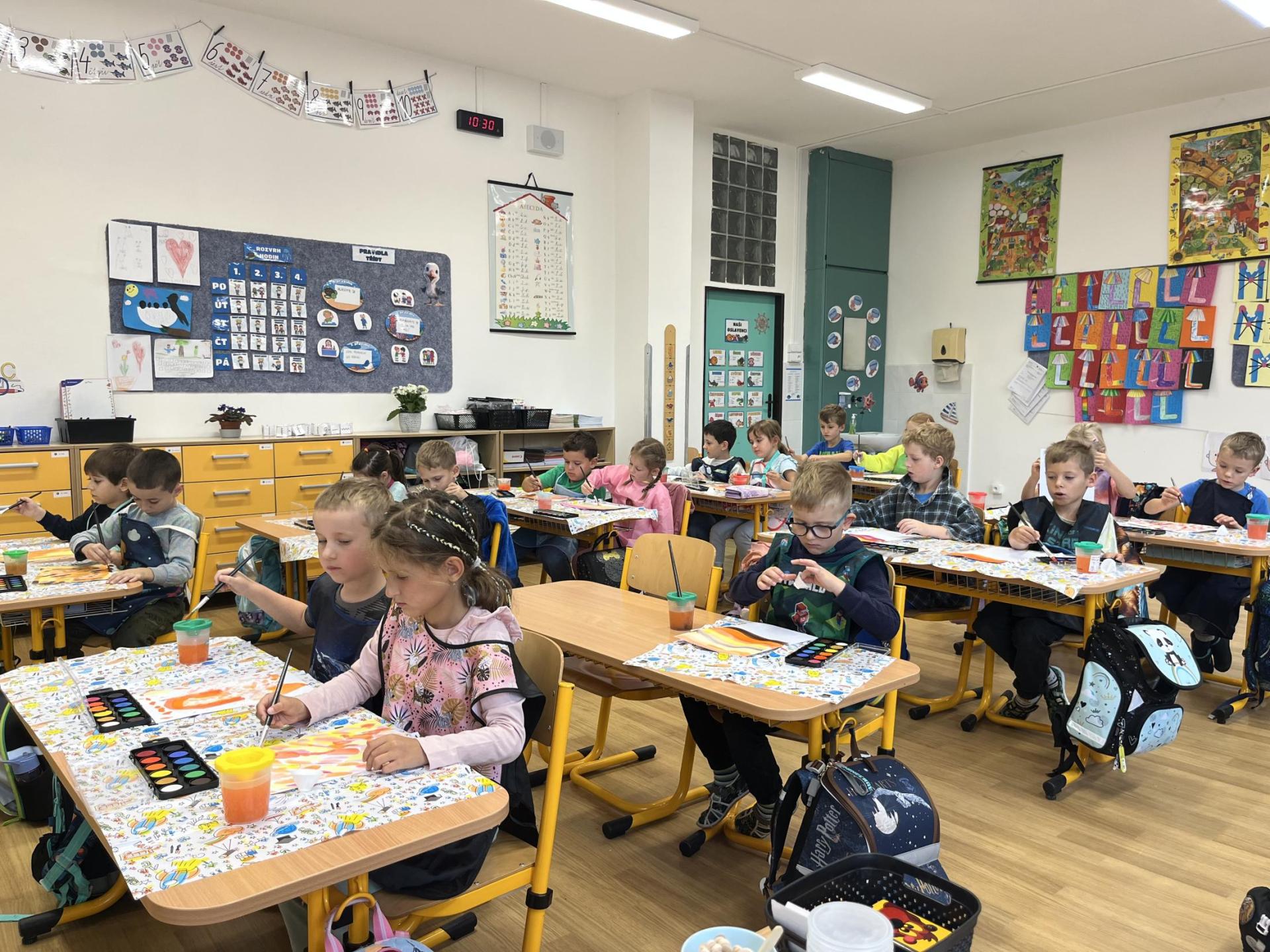 Učení prokládáme také zábavnými aktivitami. Uvolňujeme si ruku a zároveň tvoříme panáčka s bláznivými vlasy. Tvary písmenek si upevňujeme skládáním z fazolek nebo kreslením do soli. Vyzkoušeli jsme i aktivitu na spolupráci – děti měly za úkol se domluvit a společně rozmotat „zamotané ruce“. V hudební výchově jsme si hráli na zrcadlo a zkoušeli napodobovat spolužákovy pohyby. Při tvořivých činnostech jsme se naladili na podzim pomocí malby vodovými barvami, což děti velmi bavilo.