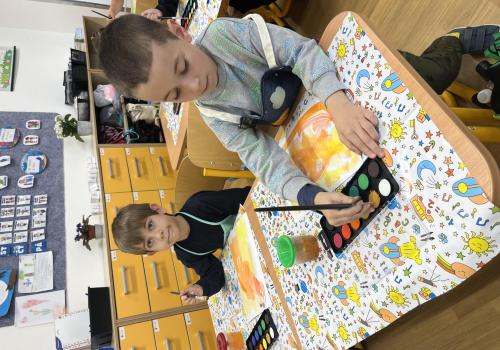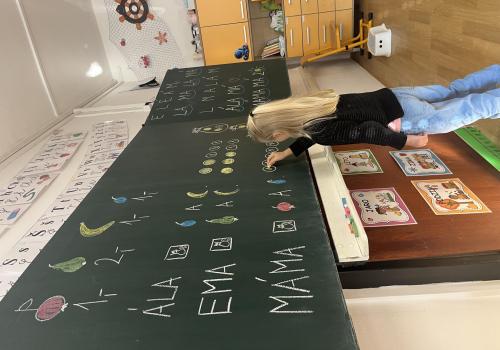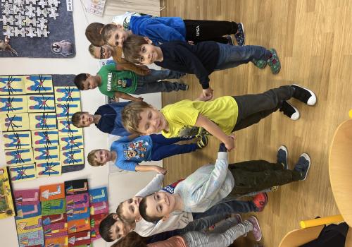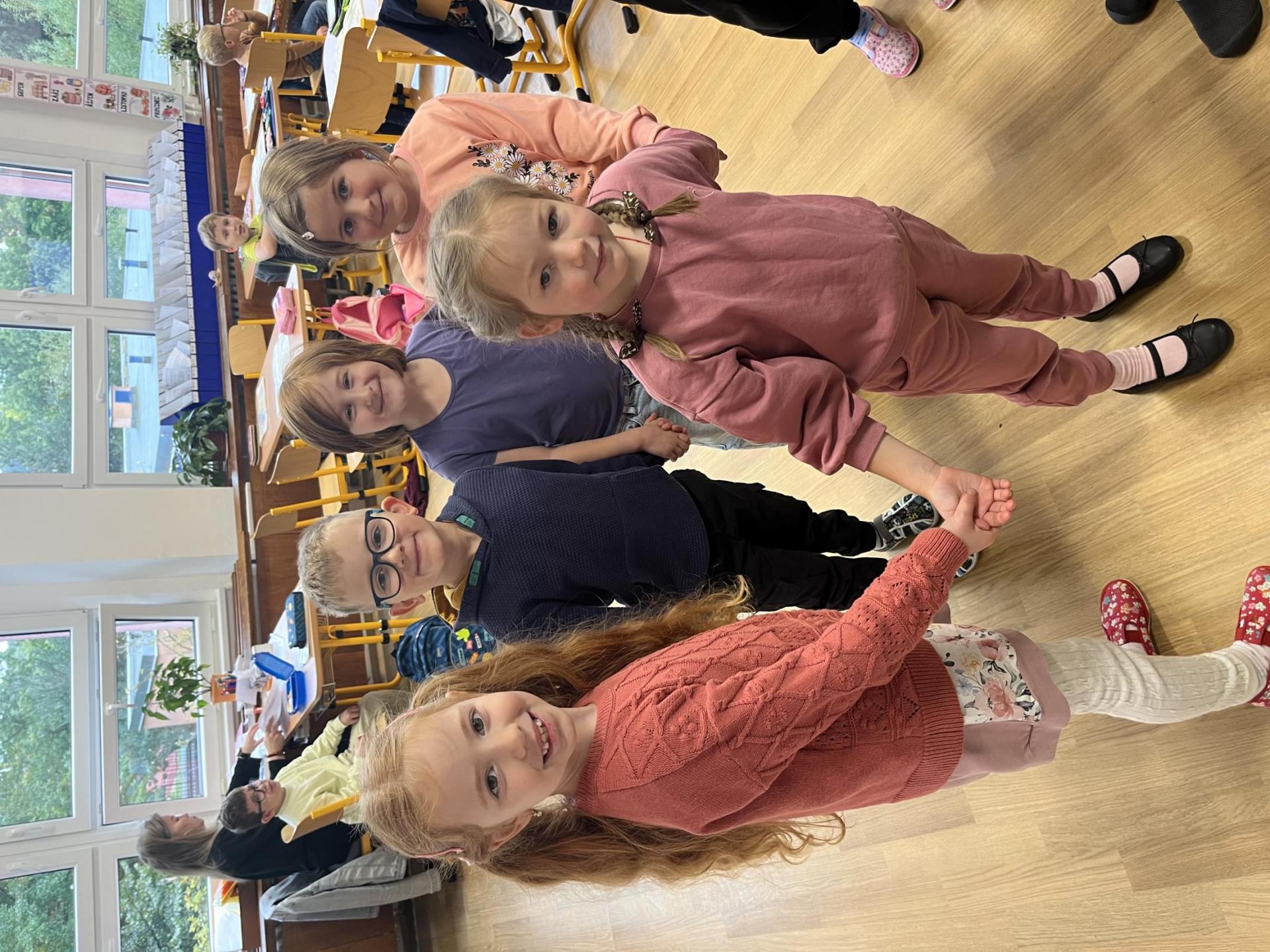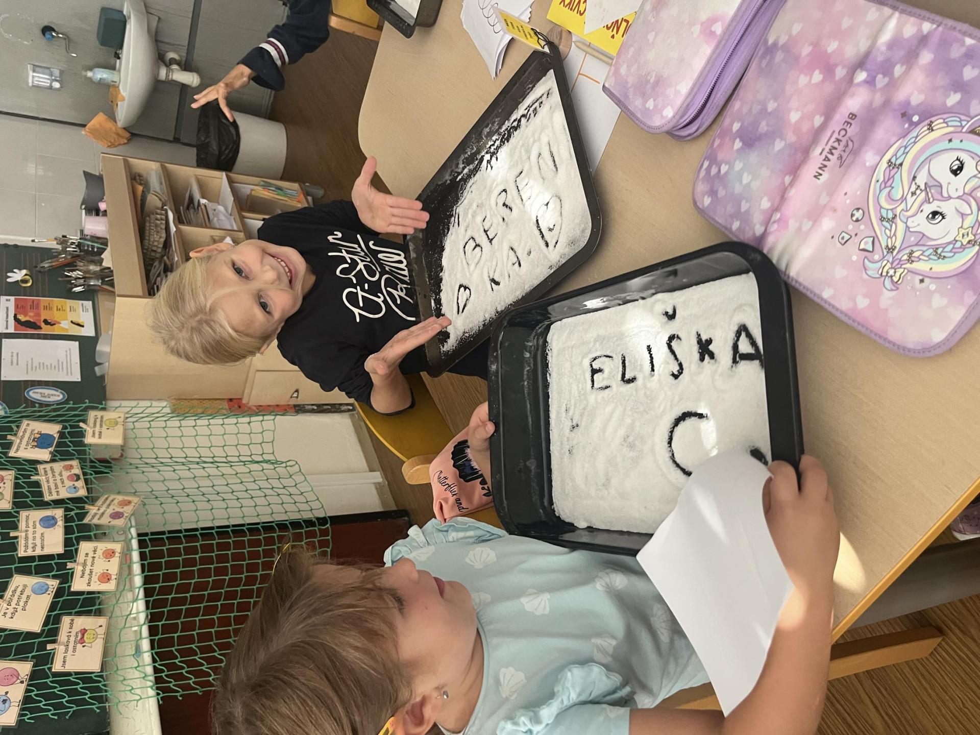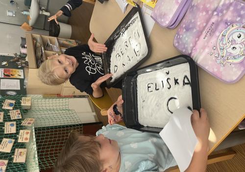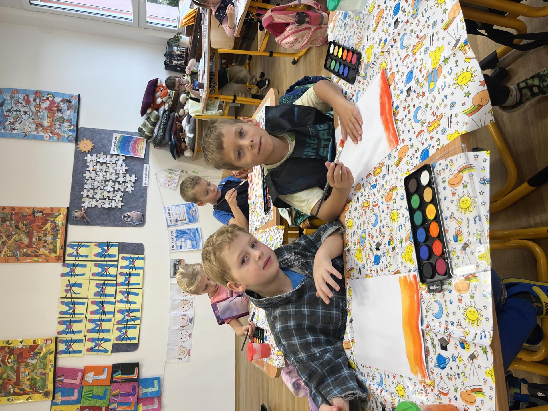 Učení prokládáme také zábavnými aktivitami. Uvolňujeme si ruku a zároveň tvoříme panáčka s bláznivými vlasy. Tvary písmenek si upevňujeme skládáním z fazolek nebo kreslením do soli. Vyzkoušeli jsme i aktivitu na spolupráci – děti měly za úkol se domluvit a společně rozmotat „zamotané ruce“. V hudební výchově jsme si hráli na zrcadlo a zkoušeli napodobovat spolužákovy pohyby. Při tvořivých činnostech jsme se naladili na podzim pomocí malby vodovými barvami, což děti velmi bavilo.