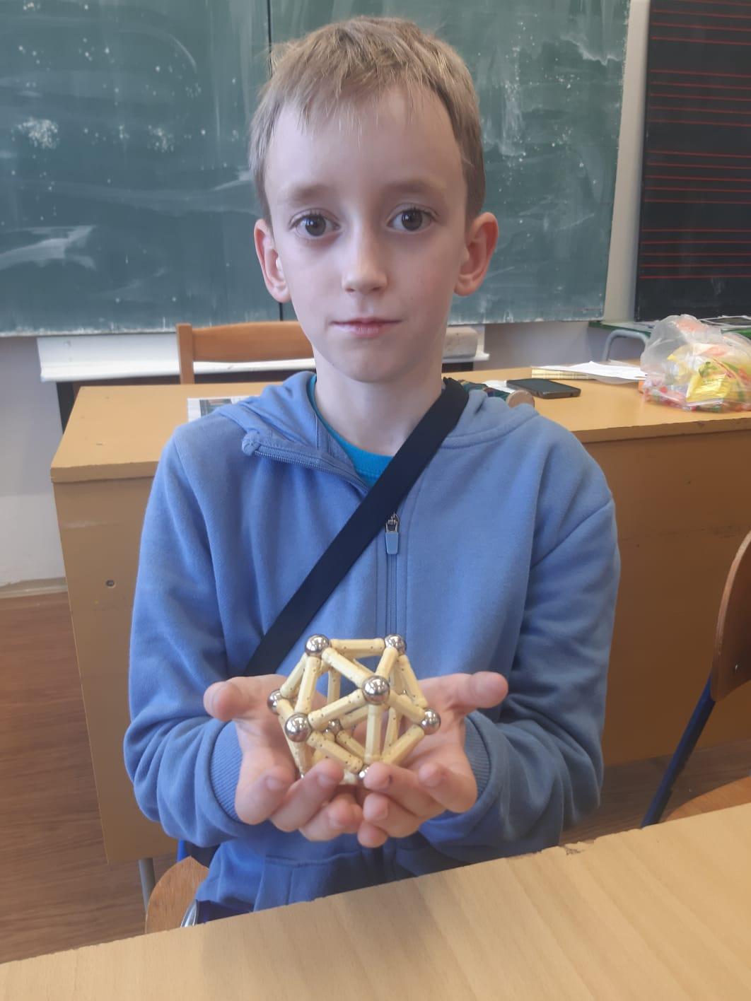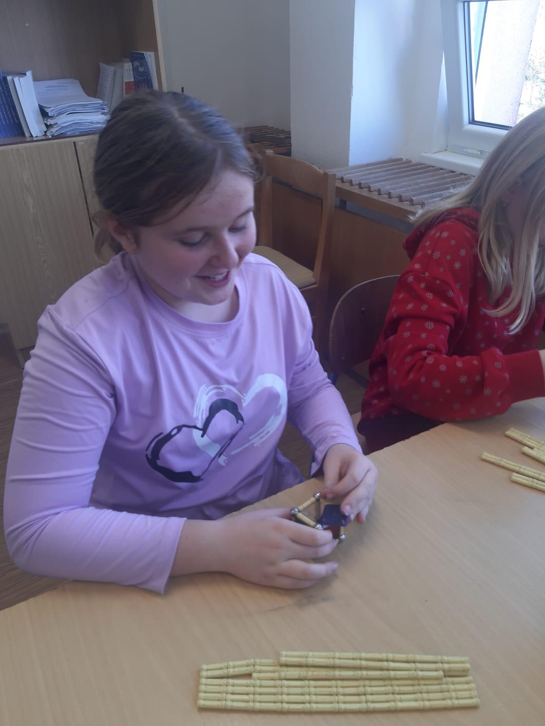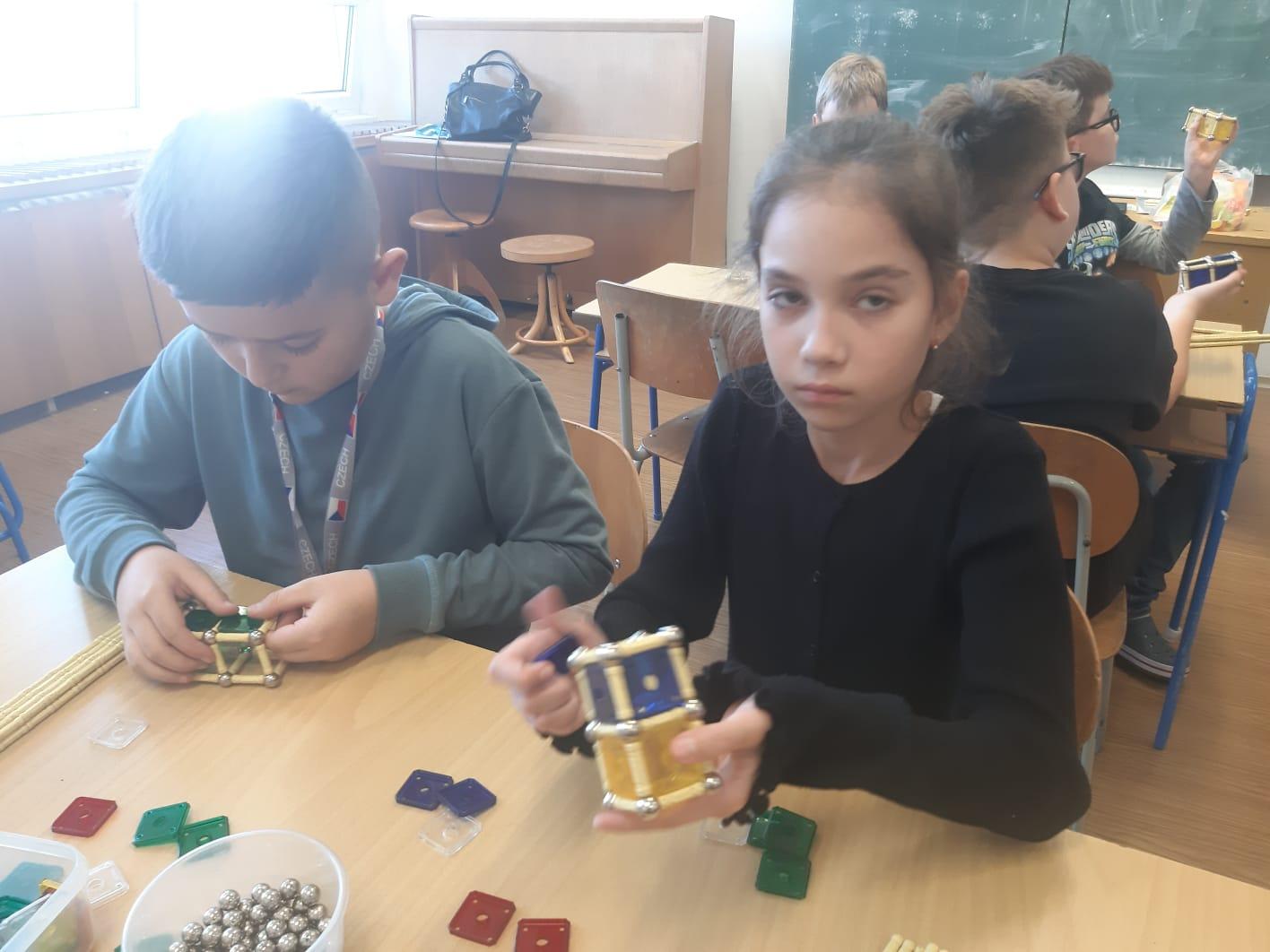 Paní Balvínová nejprve děti seznámila s komponenty stavebnice, děti si zkusily možnosti práce se stavebnicí. Upřesnili jsme si pojmy hrana, strana, rovnostranný trojúhelník, mnohoúhelníky, čtyřstěn apod.