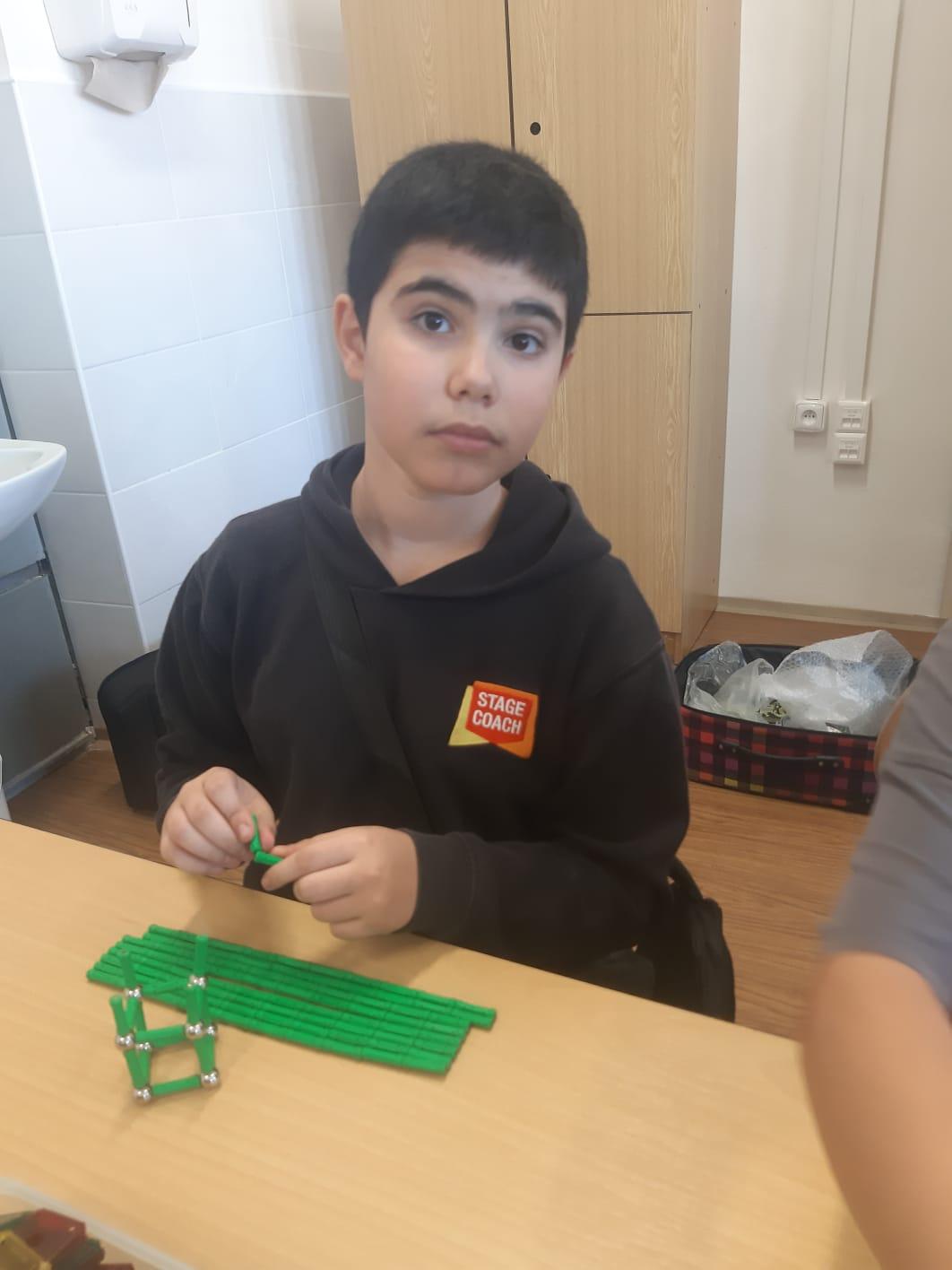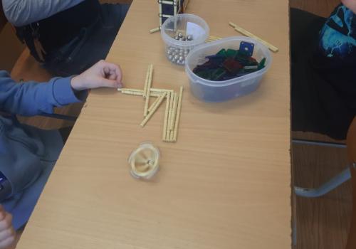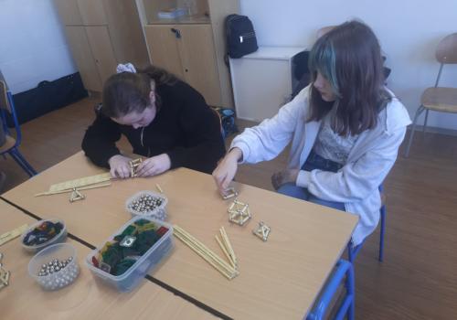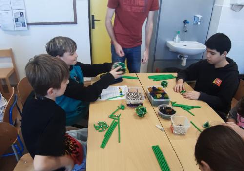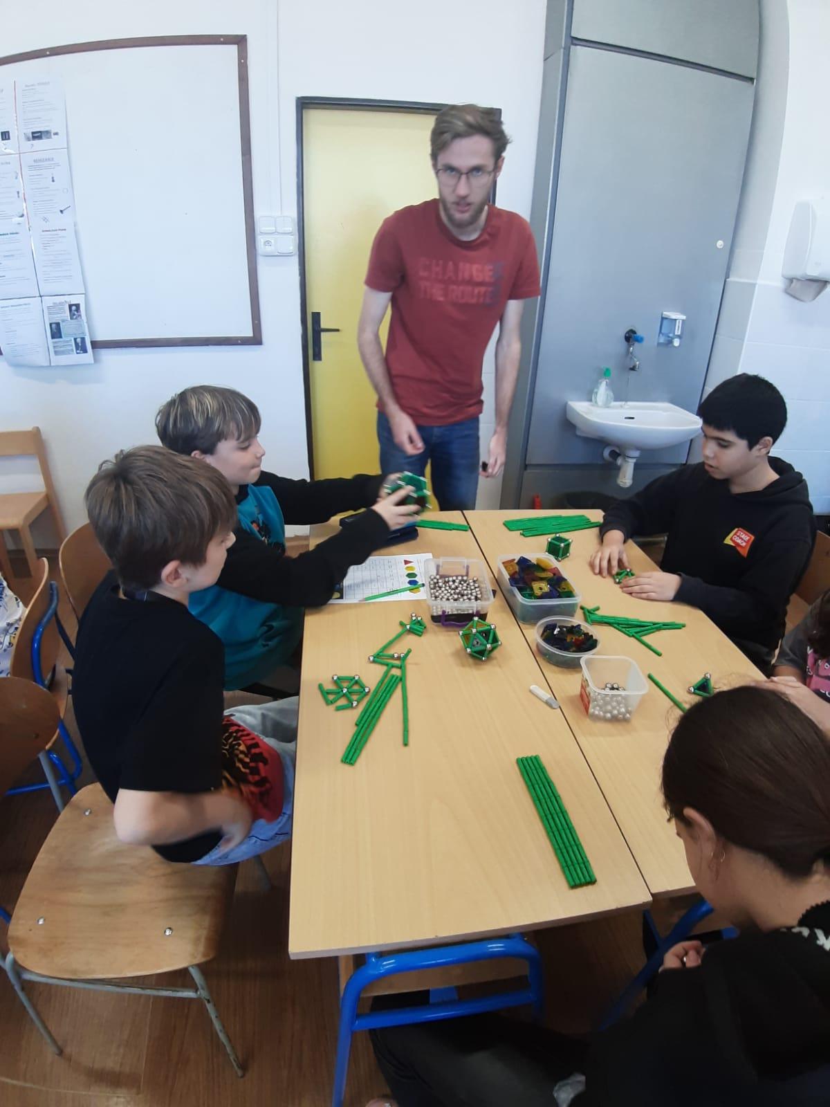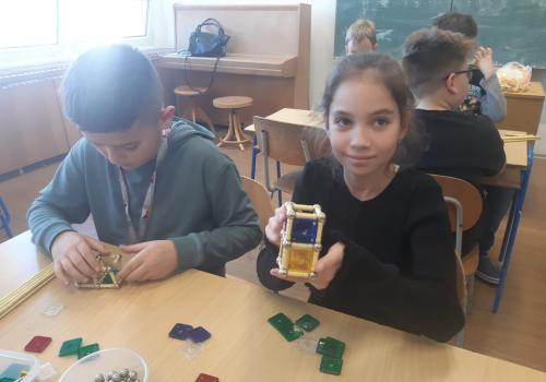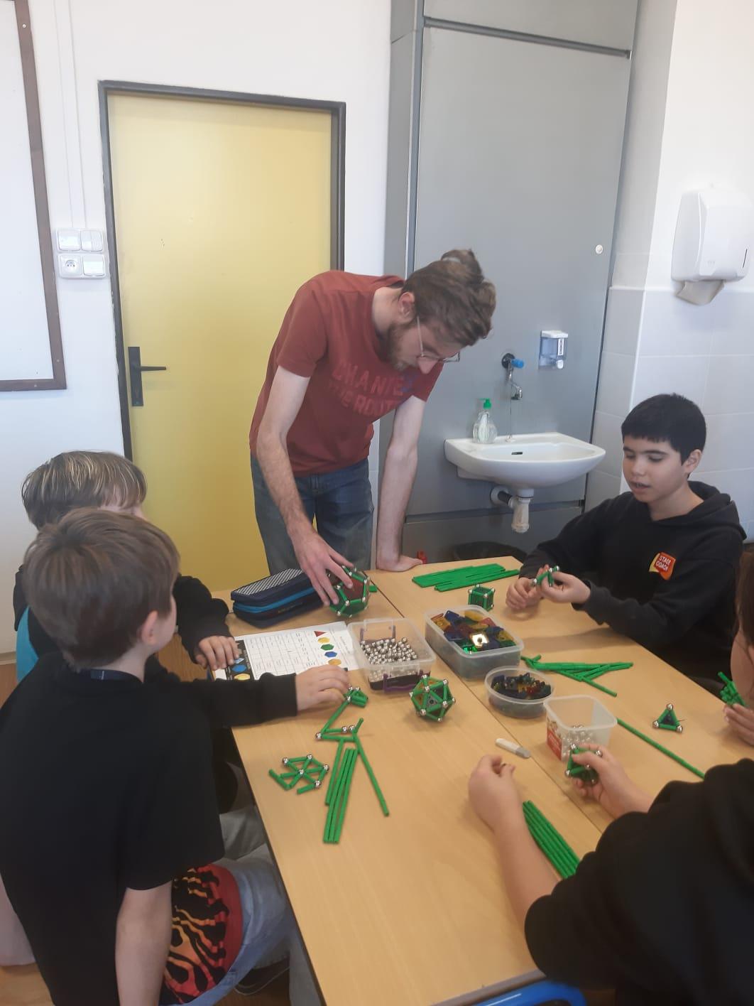 Paní Balvínová nejprve děti seznámila s komponenty stavebnice, děti si zkusily možnosti práce se stavebnicí. Upřesnili jsme si pojmy hrana, strana, rovnostranný trojúhelník, mnohoúhelníky, čtyřstěn apod.
