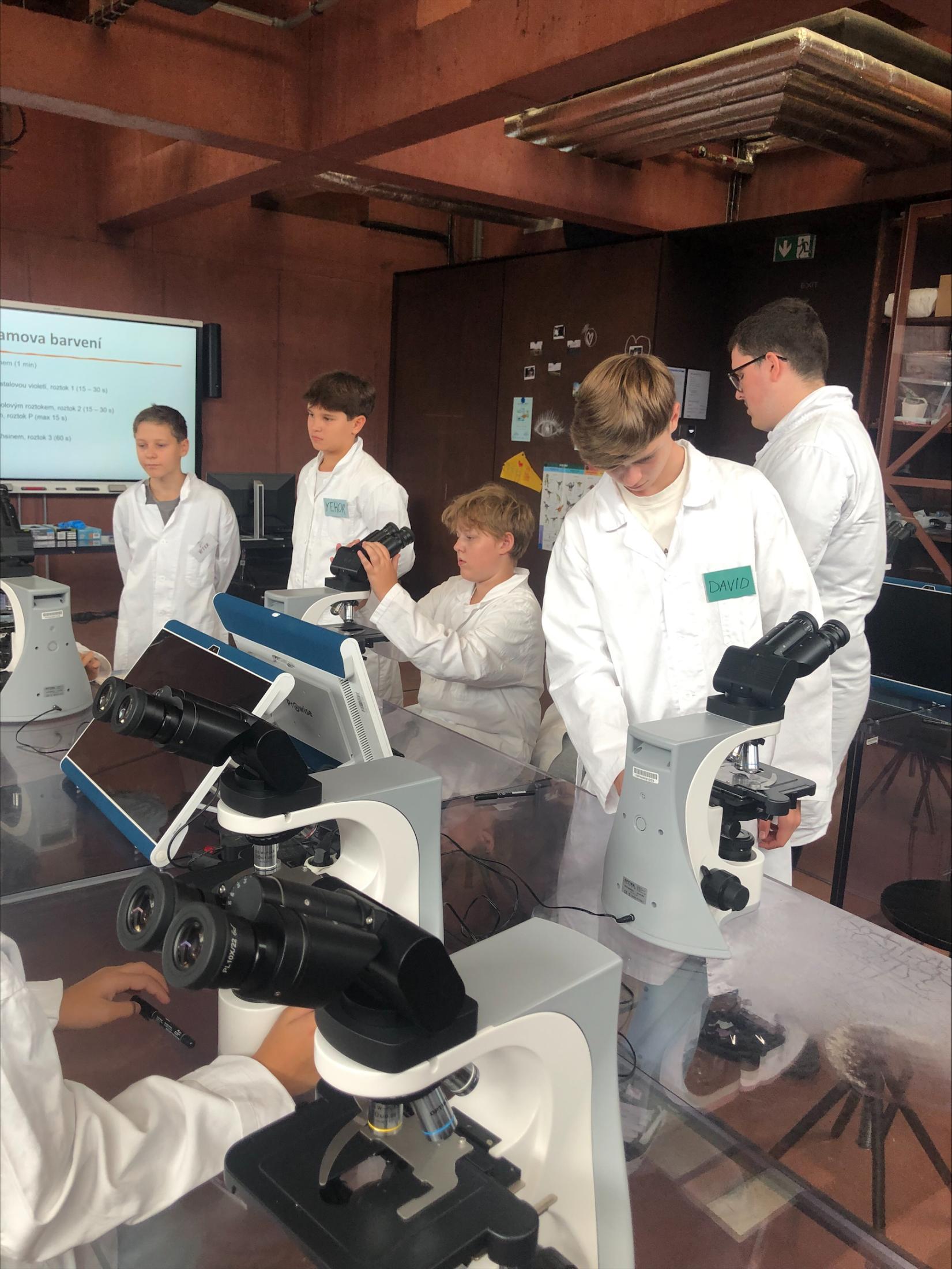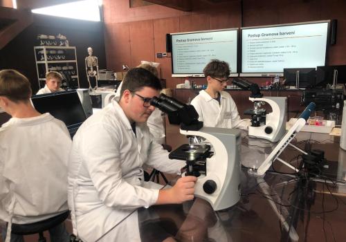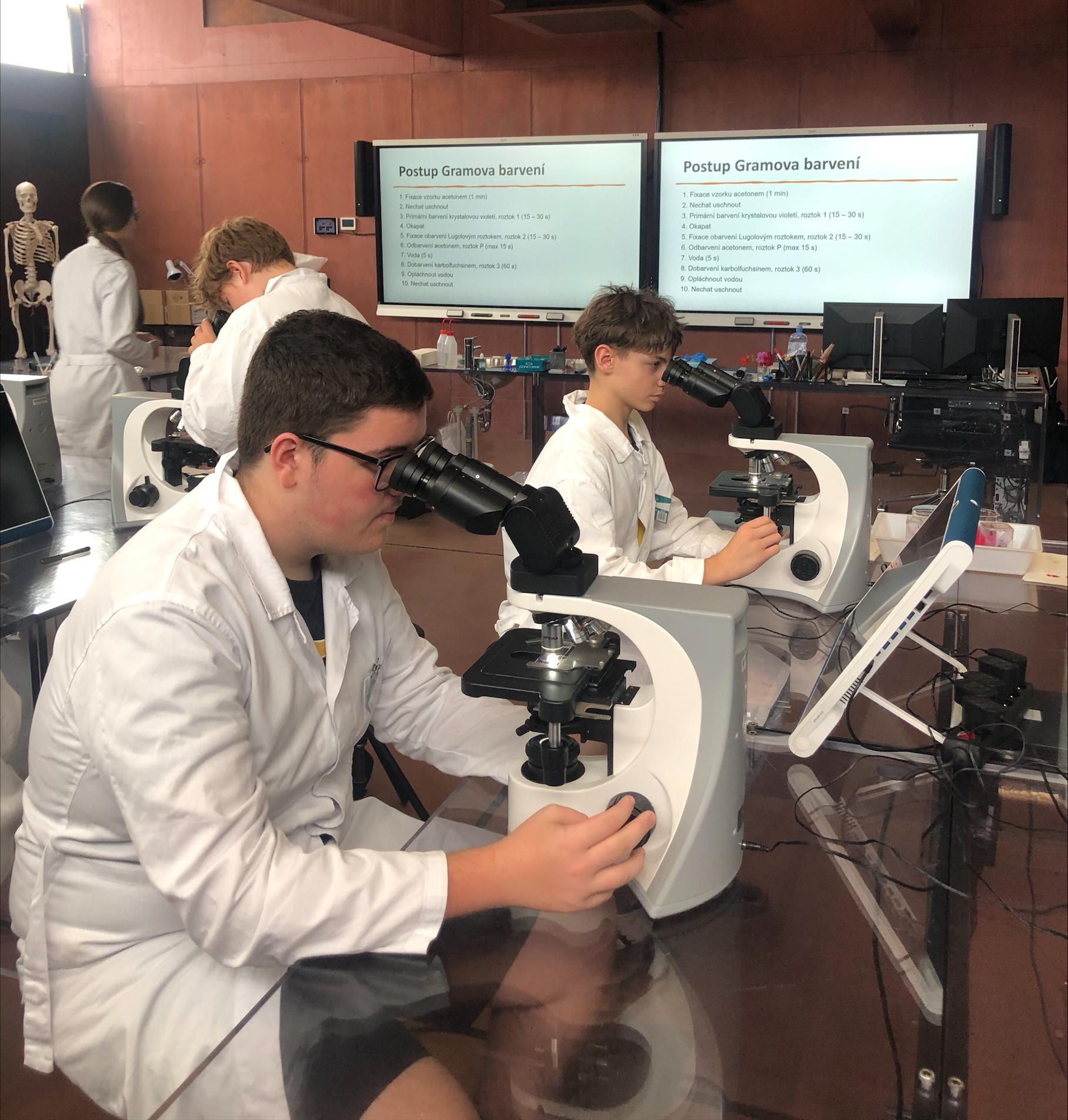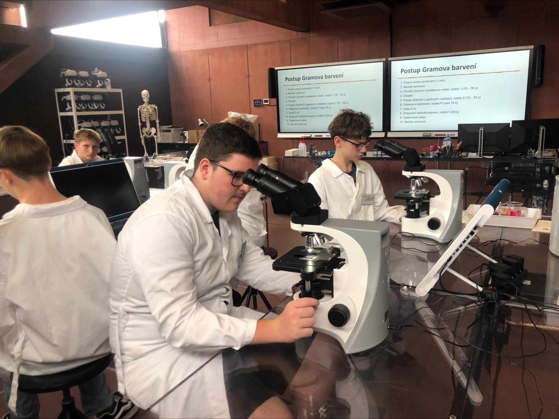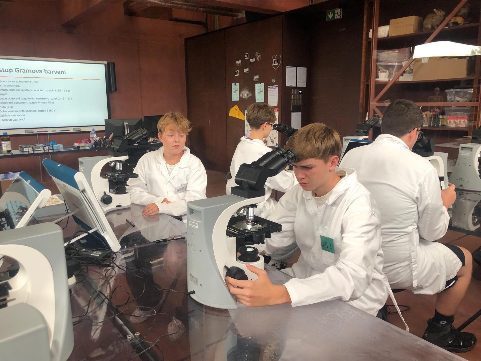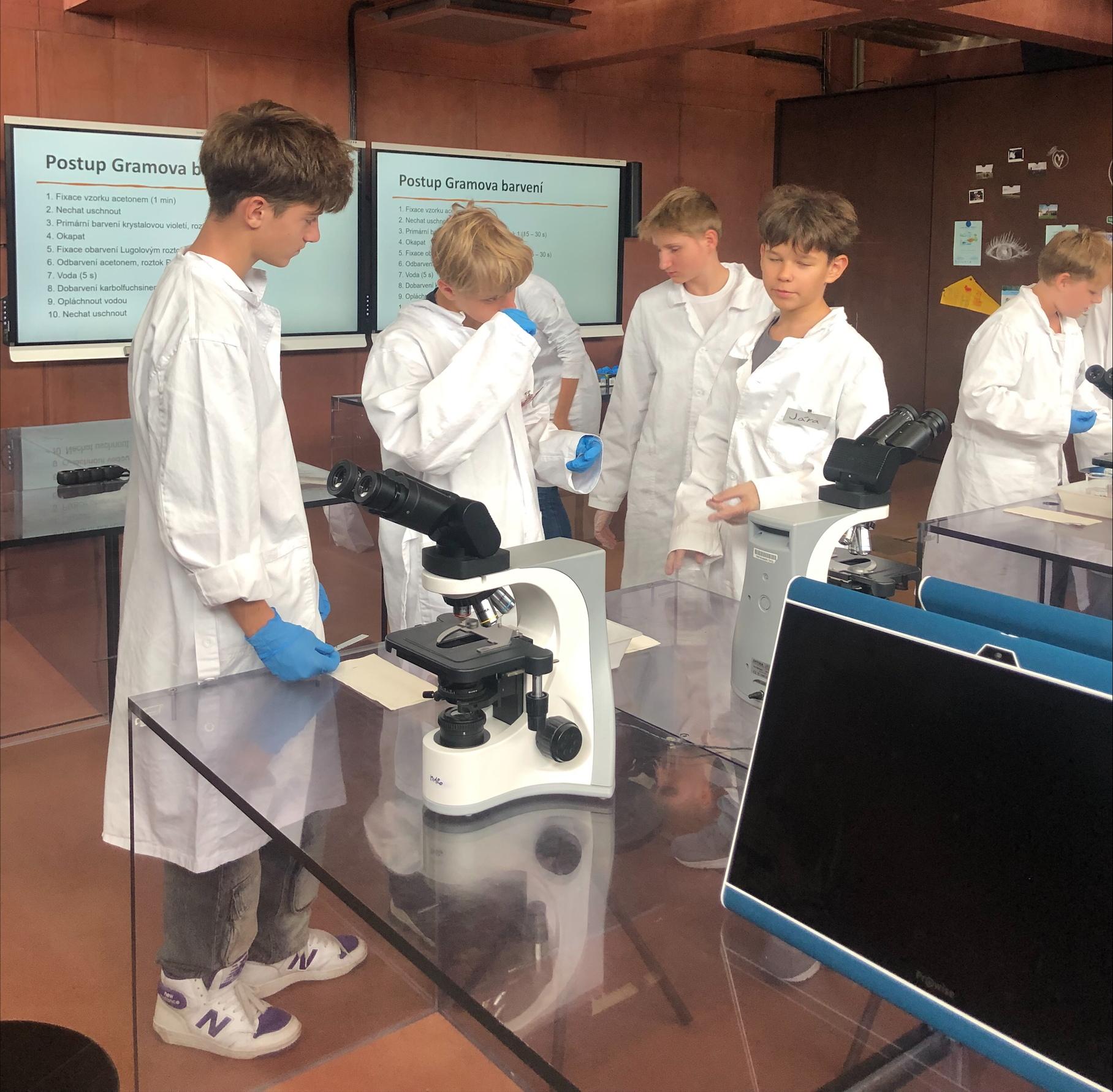 Druhý program byl zaměřený na přírodopis a jmenoval se Mikrosvět v puse. Dozvěděli jsme se, jak je důležitý mikrobiom, který máme ve střevech. Naše střeva jsou zoologická zahrada, kde žije až 1 kg bakterií. Některé bakterie jsou důležité (pomáhají tvořit vitamíny), jiné jsou škodlivé (vedou k nemocem). Naše strava ovlivňuje, které bakterie ve střevech budeme mít. Mikrobiom stimuluje imunitní systém a jeho nerovnováha vede k nemocem. Pomocí Gramova barvení jsme pod mikroskopem pozorovali obsah ústní dutiny. Dozvěděli jsme se, že koky jsou kolečka a bacily tyčinky, a že bakterie jsou větší než viry.
