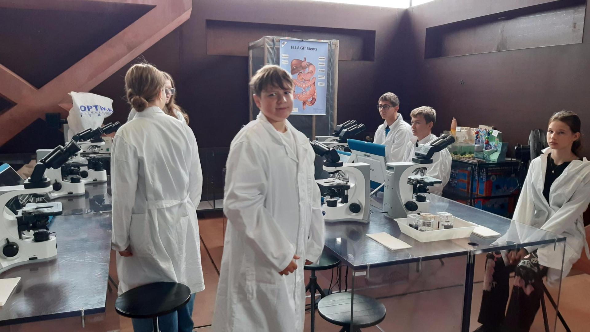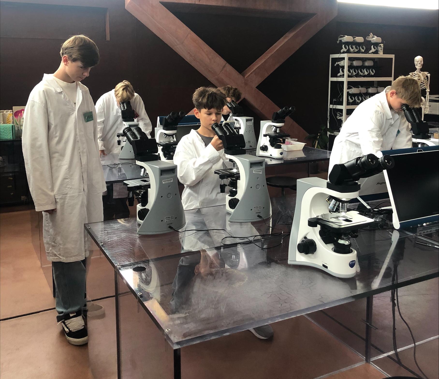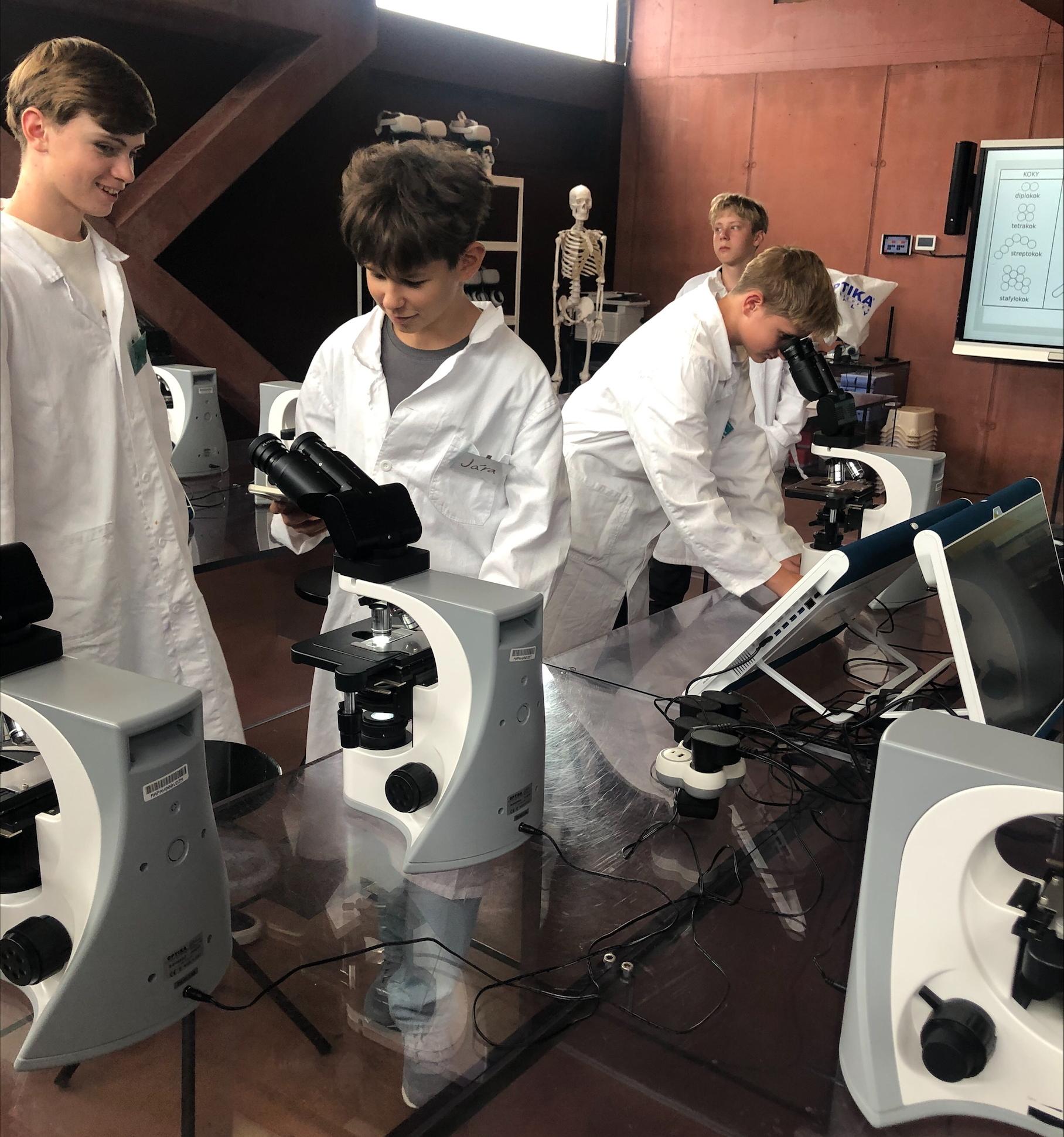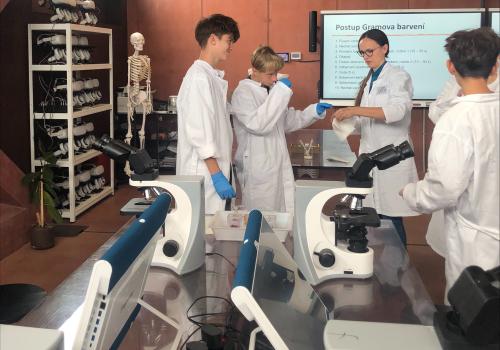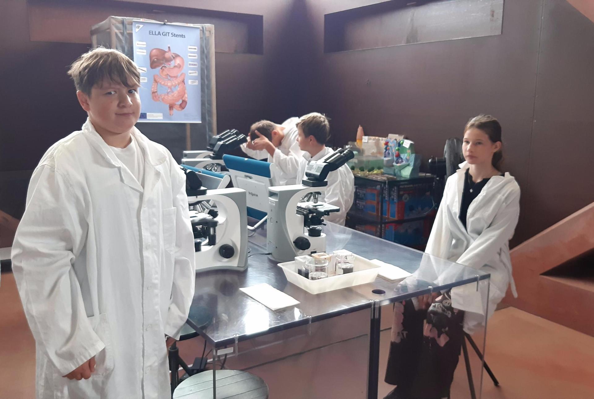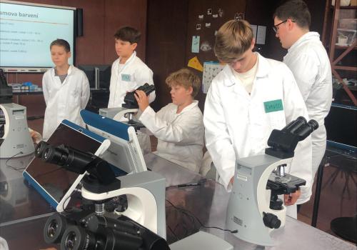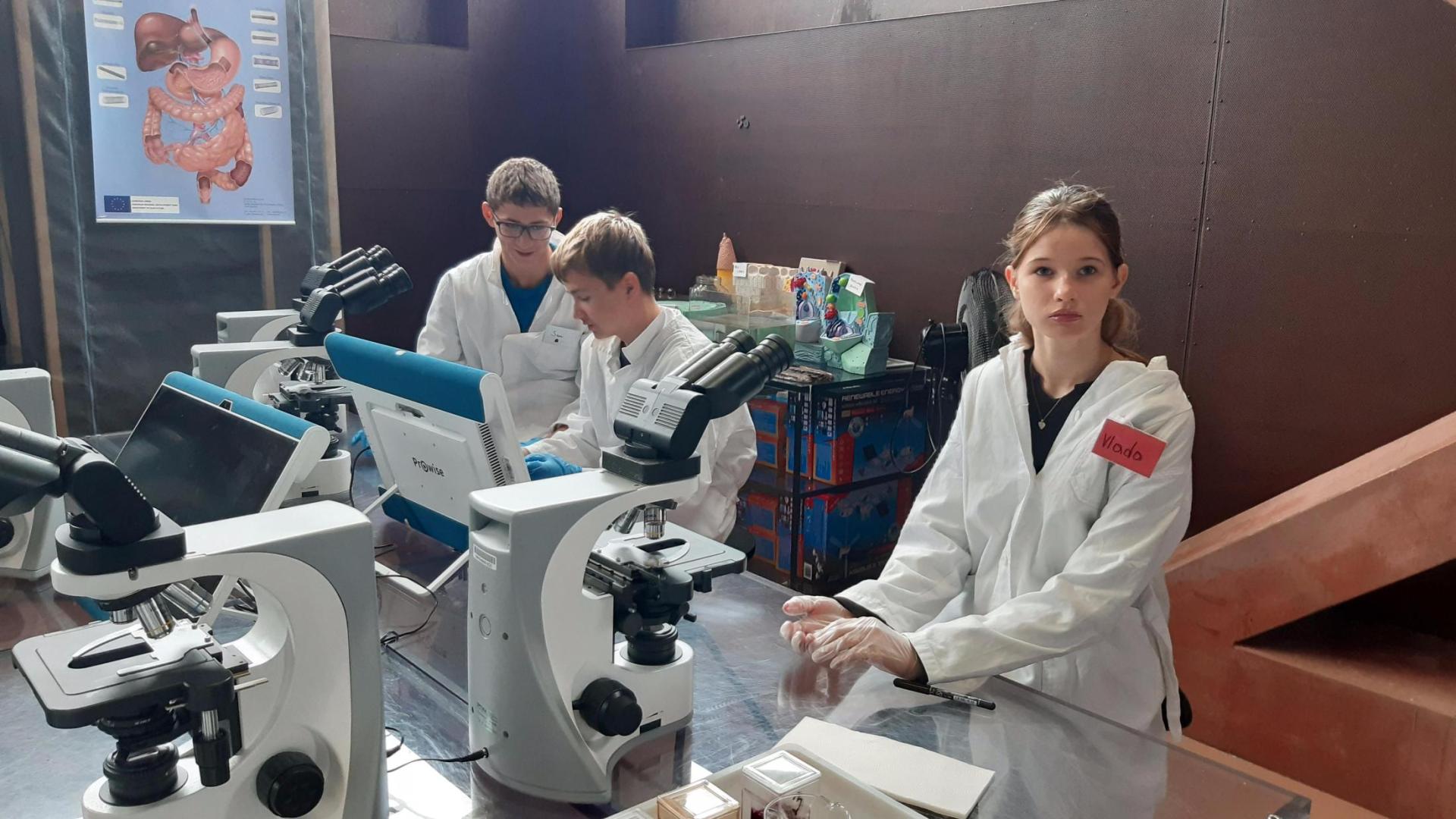 Druhý program byl zaměřený na přírodopis a jmenoval se Mikrosvět v puse. Dozvěděli jsme se, jak je důležitý mikrobiom, který máme ve střevech. Naše střeva jsou zoologická zahrada, kde žije až 1 kg bakterií. Některé bakterie jsou důležité (pomáhají tvořit vitamíny), jiné jsou škodlivé (vedou k nemocem). Naše strava ovlivňuje, které bakterie ve střevech budeme mít. Mikrobiom stimuluje imunitní systém a jeho nerovnováha vede k nemocem. Pomocí Gramova barvení jsme pod mikroskopem pozorovali obsah ústní dutiny. Dozvěděli jsme se, že koky jsou kolečka a bacily tyčinky, a že bakterie jsou větší než viry.