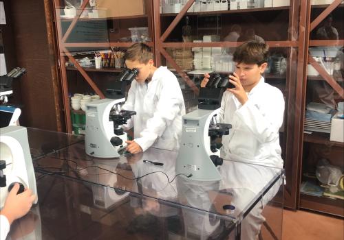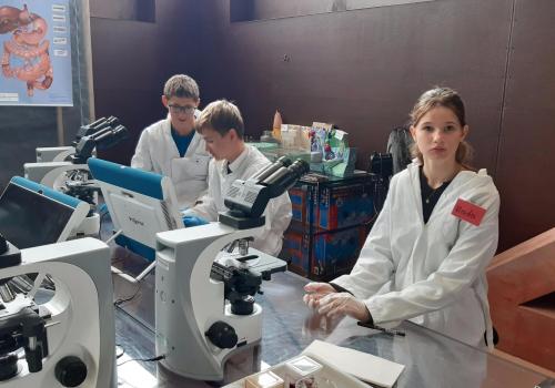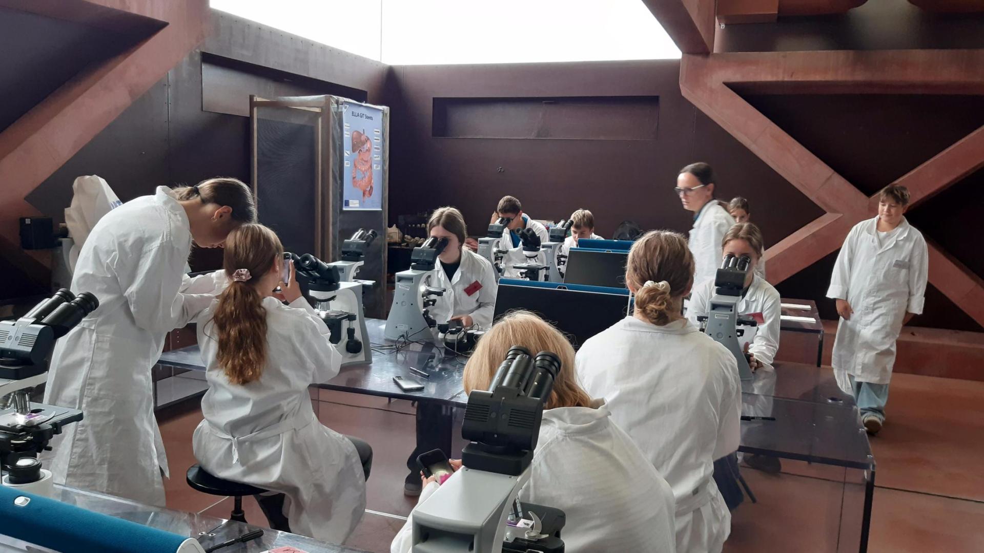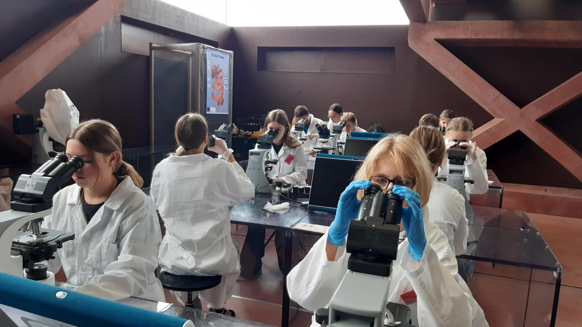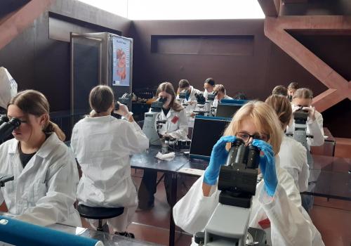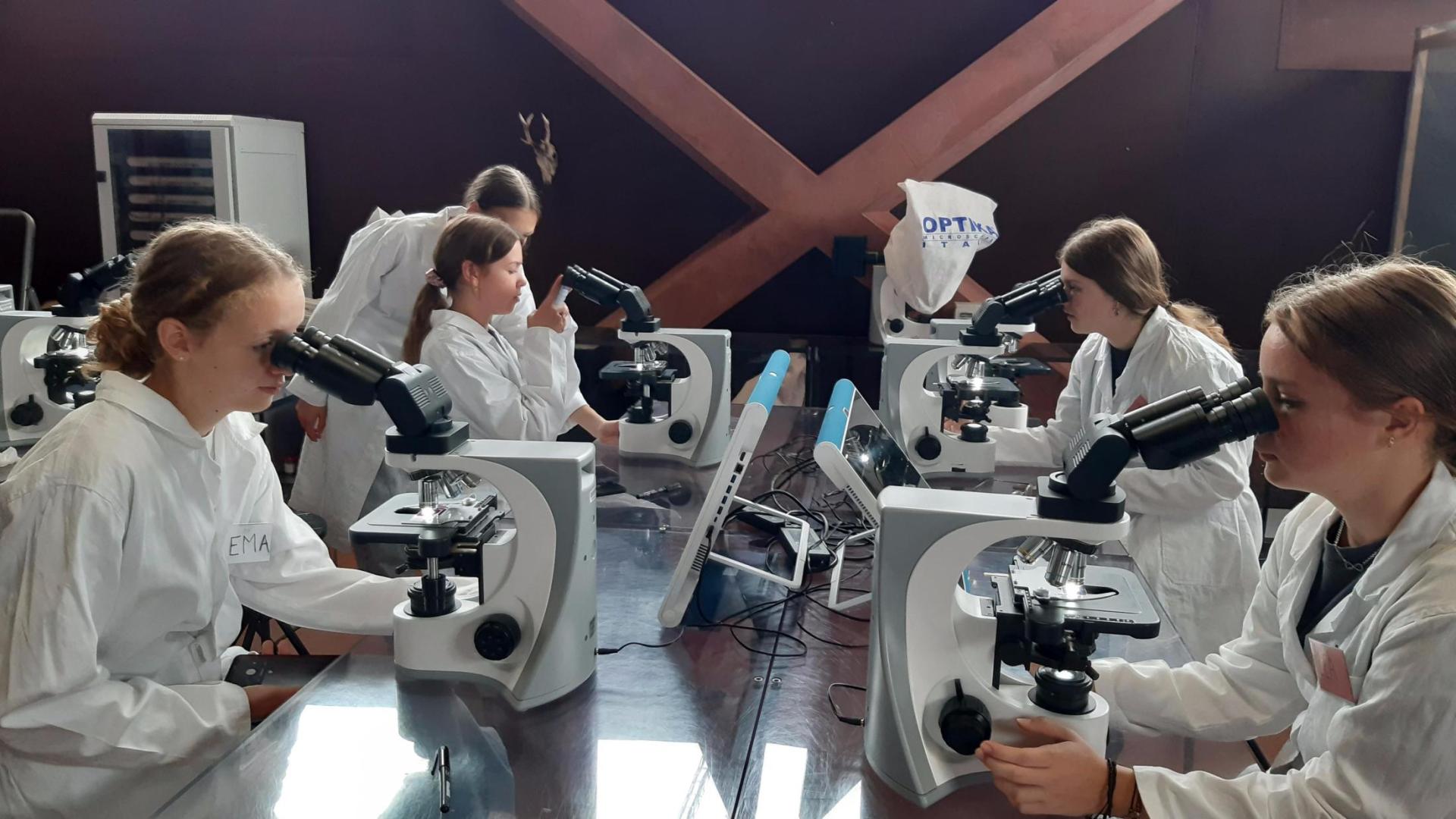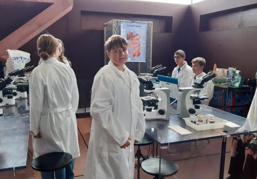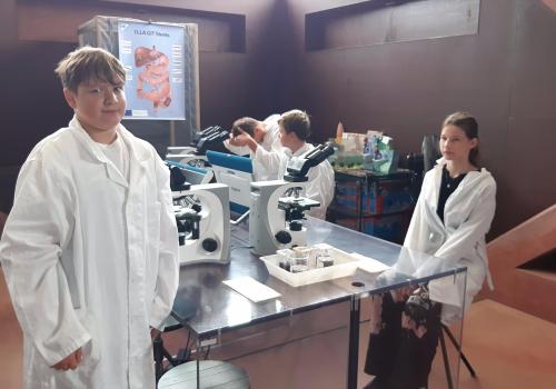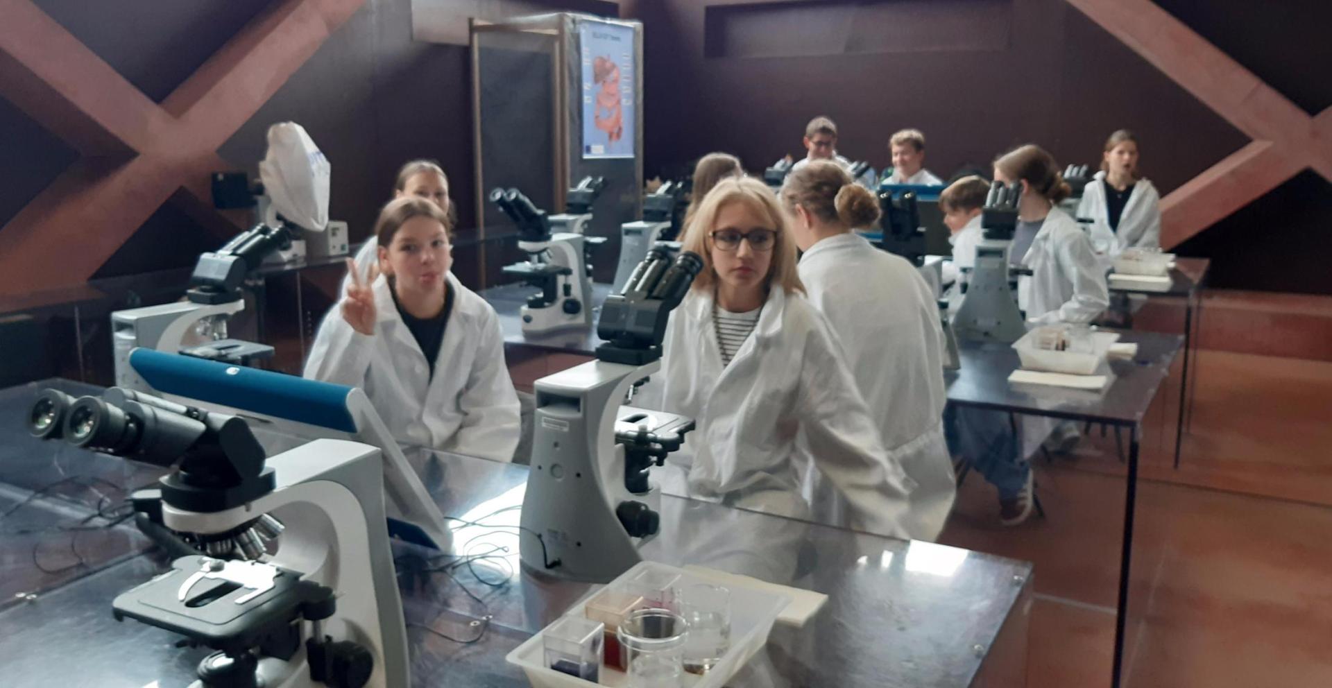 Druhý program byl zaměřený na přírodopis a jmenoval se Mikrosvět v puse. Dozvěděli jsme se, jak je důležitý mikrobiom, který máme ve střevech. Naše střeva jsou zoologická zahrada, kde žije až 1 kg bakterií. Některé bakterie jsou důležité (pomáhají tvořit vitamíny), jiné jsou škodlivé (vedou k nemocem). Naše strava ovlivňuje, které bakterie ve střevech budeme mít. Mikrobiom stimuluje imunitní systém a jeho nerovnováha vede k nemocem. Pomocí Gramova barvení jsme pod mikroskopem pozorovali obsah ústní dutiny. Dozvěděli jsme se, že koky jsou kolečka a bacily tyčinky, a že bakterie jsou větší než viry.