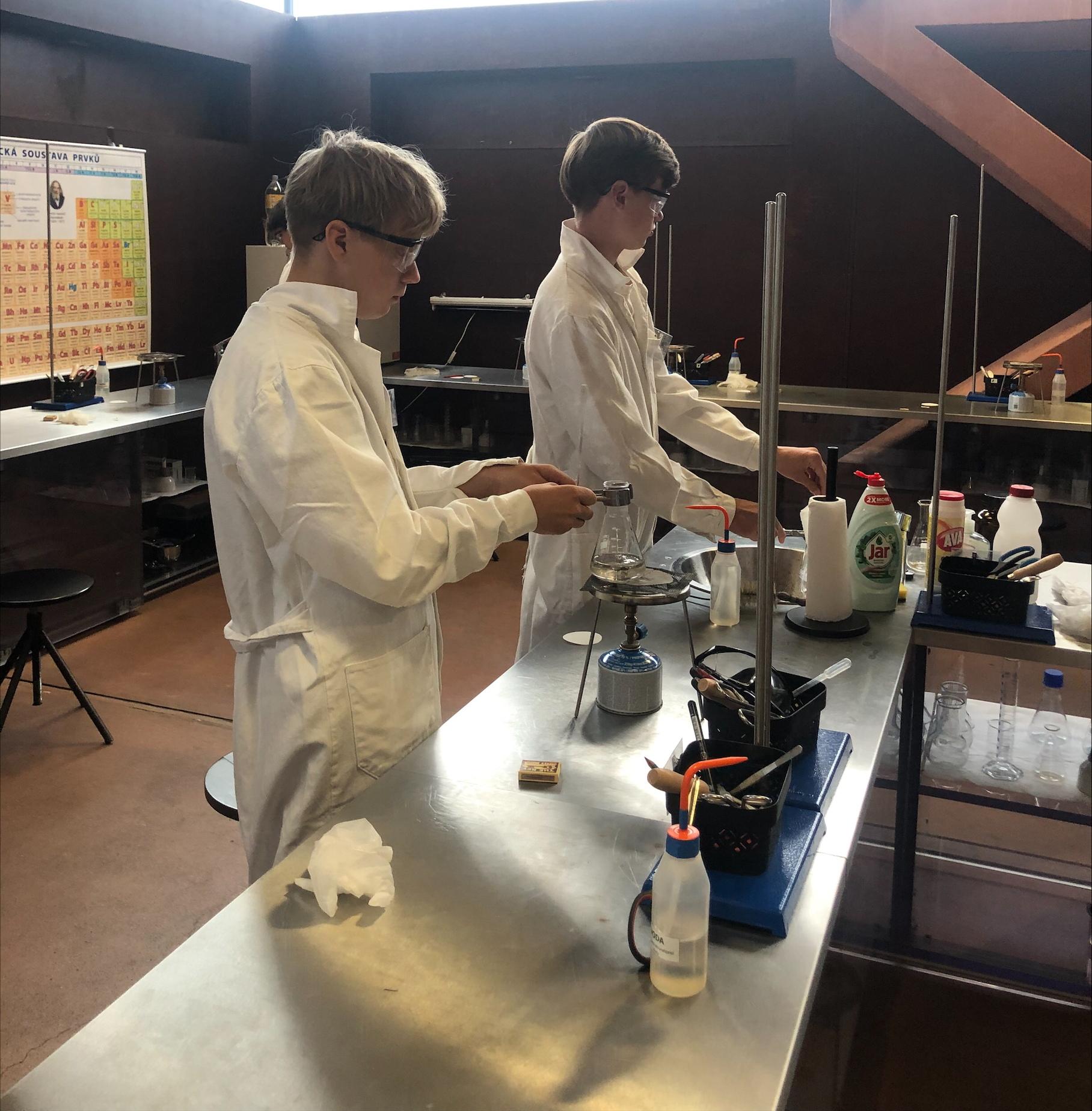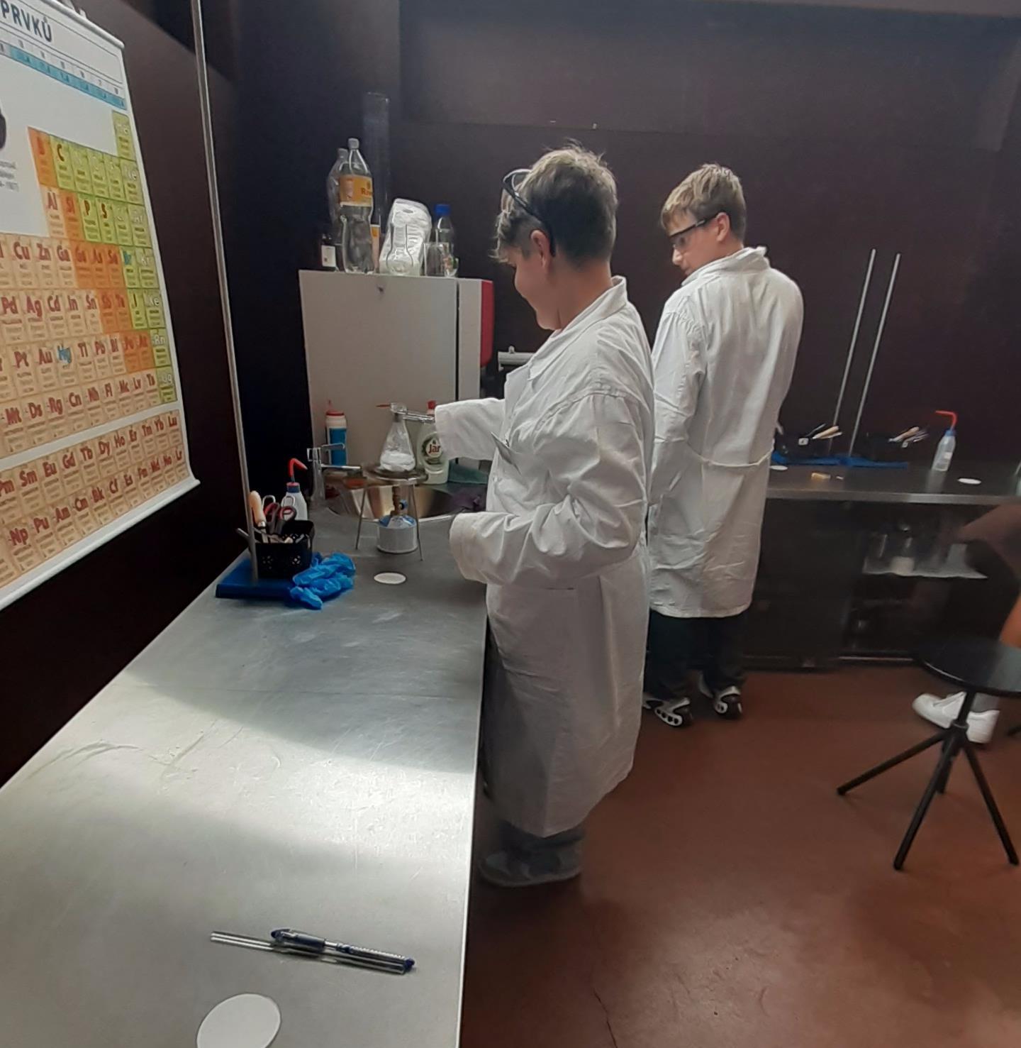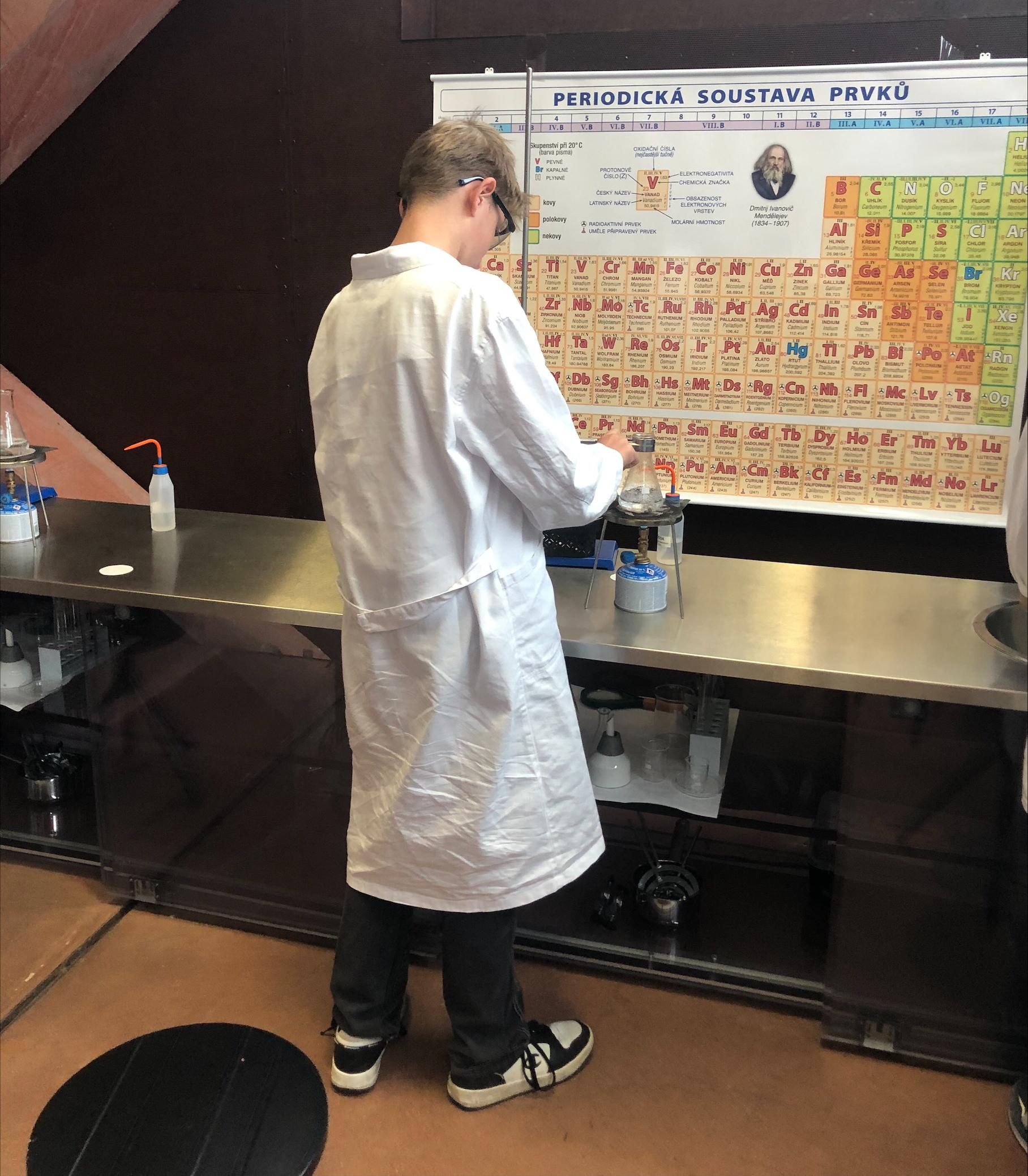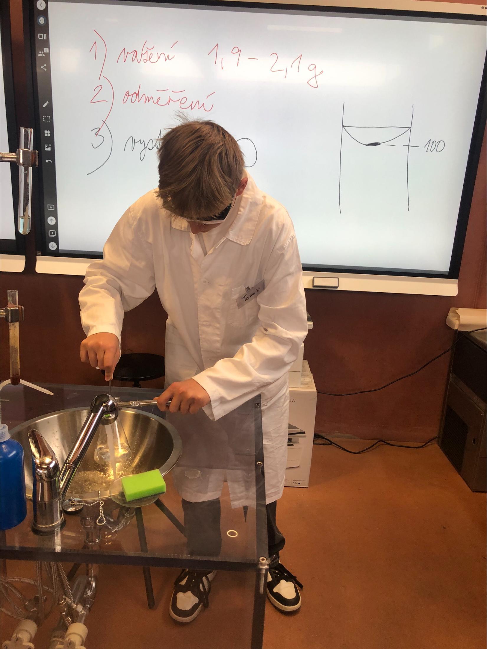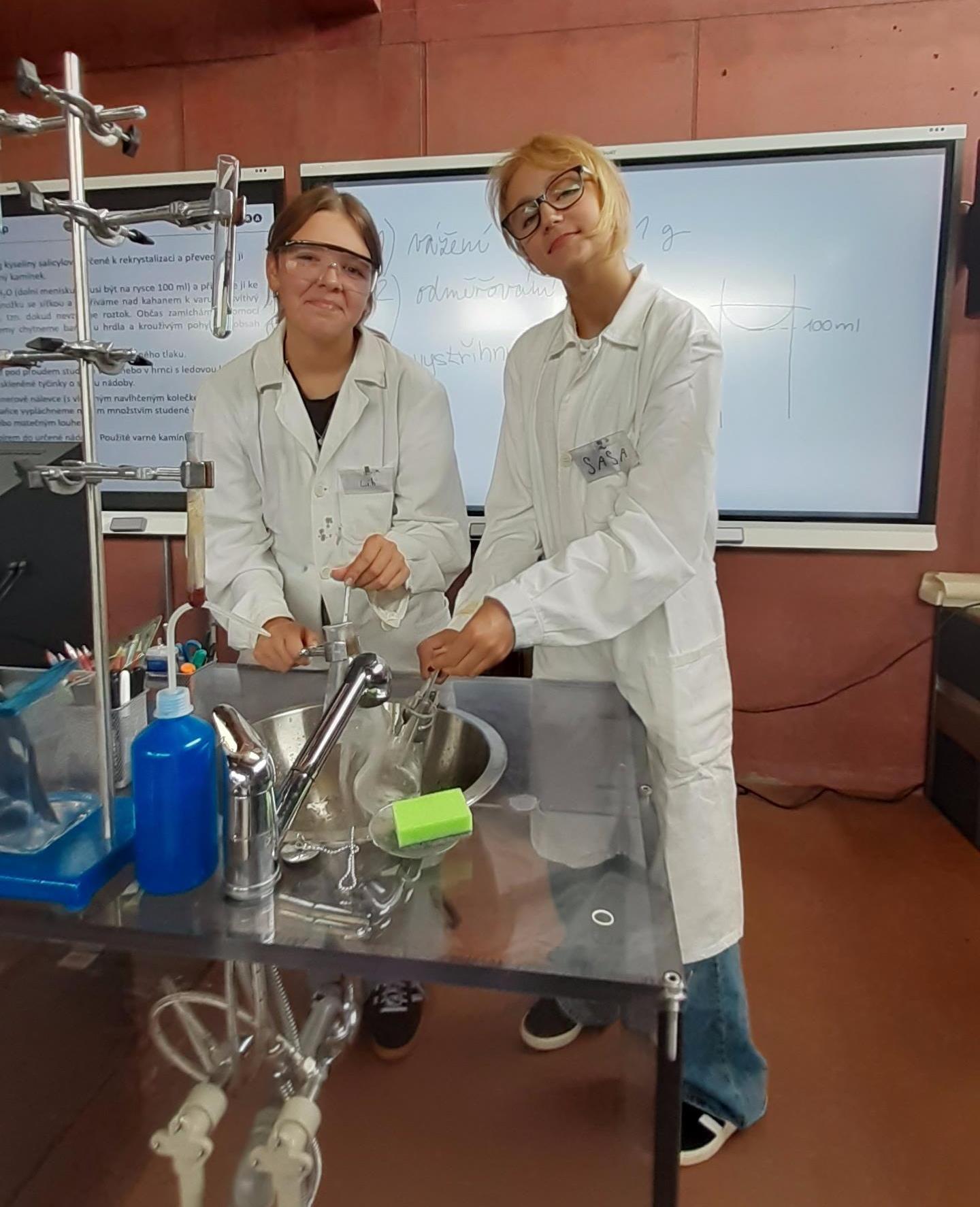 Čekala nás opravdová laboratorní práce – rušená krystalizace. Všichni si oblékli pláště, vzali brýle a rukavice. Připravili si laboratorní nádobí, odvážili kyselinu salicylovou a rozpustili ji ve vodě. Vzniklou suspenzi zahřívali do úplného rozpuštění. Z roztoku se ochlazením pod studenou vodou vyloučily malé krystaly, které jsme odsáli na Büchnerově nálevce filtrací za sníženého tlaku. Dozvěděli jsme se o fluorescenci a vyzkoušeli si práci s UV baterkou a UV lampou. Krásně nám svítily bílé pláště i připravené krystaly.