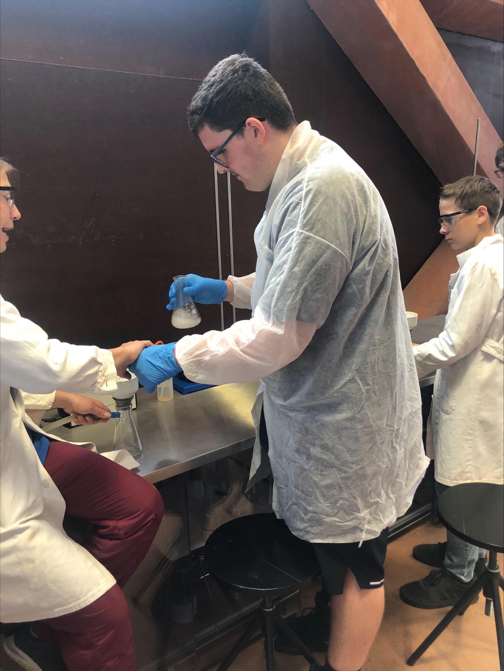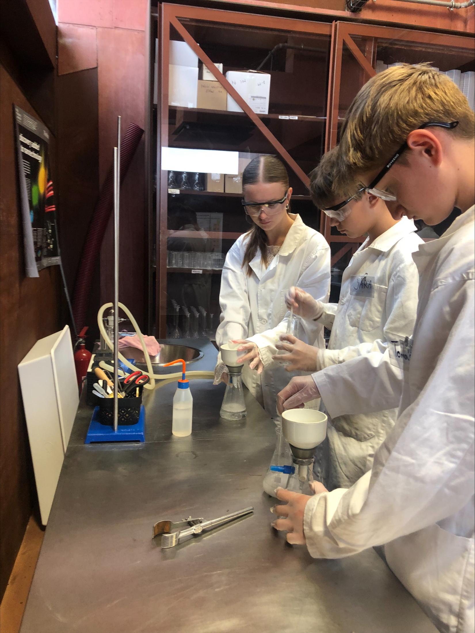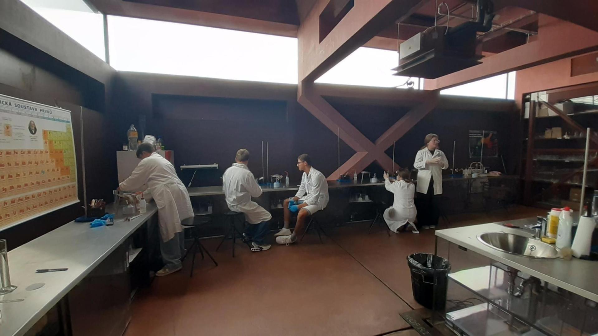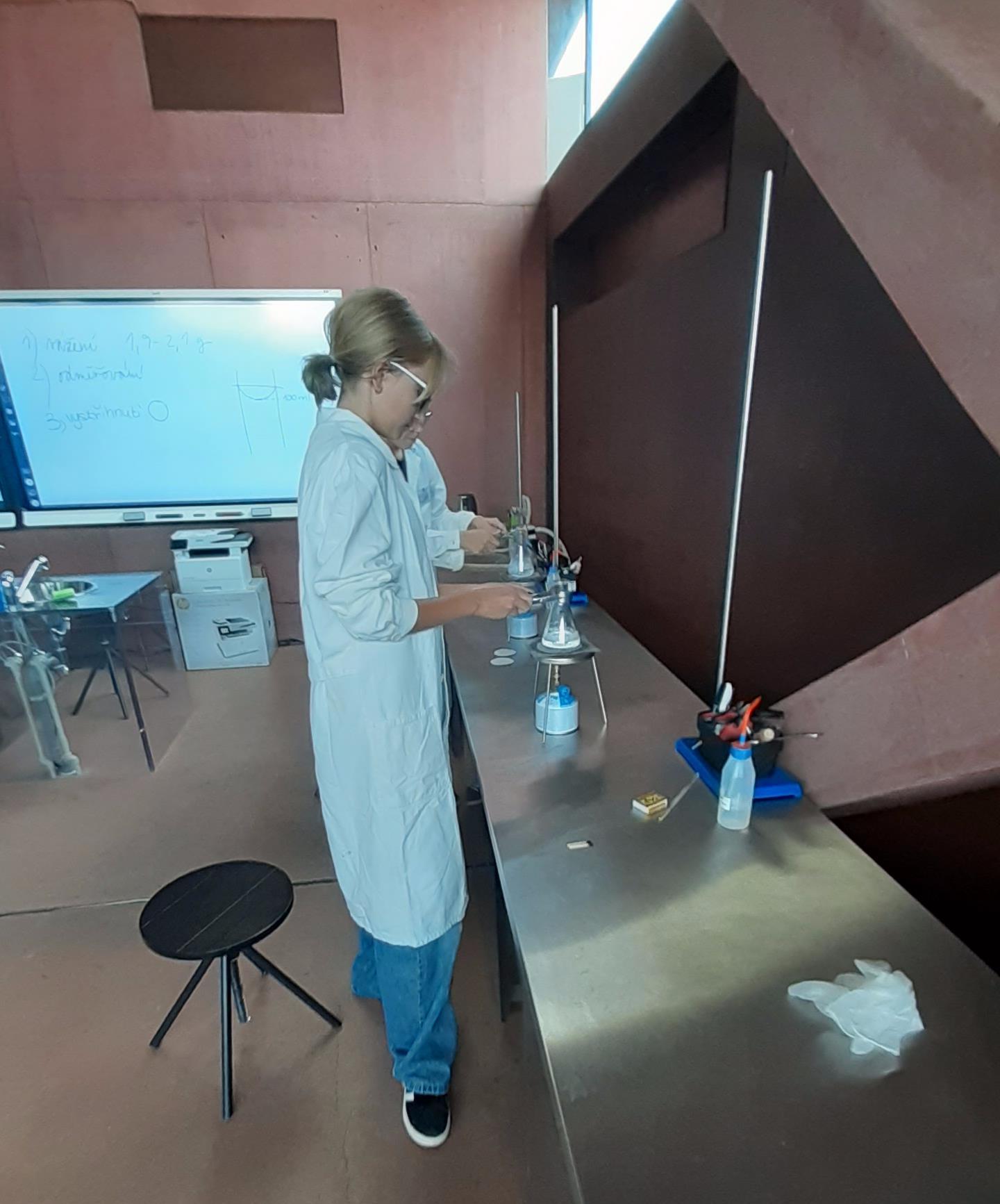 Čekala nás opravdová laboratorní práce – rušená krystalizace. Všichni si oblékli pláště, vzali brýle a rukavice. Připravili si laboratorní nádobí, odvážili kyselinu salicylovou a rozpustili ji ve vodě. Vzniklou suspenzi zahřívali do úplného rozpuštění. Z roztoku se ochlazením pod studenou vodou vyloučily malé krystaly, které jsme odsáli na Büchnerově nálevce filtrací za sníženého tlaku. Dozvěděli jsme se o fluorescenci a vyzkoušeli si práci s UV baterkou a UV lampou. Krásně nám svítily bílé pláště i připravené krystaly.