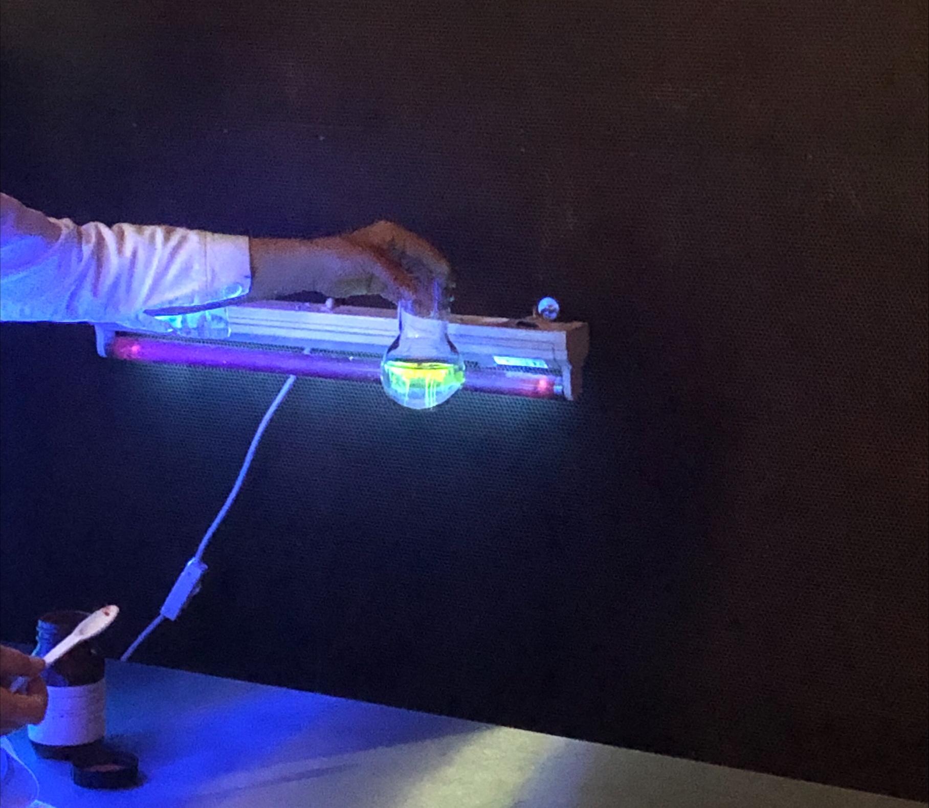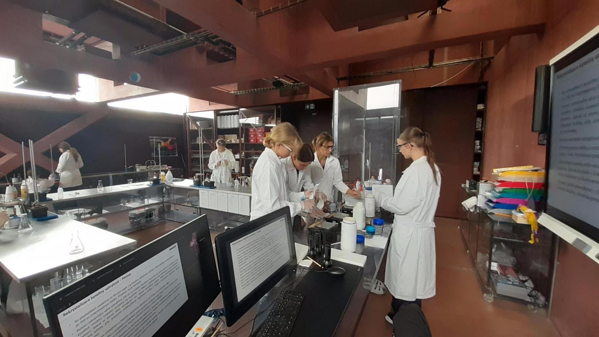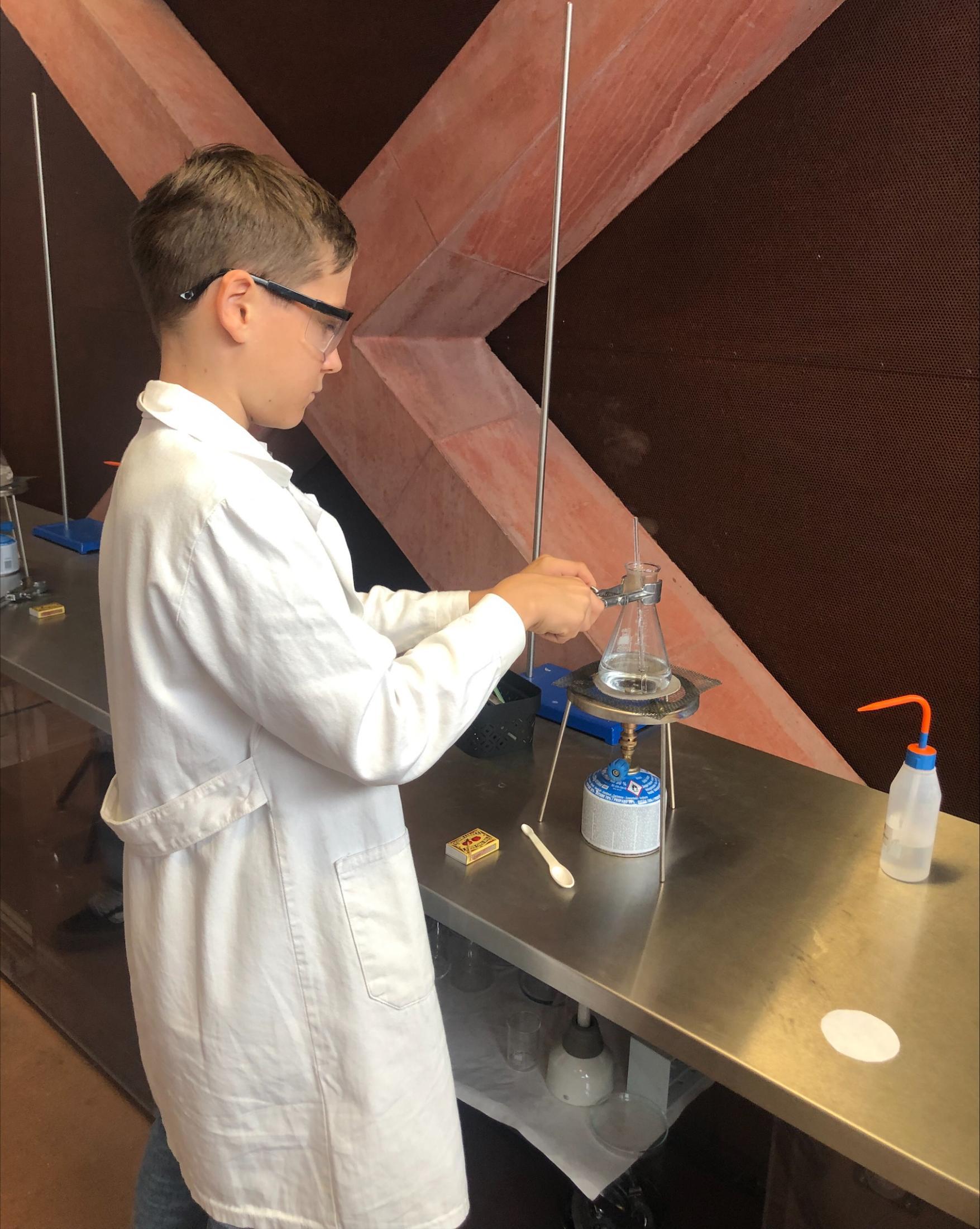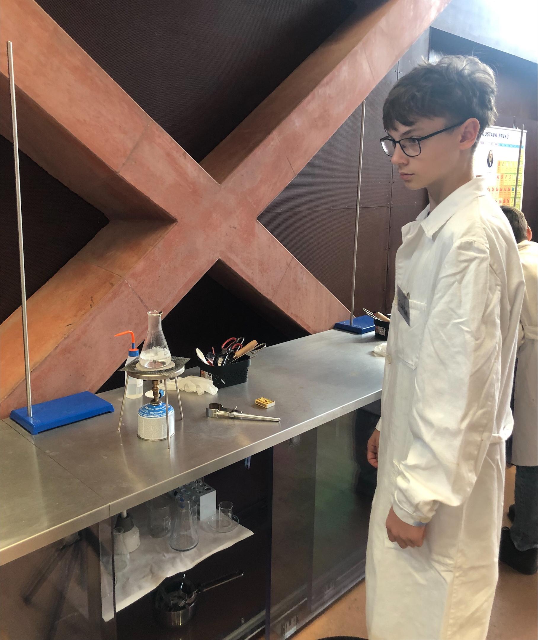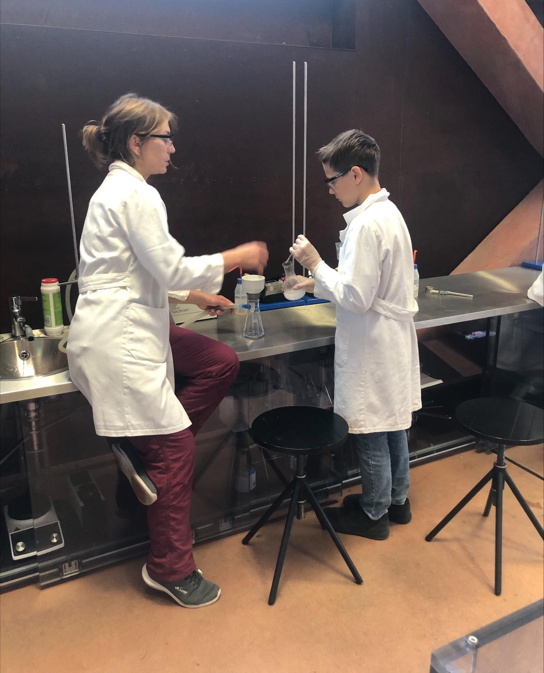 Čekala nás opravdová laboratorní práce – rušená krystalizace. Všichni si oblékli pláště, vzali brýle a rukavice. Připravili si laboratorní nádobí, odvážili kyselinu salicylovou a rozpustili ji ve vodě. Vzniklou suspenzi zahřívali do úplného rozpuštění. Z roztoku se ochlazením pod studenou vodou vyloučily malé krystaly, které jsme odsáli na Büchnerově nálevce filtrací za sníženého tlaku. Dozvěděli jsme se o fluorescenci a vyzkoušeli si práci s UV baterkou a UV lampou. Krásně nám svítily bílé pláště i připravené krystaly.