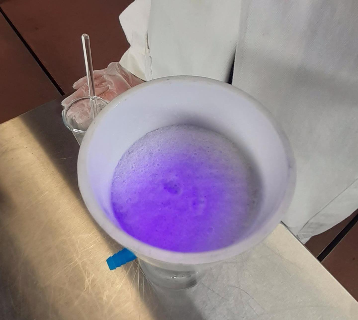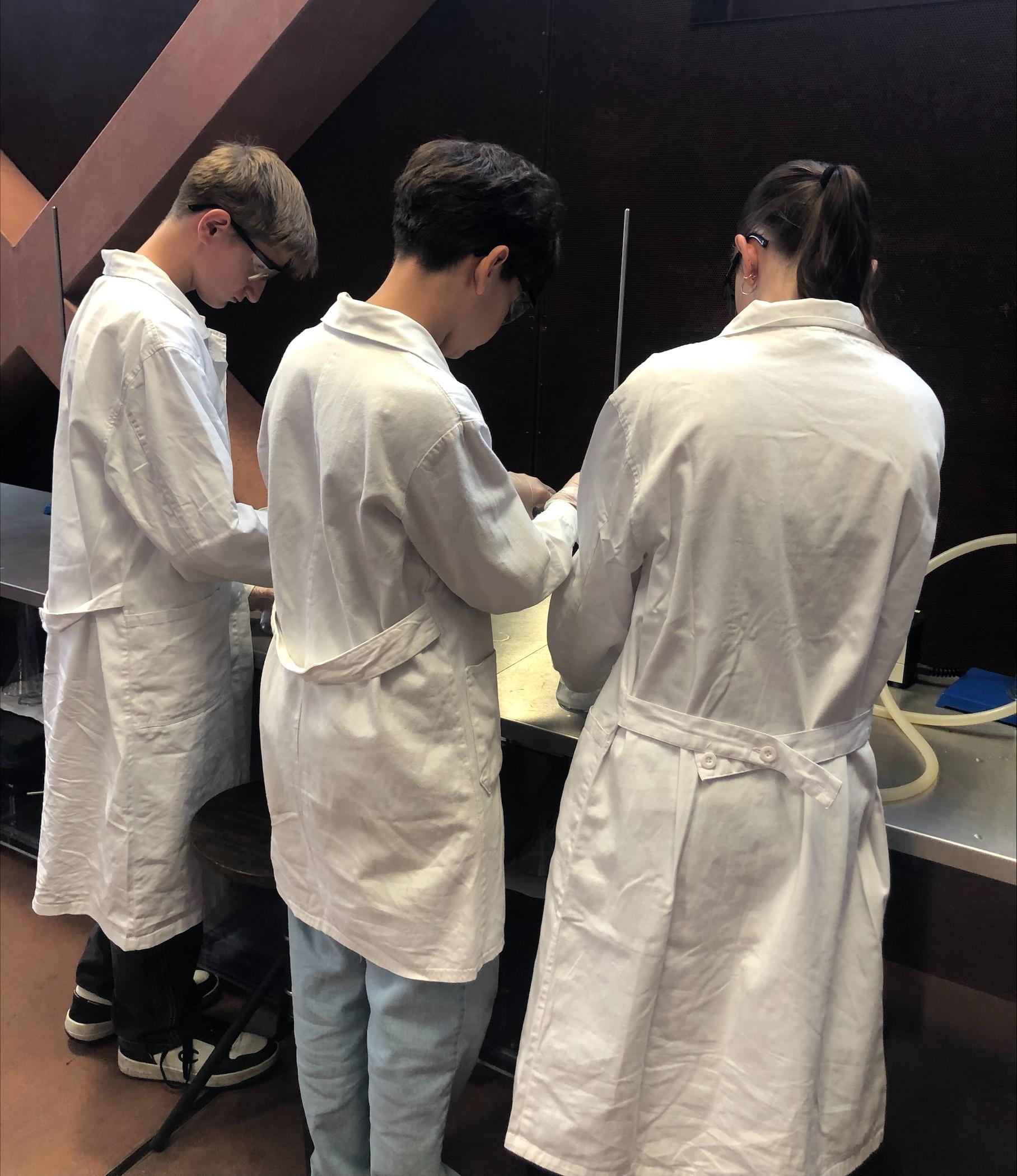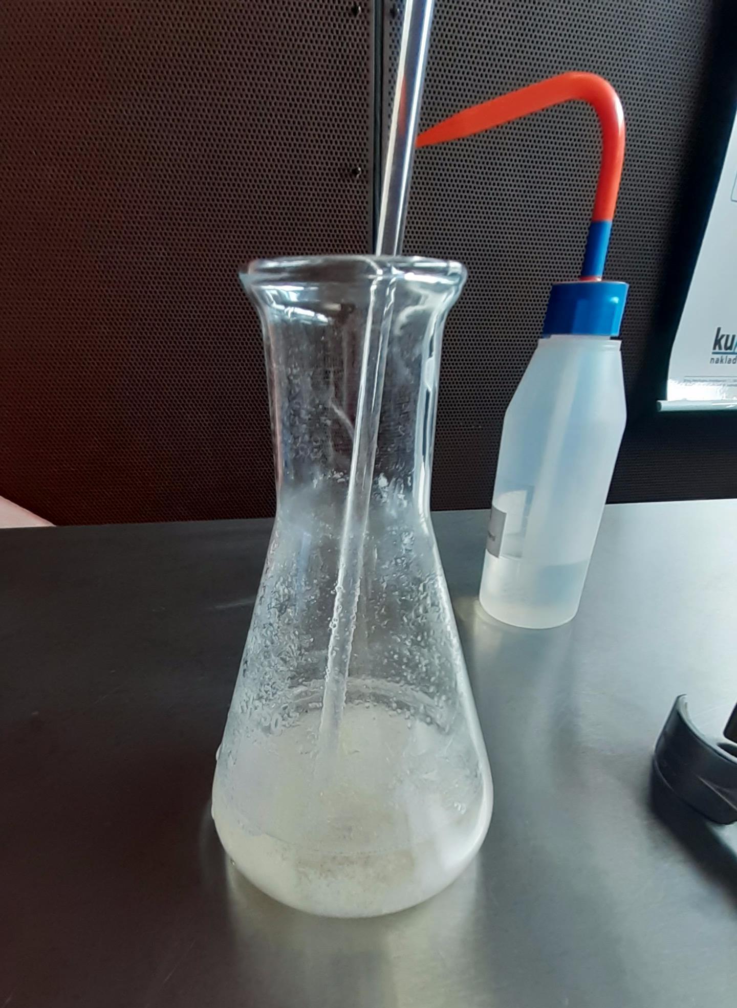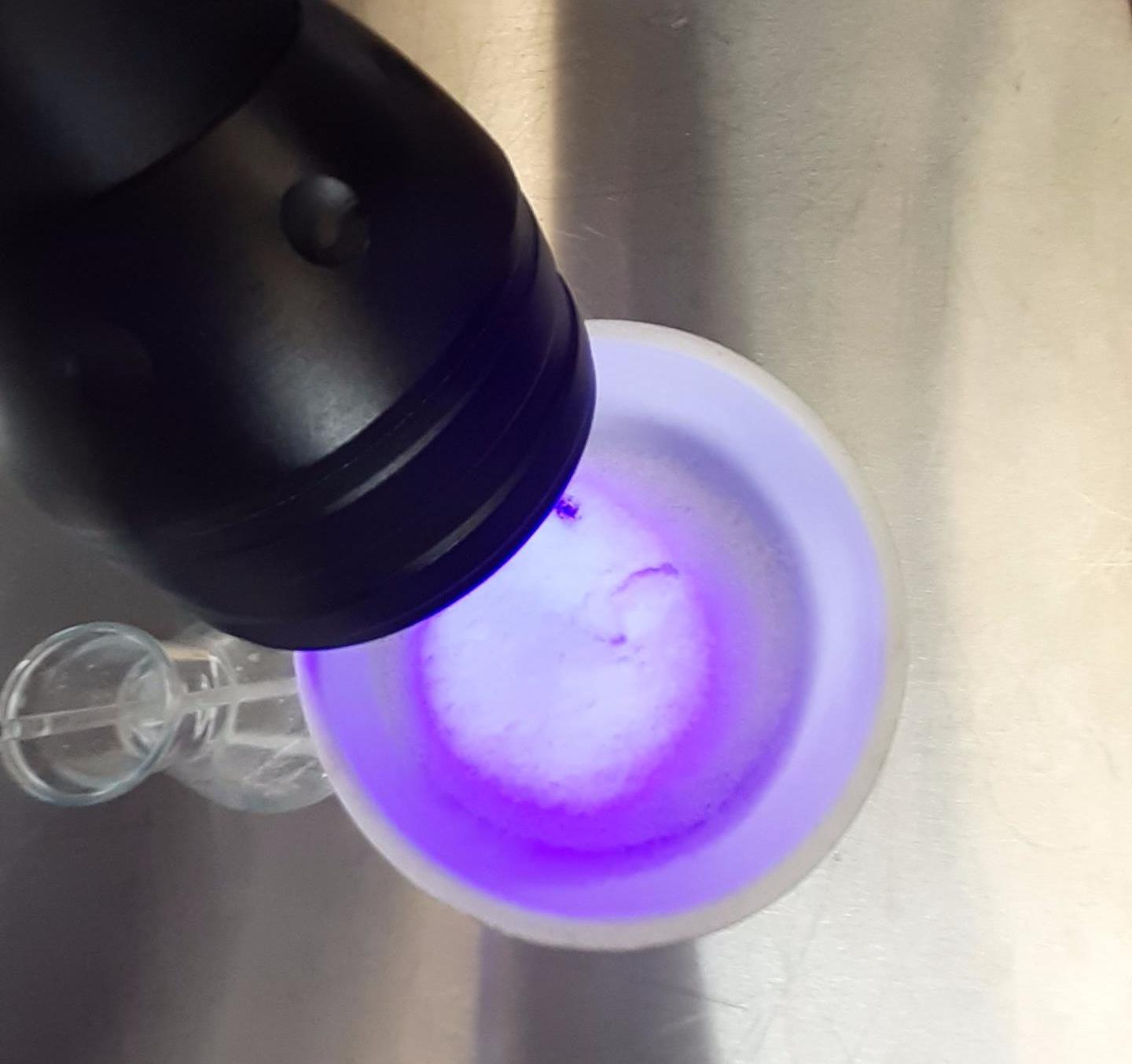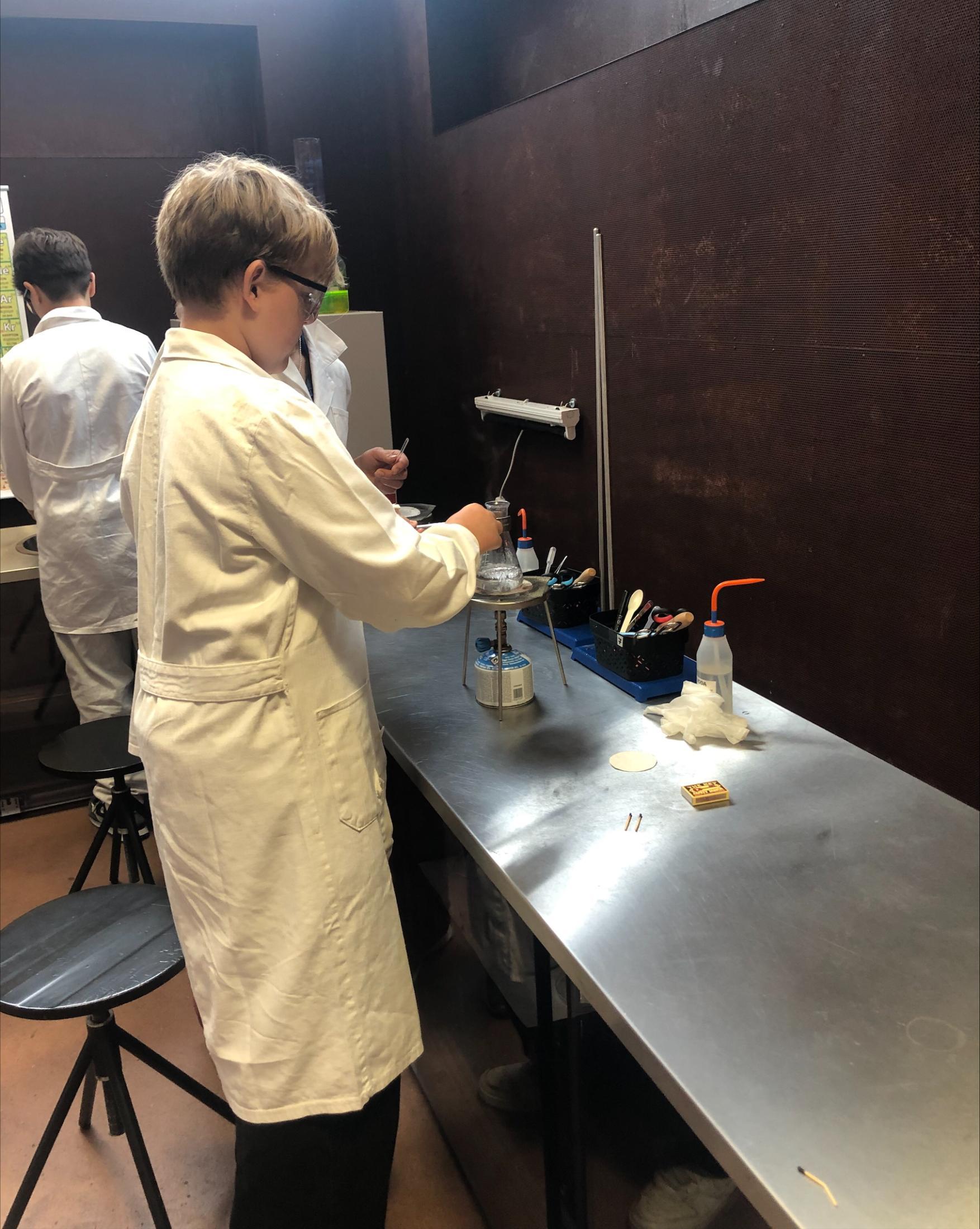 Čekala nás opravdová laboratorní práce – rušená krystalizace. Všichni si oblékli pláště, vzali brýle a rukavice. Připravili si laboratorní nádobí, odvážili kyselinu salicylovou a rozpustili ji ve vodě. Vzniklou suspenzi zahřívali do úplného rozpuštění. Z roztoku se ochlazením pod studenou vodou vyloučily malé krystaly, které jsme odsáli na Büchnerově nálevce filtrací za sníženého tlaku. Dozvěděli jsme se o fluorescenci a vyzkoušeli si práci s UV baterkou a UV lampou. Krásně nám svítily bílé pláště i připravené krystaly.