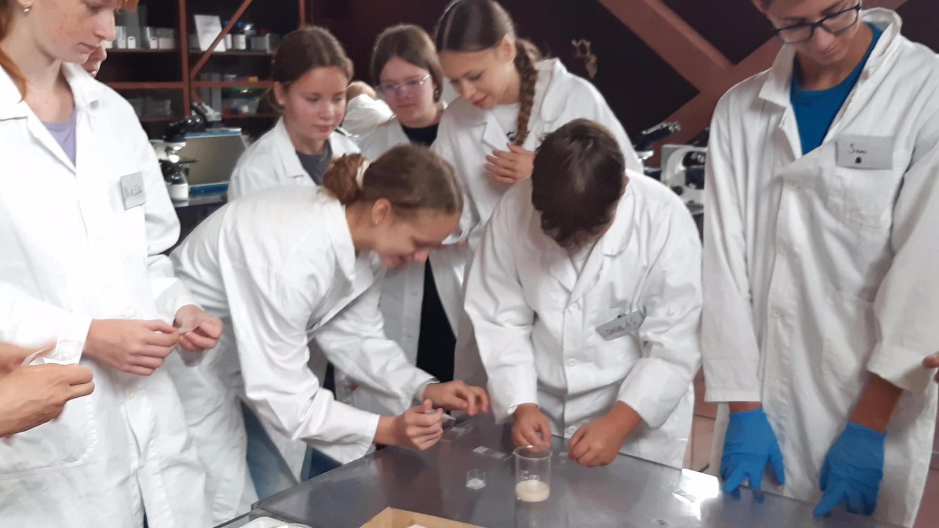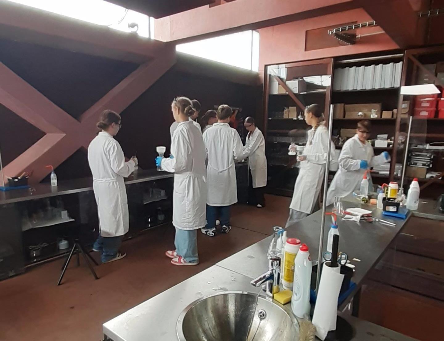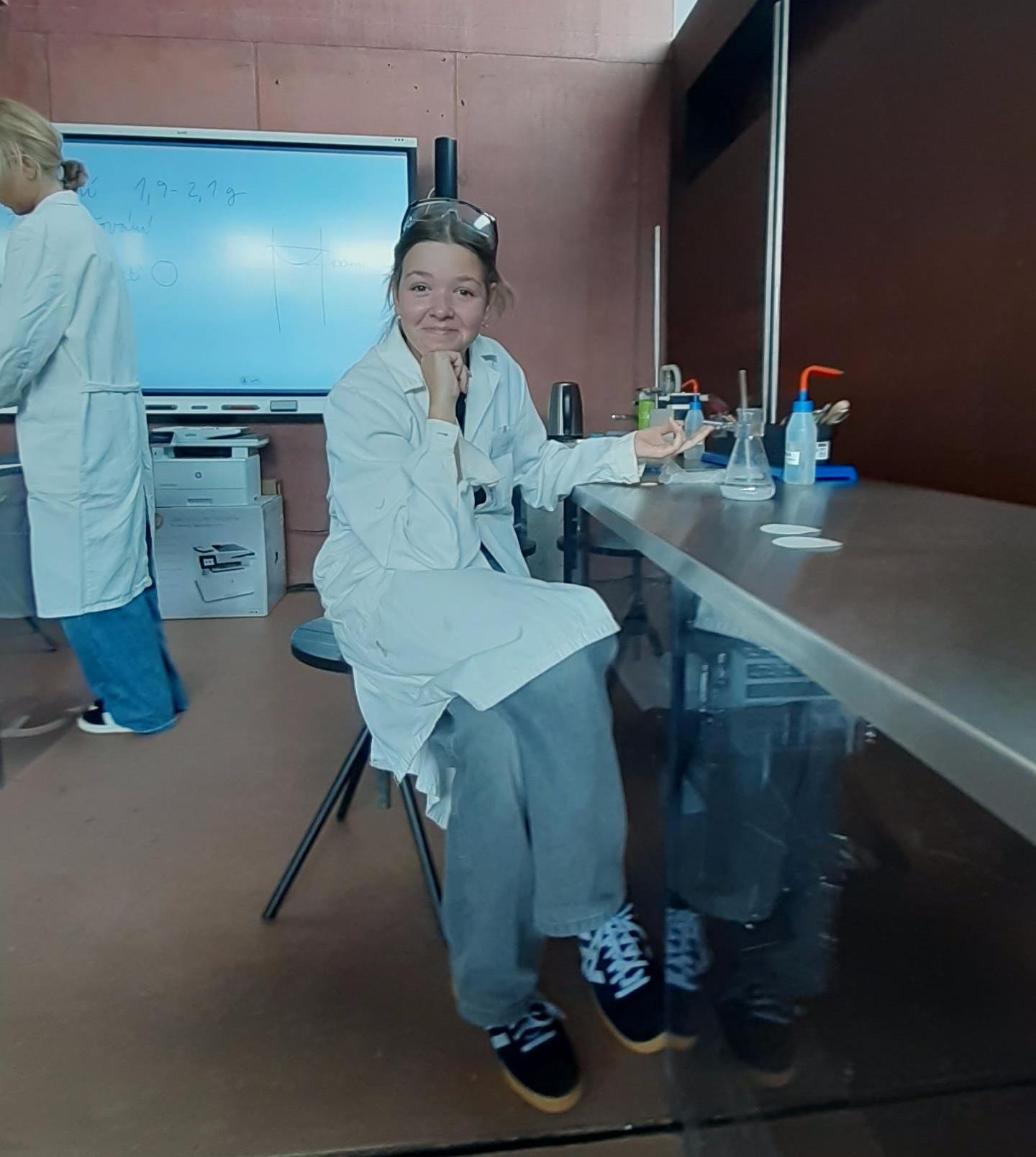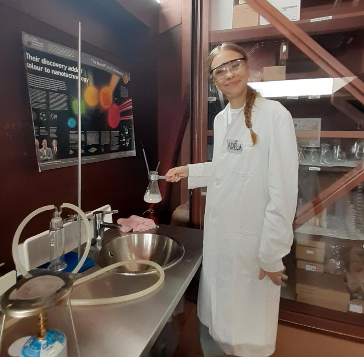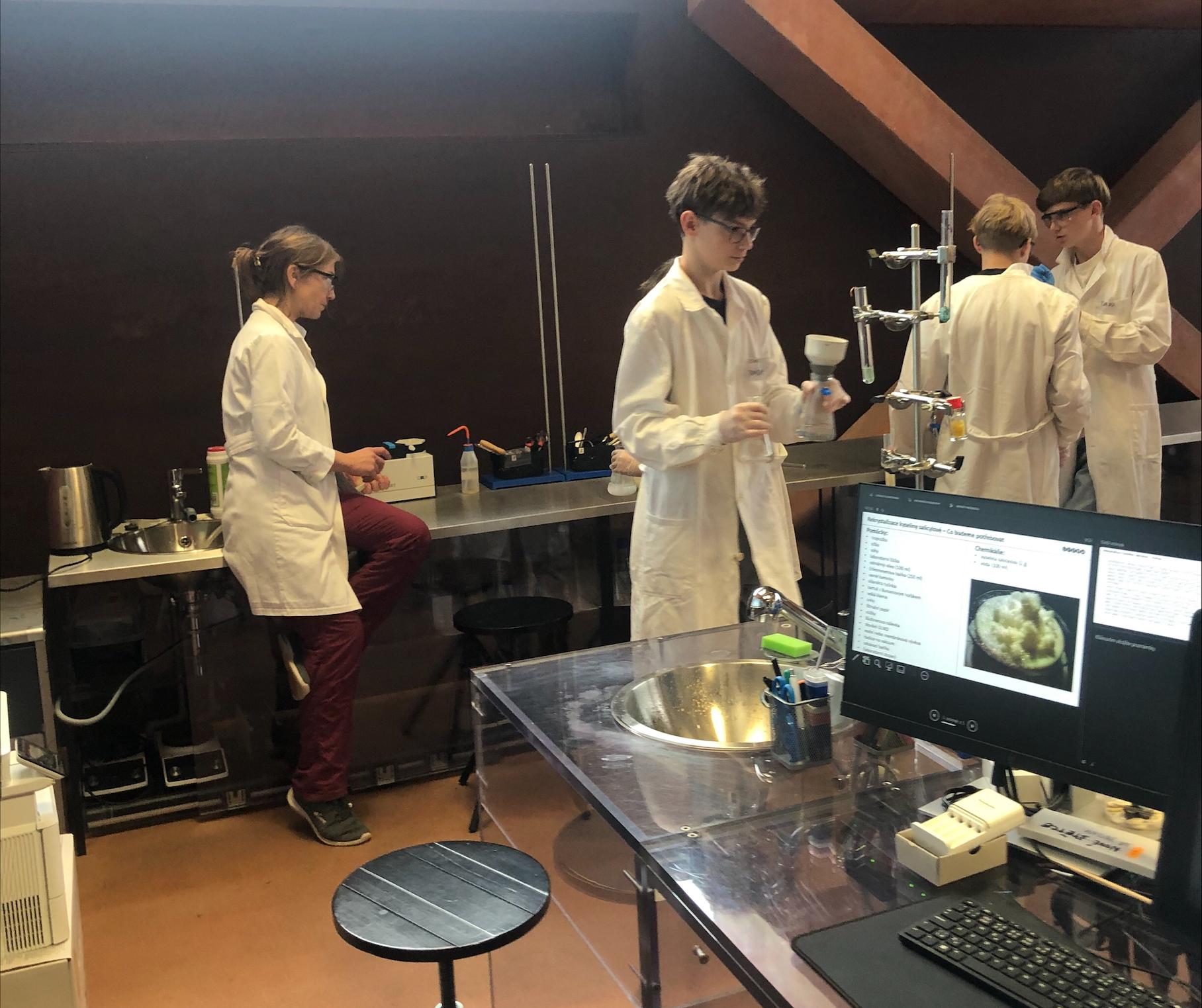 Čekala nás opravdová laboratorní práce – rušená krystalizace. Všichni si oblékli pláště, vzali brýle a rukavice. Připravili si laboratorní nádobí, odvážili kyselinu salicylovou a rozpustili ji ve vodě. Vzniklou suspenzi zahřívali do úplného rozpuštění. Z roztoku se ochlazením pod studenou vodou vyloučily malé krystaly, které jsme odsáli na Büchnerově nálevce filtrací za sníženého tlaku. Dozvěděli jsme se o fluorescenci a vyzkoušeli si práci s UV baterkou a UV lampou. Krásně nám svítily bílé pláště i připravené krystaly.