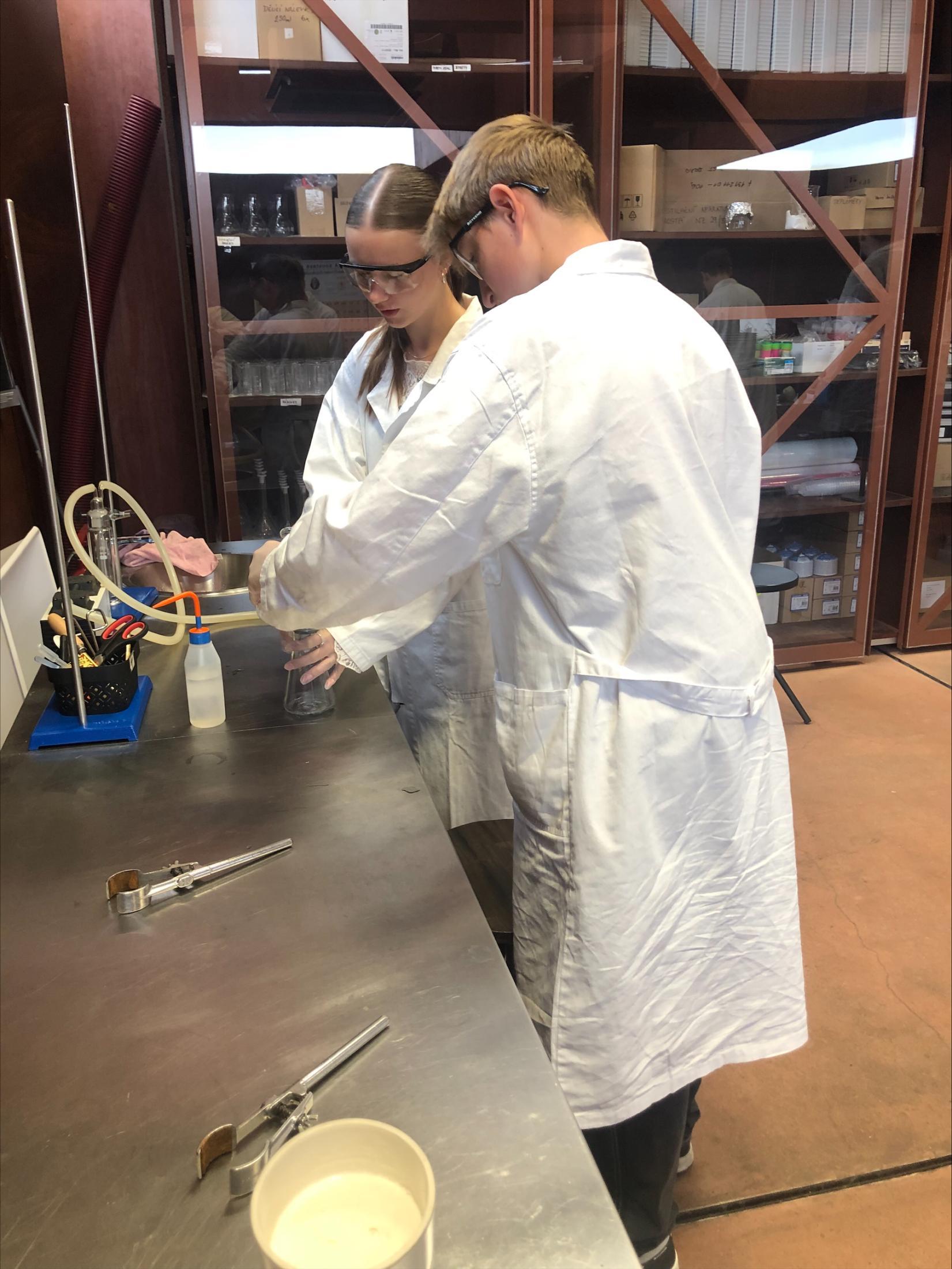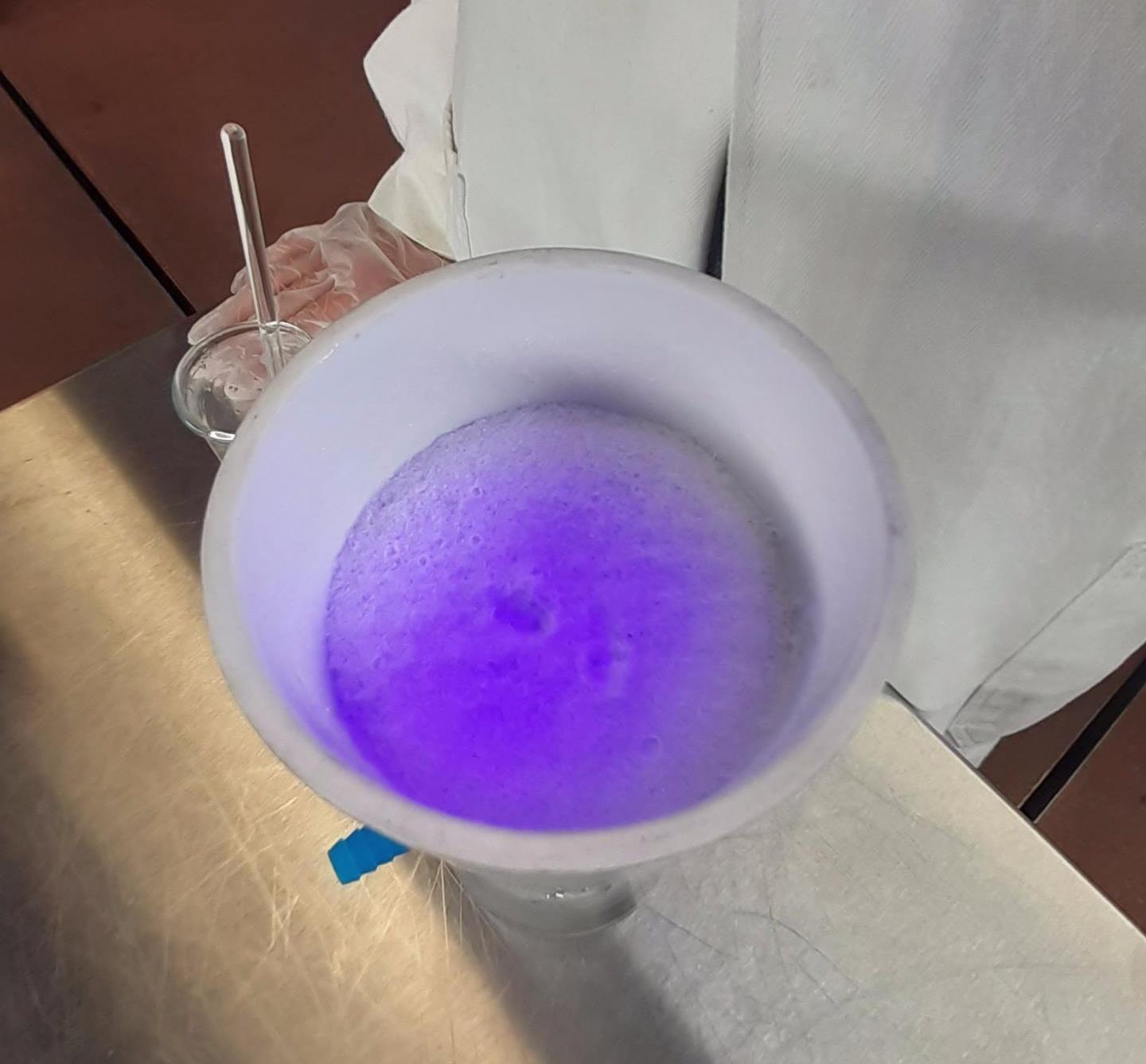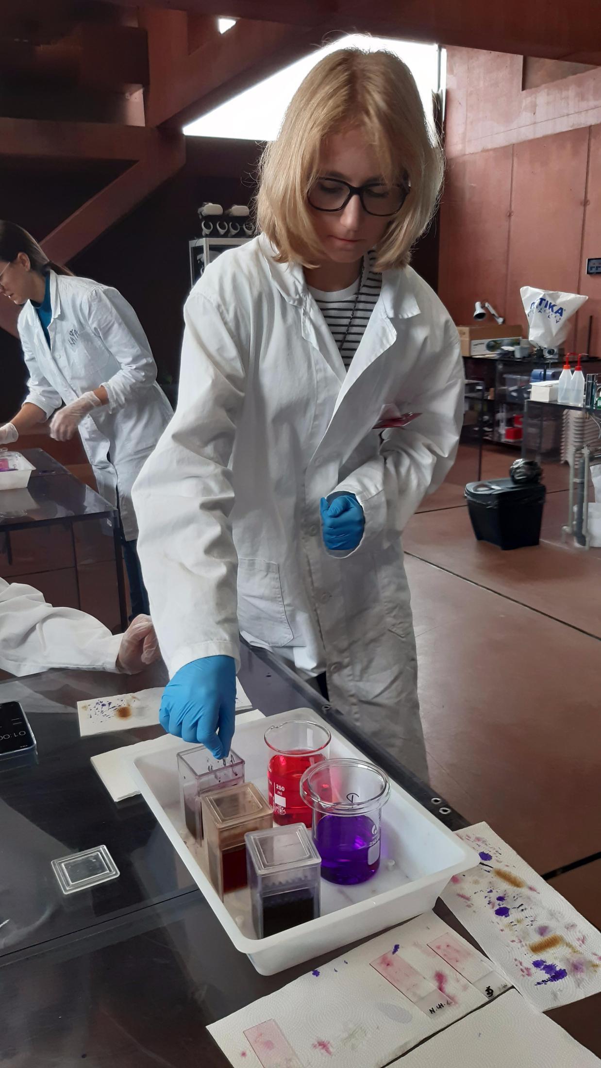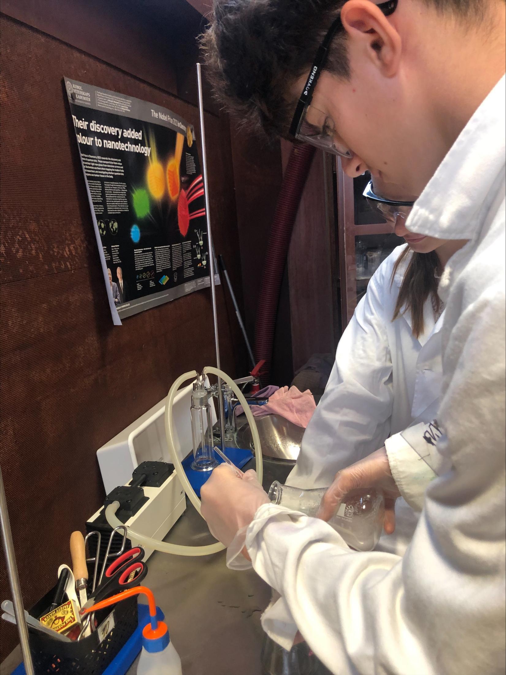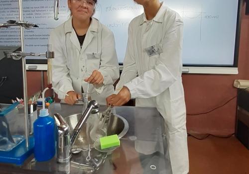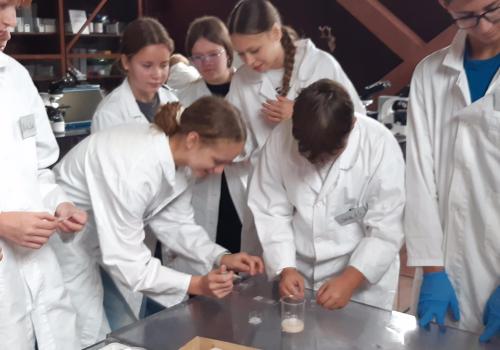 Čekala nás opravdová laboratorní práce – rušená krystalizace. Všichni si oblékli pláště, vzali brýle a rukavice. Připravili si laboratorní nádobí, odvážili kyselinu salicylovou a rozpustili ji ve vodě. Vzniklou suspenzi zahřívali do úplného rozpuštění. Z roztoku se ochlazením pod studenou vodou vyloučily malé krystaly, které jsme odsáli na Büchnerově nálevce filtrací za sníženého tlaku. Dozvěděli jsme se o fluorescenci a vyzkoušeli si práci s UV baterkou a UV lampou. Krásně nám svítily bílé pláště i připravené krystaly.