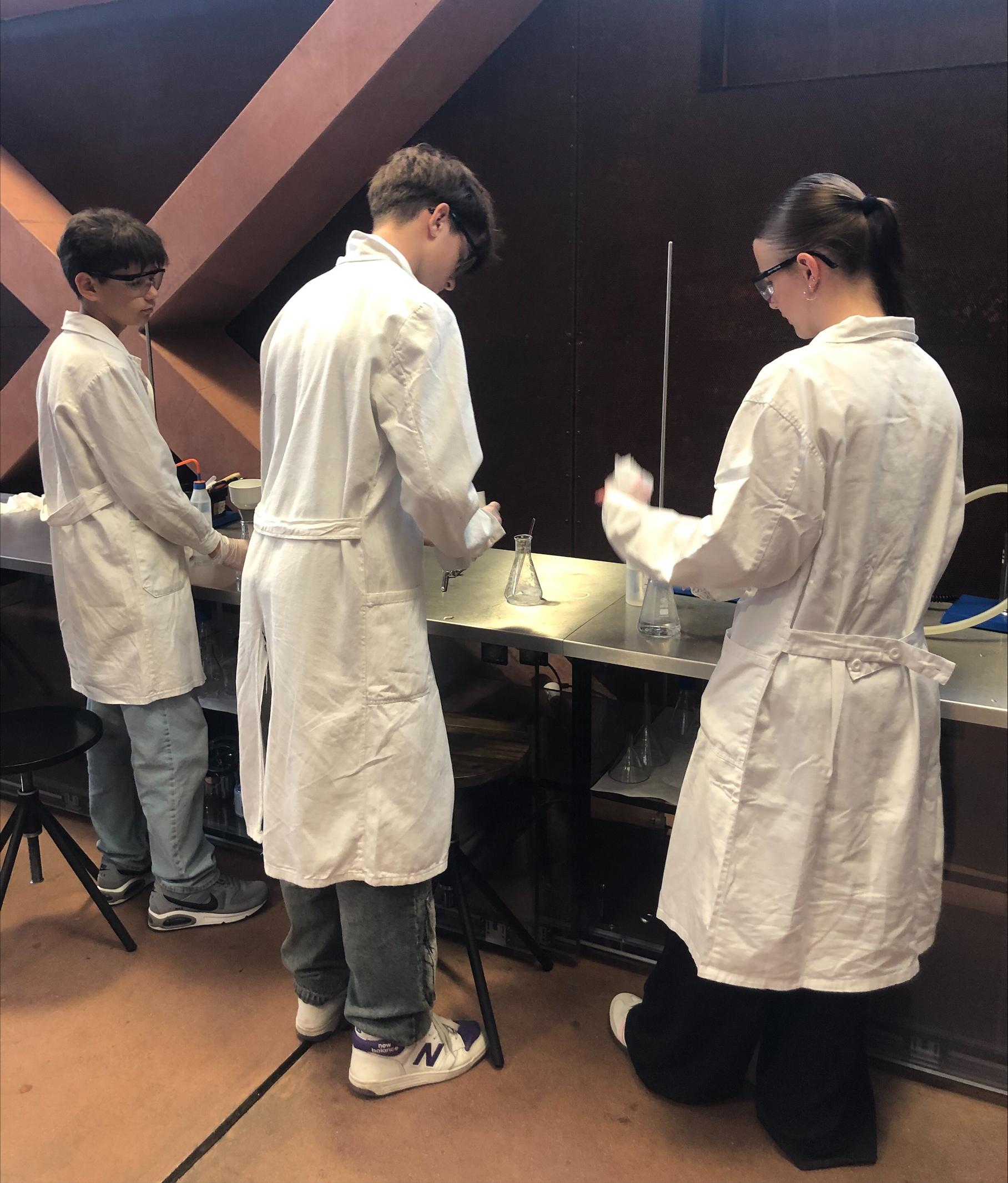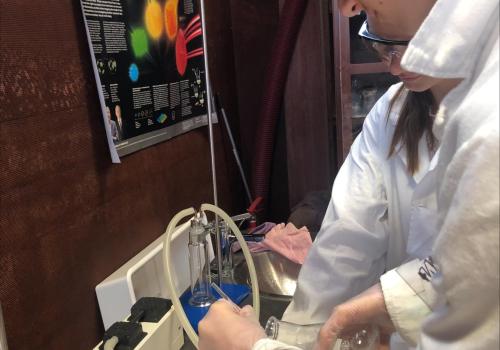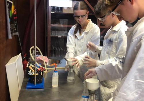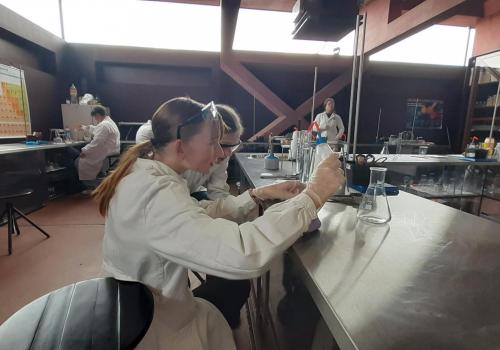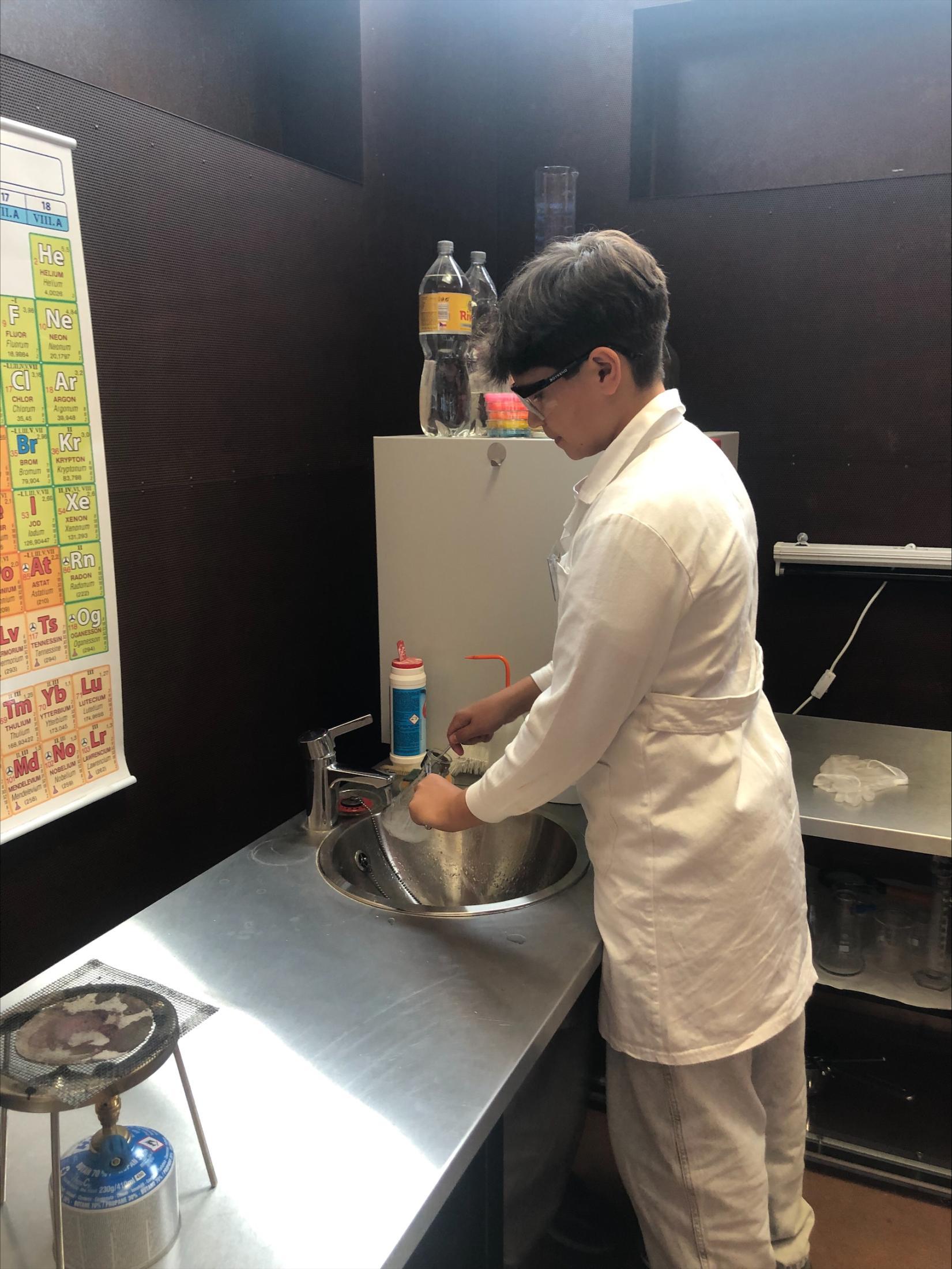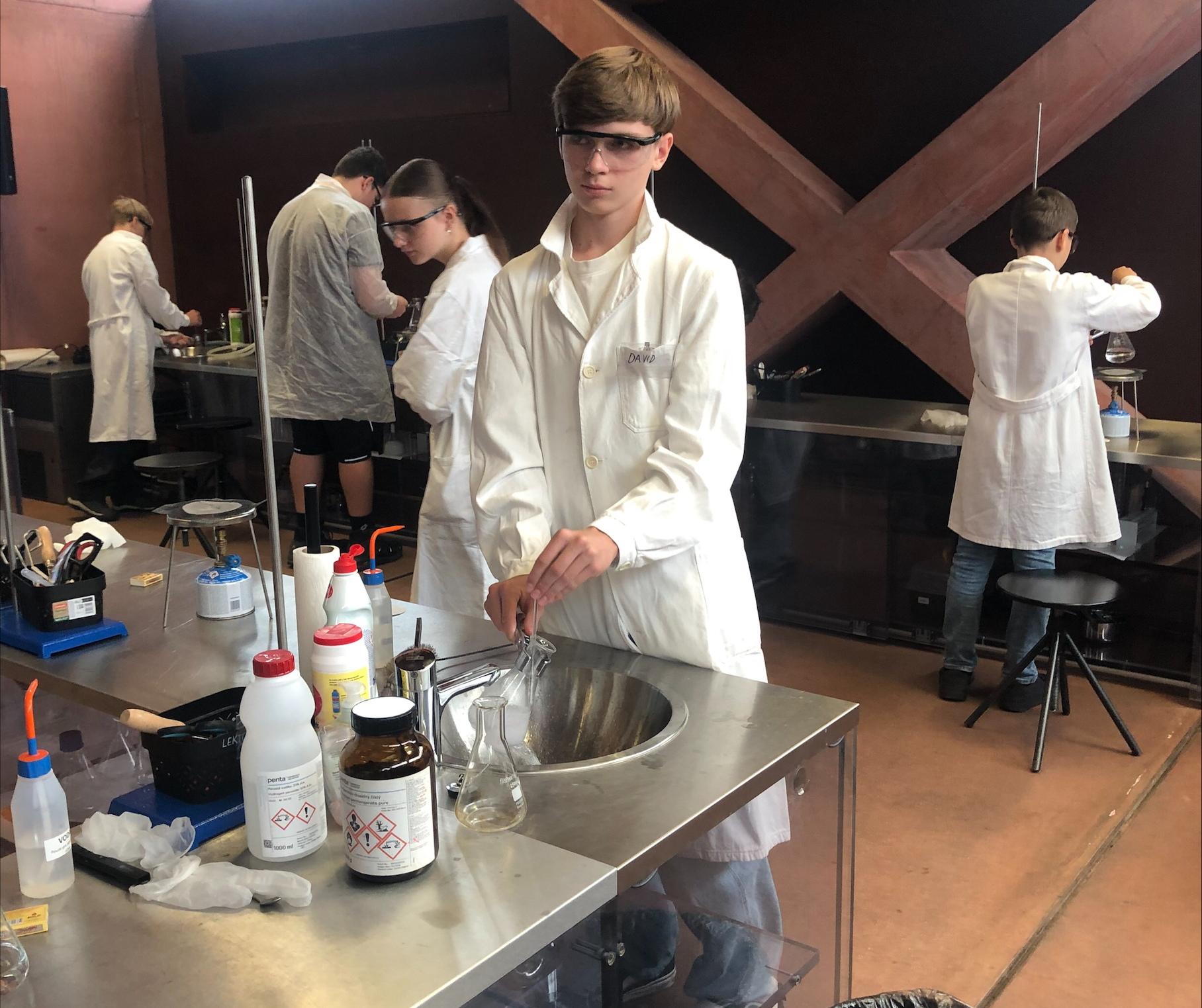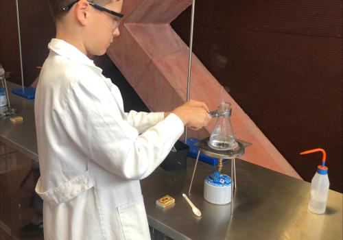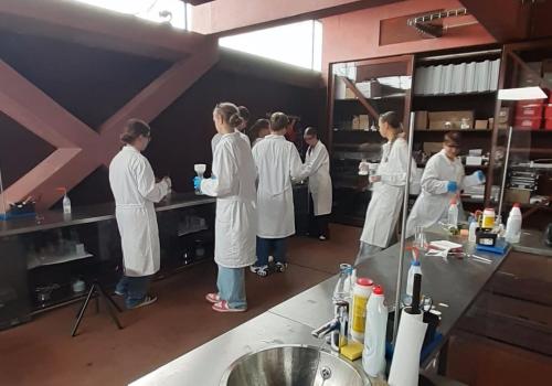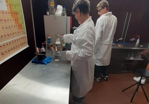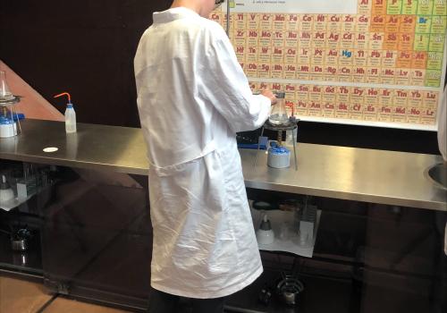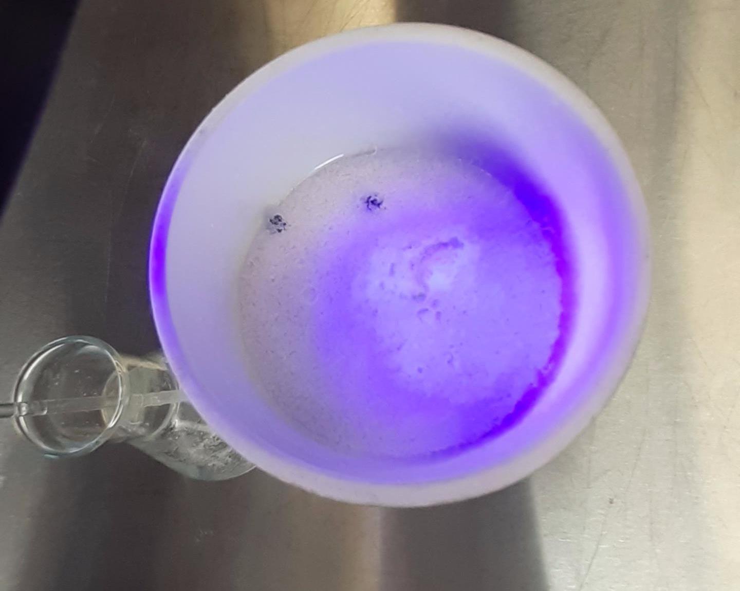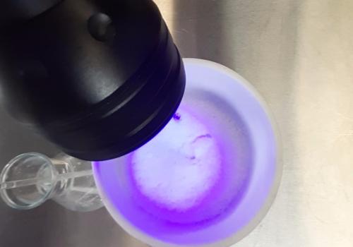 Čekala nás opravdová laboratorní práce – rušená krystalizace. Všichni si oblékli pláště, vzali brýle a rukavice. Připravili si laboratorní nádobí, odvážili kyselinu salicylovou a rozpustili ji ve vodě. Vzniklou suspenzi zahřívali do úplného rozpuštění. Z roztoku se ochlazením pod studenou vodou vyloučily malé krystaly, které jsme odsáli na Büchnerově nálevce filtrací za sníženého tlaku. Dozvěděli jsme se o fluorescenci a vyzkoušeli si práci s UV baterkou a UV lampou. Krásně nám svítily bílé pláště i připravené krystaly.