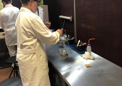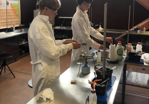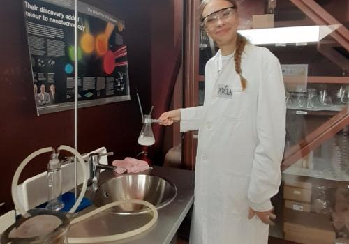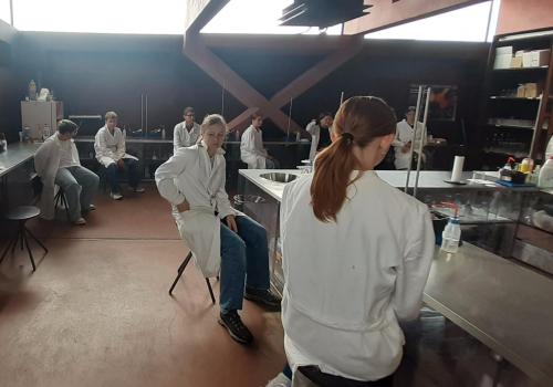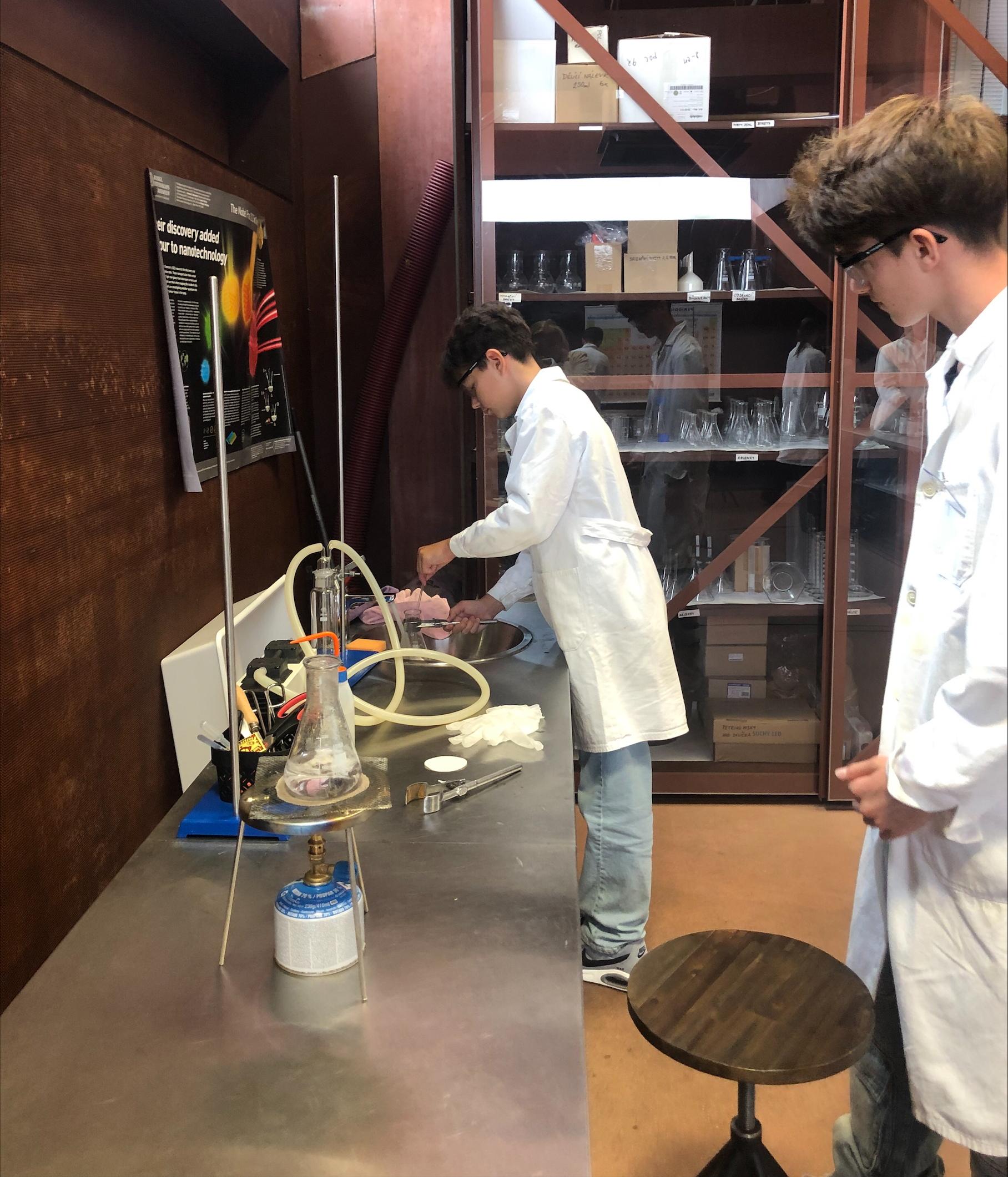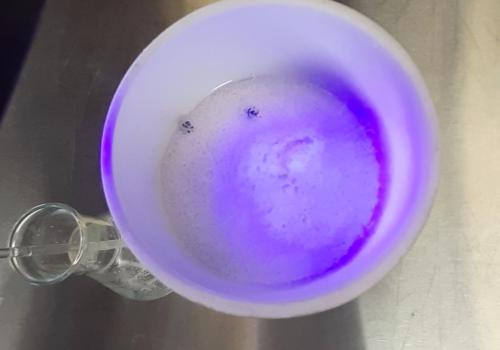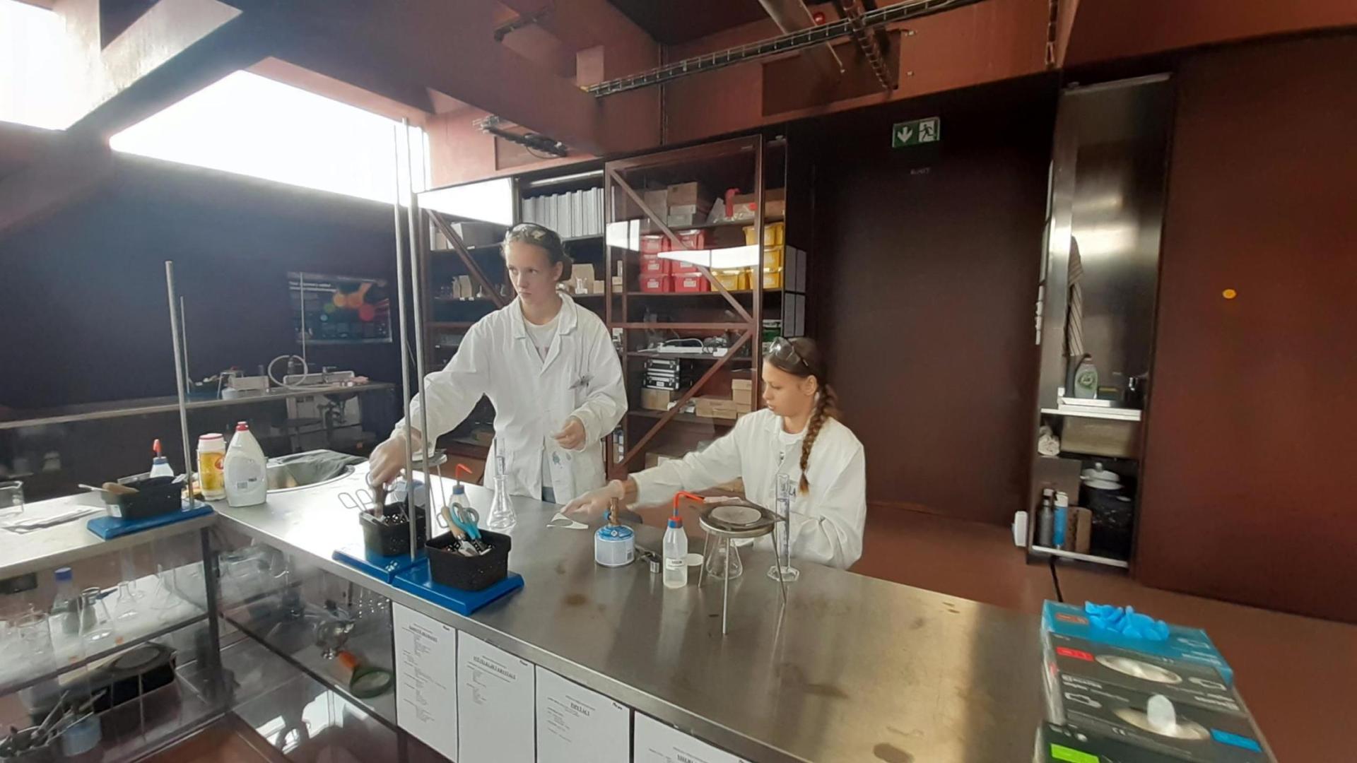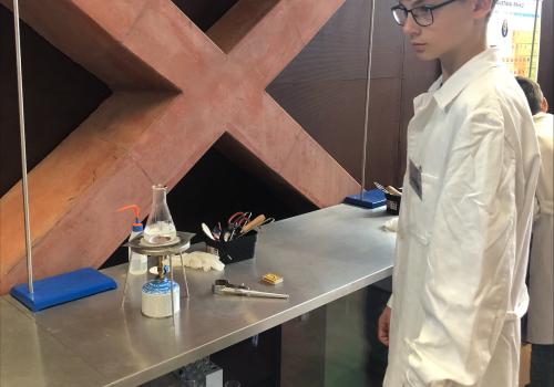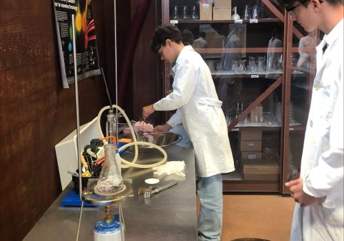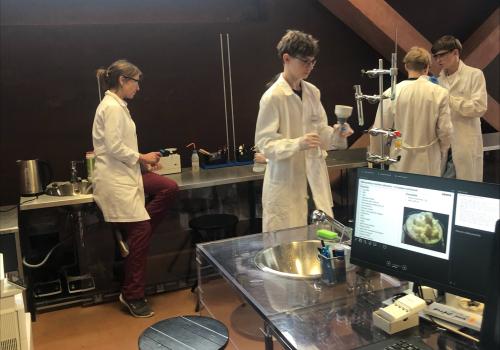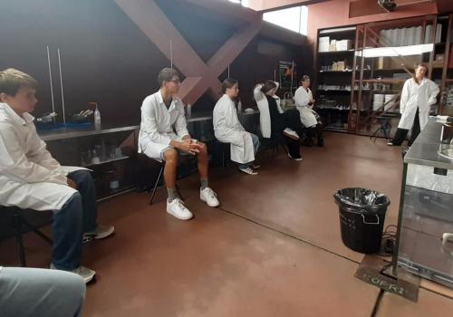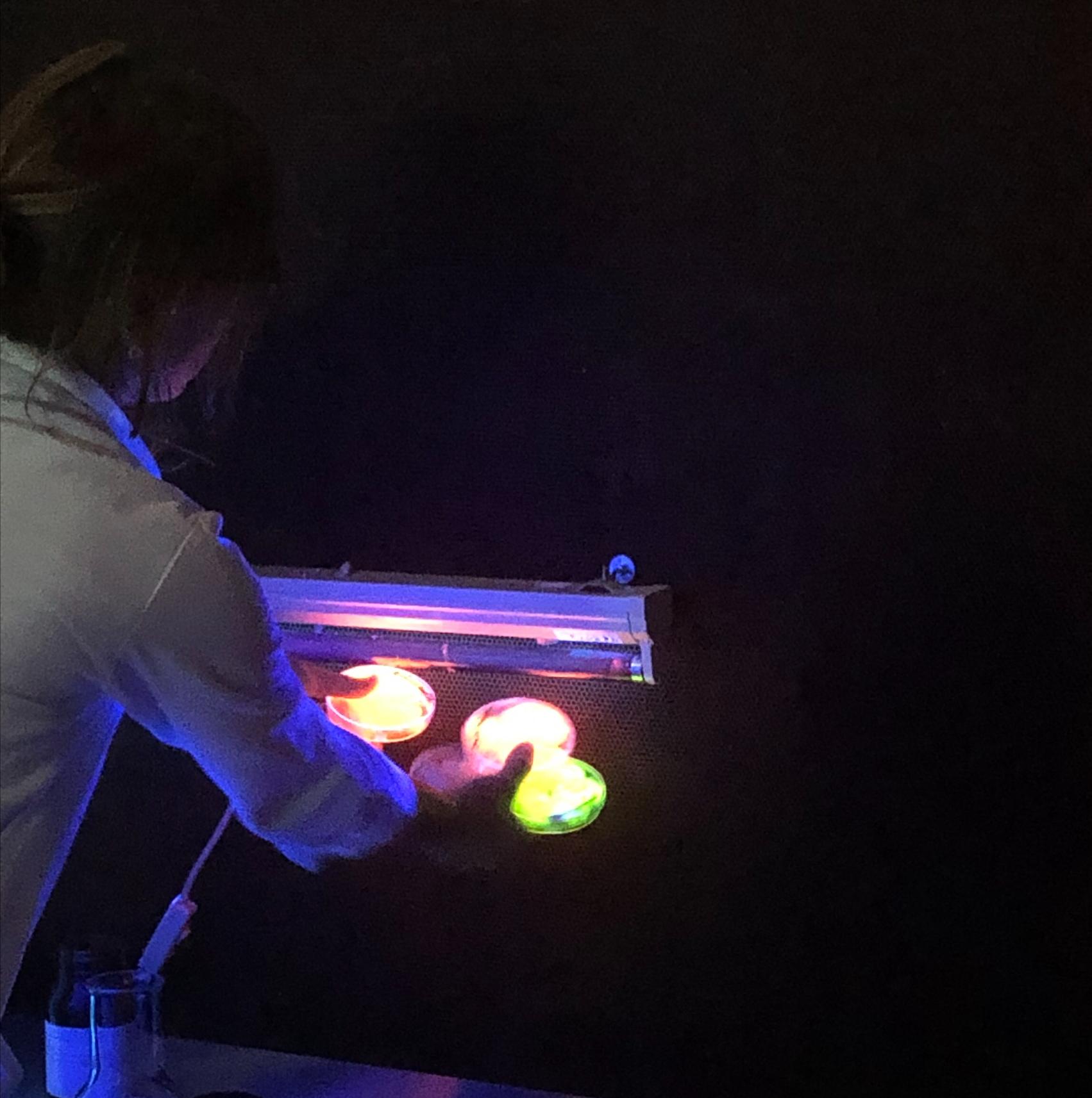 Čekala nás opravdová laboratorní práce – rušená krystalizace. Všichni si oblékli pláště, vzali brýle a rukavice. Připravili si laboratorní nádobí, odvážili kyselinu salicylovou a rozpustili ji ve vodě. Vzniklou suspenzi zahřívali do úplného rozpuštění. Z roztoku se ochlazením pod studenou vodou vyloučily malé krystaly, které jsme odsáli na Büchnerově nálevce filtrací za sníženého tlaku. Dozvěděli jsme se o fluorescenci a vyzkoušeli si práci s UV baterkou a UV lampou. Krásně nám svítily bílé pláště i připravené krystaly.