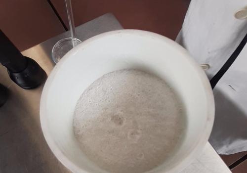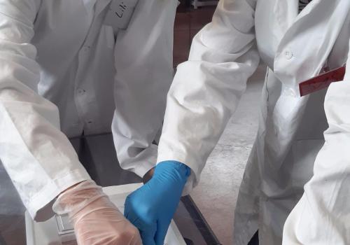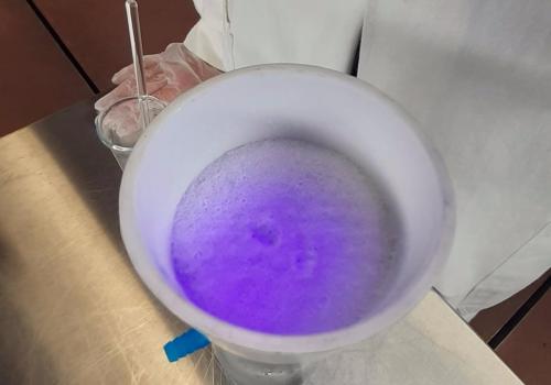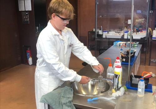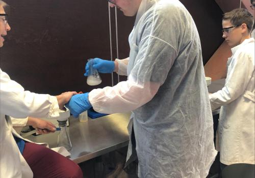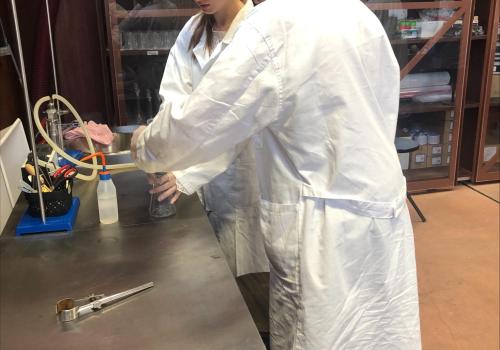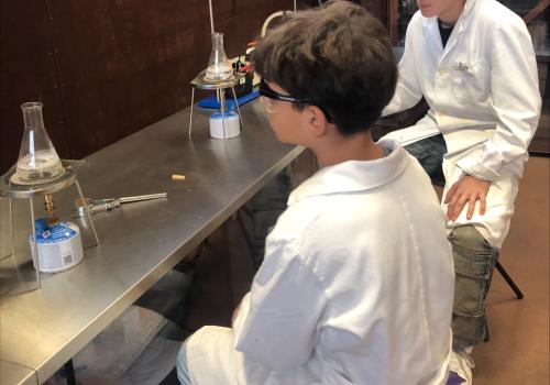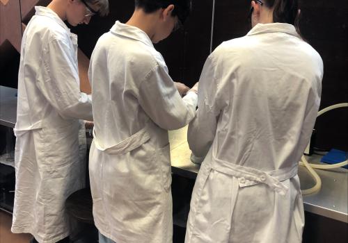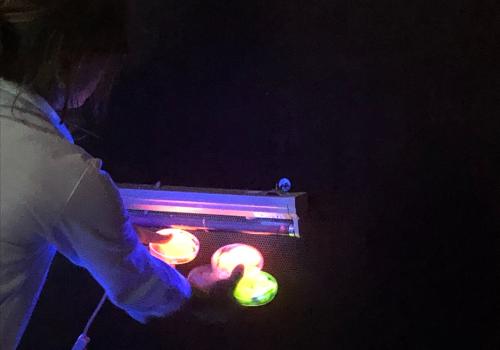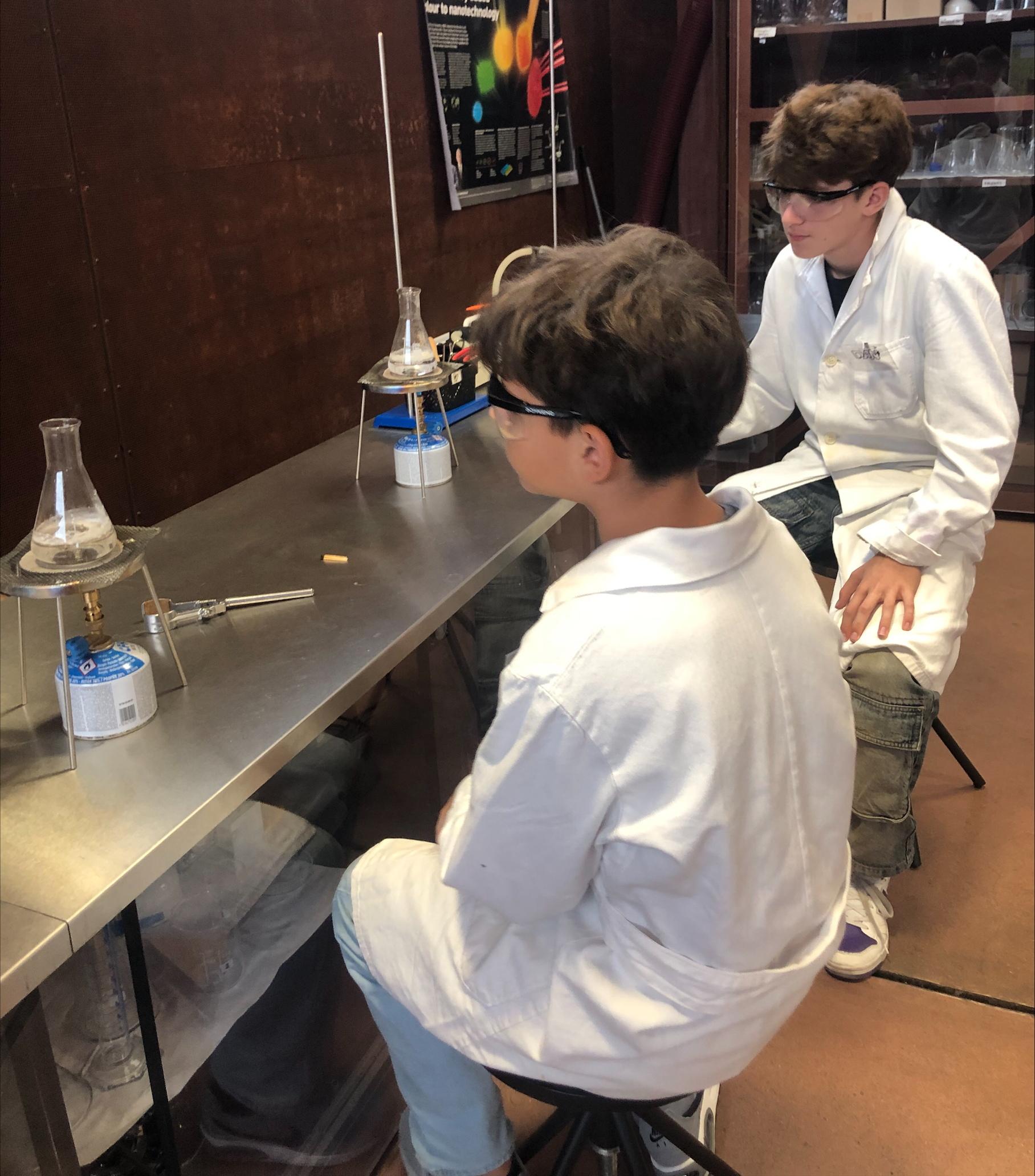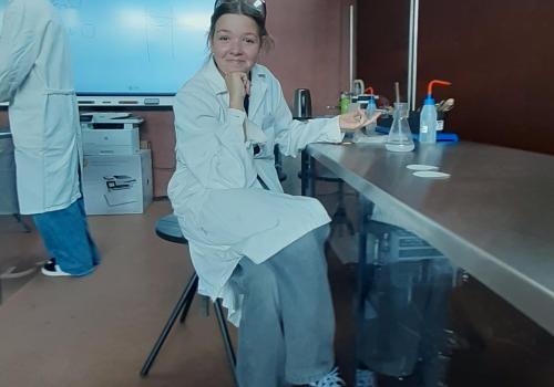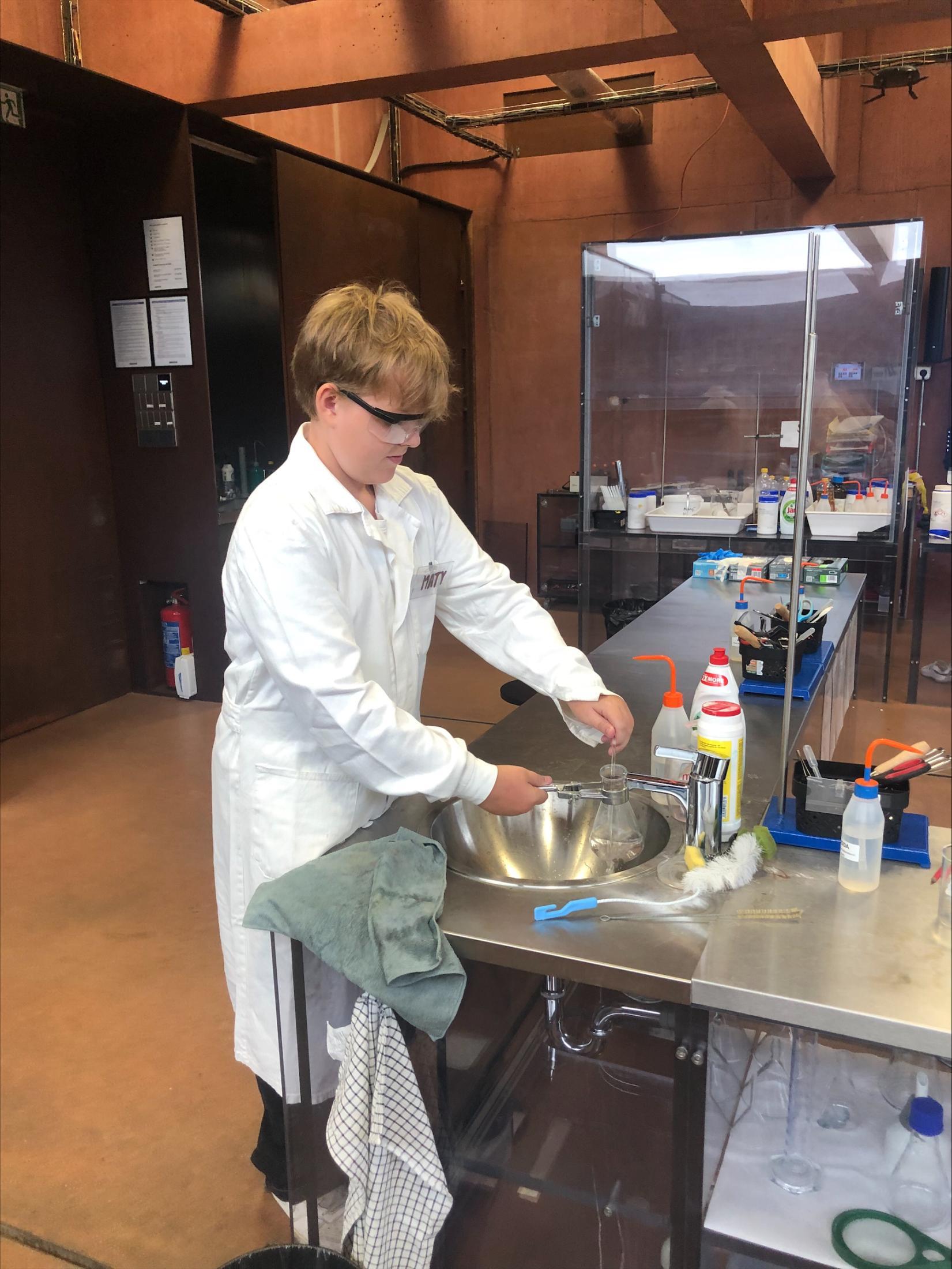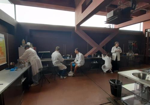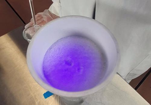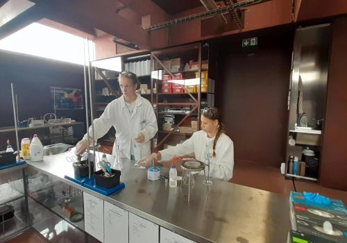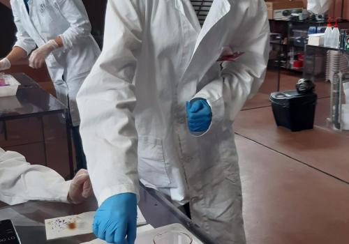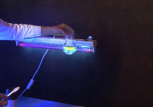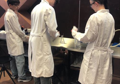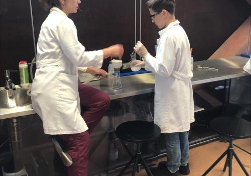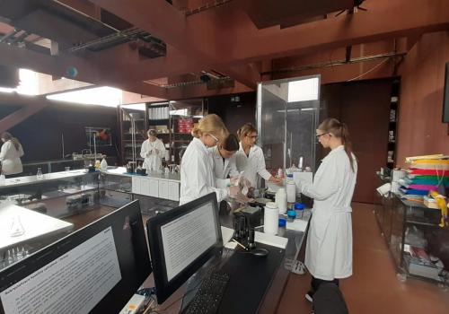 Čekala nás opravdová laboratorní práce – rušená krystalizace. Všichni si oblékli pláště, vzali brýle a rukavice. Připravili si laboratorní nádobí, odvážili kyselinu salicylovou a rozpustili ji ve vodě. Vzniklou suspenzi zahřívali do úplného rozpuštění. Z roztoku se ochlazením pod studenou vodou vyloučily malé krystaly, které jsme odsáli na Büchnerově nálevce filtrací za sníženého tlaku. Dozvěděli jsme se o fluorescenci a vyzkoušeli si práci s UV baterkou a UV lampou. Krásně nám svítily bílé pláště i připravené krystaly.