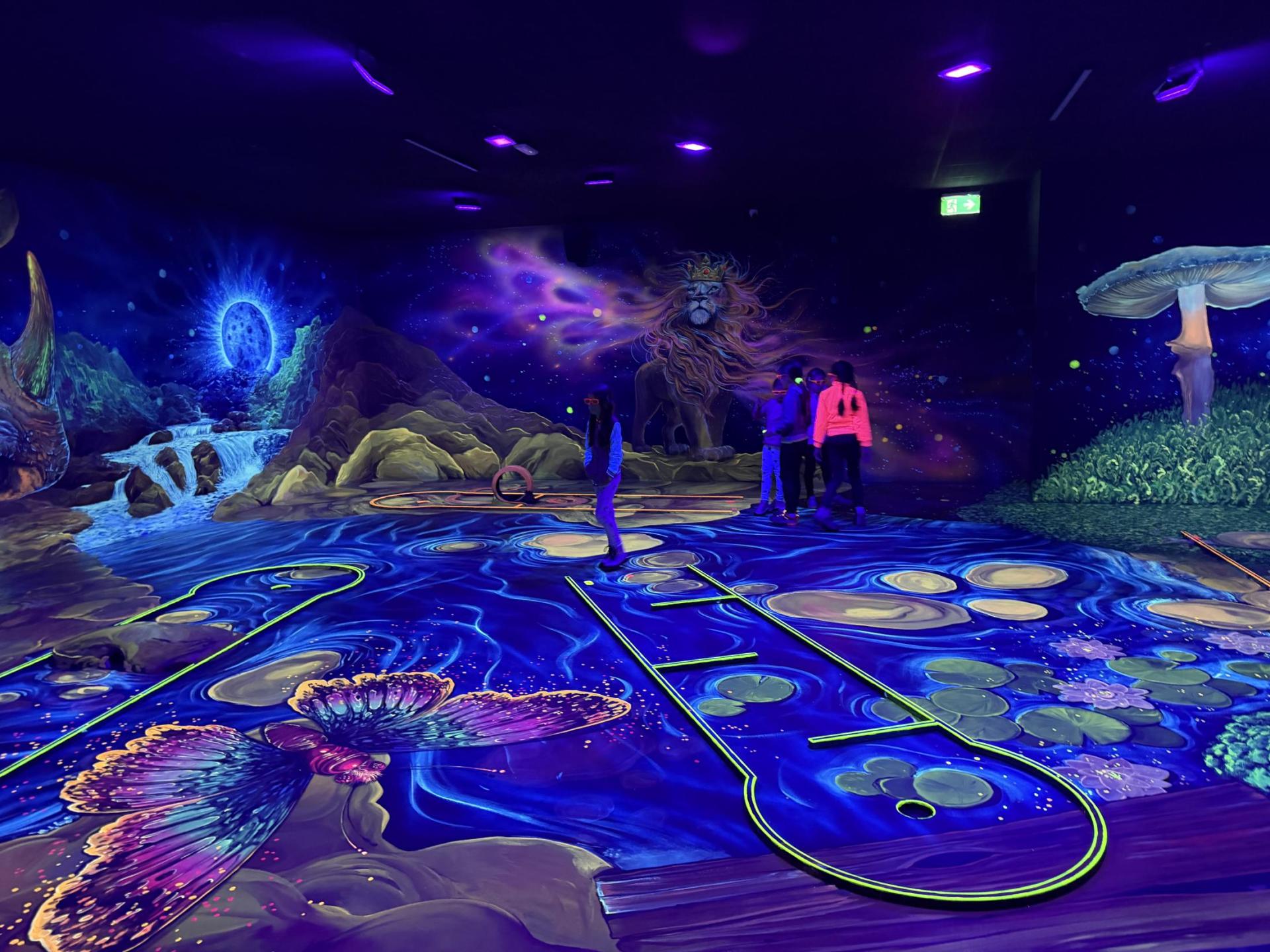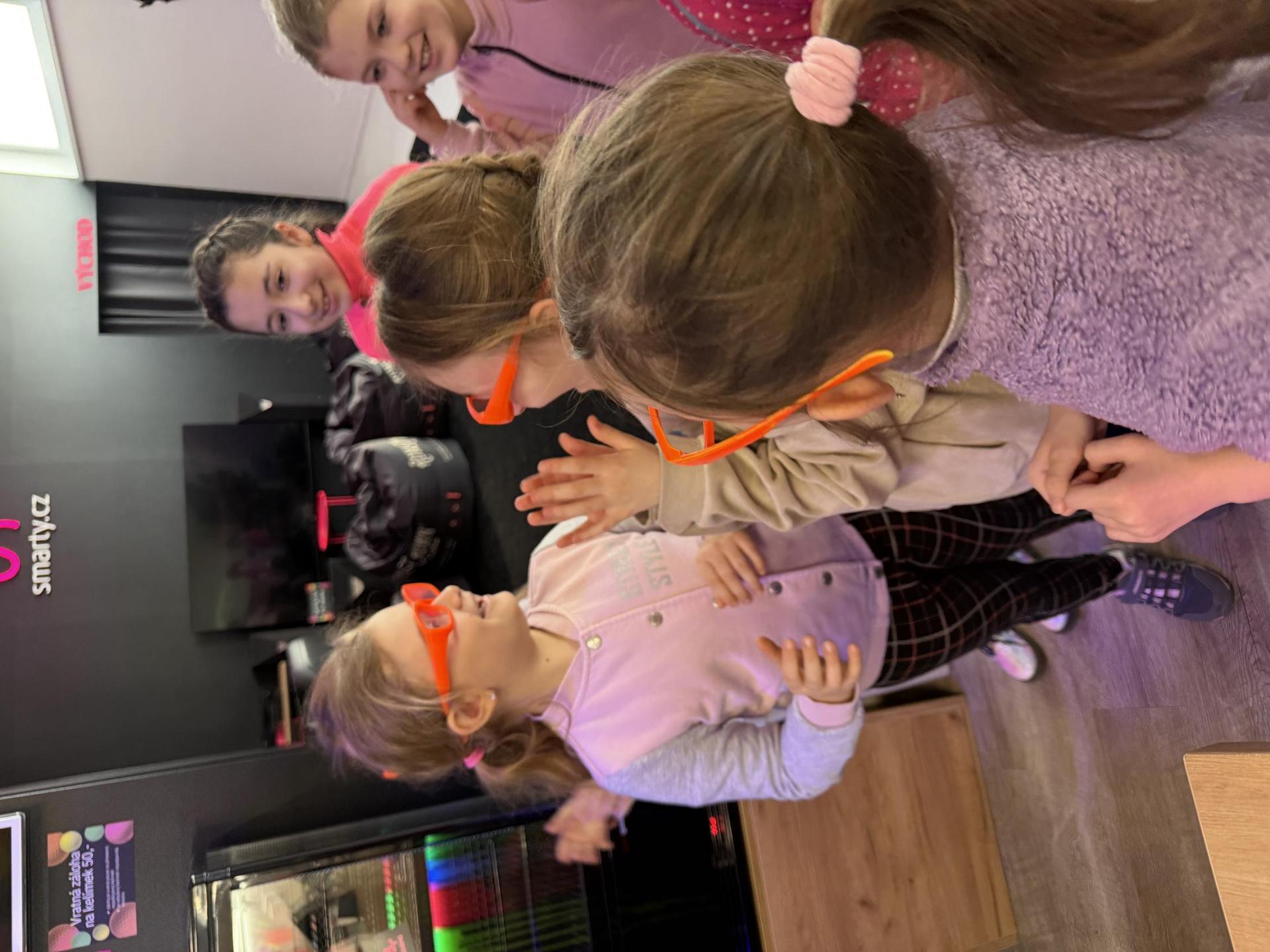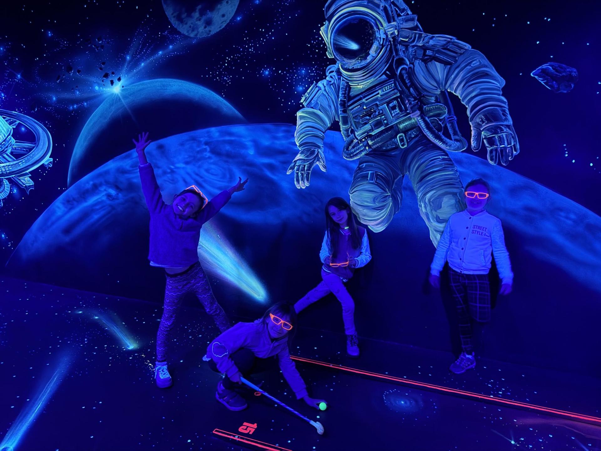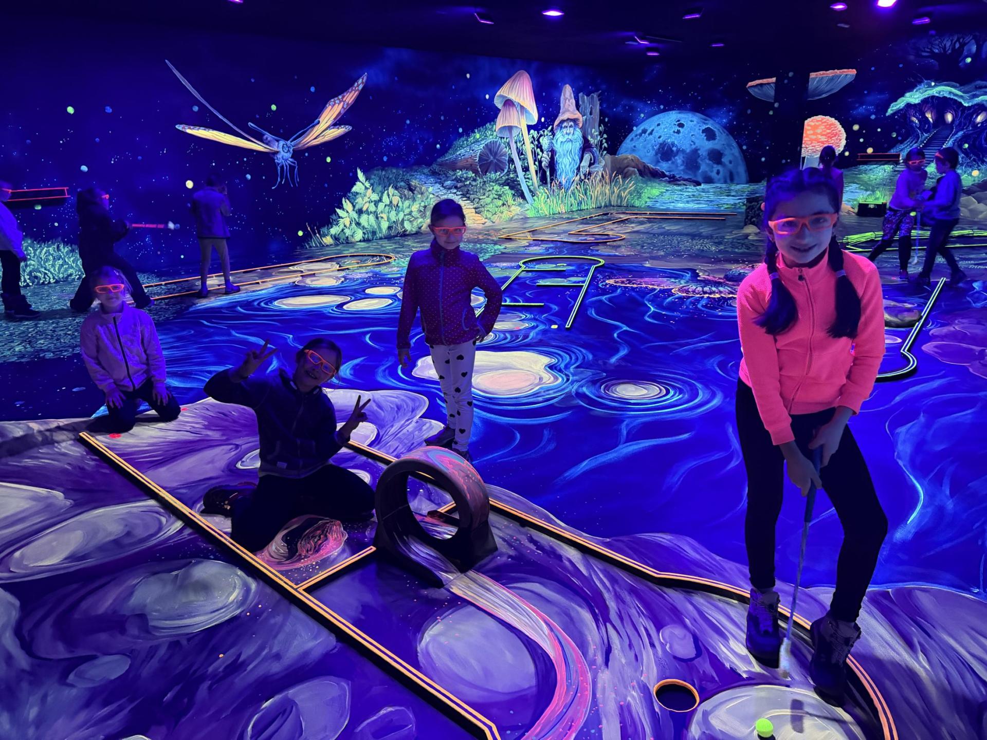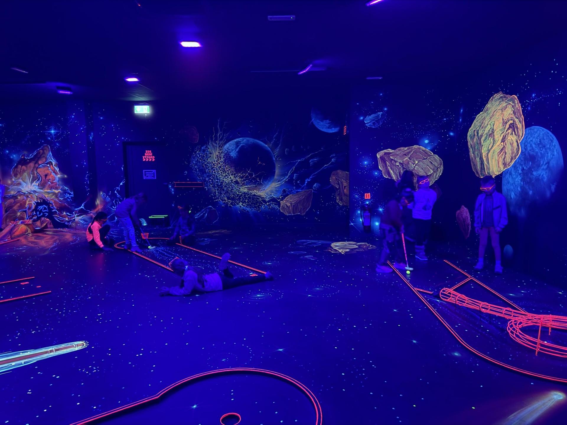 Vydali jsme se vlakem, projeli okružní jízdu Hradcem až jsme dorazili na 3D Black Light Minigolf.