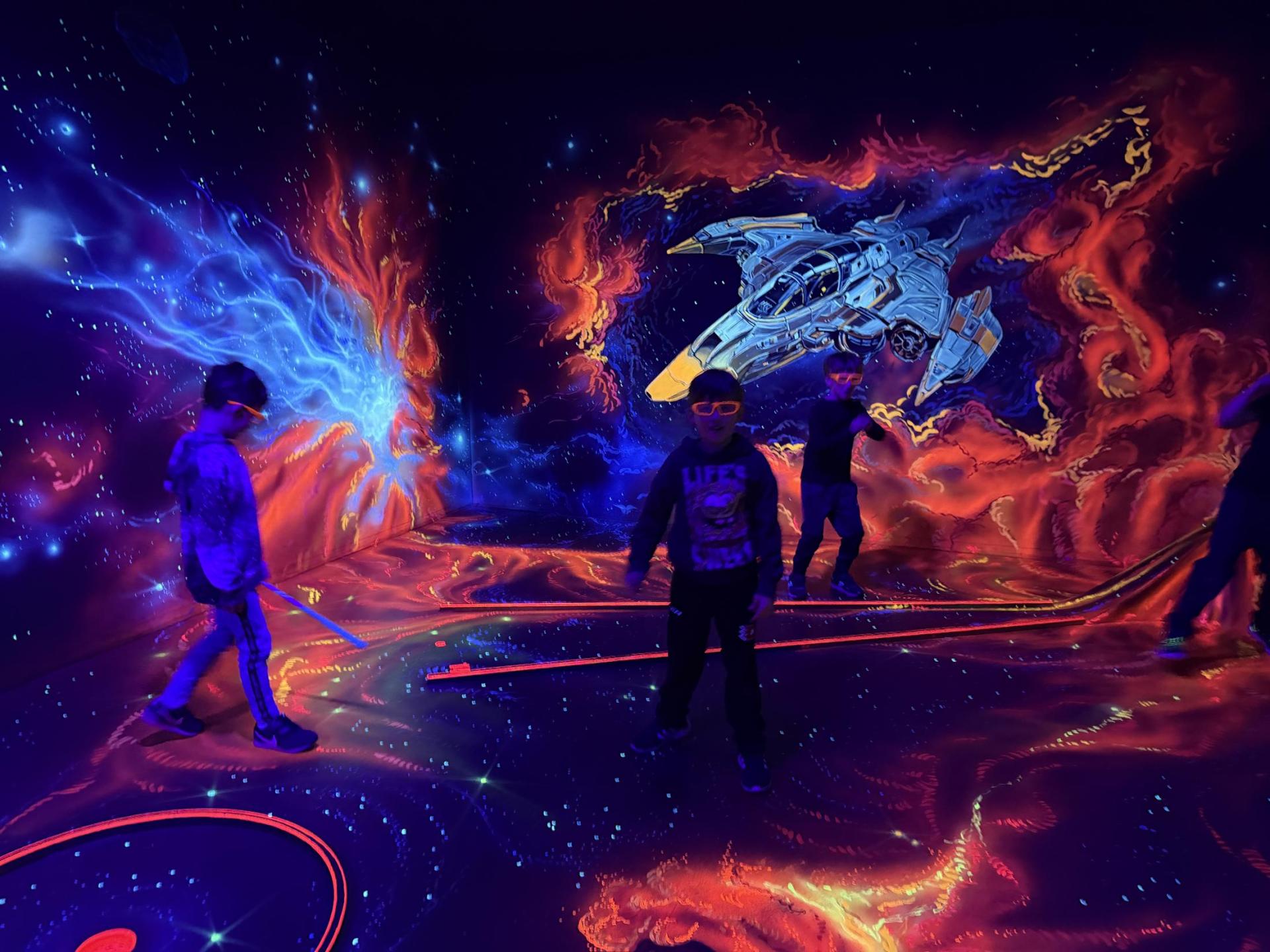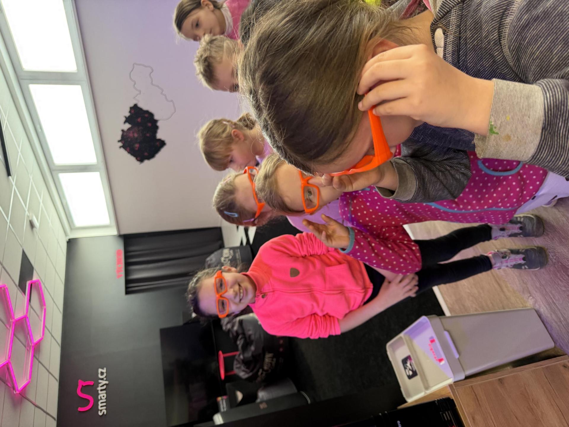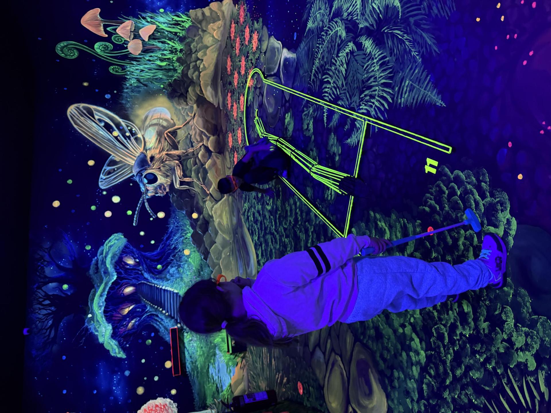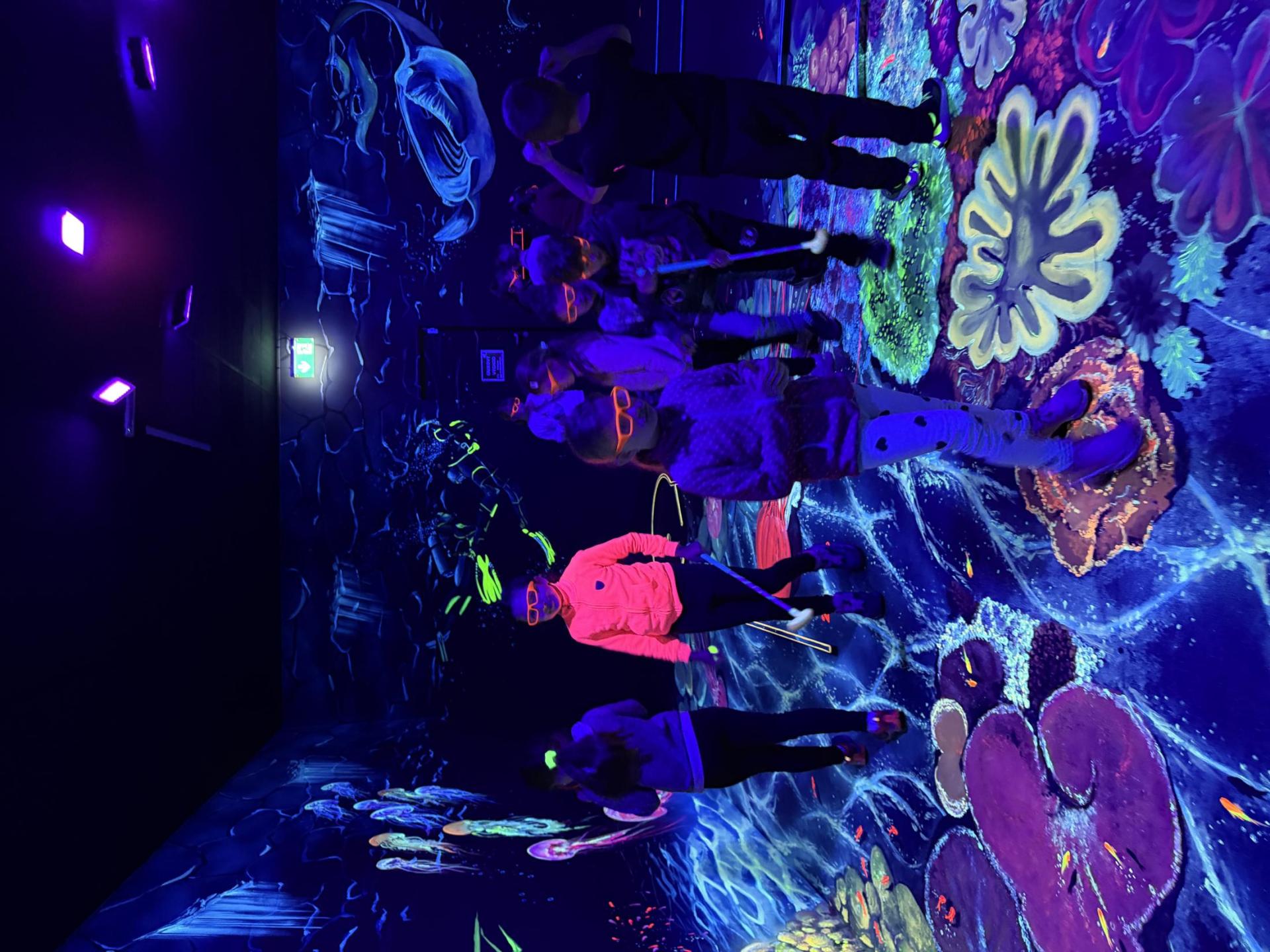 Vydali jsme se vlakem, projeli okružní jízdu Hradcem až jsme dorazili na 3D Black Light Minigolf.