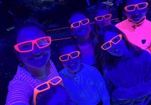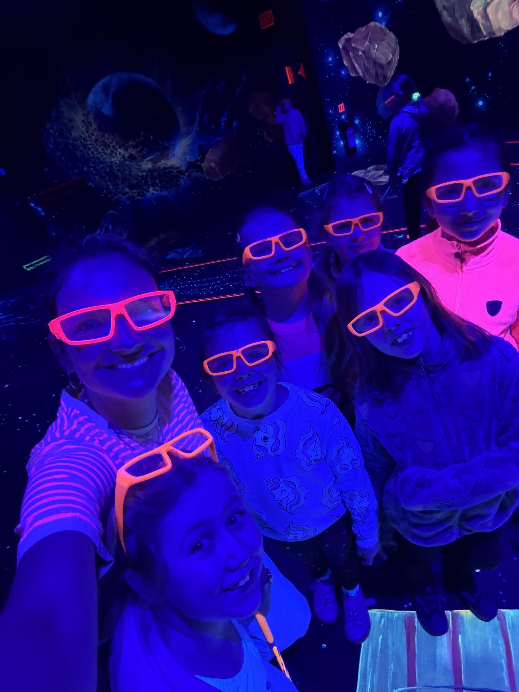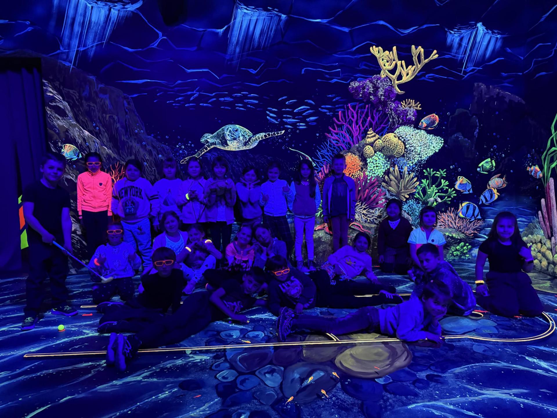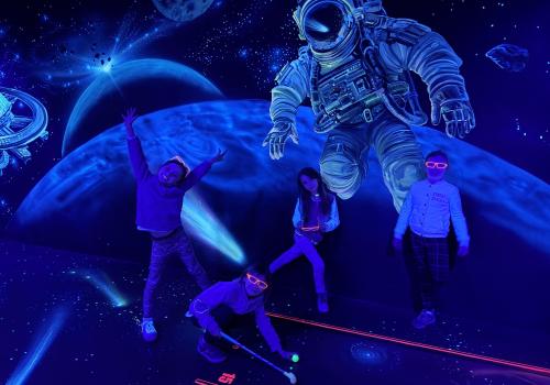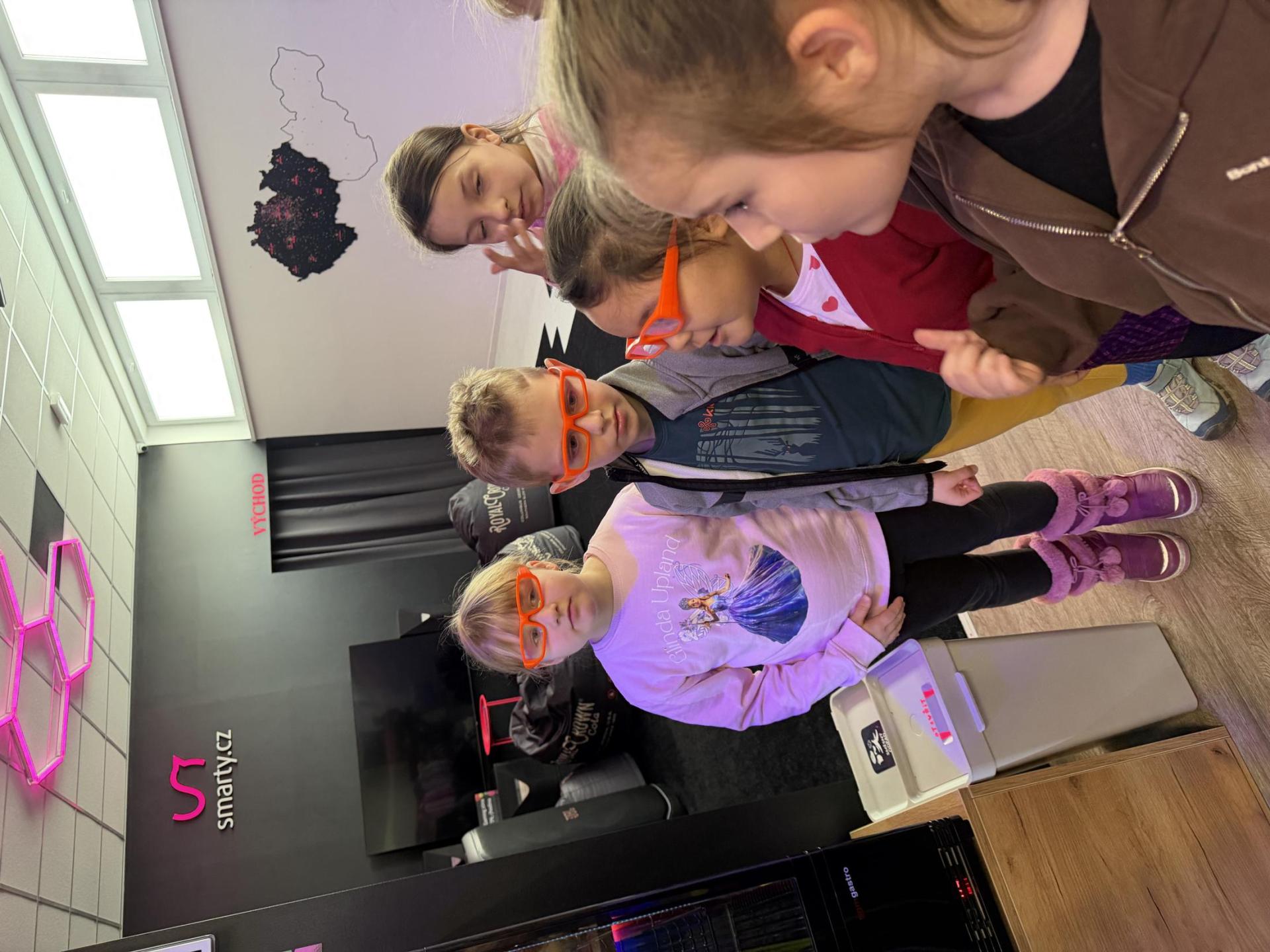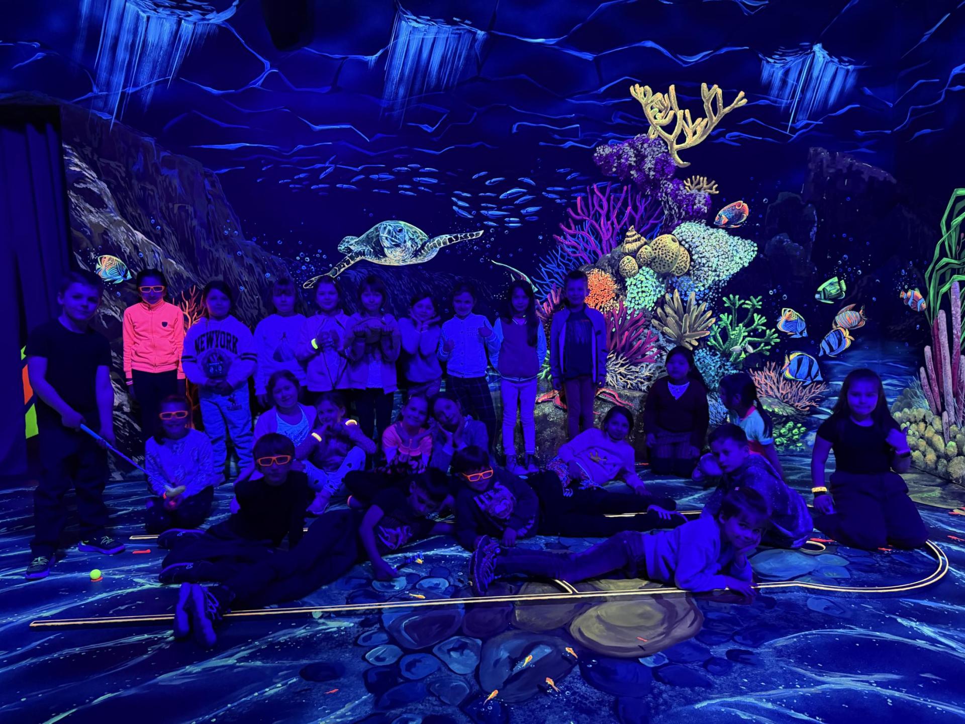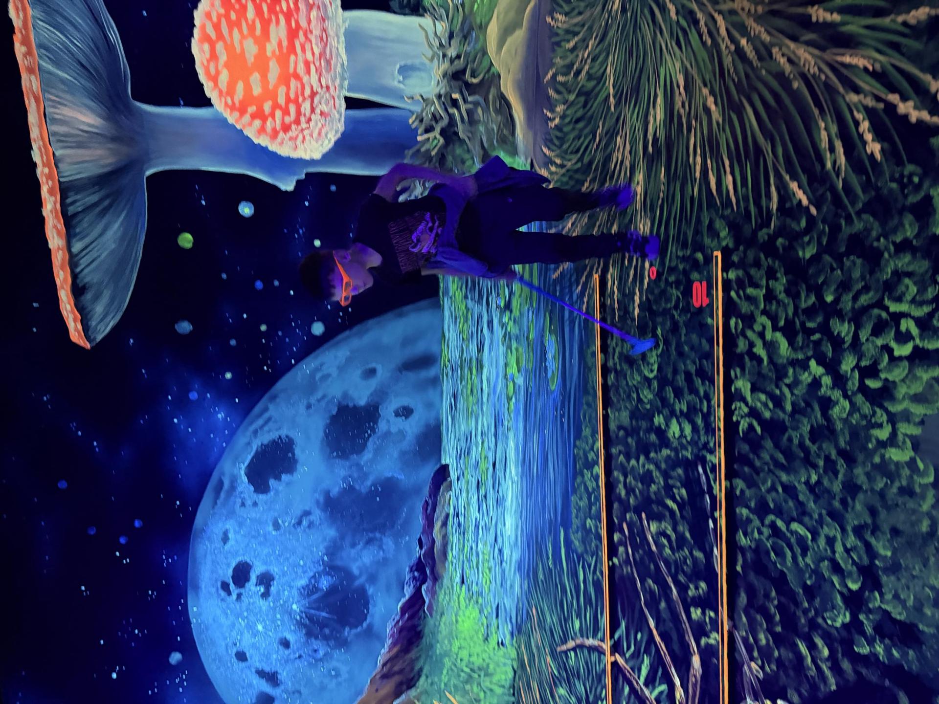 Vydali jsme se vlakem, projeli okružní jízdu Hradcem až jsme dorazili na 3D Black Light Minigolf.