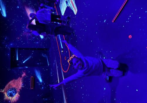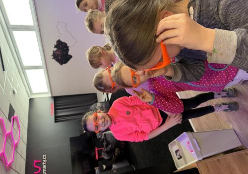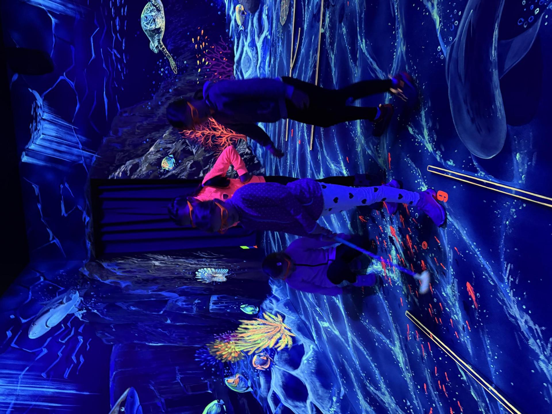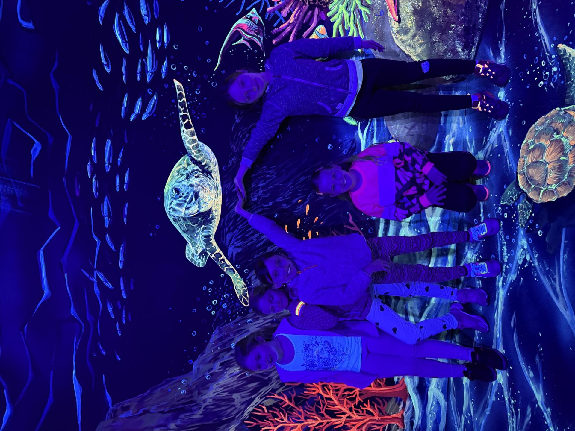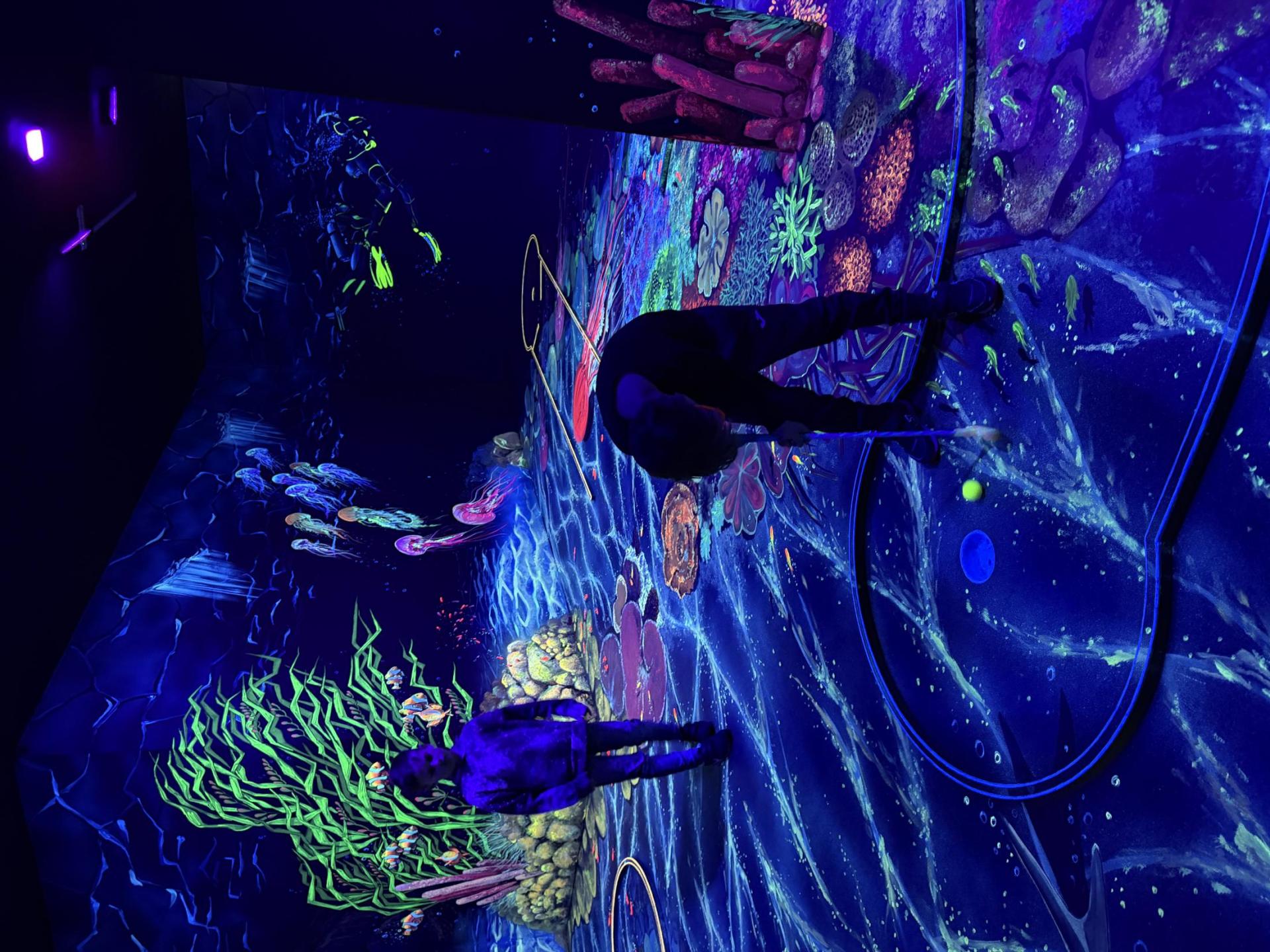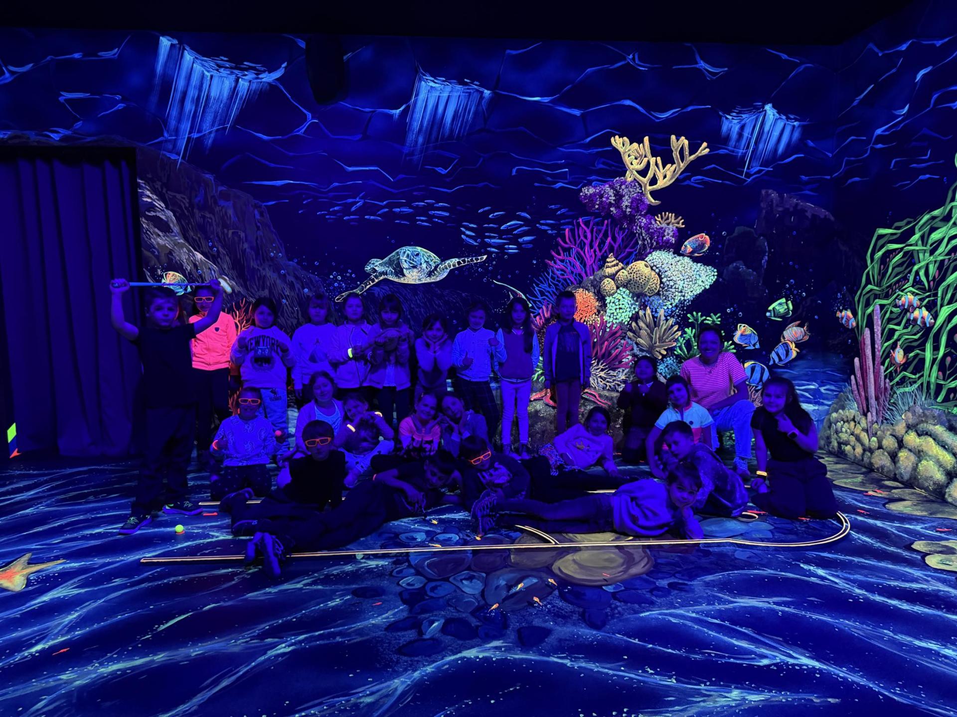 Vydali jsme se vlakem, projeli okružní jízdu Hradcem až jsme dorazili na 3D Black Light Minigolf.