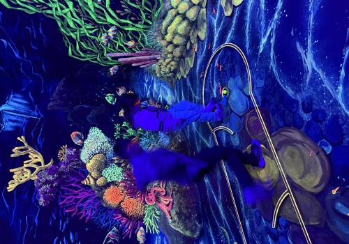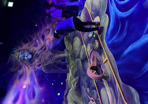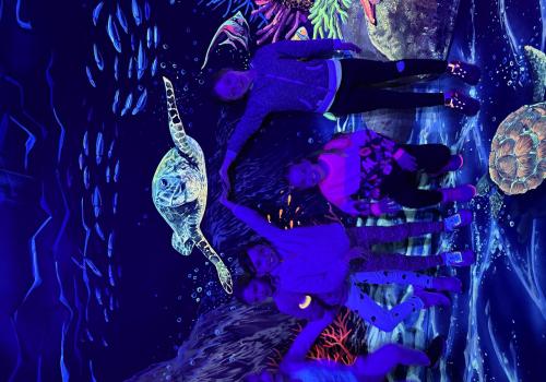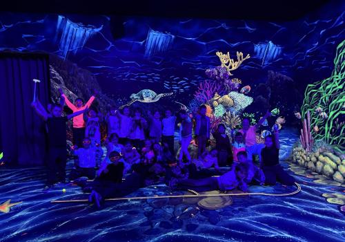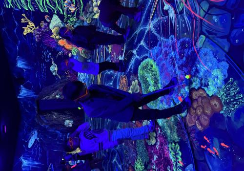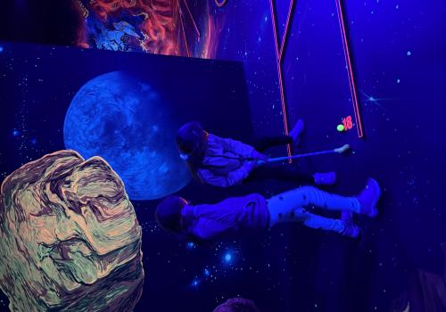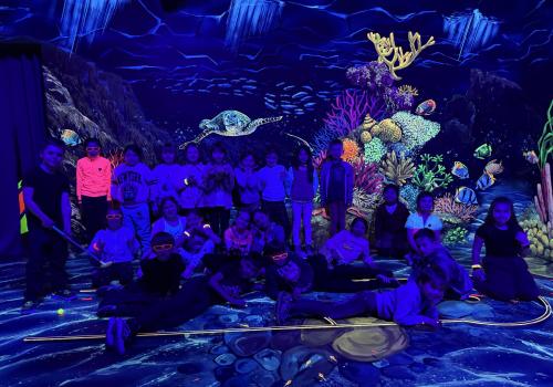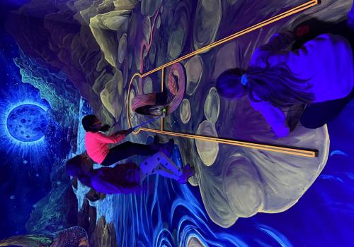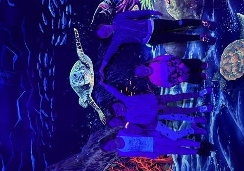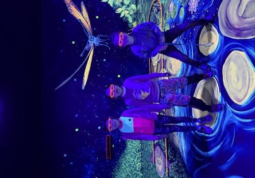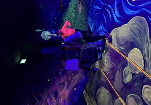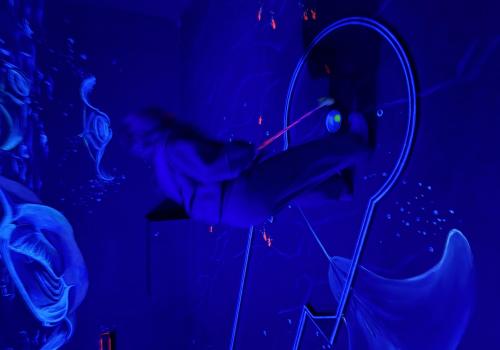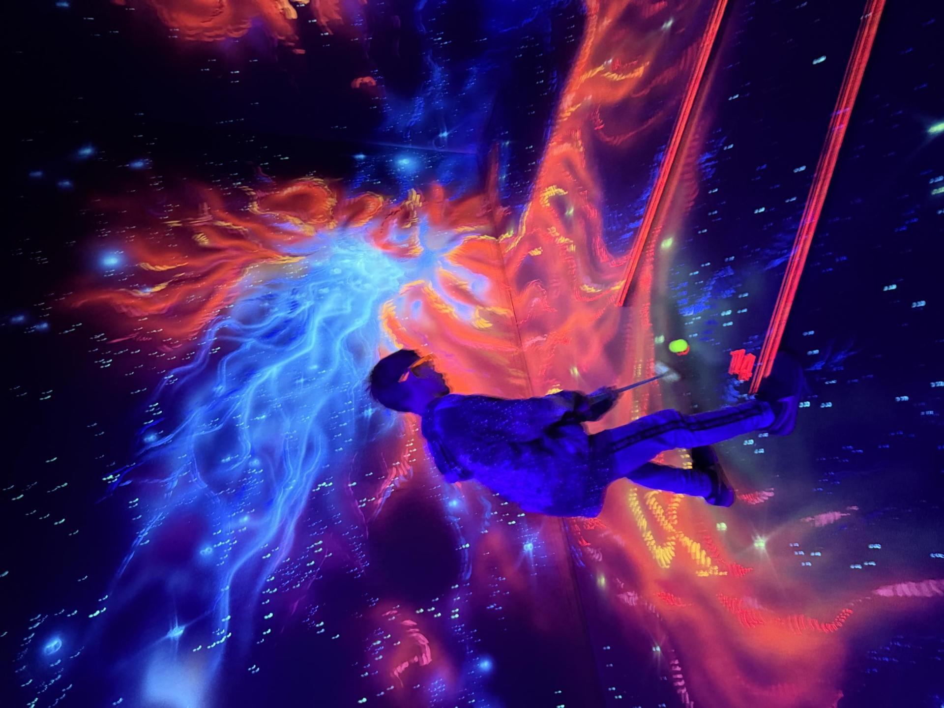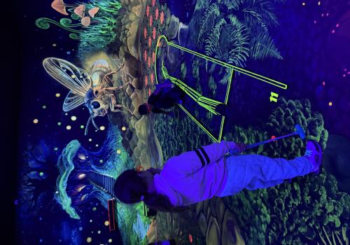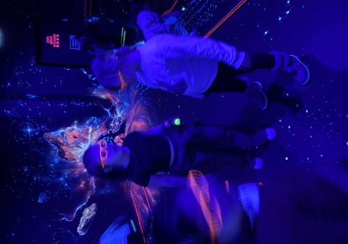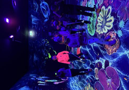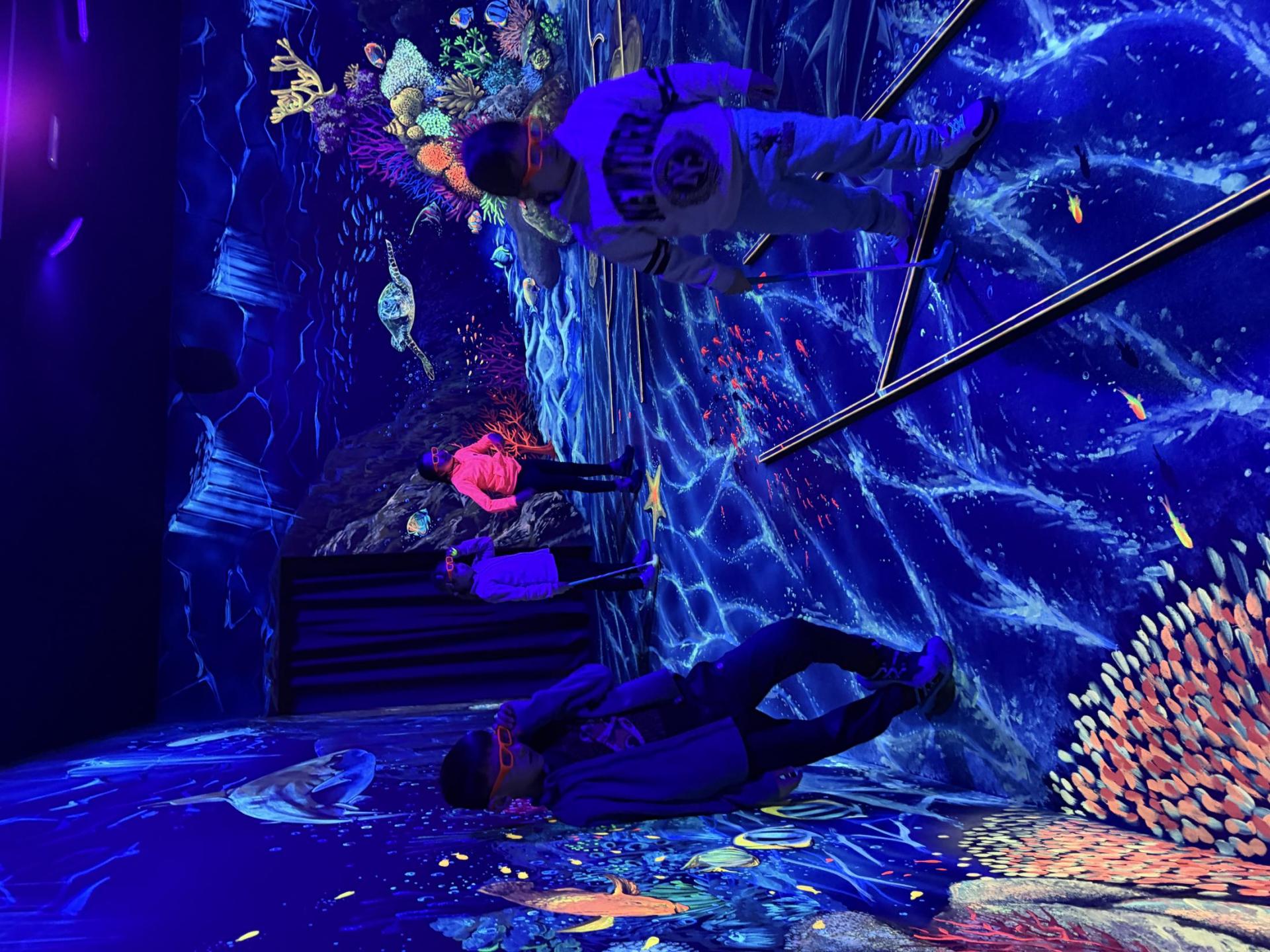 Vydali jsme se vlakem, projeli okružní jízdu Hradcem až jsme dorazili na 3D Black Light Minigolf.