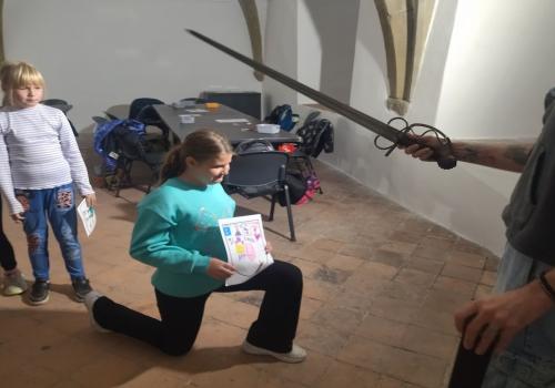 V rámci dějepisného učiva o středověku jsme navštívili pardubický zámek. Prohlédli jsme si rytířský sál, dozvěděli se zajímavé informace o erbech a co je heraldika. Také nás zaujaly historické události z rodu Pernštejnů. Skládali jsme erby s podobiznami osobností rodu Pernštejnů, zkoumali malby v rytířském sále. Tvořit vlastní erb nás bavilo. Závěrem programu jsme byli pasování na rytíře. Program byl akční, zajímavý a vedený zábavnou formou.