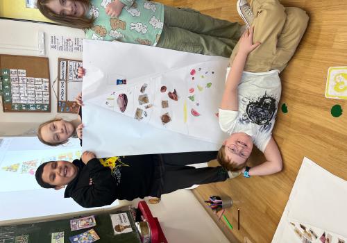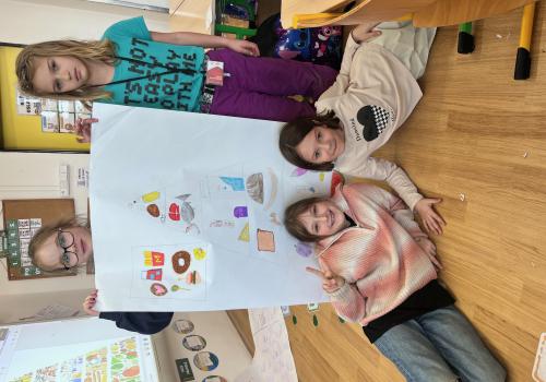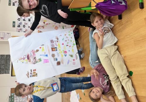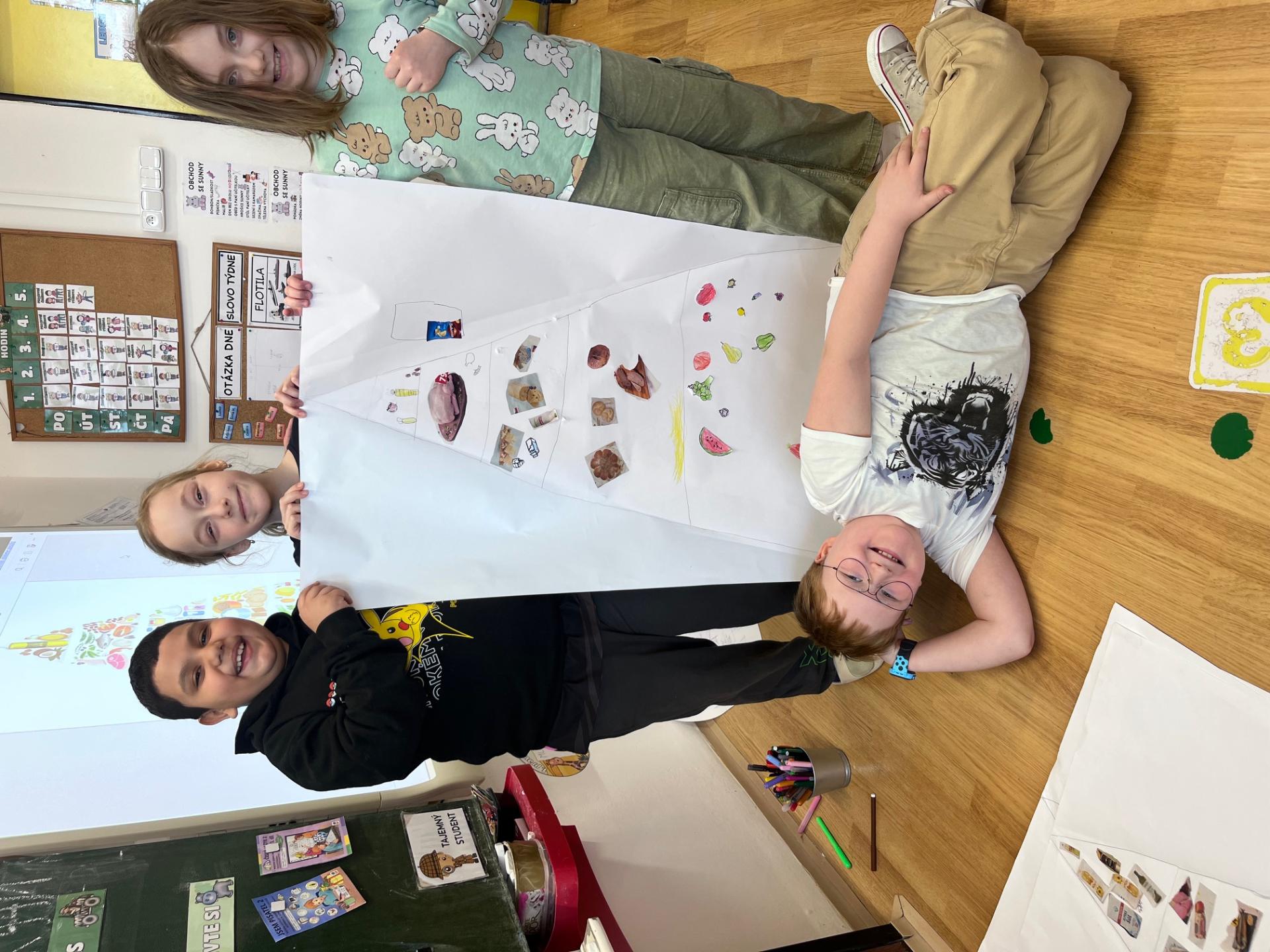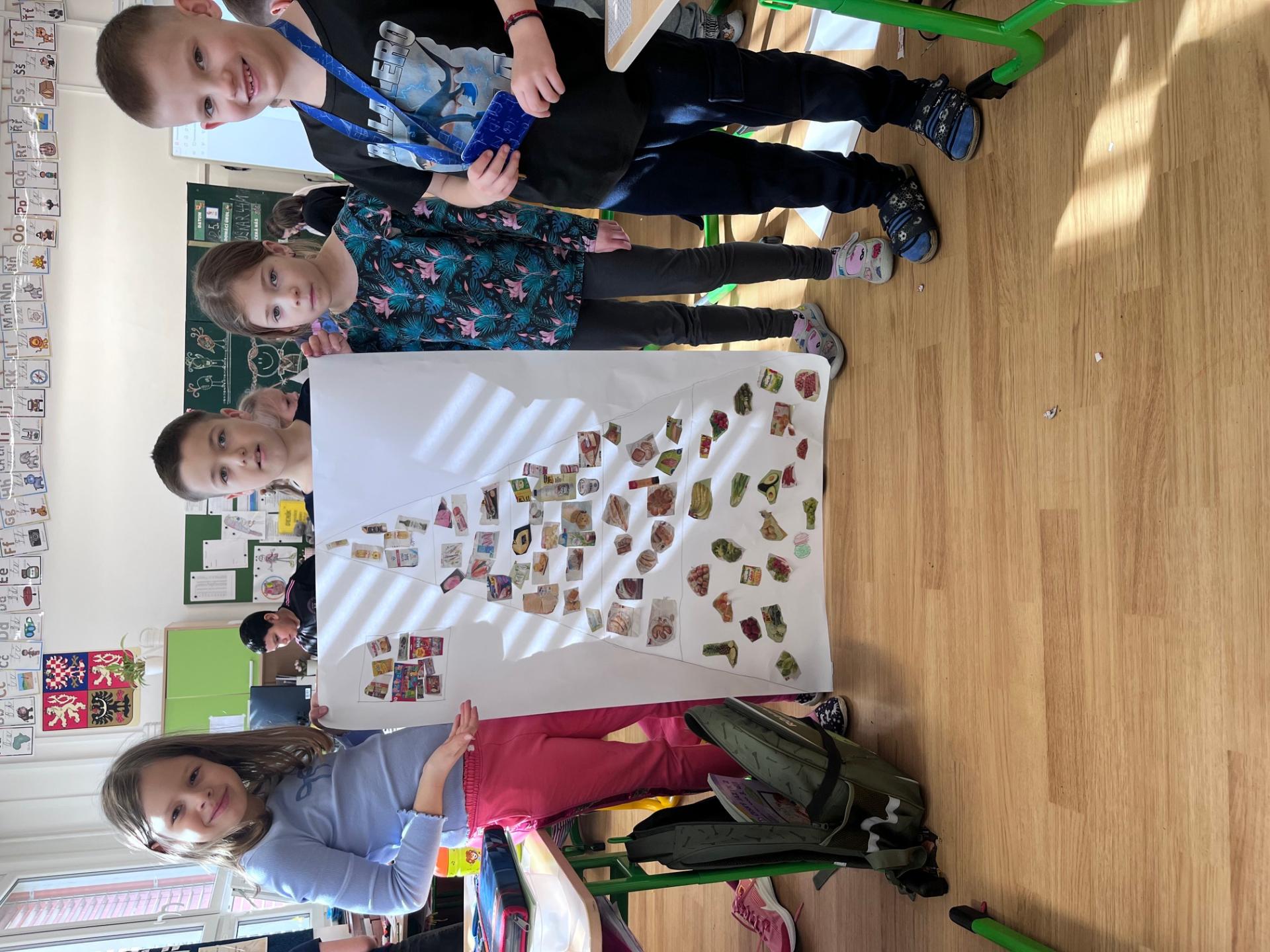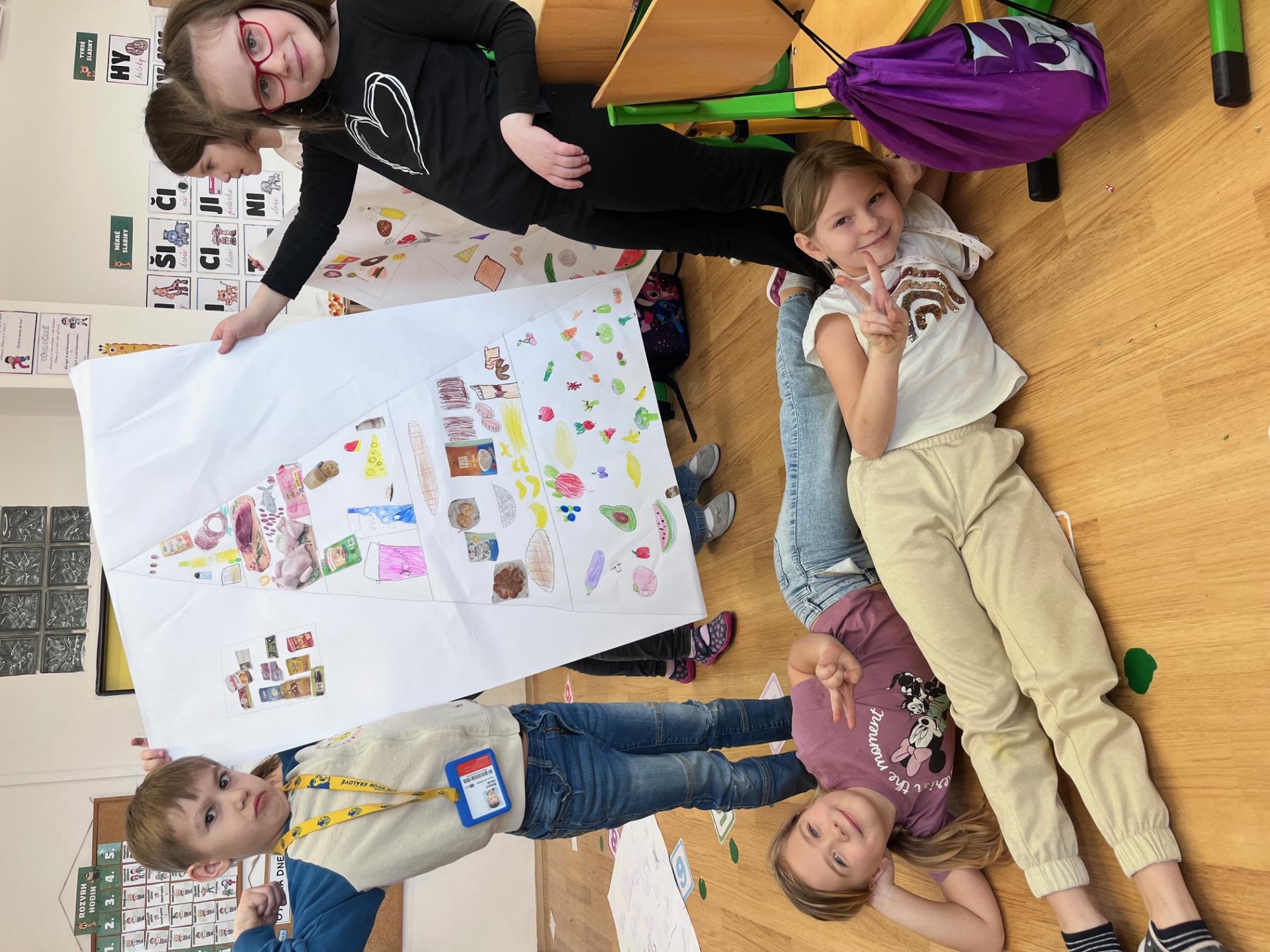 Nejprve jsme se inspirovali zdravými svačinkami a povídali si o tom, co našemu tělu prospívá. V TV jsme si dali pořádně do těla, uběhli jsme několik kilometrů a všichni si zaslouží velkou pochvalu za snahu a vytrvalost. Navíc jsme díky tomu získali další body do našeho virtuálního běhu. Ve skupinách pak děti tvořily výživovou pyramidu. Spolupracovaly a výsledné práce se všem moc povedly.