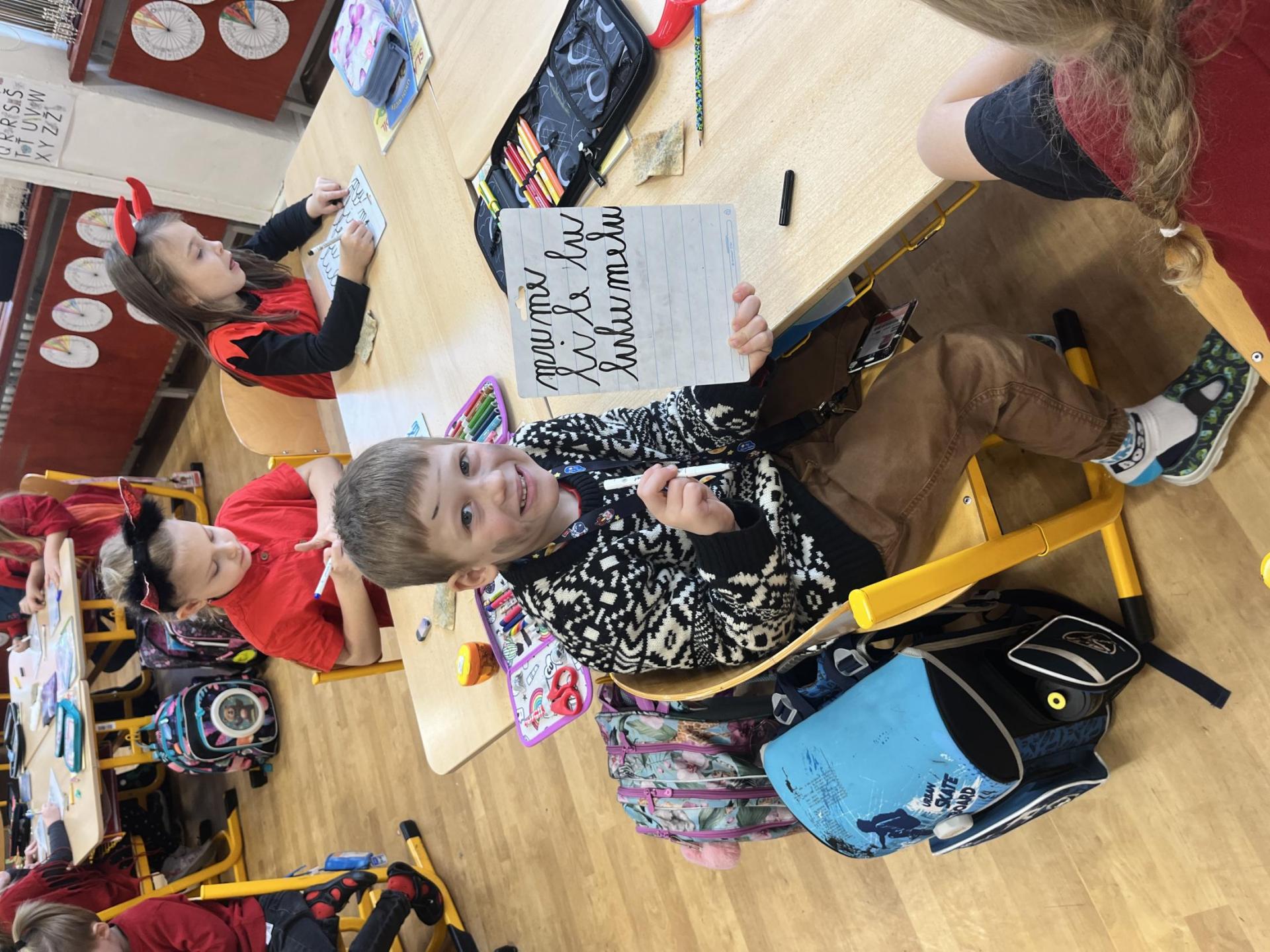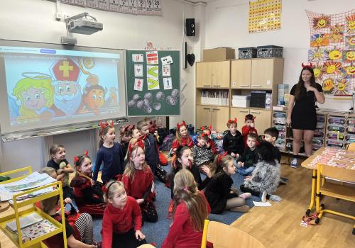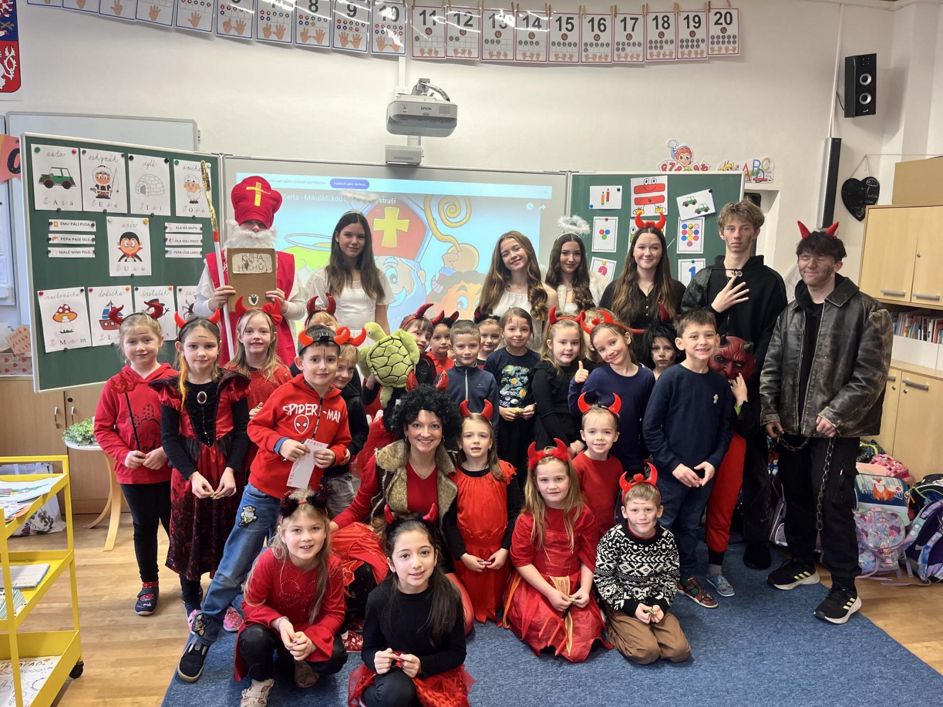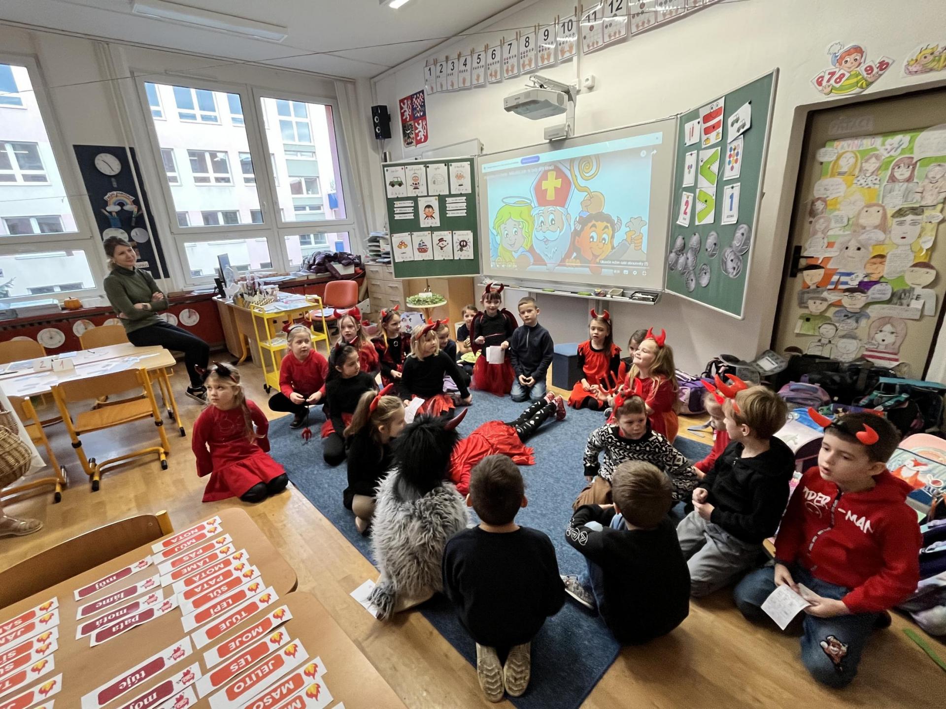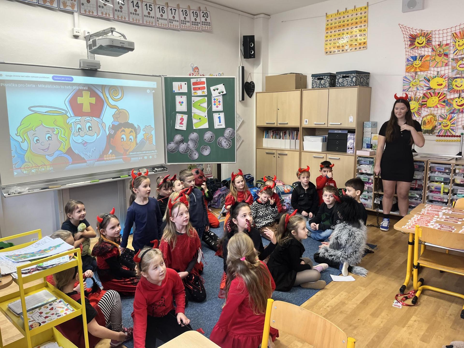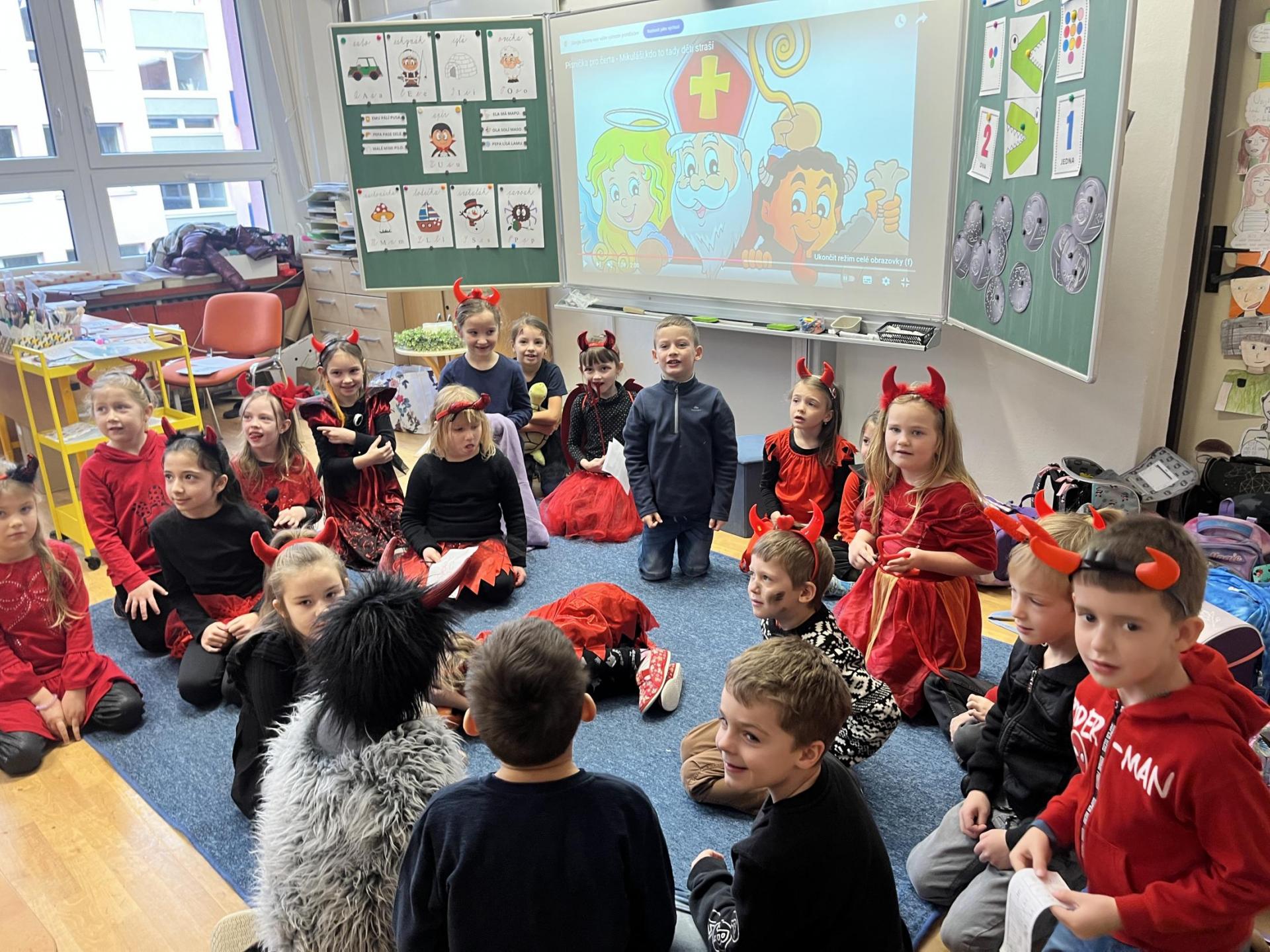 Potom jsme si povídali o tom, za co by si nás mohl odnést čert. Nakonec jsme se ale domluvili na tom, co musíme zlepšit. Řekli jsme si básničky, zazpívali písničky, naučili se Rohy, kožichy a najednou nás navštívil Mikuláš, čerti a andílci. Dostali jsme malou sladkost, někdo se šel přiznat s malým zlobeníčkem. Šla dokonce i naše paní učitelka a dostala stejně jako někteří černou čárku na tvář. Všichni jsme také dostali nového Matýska, abychom mohli počítat do 10.