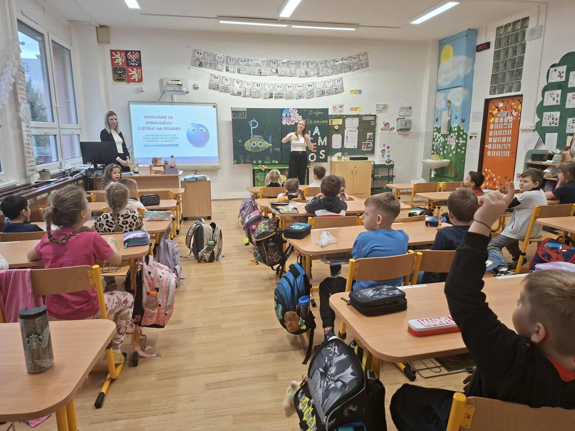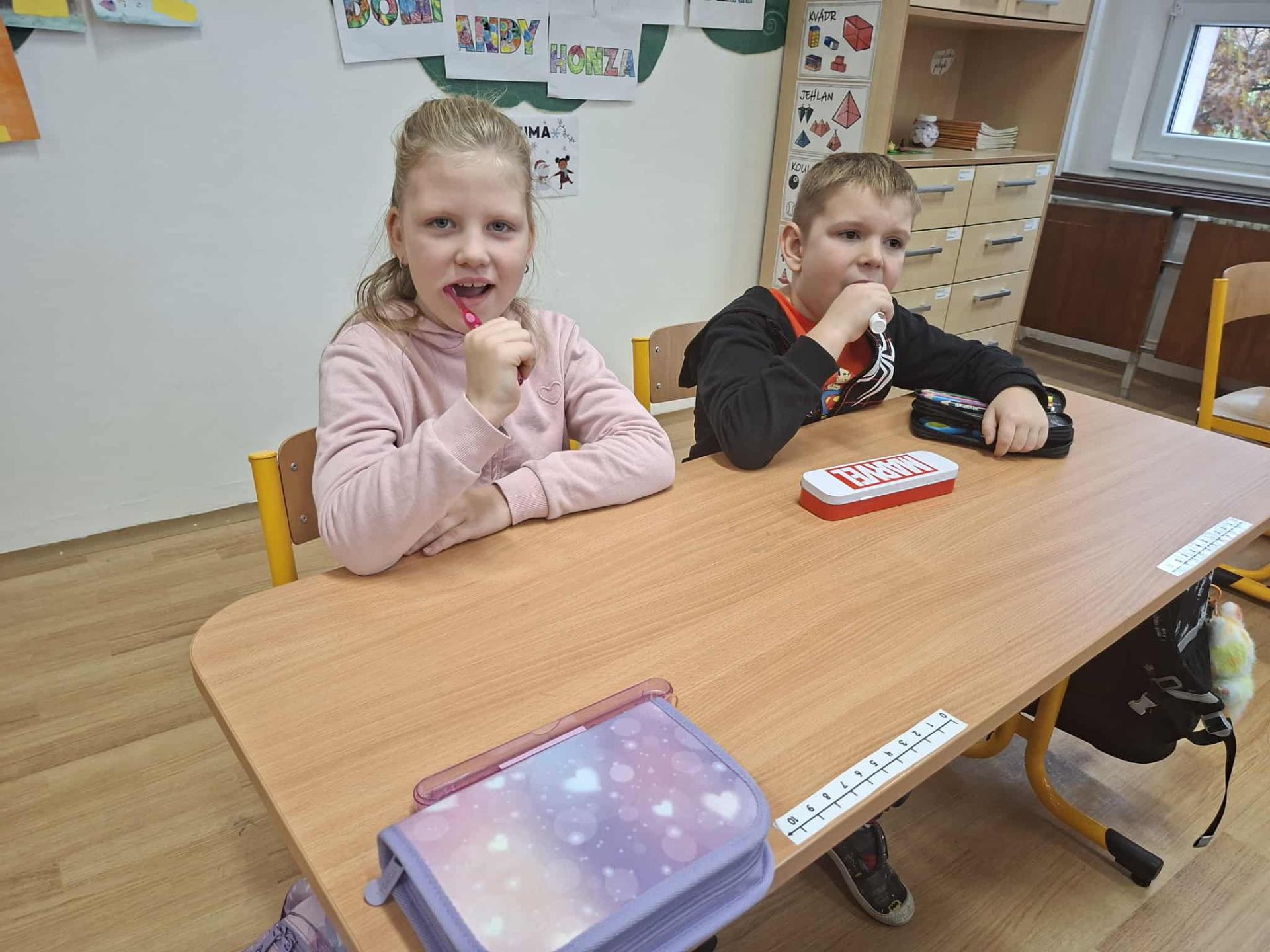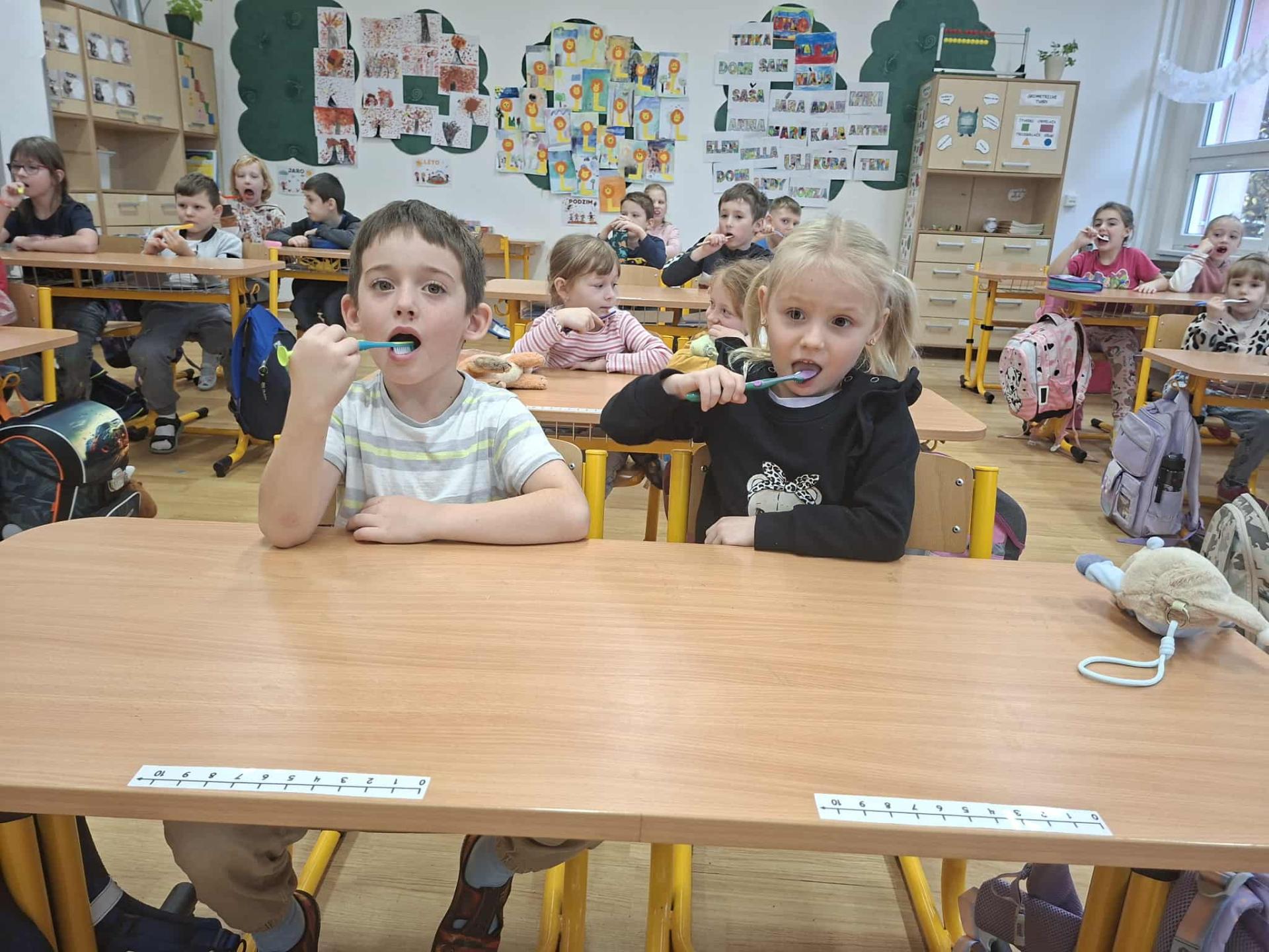 Dnes u nás ve třídě proběhla beseda na téma dentální prevence. Děti se dozvěděly, jak zub vypadá, jak se správně o zuby starat, jak by měl vypadat kartáček a jaké druhy kartáčků máme. V neposlední řadě měly možnost vyzkoušet si indikátor plaku a zjistit, jestli mají zoubky vyčištěné správně. Besedu jsme si moc užili!