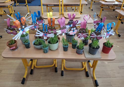 Kromě barevného oblečení jsme se poctivě starali o naše velikonoční osení. Každý den jsme kontrolovali, jak se zeleným stéblům daří, a poctivě zalévali, aby nám do svátků krásně vyrostlo.