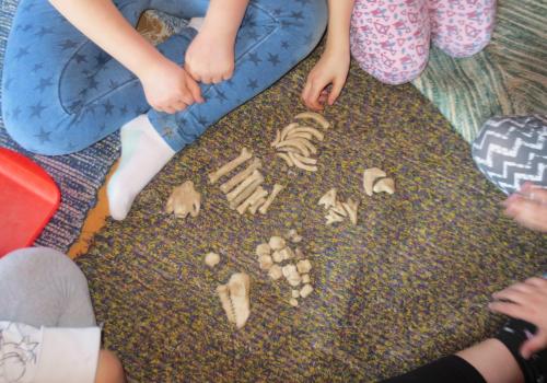 V úterý jsme putovali do pravěku... Děti si vyzkoušely práci archeologů. Na chvíli se staly paleontology a pomocí speciálních pomůcek a metod se vydaly na překvapující výlet do minulosti planety. Odkryly kostru pravěkého tvora a pokusily se ji prezentovat v imaginárním muzeu.