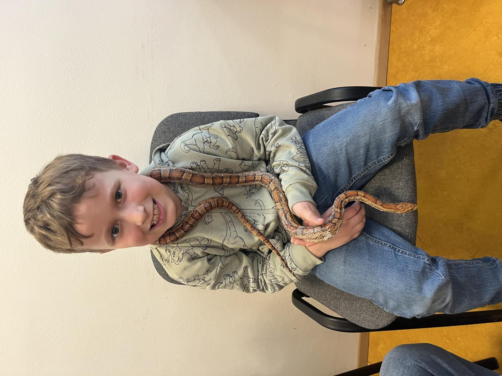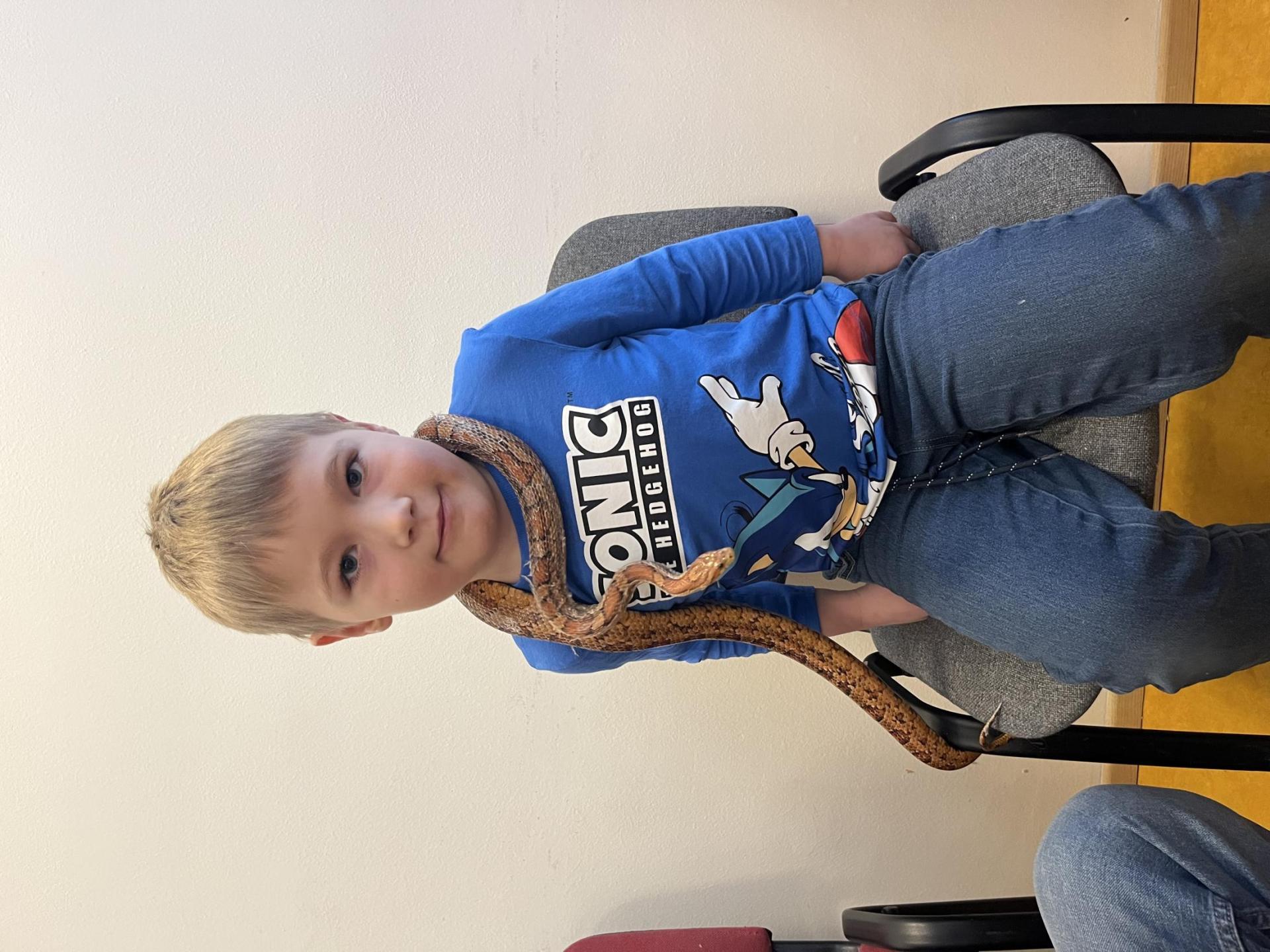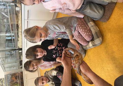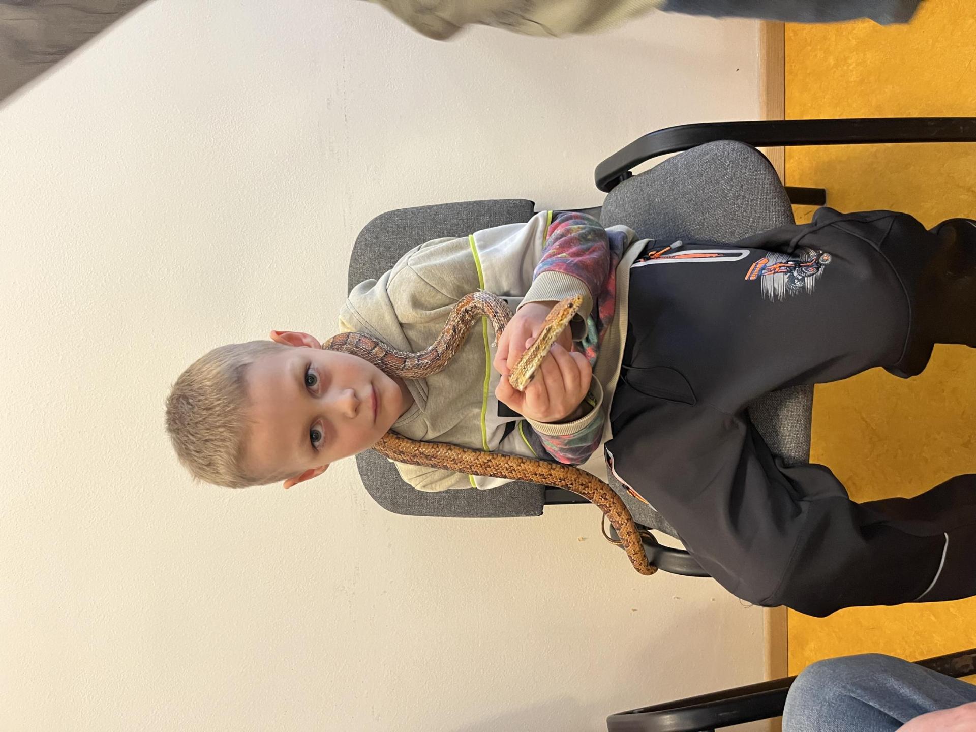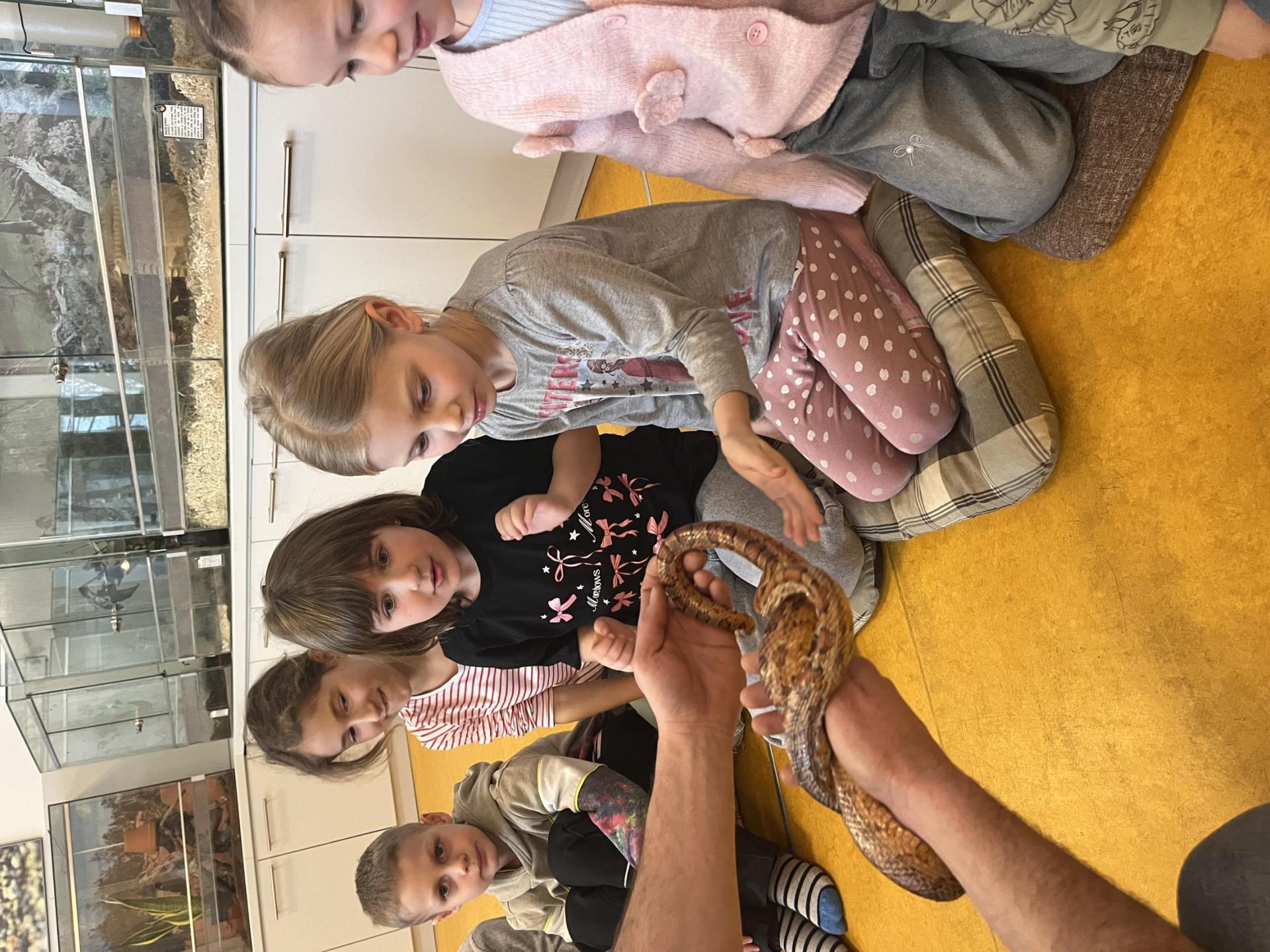 Obdiv si také získala užovka. Některé odvážné děti si ji dokonce mohly dát kolem krku a pozorovat ji z bezprostřední blízkosti. Během programu jsme si také vyzkoušeli poznávání zvířat hmatem – například jsme sahali na suchou hadí kůži nebo na krunýř želvy.