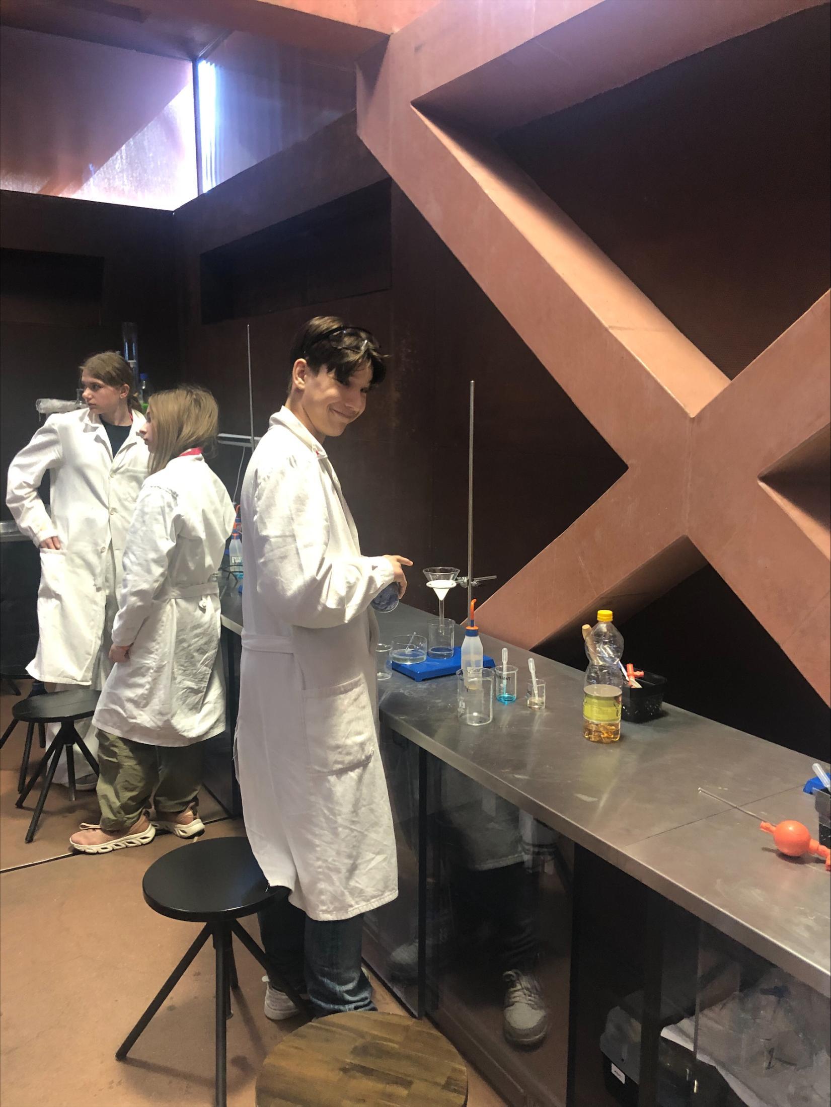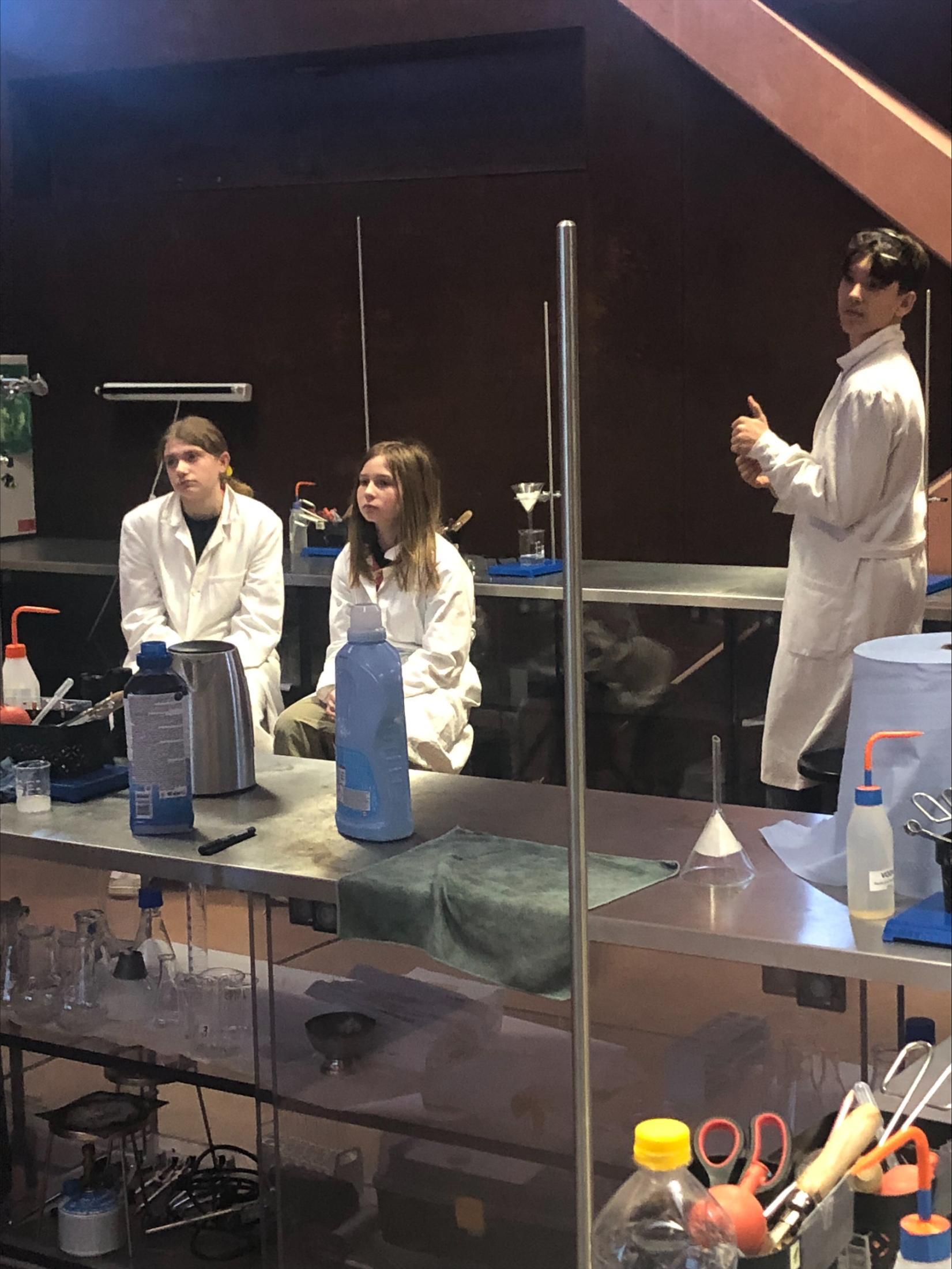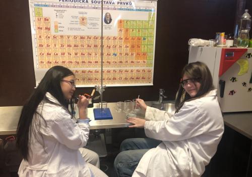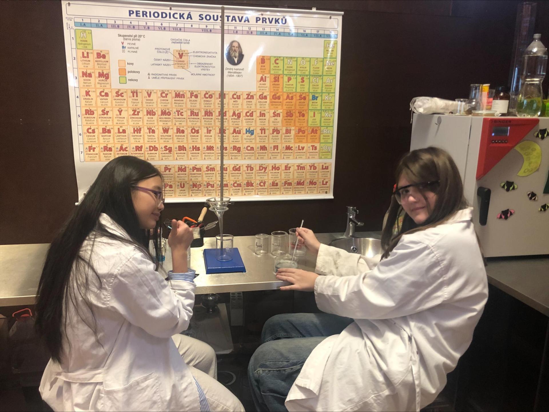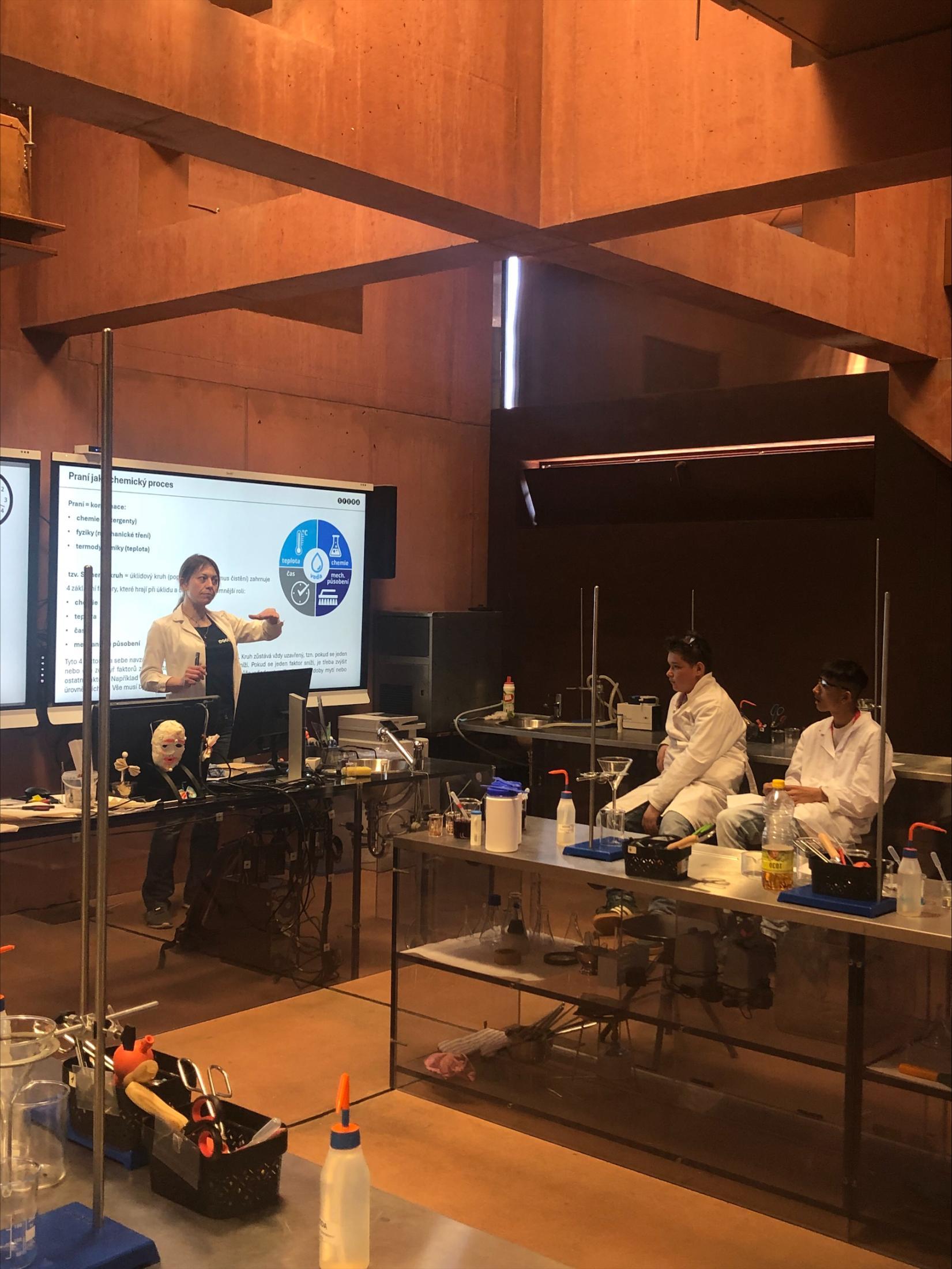 Dostali jsme 3 kousky látky, na které se daly kapky oleje, výluhu z červeného zelí a sypké kakao. Vše se „pralo“ v připravených roztocích. Nejčistší byla látka ze zásaditého, nejhůře dopadl kyselý roztok. Nakonec jsme si prohlédli zbylé roztoky po praní – plavala v nich textilní vlákna.