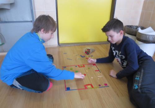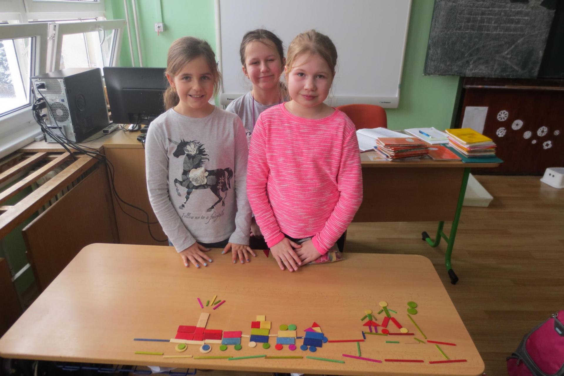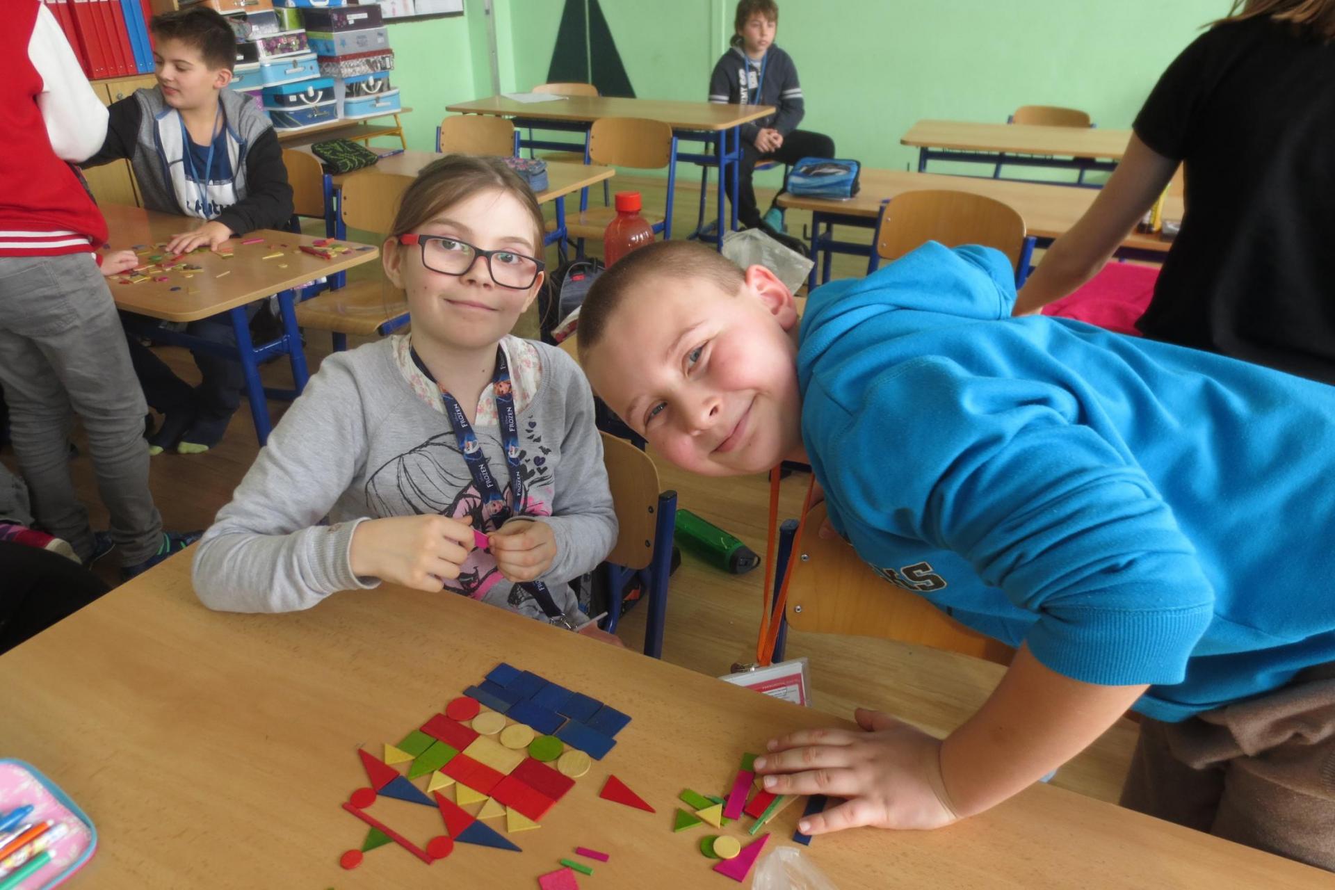 Při tvořivých činnostech děti skládaly. Zapojily fantazili a vytvořily obrázky z geometrických tvarů. Pracovat ve skupinkách je baví