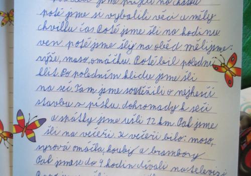 Úterní ráno jsme začali rozcvičkou. Po snídani jsme napsali pohledy a šli do lesa, kde byly pro děti připravené soutěže (hledání lístečků ve skupinách, hod šiškou na cíl).