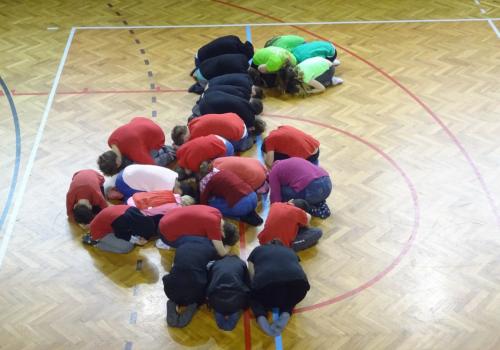 Rozdělili jsme si příslušné barvy, oblékli se do červeného, černého nebo zeleného trička a hurá do tělocvičny.