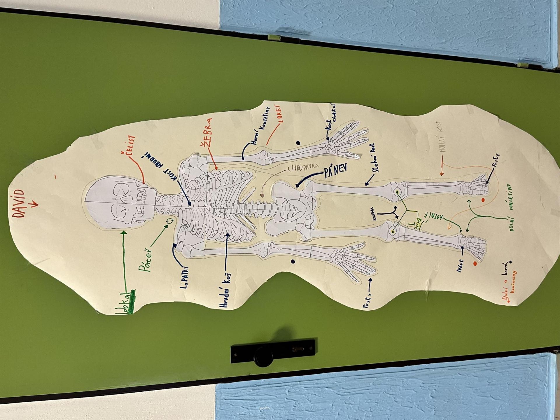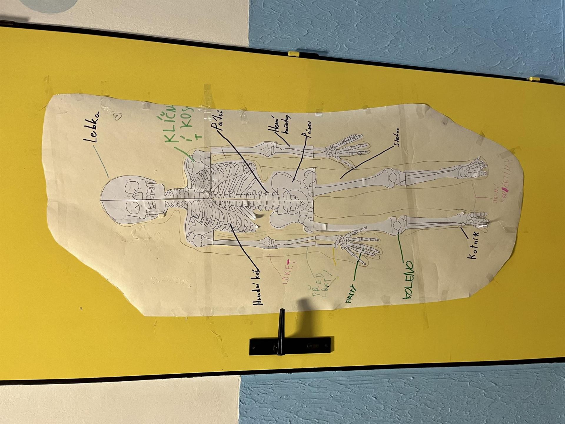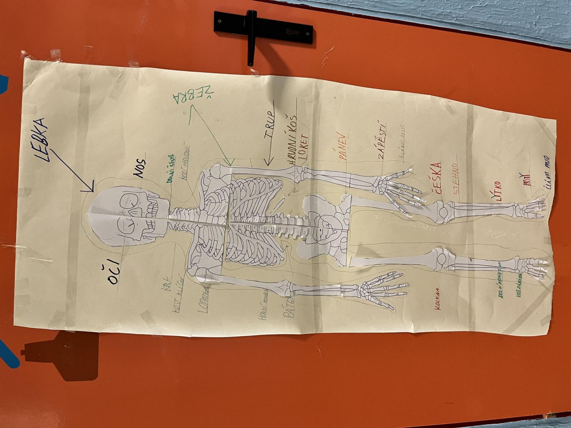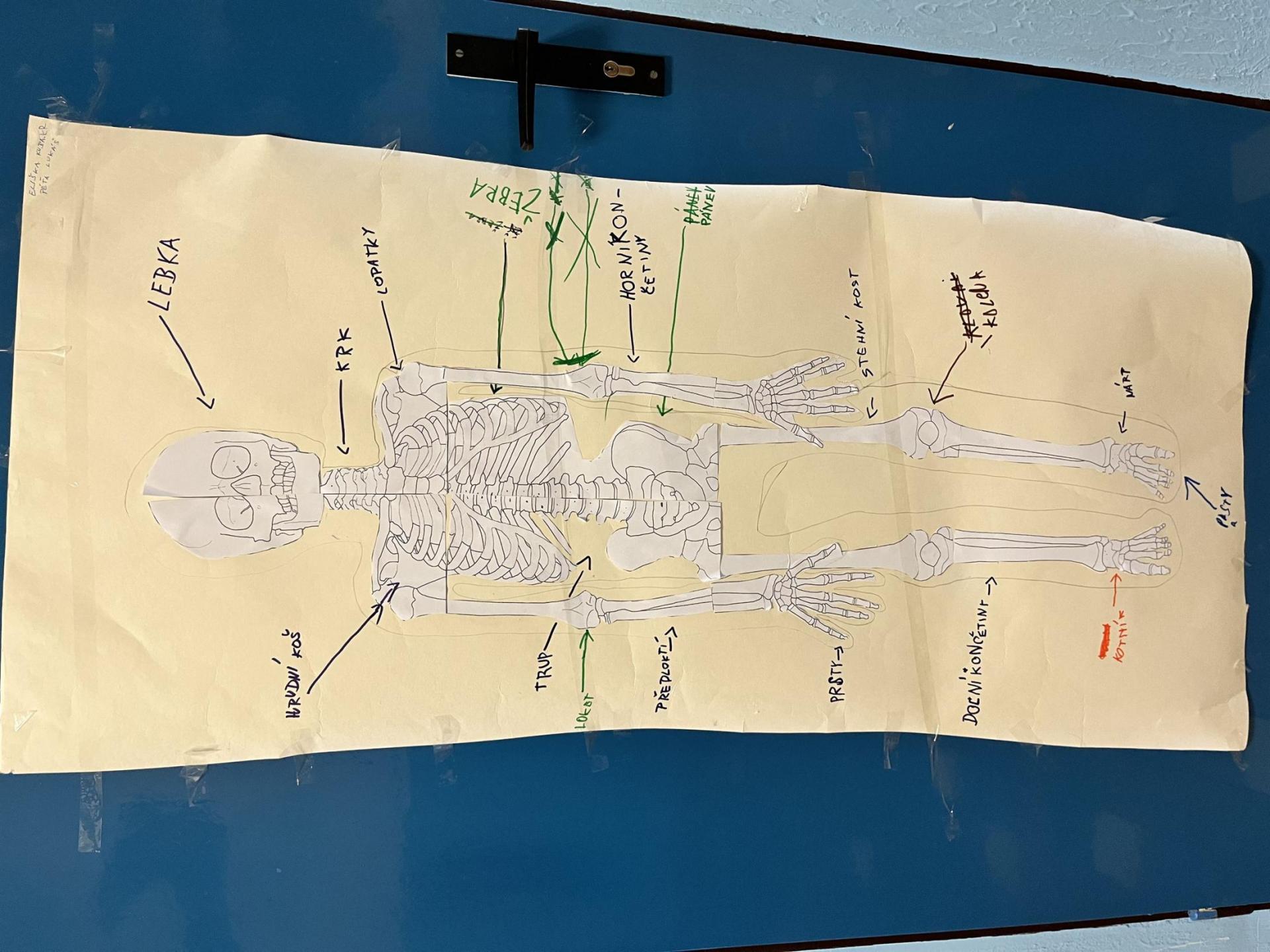 V rámci SKN jsme si vytvářeli ve skupinkách vlastní kostlivce. Obkreslili jsme lidské tělo, sestavili kostru a popisovali části těla.
