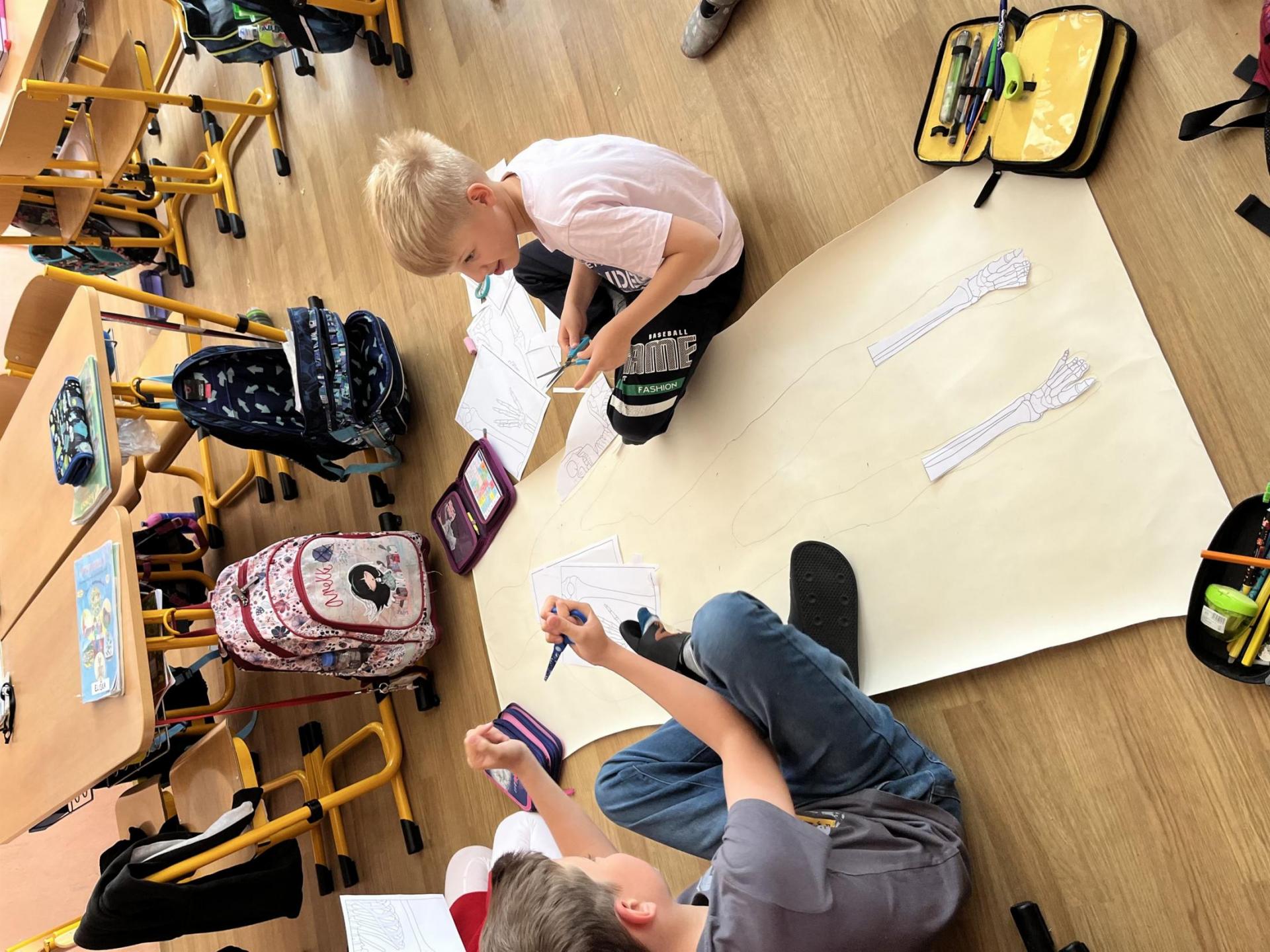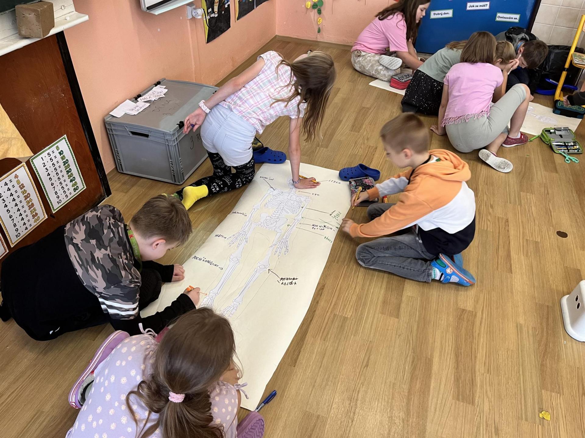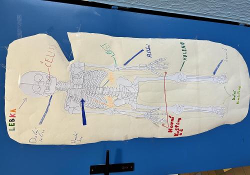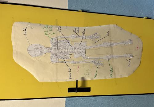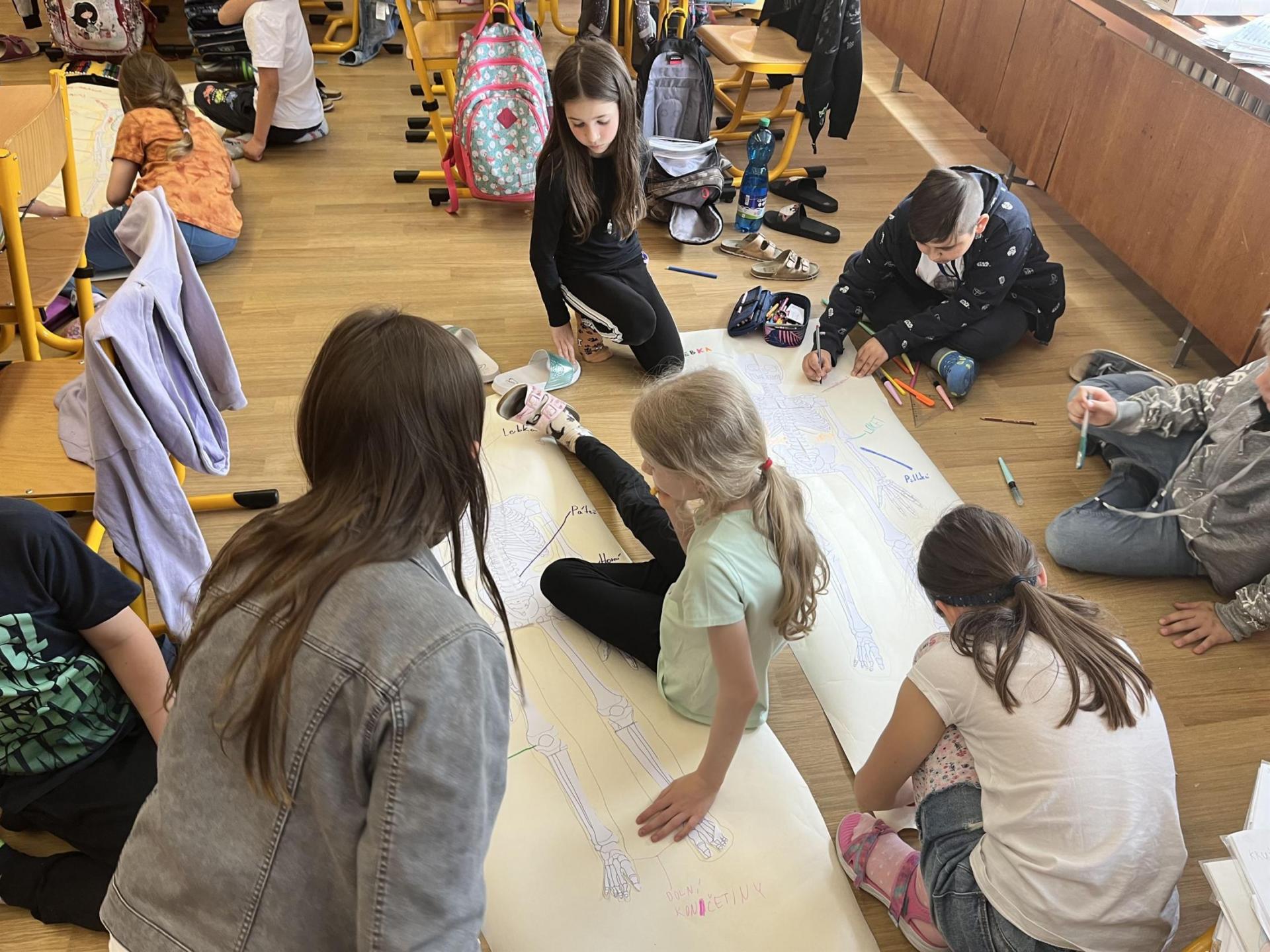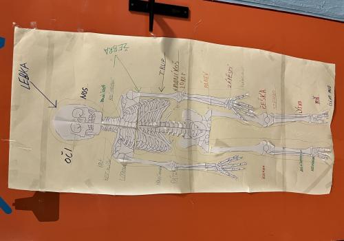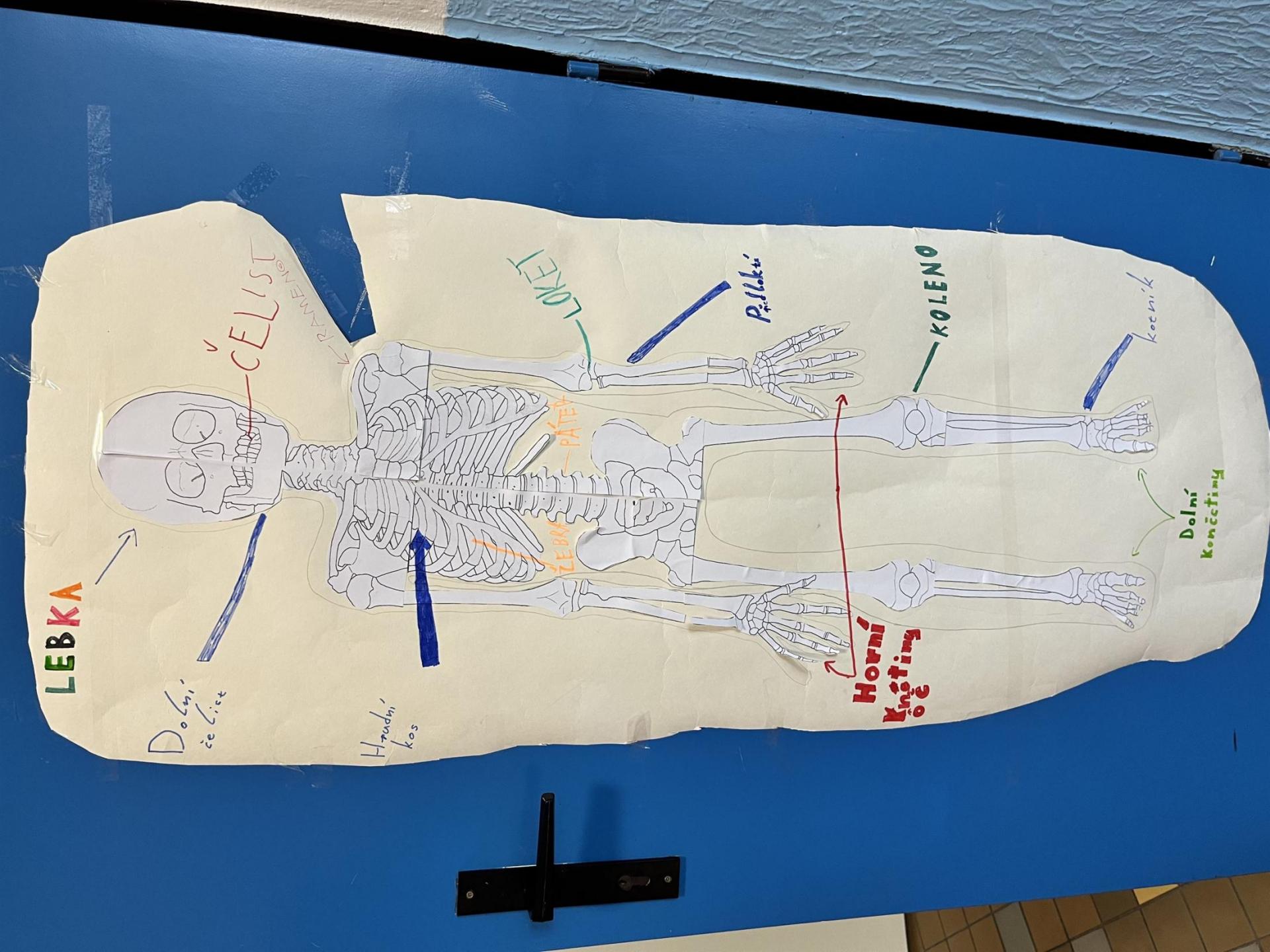 V rámci SKN jsme si vytvářeli ve skupinkách vlastní kostlivce. Obkreslili jsme lidské tělo, sestavili kostru a popisovali části těla.